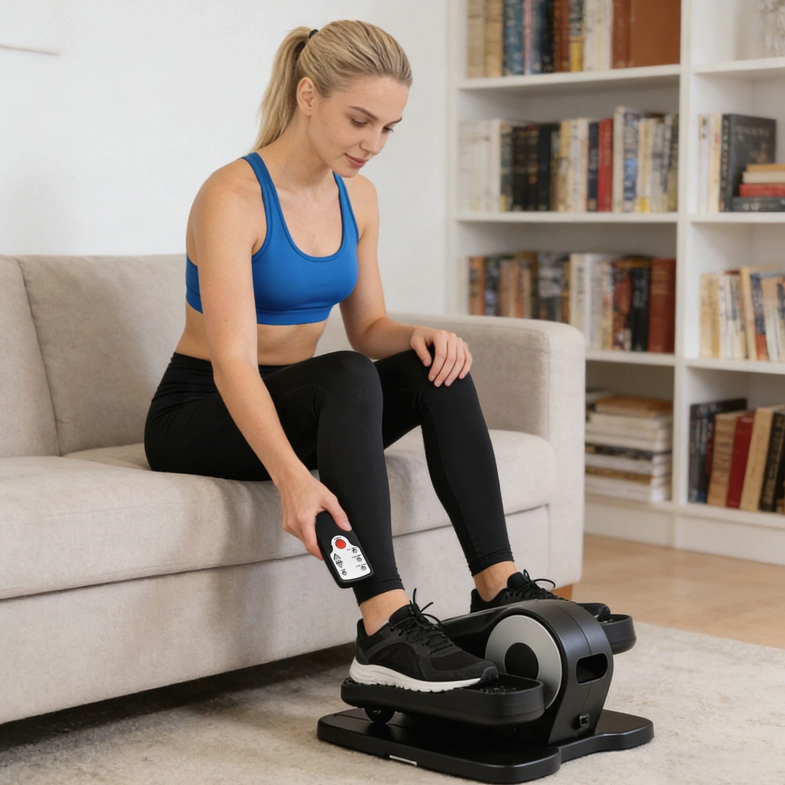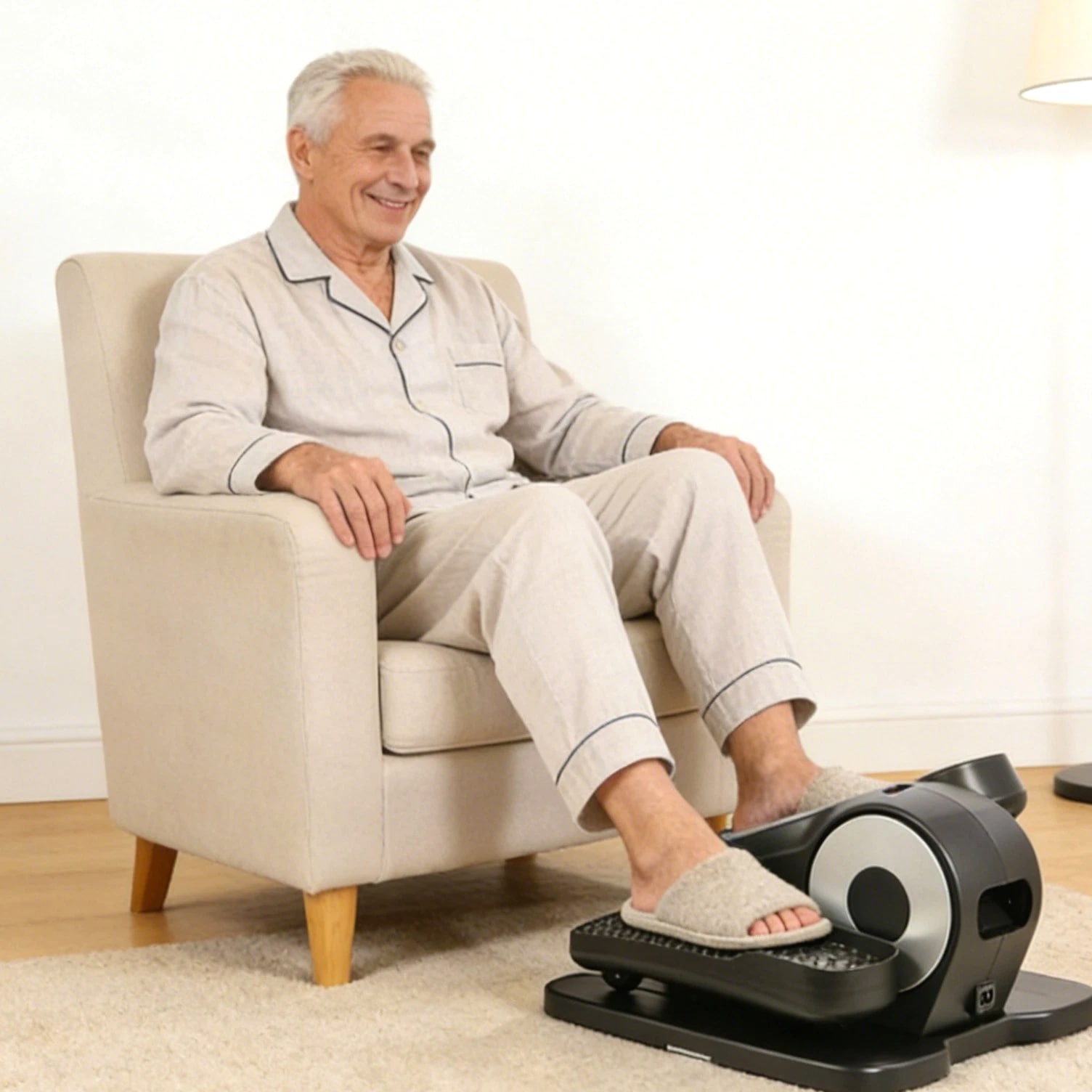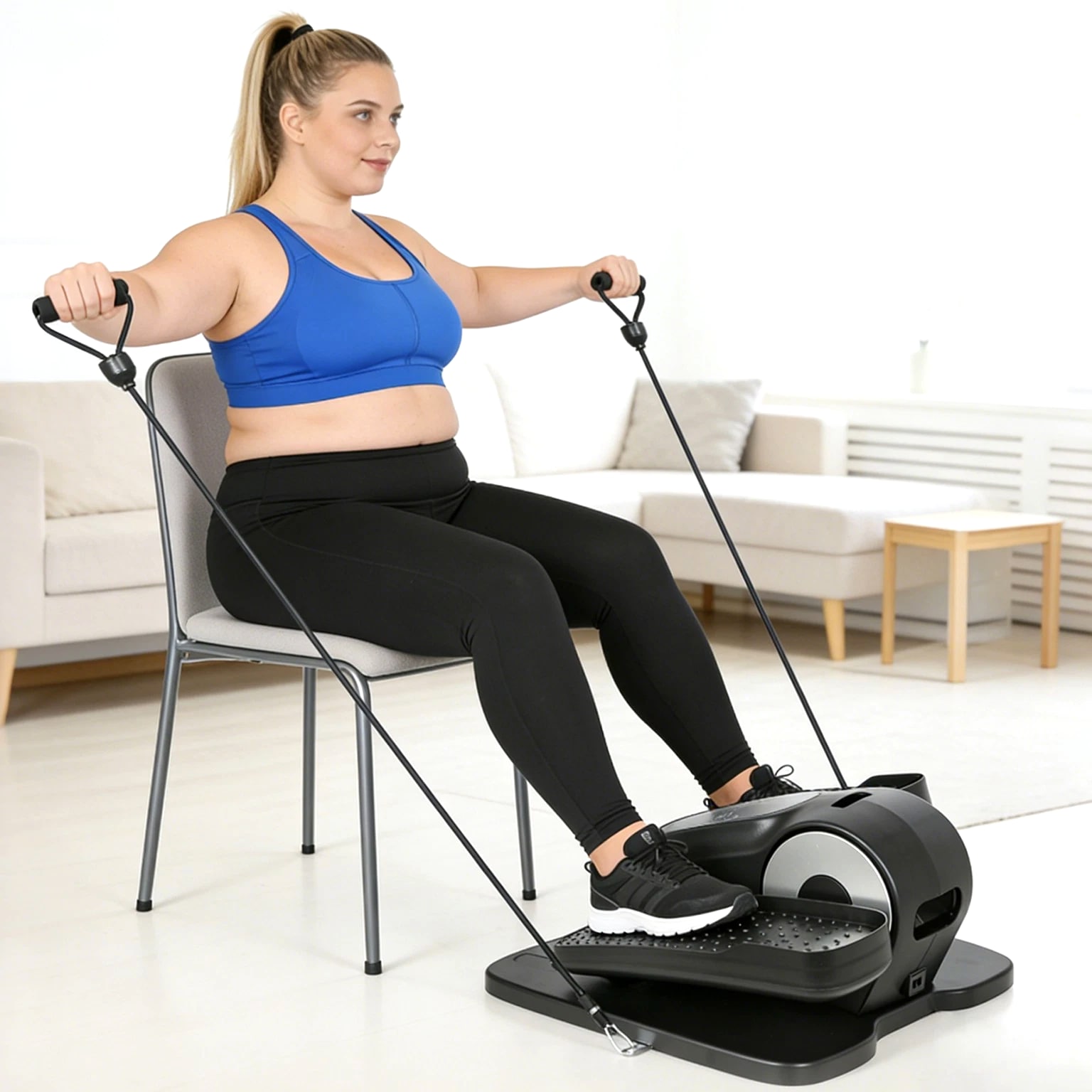 Himly Under Desk Elliptical – 2-in-1 Manual and Auto Modes You can choose between manual mode (12 speed levels) or automatic mode (default speed level 3). The pedal can be moved forward or backward, switching in just 3 seconds. Adjust the speed to work different muscle groups and achieve your fitness goals. Low-Impact & Joint-Friendly Ideal for office workers, seniors, or those in rehab. Promotes circulation, strengthens leg muscles, and improves joint mobility with zero joint stress. Quiet & Portable Advanced noise reduction and silent wheels for quiet operation at home or work. Compact size: 14.76"L x 15.75"W x 8.07"H. Lightweight at 13.45lb, easy to move. LCD Screen & Remote Features an extra large and clear screen on this elliptical machine, allowing for intuitive operation and real time tracking of time, speed and calories burned. Includes a convenient remote control to seamlessly adjust settings without bending over or pausing your exercise; perfect for seniors (Batteries for remote not included.) Full-Body Workout Low-impact exercise ideal for office workers, seniors and sedentary users; includes resistance bands for upper body training Perfect Gift Idea Promotes health for office workers, seniors, and those in rehab. Improves circulation and relaxes muscles. Ideal gift for friends, parents, or grandparents. Product Parameters: Product Model: DT01 Product Input Voltage: 120V~ 60Hz Rated Power: 80W Net Weight: 6.1KG Gross Weight: 7.3KG Product Size: 40×37.5×20.5CM/15.75 × 14.76 × 8.07 in Package Size: 44×41×26.5CM Maximum Load: 15.0KG per foot Safety Notes: Consult a doctor before use if you have pre-existing medical conditions or use medical devices (e.g. pacemakers) Adult use only; keep device and power cord away from children under 8 Unplug before cleaning or non-use; do not use in humid, dusty or outdoor spaces