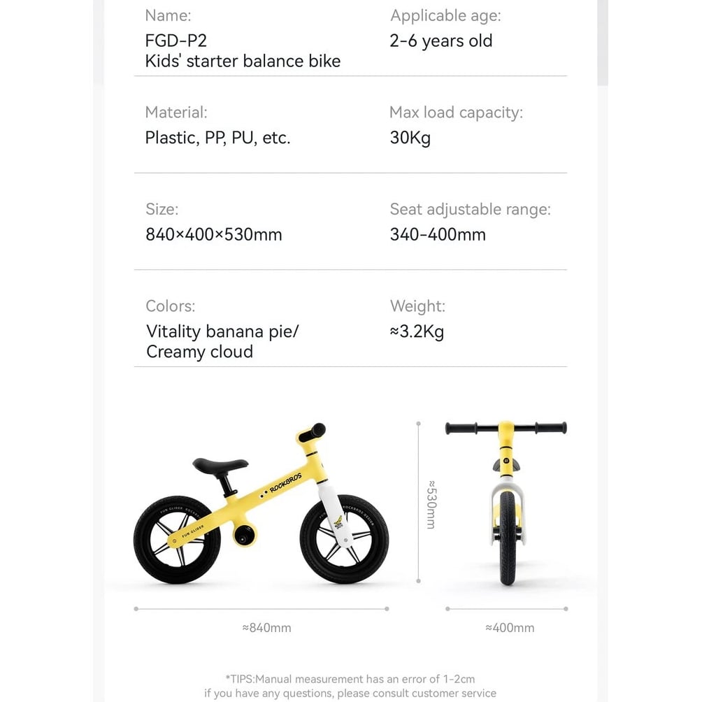 ROCKBROS 12 Inch Kids Balance Bike No Pedal Training Bike Adjustable Handlebar and Seat