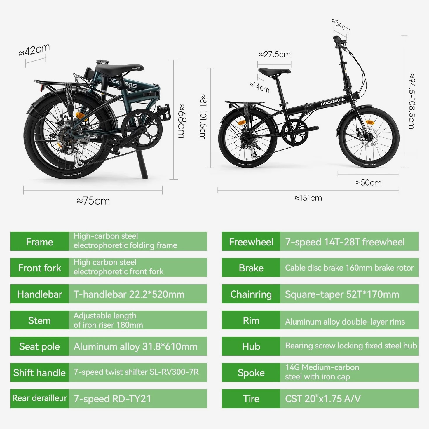 Product Features 1. High-carbon steel electrophoretic folding frame and front fork 2. 7-speed 14T-28T freewheel 3. Cable disc brake 160mm brake rotor 4. Square-taper 52T×170mm 5. Aluminum alloy double-layer rims 6. Bearing screw locking fixed steel hub 7. 14G Medium-carbon steel with iron cap 8. CST 20 x1.75 A/V