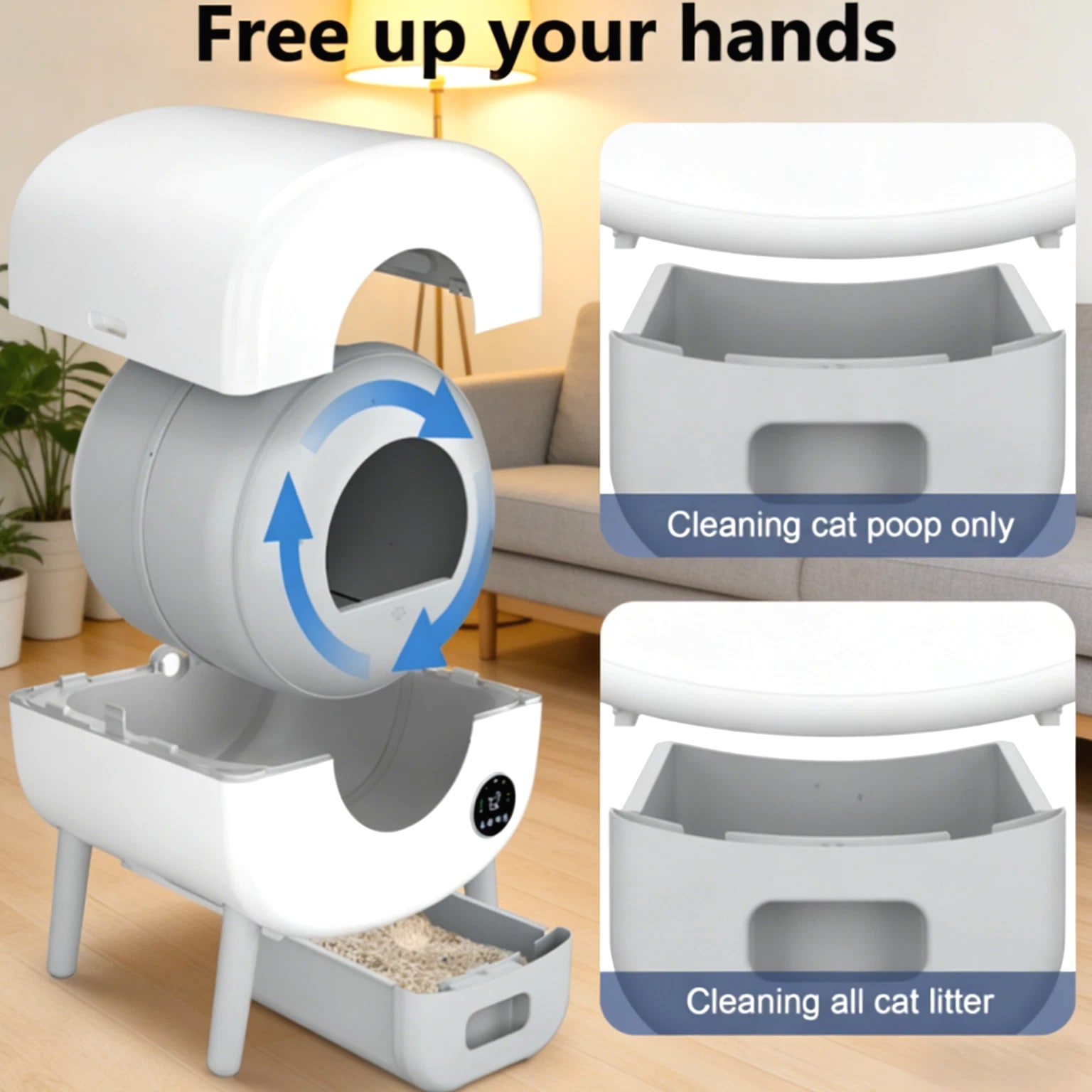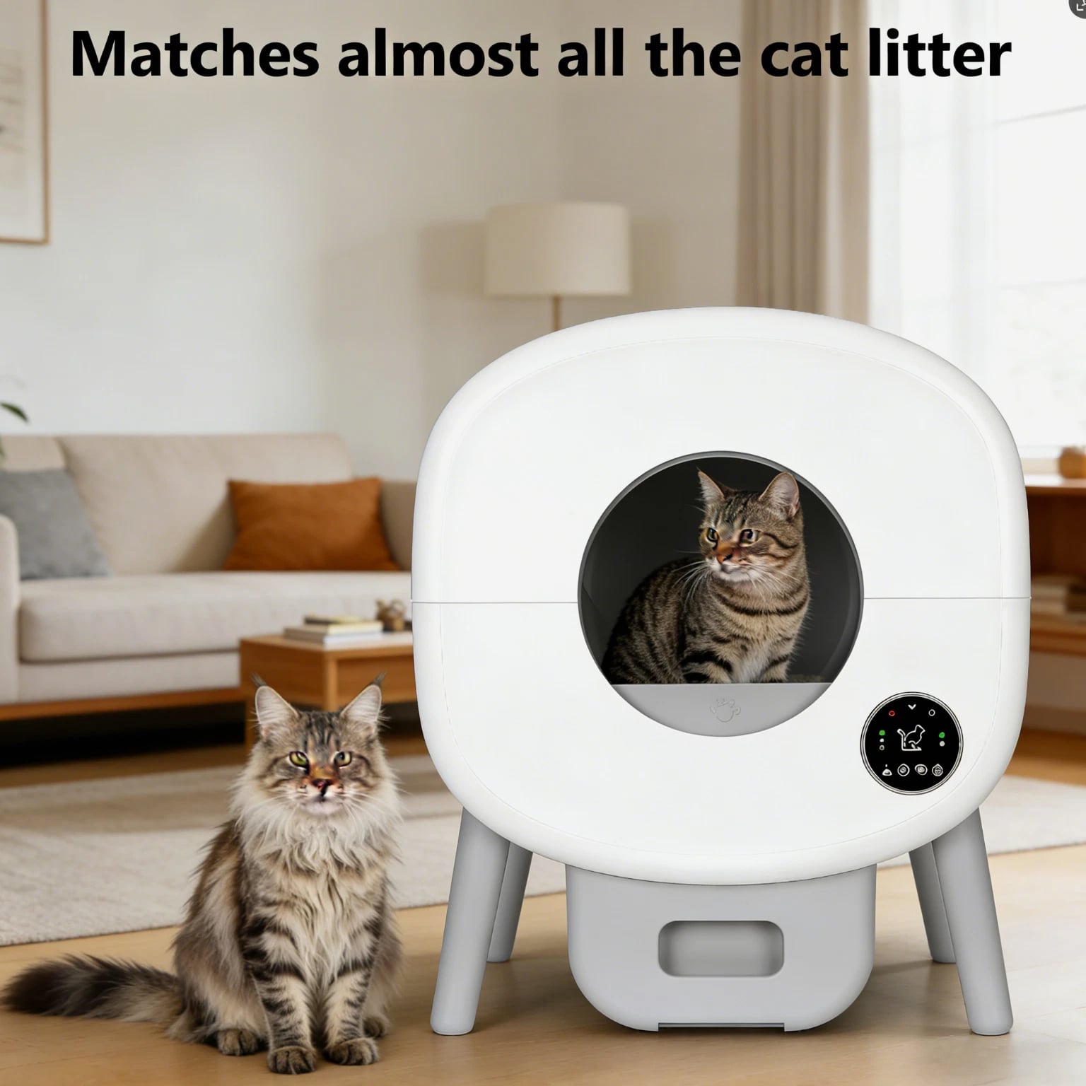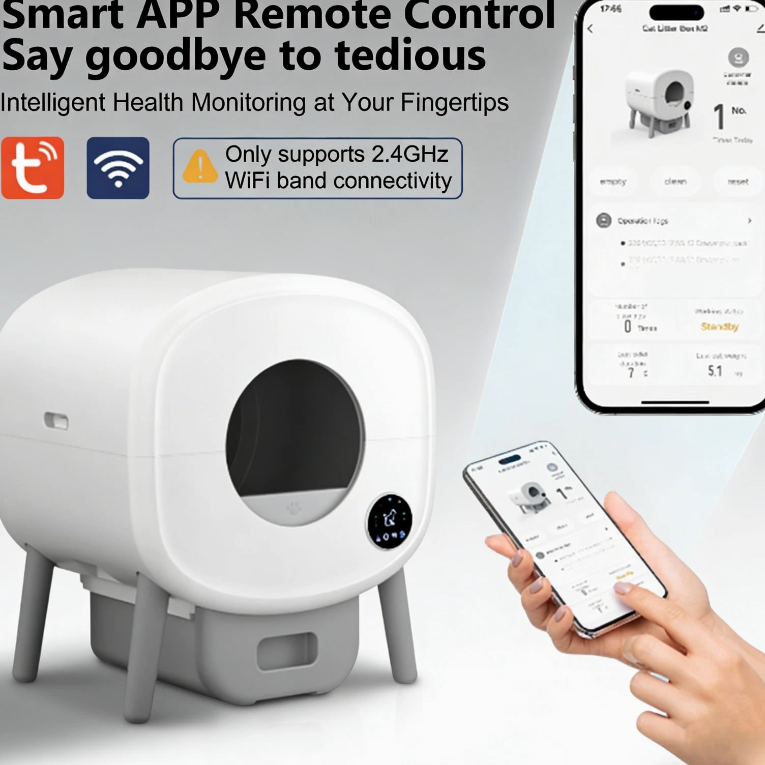 Please Note: It may show minor cosmetic imperfections consistent with previous use, such as light scratches or scuffs. If you prefer a brand new item in perfect cosmetic condition, we advise against purchasing this refurbished unit. Our Commitment: Your satisfaction is important to us. If you have any questions or concerns upon receiving the item, please contact us first before leaving feedback. We are here to help and will work to resolve any issues promptly. Thank you for considering this eco-friendly option! Self Cleaning Litter Box, Large Capacity Automatic Cat Litter Box Self Cleaning for Cats, App Control, Safety Protection, 2 Roll Garbage Bags, White & Grey About this item Cat Safety Priority: self cleaning cat litter box uses advanced sensors to detect your cat's presence, pausing cleaning cycles for their safety. This ensures your feline friend remains secure and undisturbed, giving you peace of mind Large Drum Capacity: The automatic cat litter box features a 95L roller capacity for cats 2.2 to 33 lbs. Its 15L waste bin lasts up to 15 days, making it ideal for long trips, and is compatible with clump litter types for single or multiple cats Quieter Operation: our automatic litter box maintains a peaceful environment in your home, day and night. Its whisper-quiet performance allows both you and your cat to enjoy undisturbed rest, even during those late night visits Effortless Cleanup, Odor Control: Our cat litter box is engineered for simple and quick cleaning. Featuring a deodorizing design that prevents any leakage and odor, it ensures your living space remains pristine and fresh Smart APP: Manage your cat's hygiene remotely with the Tuya Smart APP. Enjoy automatic cleaning, one-touch waste disposal, litter changes, and health tracking. Get alerts for full litter boxes and irregularities. Compatible with 2.4G WiFi only