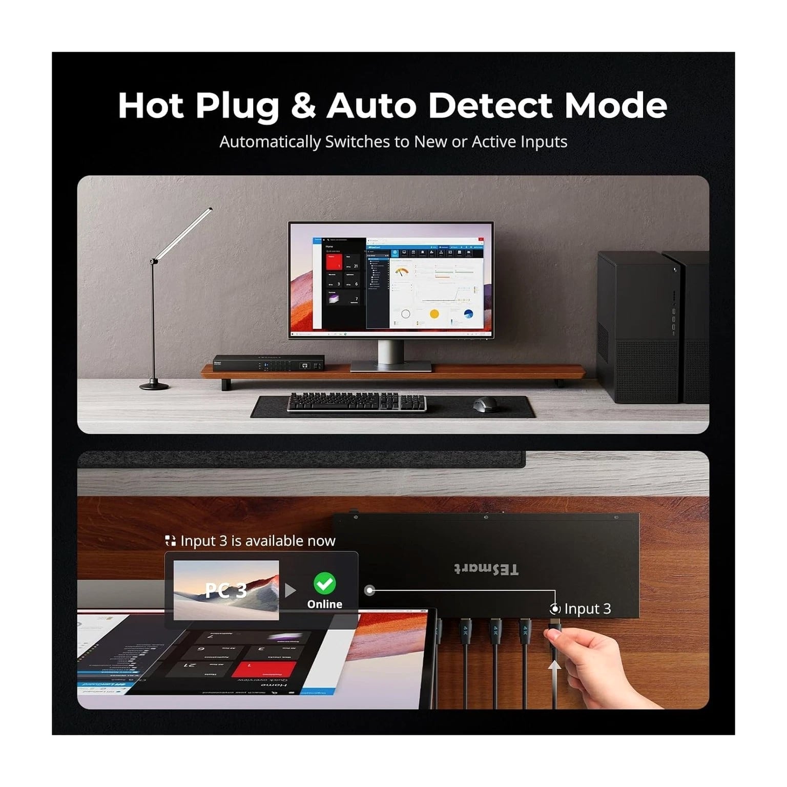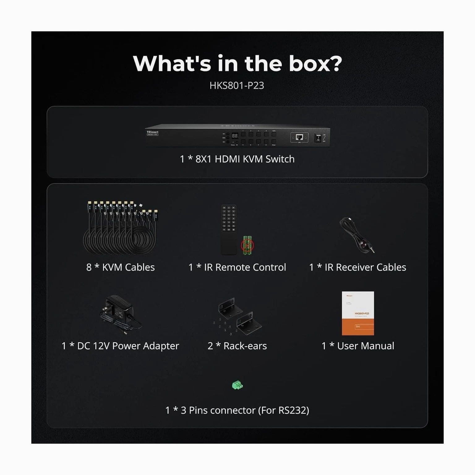 TESmart USB 3.0 HDMI KVM Switch 8 Port 4K@60Hz, 8X1 Rackmount KVM Enterprise-Grade EDID Emulator | Hotkey Switch | RS232 | LAN Port | IR Remote | IP Control | Auto Scan | includes 8 Pcs 5ft KVM Cable Description Features: 8 IN 1 OUT HDMI KVM Switch 4K@60Hz: This HDMI Switch gives you the flexibility of controlling up to 8 HDMI computers from a single USB keyboard, USB mouse, and monitor console. Support resolution up to 3840*2160@60Hz 4:4:4 USB 3.0 Ports & Auto Switching: With extra standard 2 USB 3.0 hub ports, it is possible to connect bar code scanner, USB hard drive or other USB devices to KVM just as you have plug these devices directly to computer. Available to use keyboard and mouse without any delay after switching computers. Support auto switching to monitor computers in a specified time interval KVM Switch With Remote Control: This functional 8 port HDMI KVM switch includes a remote control for your convenience and 8 pcs of dedicated 5ft KVM cables to save you time and money EDID Emulator: With EDID emulators in every input ports, keep PCs always have correct display information, prevent display settings changed while switching input ports. 7 Switching Methods: Easy to control KVM via IR remote, front panel key, keyboard hot keys, mouse wheel switching, RS232 port, IP commands and auto detect mode Simple Plug and Play Installation: This HDMI switch is easy to use and requires no special software. You can add or remove devices connected to the KVM easily without turning off your PC (i.e. hot swap) Note: No batteries are included in the package, if you need to use the remote control, please use AAA batteries to operate it Product Details: Operation Mode: ON-OFF Current Rating: 2 Amps Operating Voltage: 12 Volts Contact Type: Normally Closed Connector Type: Plug In Brand: TESmart Switch Type: Push Button Terminal: Screw Material: Metal Item dimensions L x W x H: 17.32 x 5.9 x 1.77 inches Operation Mode: ON-OFF Current Rating: 2 Amps Operating Voltage: 12 Volts