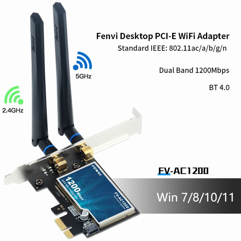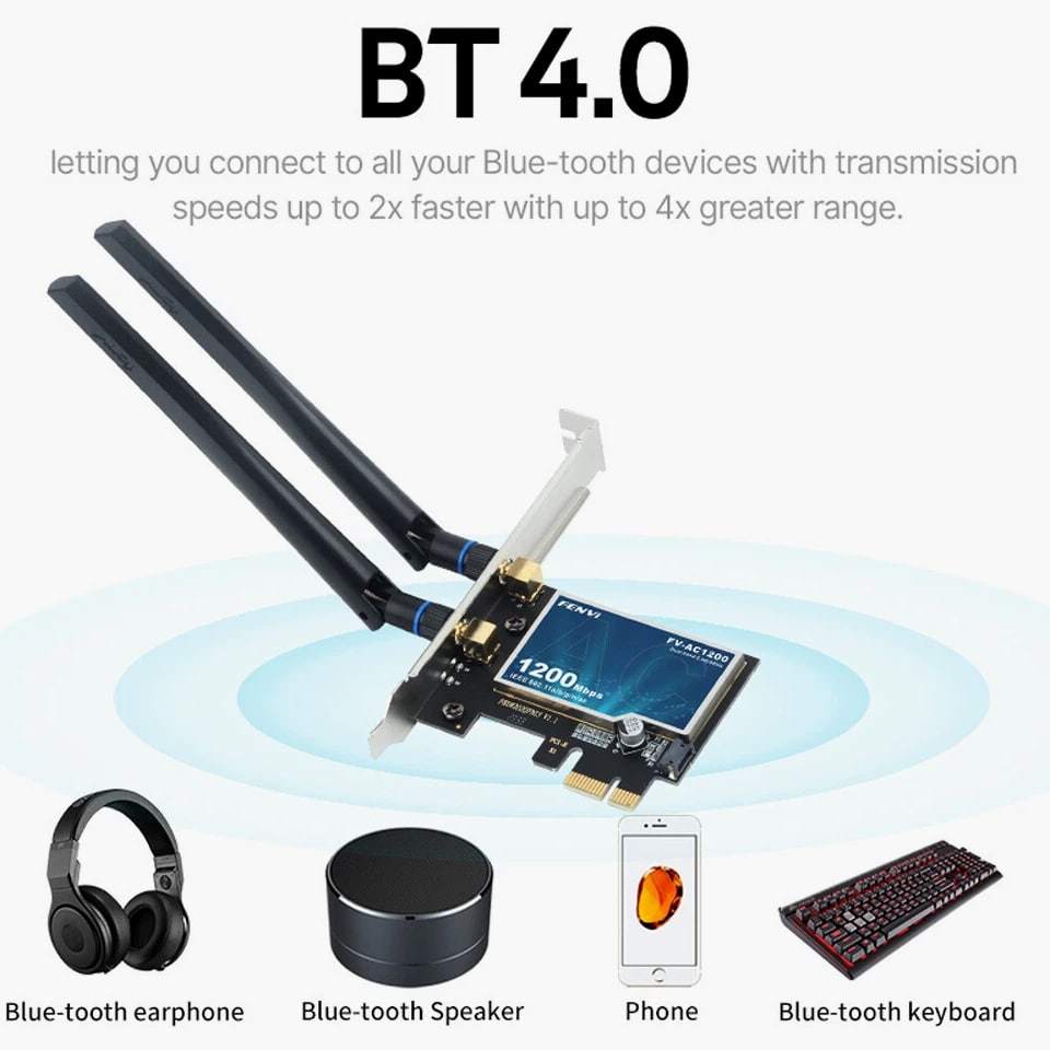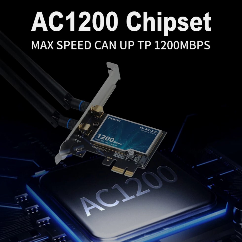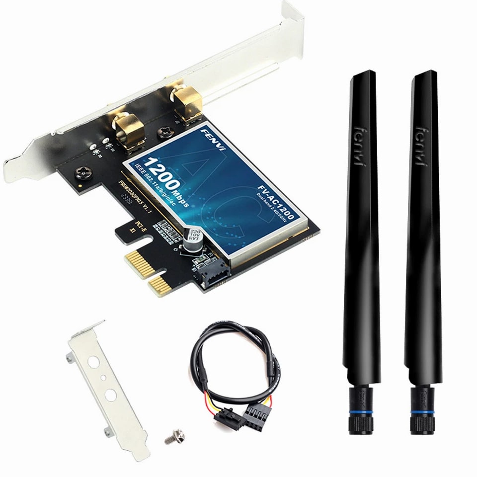AC1200 PCIe WiFi Card for Desktop - WiFi Bluetooth 4.0 Wireless Network Card 5Ghz Features: The FV-AC1200 1200Mbps Wireless AC PCI Express Adapter allows you to connect a desktop computer to a wireless network and access high-speed Internet connections. Compliant with IEEE 802.11ac/a/b/g/n, the FV-AC1200 provides wireless speed up to 300Mbps, ideal for online gaming or HD video streaming. The FV-AC1200 comes with a CD that helps you setup your device and configure wireless network settings. With setup this easy, you can be up and running in minutes. Specifications: Brand: Fenvi Model: FV-AC1200 Standard IEEE: 802.11ac With Bluetooth 4.0 Dual Band 2.4Ghz-300Mbps/5Ghz-867Mbps Wireless Transmission Speed: 5GHz up to 867 Mbps, 2.4GHz up to 300Mbps Streams: 2X2 IEEE WLAN Standard: IEEE 802.11a/b/g/n/ac Bluetooth: Dual Mode Bluetooth 4.0 Antenna Diversity: Supported Operating Systems: Microsoft Windows 7/8/10, Linux Compatible With: Almost any computer with PCI Express (PCI-E 1X/4X/8X/16X slot) interfaces Operating System Compatibility: Windows 7 32-bit/64-bit Windows 8 32-bit/64-bit Windows 10 32-bit/64-bit Compatible With: Almost any computer with PCI Express (PCI-E 1X/4X/8X/16X slot) interfaces Not compatible with iMAC Package Contents: 1 x FV-AC1200 PCI-E Wireless Adapter 2 x Antennas 1 x High/Low Profile Bracket 1 x Bluetooth Cable