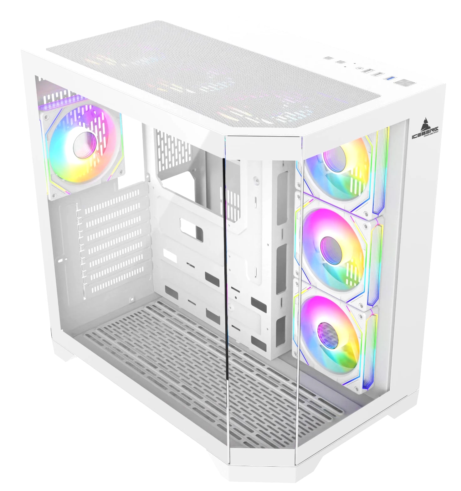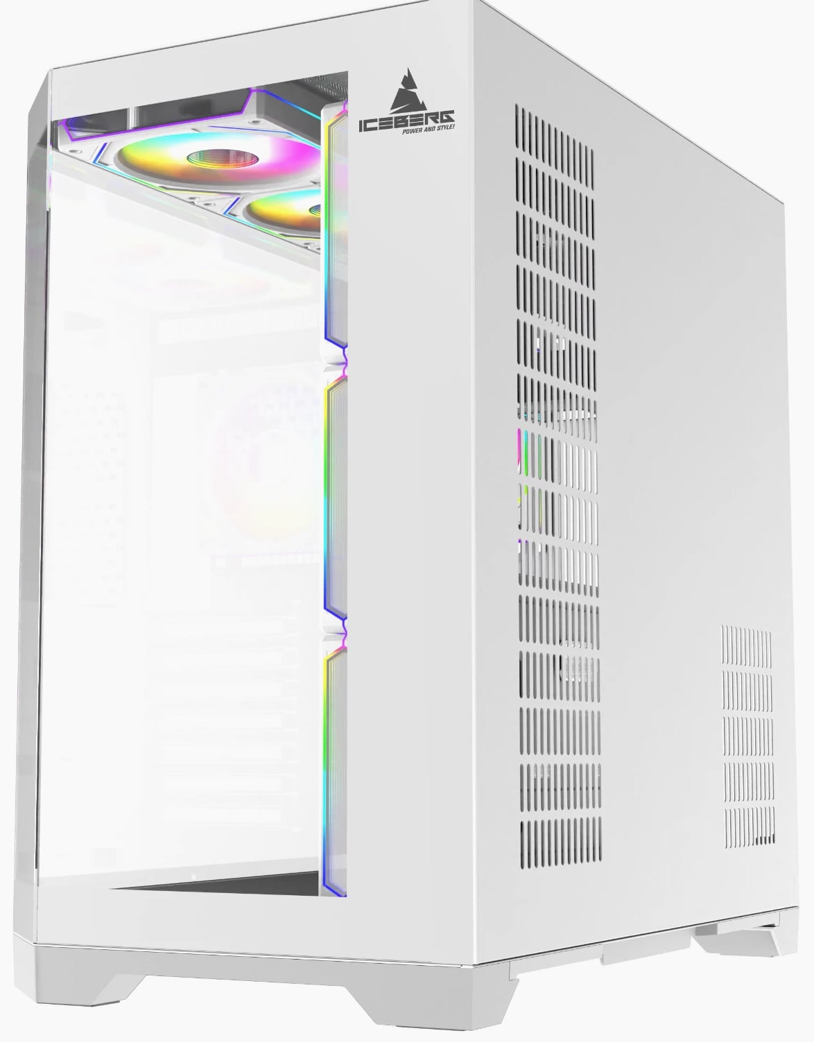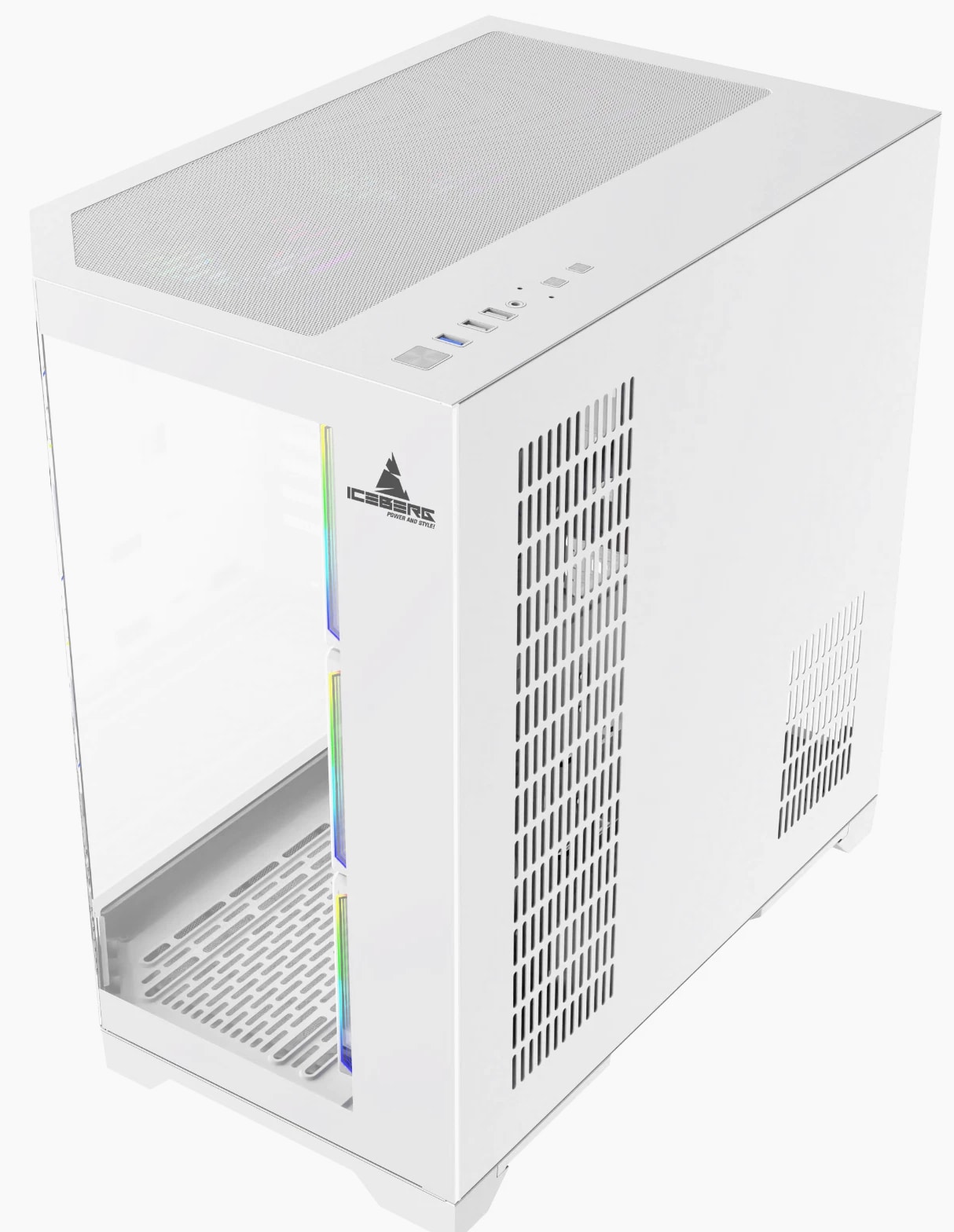 PC Gaming ATX Case Iceberg Crystal Edge Full Panoramic View Three Sides Tempered Glass Window with Seven high-Performance Fans aRGB (White) Full Panoramic View: With three-sided tempered glass window offers complete view without restrictions Air Flow Design: Two-space layout and seven (7) included fans offer the best thermal performance without sacrificing the aesthetic look of your system Liquid Cooling Support: Crystal Edge supports up to two 360mm liquid cooling systems simultaneously Air Cooling Systems: Supports air cooling systems up to 160mm in height Form Factor: Supports ATX, Flex ATX, micro ATX and mini ITX systems GPU Length Compatibility: Up to 400mm HDD / SSD Available Spaces: 2 / 3 Front Panel Connectivity: USB 2.0 X2 + USB 3.0 X1 + HD Audio jacks Local Customer Support: Phone, Chat or Ticket Systems Iceberg Crystal Edge ATX Tower with three-sided Tempered Glass Window Iceberg presents a new model of the Crystal Family, the Crystal Edge, featuring three-sided tempered glass window in two color variations (black and white). Crystal Edge has tons of space with 43.9 liters in volume for your ATX, micro ATX, Flex ATX, or mini ITX systems, giving excellent cable management space and compatibility with GPUs up to 400 mm in length without removing any fan. Excellent Cost-to-Performance Ratio with Outstanding Looks As with all Iceberg products, we are committed to offering the best cost-benefit ratio for the demanding PC gaming world. Crystal Edge offers a full panoramic view of your gaming PC with curved tempered glass, giving your system a unique appearance. High-performance Heat Dissipation Crystal Edge offers excellent airflow and thermal design, with up to 10 high-performance Maxi infinity aRGB fans (7 included) and a two-space layout. It is also compatible with most 360 mm liquid cooling systems and up to 157 mm air cooling systems. Best Support Iceberg-USA offers local support for all products. If you have a problem or request, you just need to contact