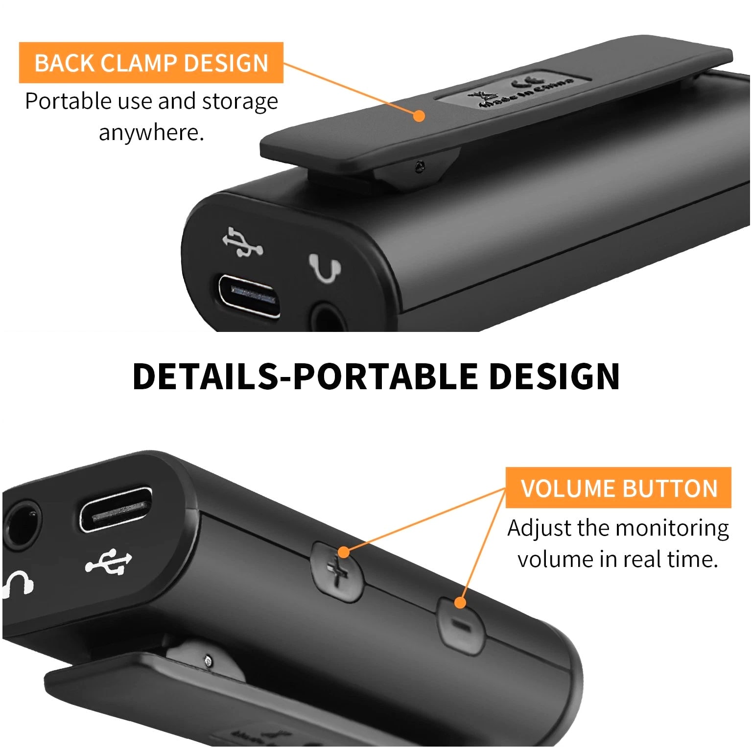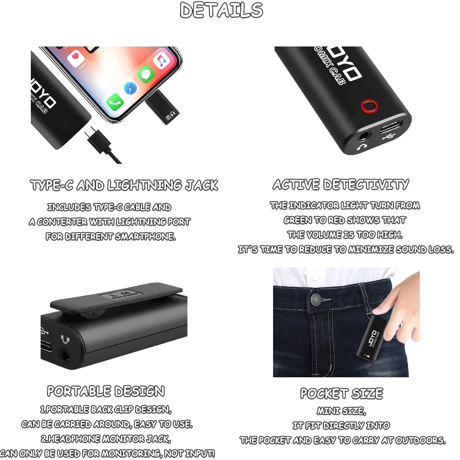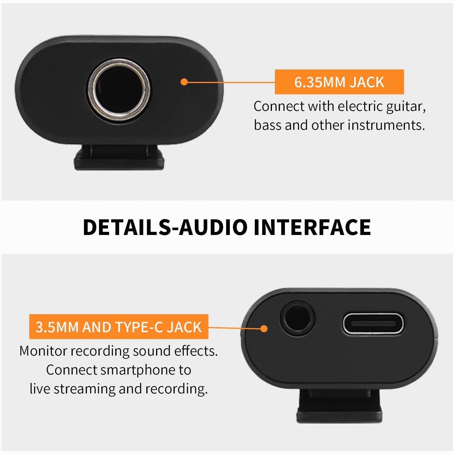 Mini audio interface, portable internal recording sound card for live streaming to connect smartphone and electric guitar or bass. This simple audio interface is designed for guitar beginners and allows recording without editing or mixing. Note: compatibility with apps may be limited as it is a basic audio interface. Output audio to smartphone directly with little latency and low interference, capturing the original guitar sound recording. For Android smartphones, enable OTG and use the recorder application to record. Connectivity: USB-C and Lightning connectors for smartphone compatibility. The 6.35mm jack connects electric guitar or bass, and the 3.5mm jack supports monitoring.