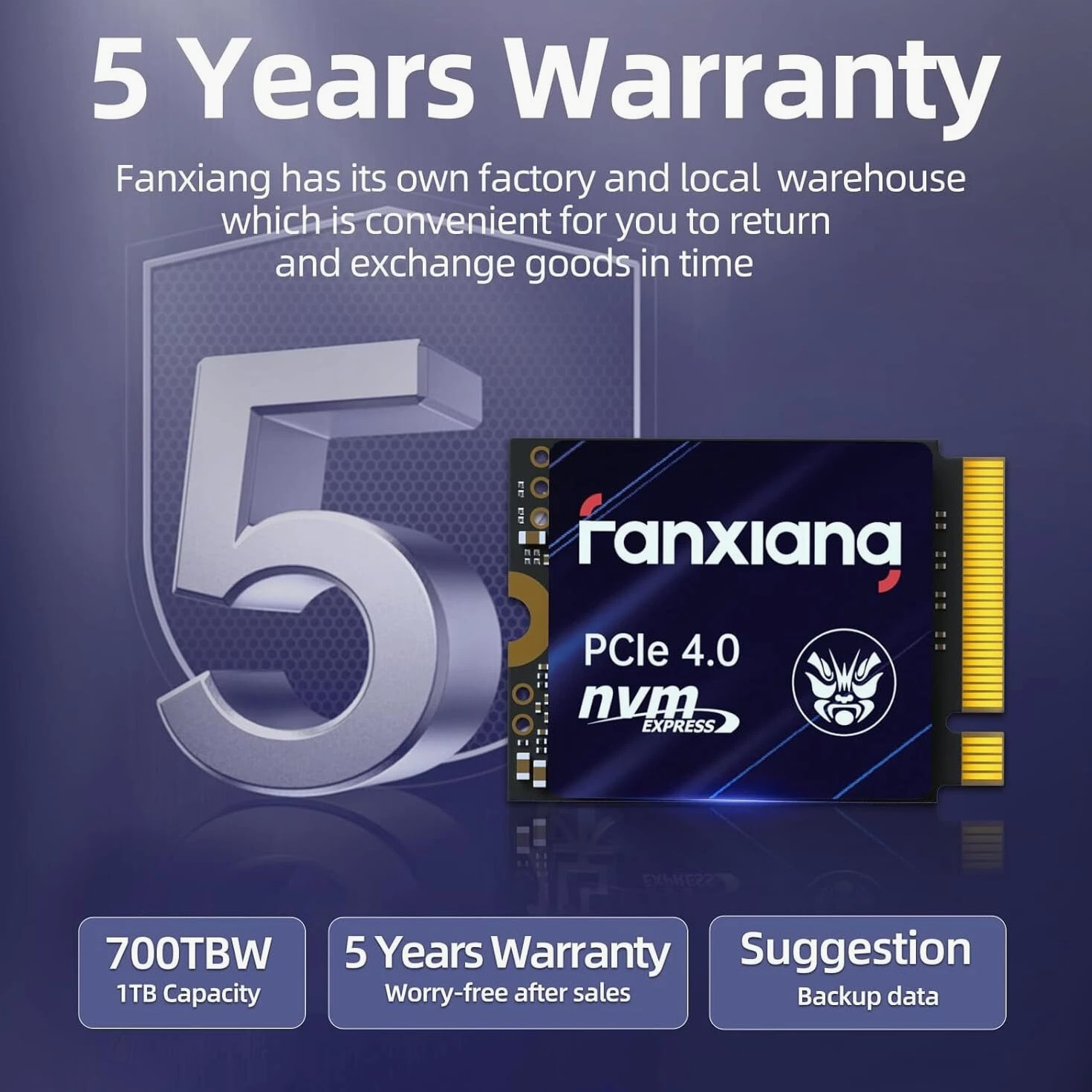 Fanxiang M.2 2230 NVMe PCIe 4.0 X4 SSD Performance Specifications: Read speeds: 4850-7400MB/s Write speeds: 1900-6550MB/s Write volume: 160-512TBW Weight: Approximately 3.0-4.8g Features: 1. Compact M.2 2230 Form-Factor: Fully compatible with Valve Steam Deck, ASUS ROG Ally, Microsoft Surface Pro, and other ultra-thin devices, making an excellent upgrade option. 2. Impressive Gen4 Storage Performance: A PCIe Gen4 x4 controller delivers up to 5,000MB/sec sequential read and 3,800MB/sec sequential write speeds, for rapid read, write, and response times. 3. Your PC Made Faster: Load games, boot Windows, open and transfer files all faster than ever. 4. High-Speed Gen4 PCIe x4 NVMe 1.4 M.2 Interface: Using PCIe Gen4 technology for maximum bandwidth. Supports multiple operating systems such as Windows, Mac and Linux. 5. High-Density 3D NAND: Provides the ideal mix of performance and capacity to keep your drive performing at its best for years. Common Questions: 1. Newly purchased SSDs require formatting in Disk Management before use. Format in Windows operating system using NTFS format. 2. Fanxiang S500 Pro comes with necessary tools for NVMe M.2 SSD installation; no separate purchase needed. 3. Contact us with any product questions or issues for a satisfactory resolution. Note: Actual usable storage space may differ from original capacity due to system calculations.