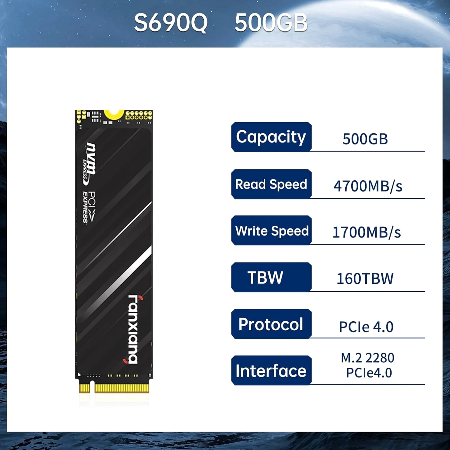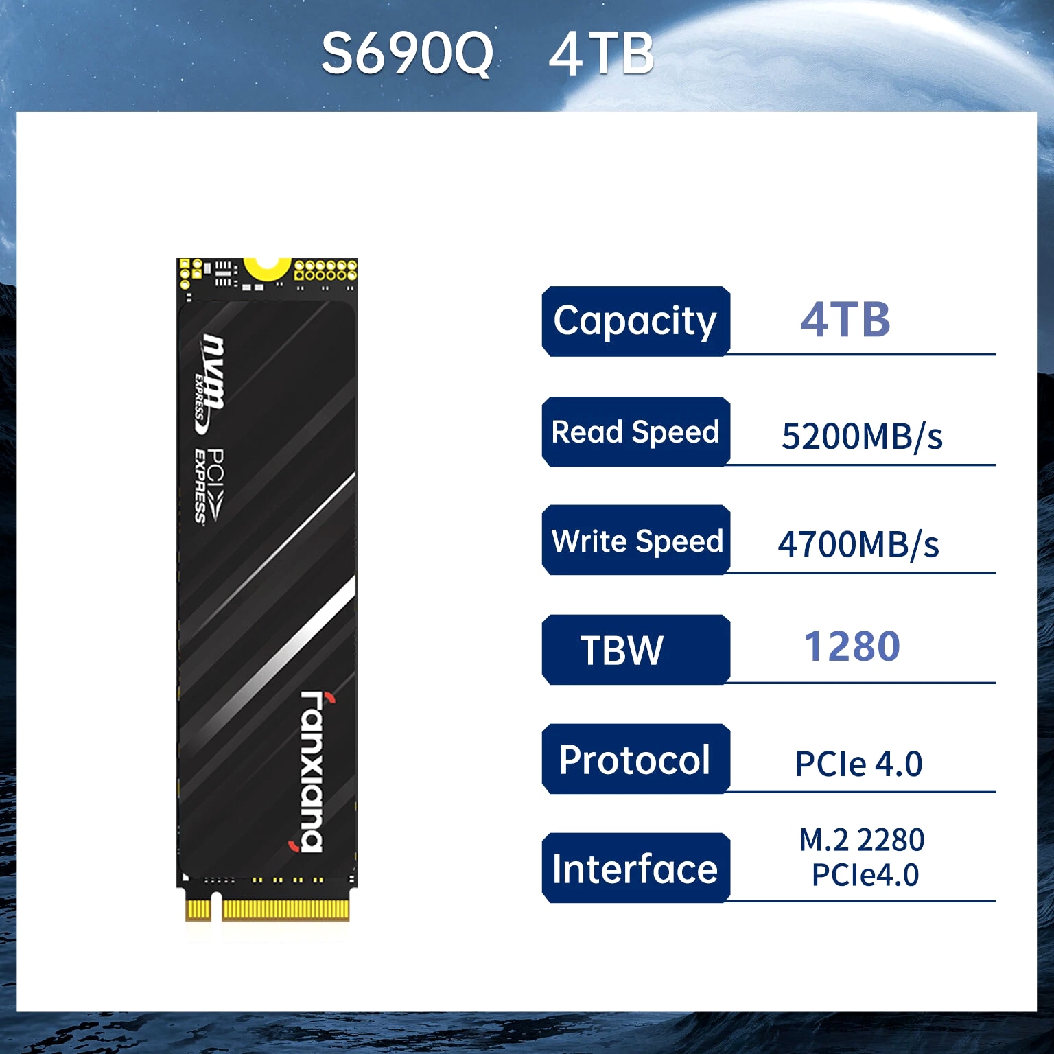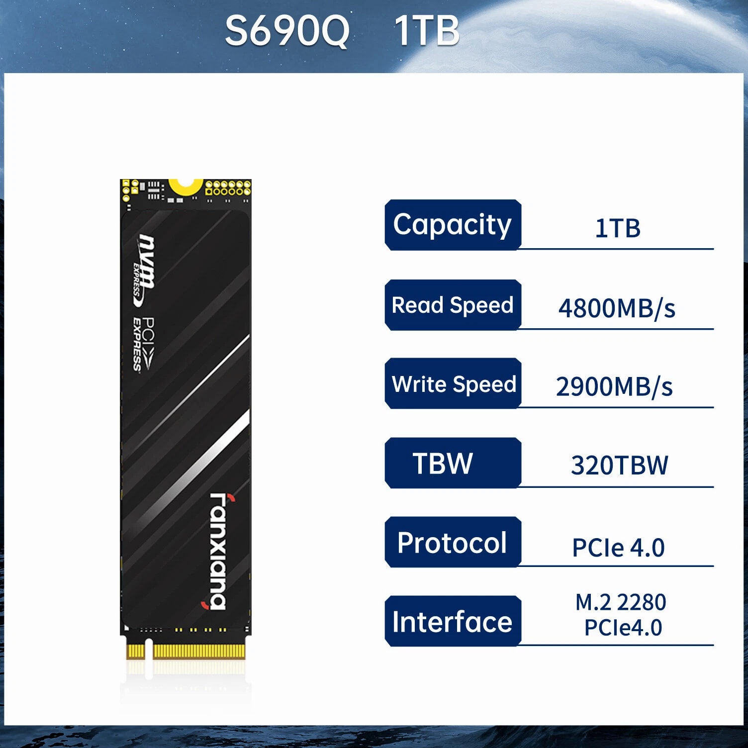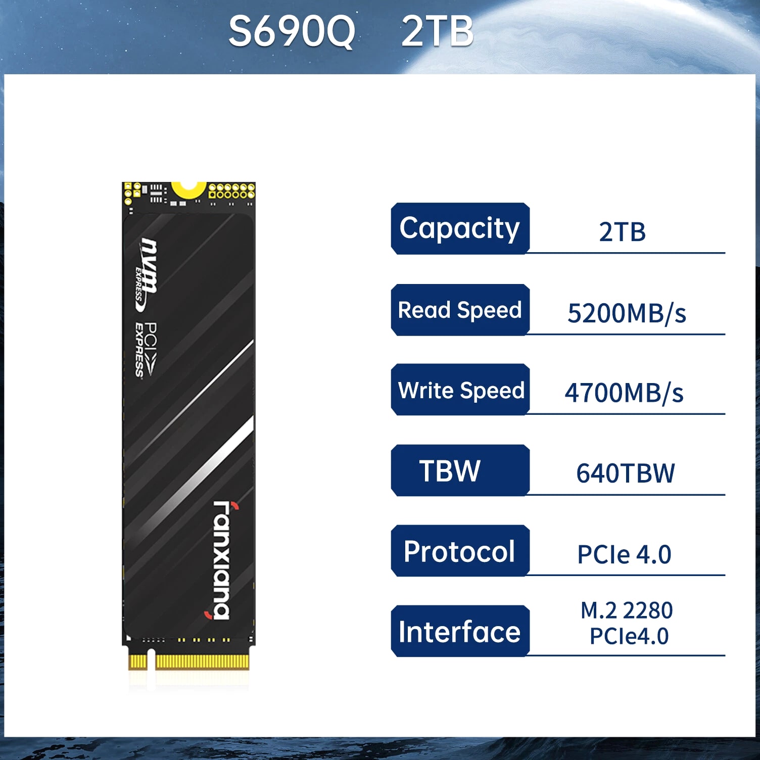 Fanxiang S690Q SSD 2TB 1TB PCIe Gen 4.0 x4 M.2 2280 Internal Solid State Hard Drive. Speeds reaching 5200MB/s, perfectly compatible with PS5, ensuring swift game launches for an immersive gaming experience. 【Efficient Performance】: Adopts PCIe Gen4 x4 technology and is compatible with NVMe 1.4 protocol. With high-speed performance, the PCIE 4.0 NVMe SSD works optimally with the PS5 for quick game launches. 【Ample Storage Expansion】: The S690Q M.2 SSD offers storage capacities ranging from 500GB to 4TB, eliminating concerns about game storage. Effortlessly expand your gaming storage and enjoy a plethora of gaming options. 【Fast Heat Dissipation】: The graphene heat dissipation sticker ensures the NVMe SSD operates at low temperatures during prolonged and intensive usage, providing reliable memory expansion for your PS5. 【Wide Compatibility】: The Internal SSD not only provides optimal storage expansion for PS5, but also works on various platforms including desktops and laptops. Excellent compatibility ensures a versatile solution for work efficiency and gaming. 【5-Year Warranty】: Our NVMe SSD comes with a 5-year limited warranty and lifetime technical support. If you have questions, contact us for professional assistance. FAQ: 1. When using an SSD for the first time, it needs formatting and partitioning. Use "Disk Management Tool" to format, then access via "Windows Explorer". 2. Capacity displayed differs from listed capacity because manufacturers calculate 1TB=1000MB while computer systems use 1TB=1024MB.