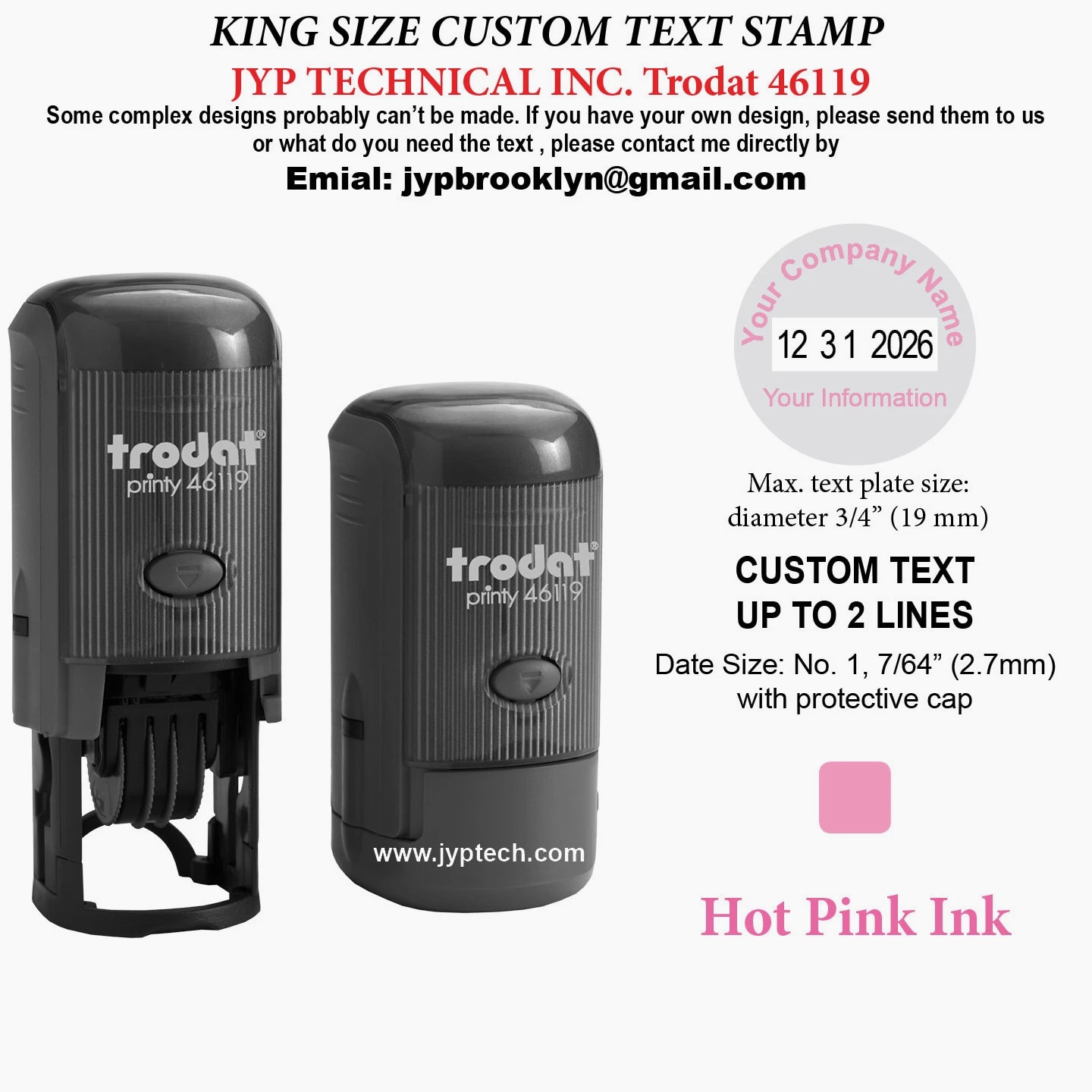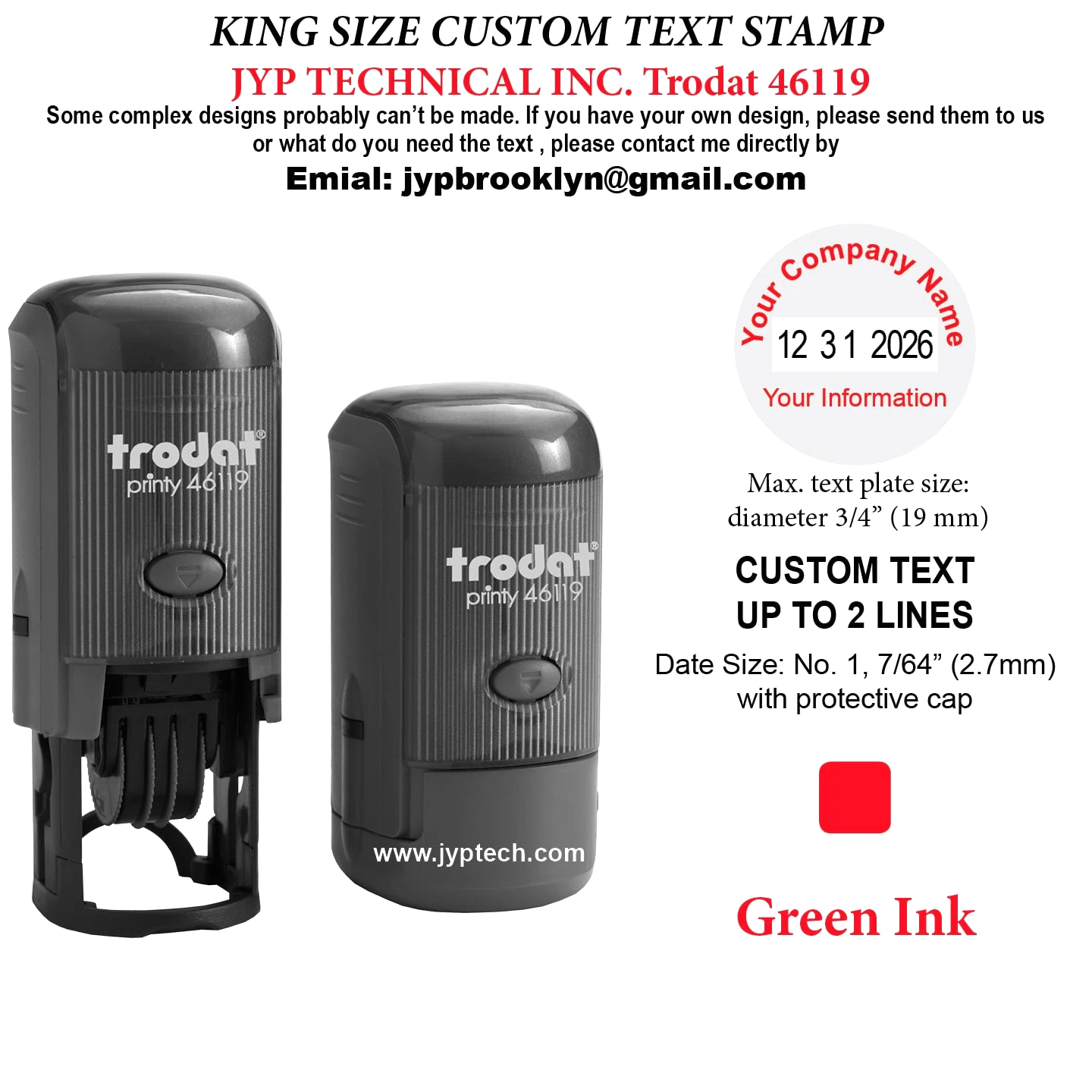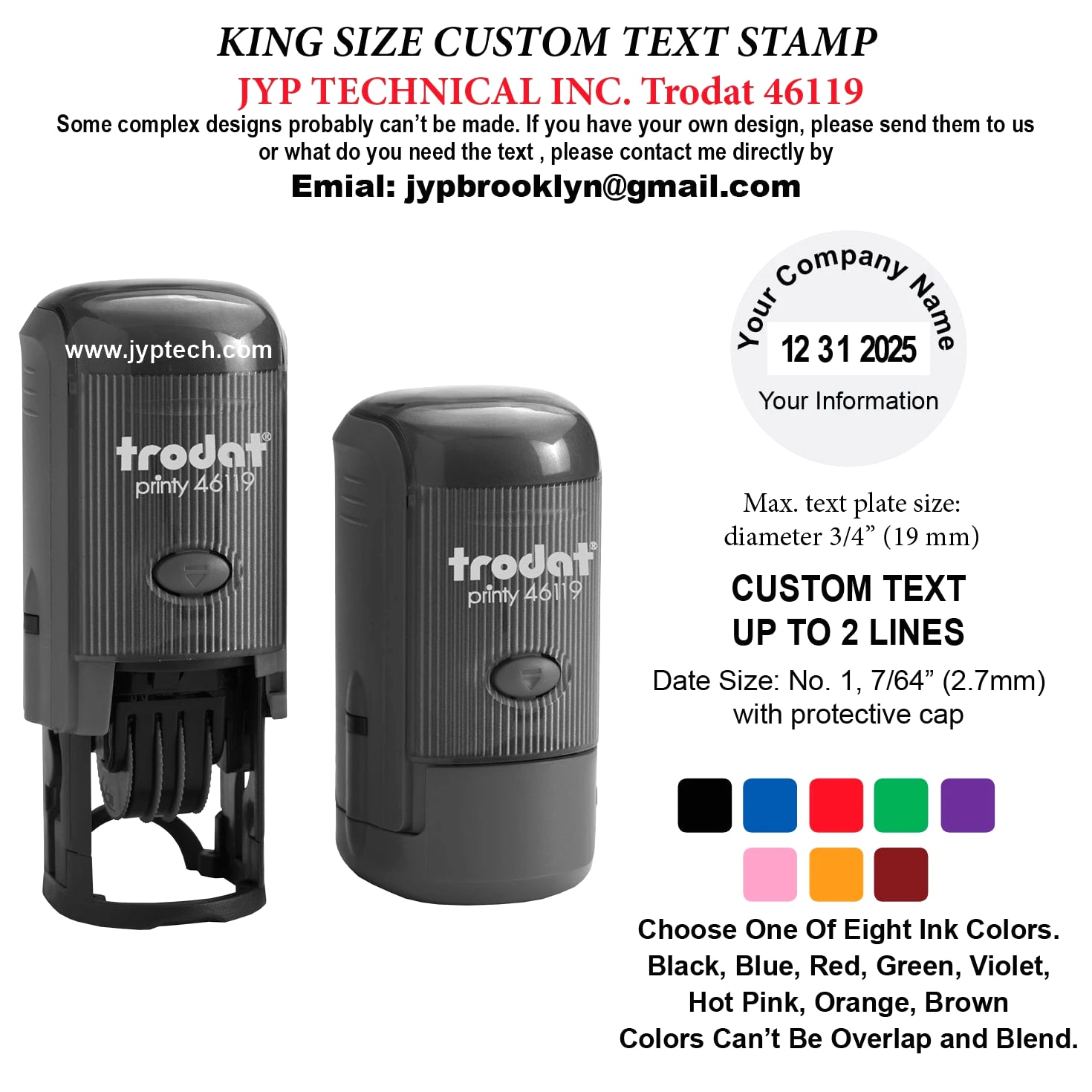 Trodat 46119 Round Self-Inking Date Stamp Custom Text Up To 2 Lines plus Date Max. Text Plate Size: diameter 3/4" (19mm) Delivers 12 Years of Dates. (Date Valid Through December 31, 2026) Date size: No. 1, 7/64" with protective cap One Ink Color Selection: Black, Blue, Red, Green, Violet, Violet, Hot Pink, Brown Clean and precise Imprints Long-lasting Ink cartridge. Easy, Quick, Unlimited Refill. Elegant and Comfortable Handle Design. More Than 10,000 Uses Guaranteed. Delivers 12 Years of Dates. (Date Valid Through December 31, 2030)
