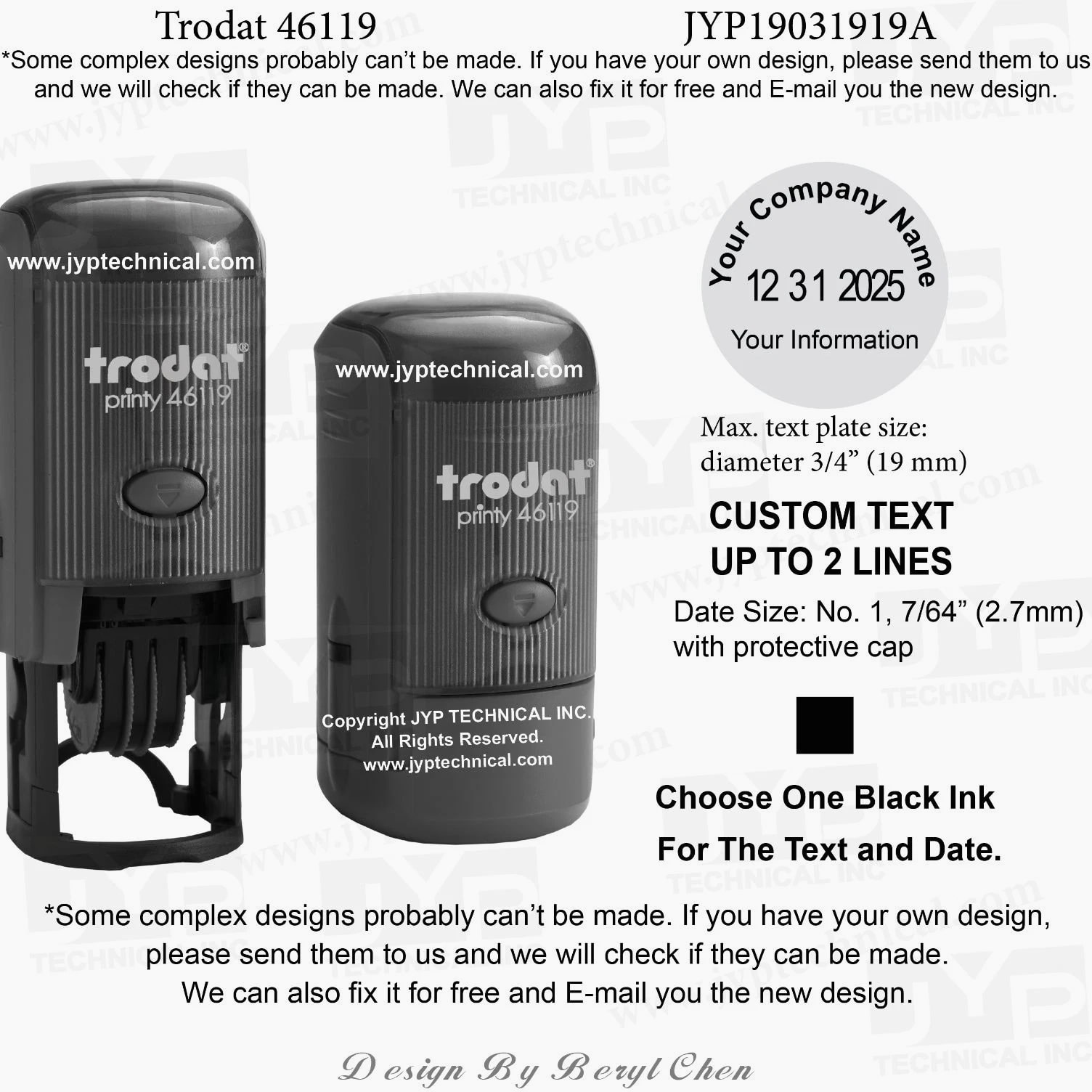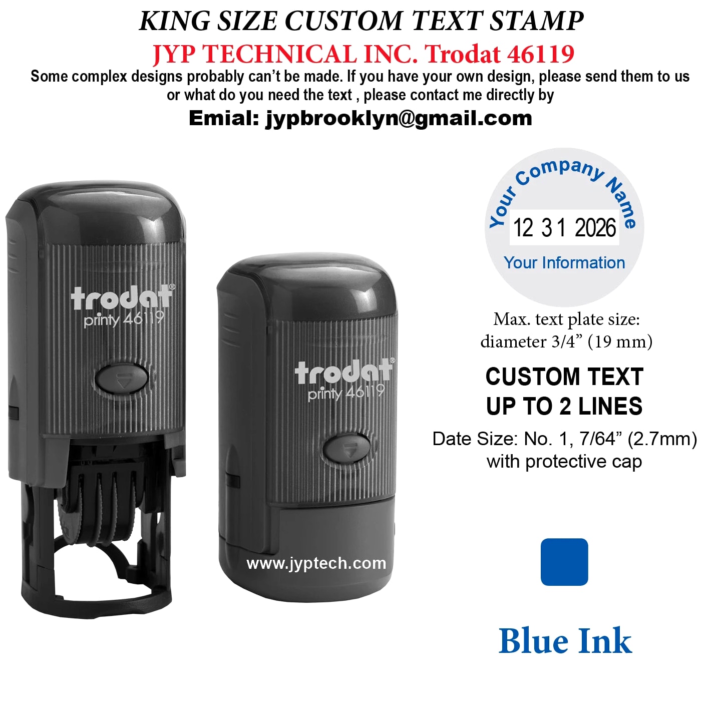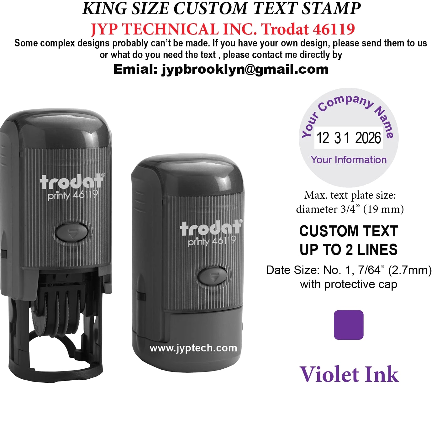 Trodat 46119 Round Self-Inking Date Stamp Custom Text Up To 2 Lines plus Date Max. Text Plate Size: diameter 3/4" (19mm) Delivers 12 Years of Dates. (Date Valid Through December 31, 2026) Date size: No. 1, 7/64" with protective cap One Ink Color Selection: Black, Blue, Red, Green, Violet, Violet, Hot Pink, Brown Clean and precise Imprints Long-lasting Ink cartridge. Easy, Quick, Unlimited Refill. Elegant and Comfortable Handle Design. More Than 10,000 Uses Guaranteed. Delivers 12 Years of Dates. (Date Valid Through December 31, 2030)
