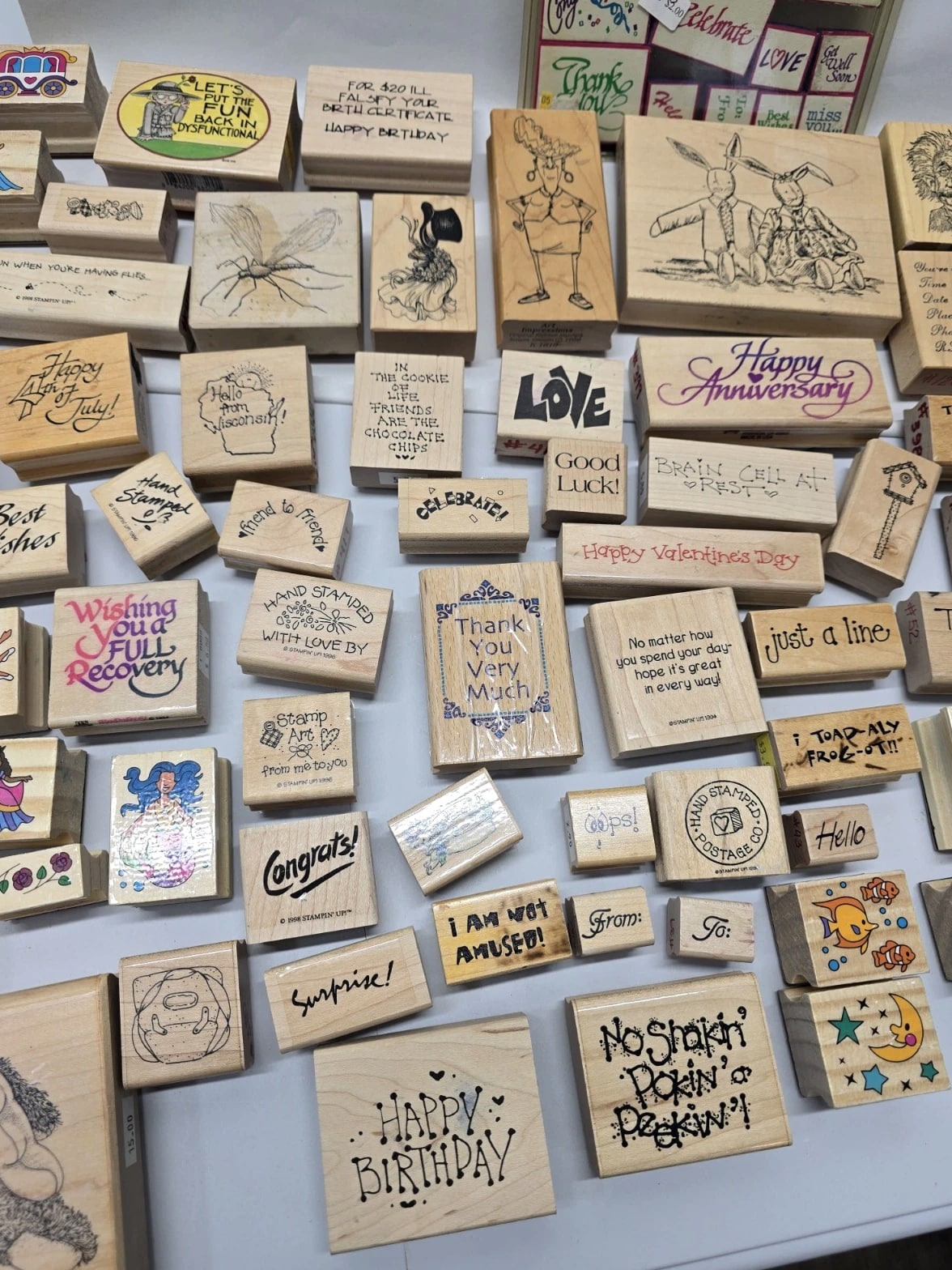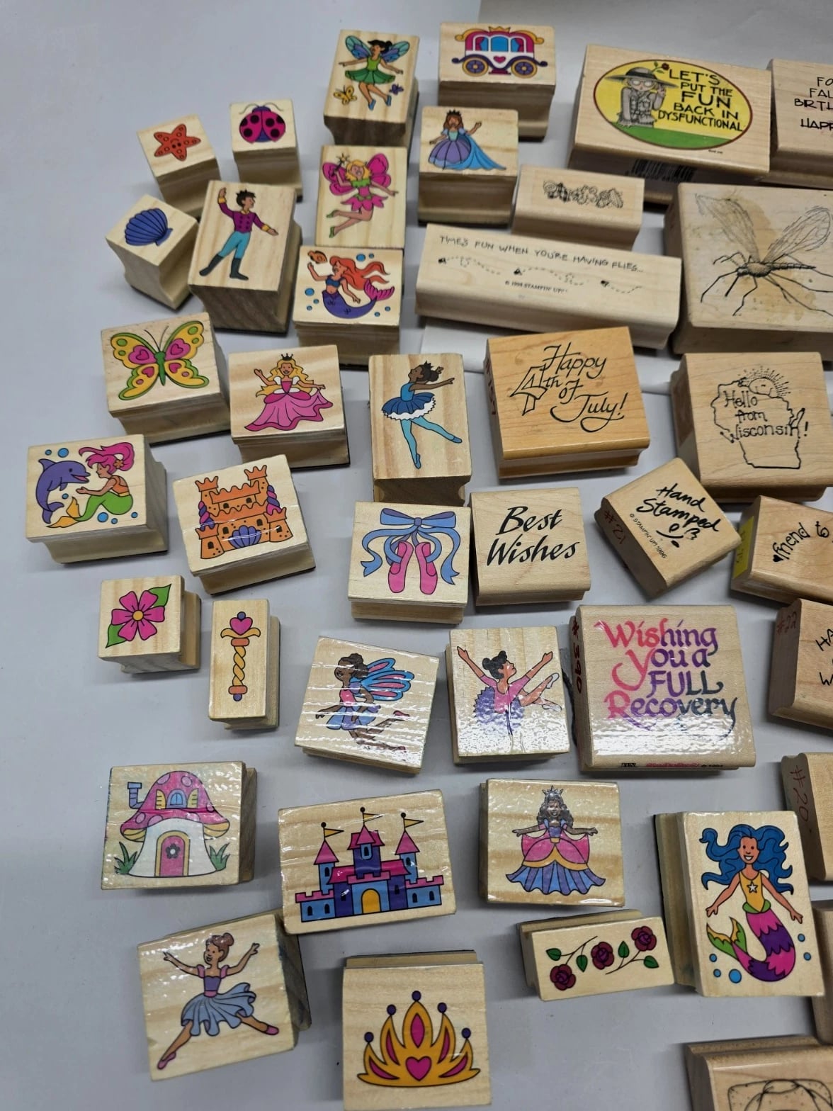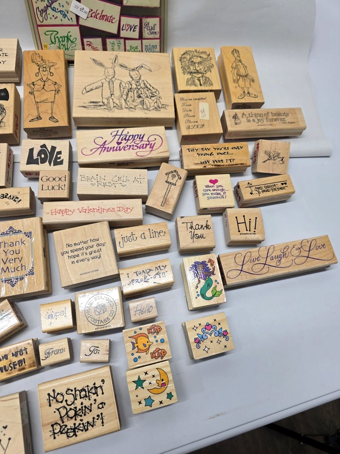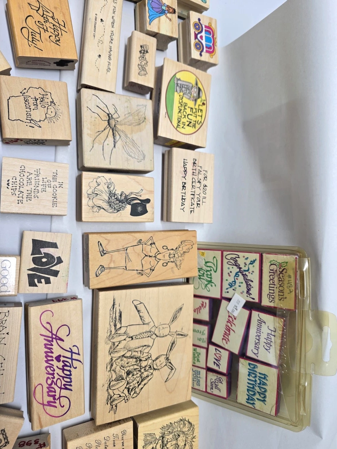 This collection is a LOT of 94 vintage and modern wooden and rubber ink stamps, excellent for arts and crafts projects. The stamps showcase a blend of vintage and modern designs with art-focused themes. Constructed from wood and rubber, these stamps are durable and flexible, perfect for creating distinctive and personalized work. Whether an experienced crafter or beginner, this stamp lot provides extensive creative options for your upcoming projects. We ship fast!