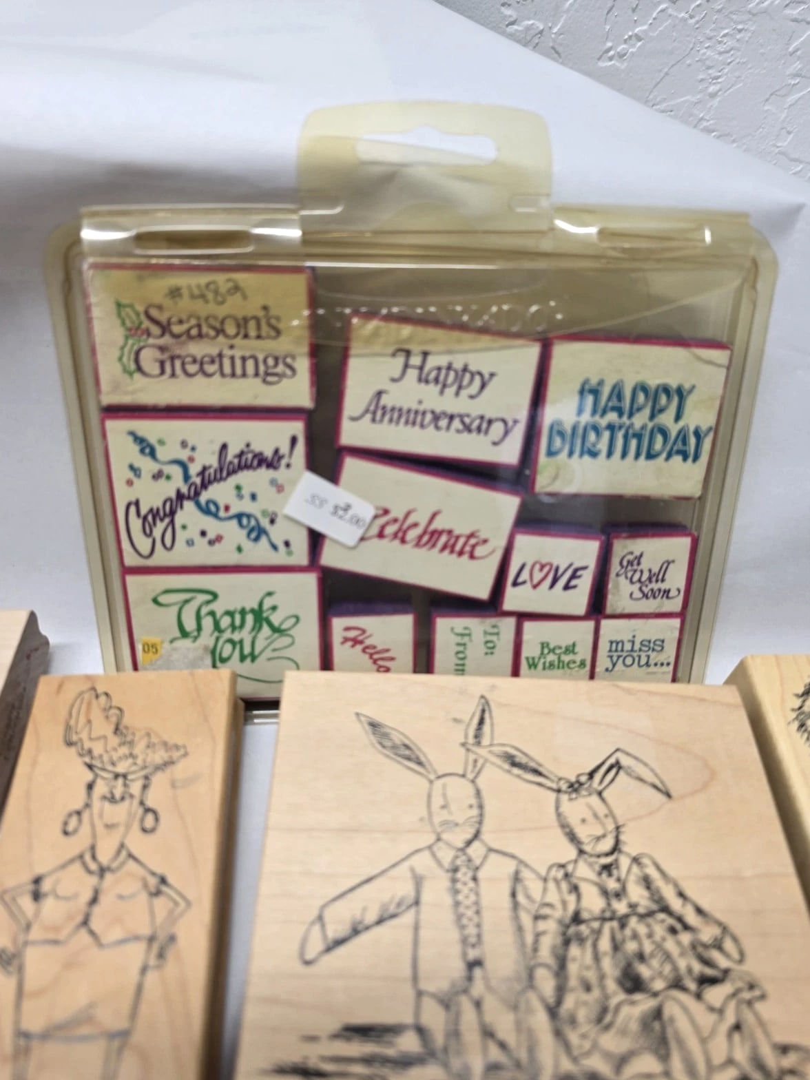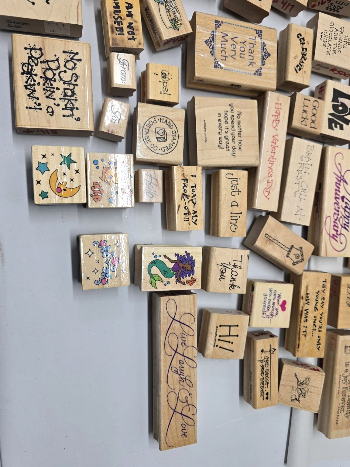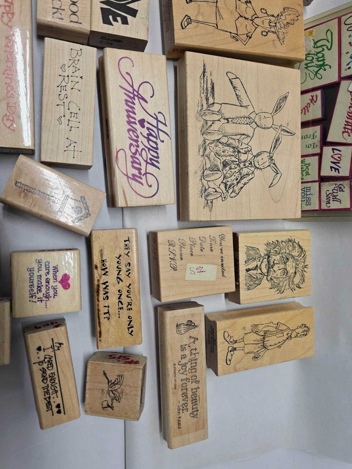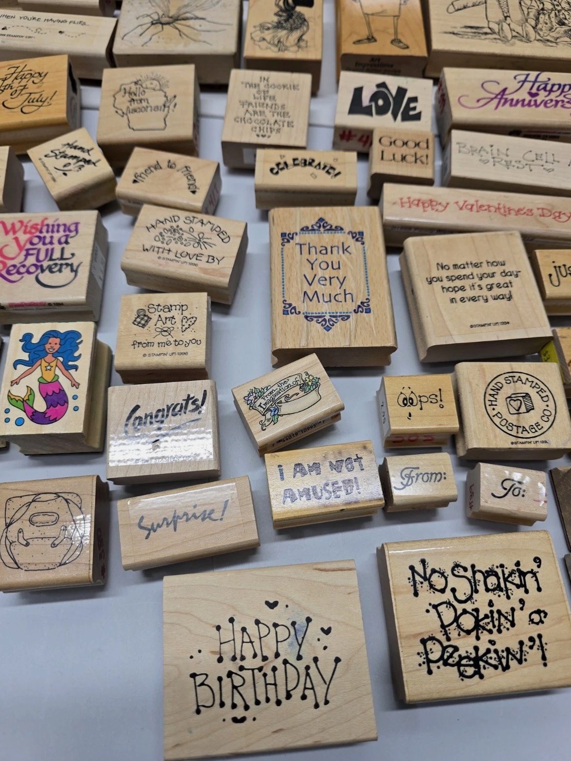 This collection is a LOT of 94 vintage and modern wooden and rubber ink stamps, excellent for arts and crafts projects. The stamps showcase a blend of vintage and modern designs with art-focused themes. Constructed from wood and rubber, these stamps are durable and flexible, perfect for creating distinctive and personalized work. Whether an experienced crafter or beginner, this stamp lot provides extensive creative options for your upcoming projects. We ship fast!