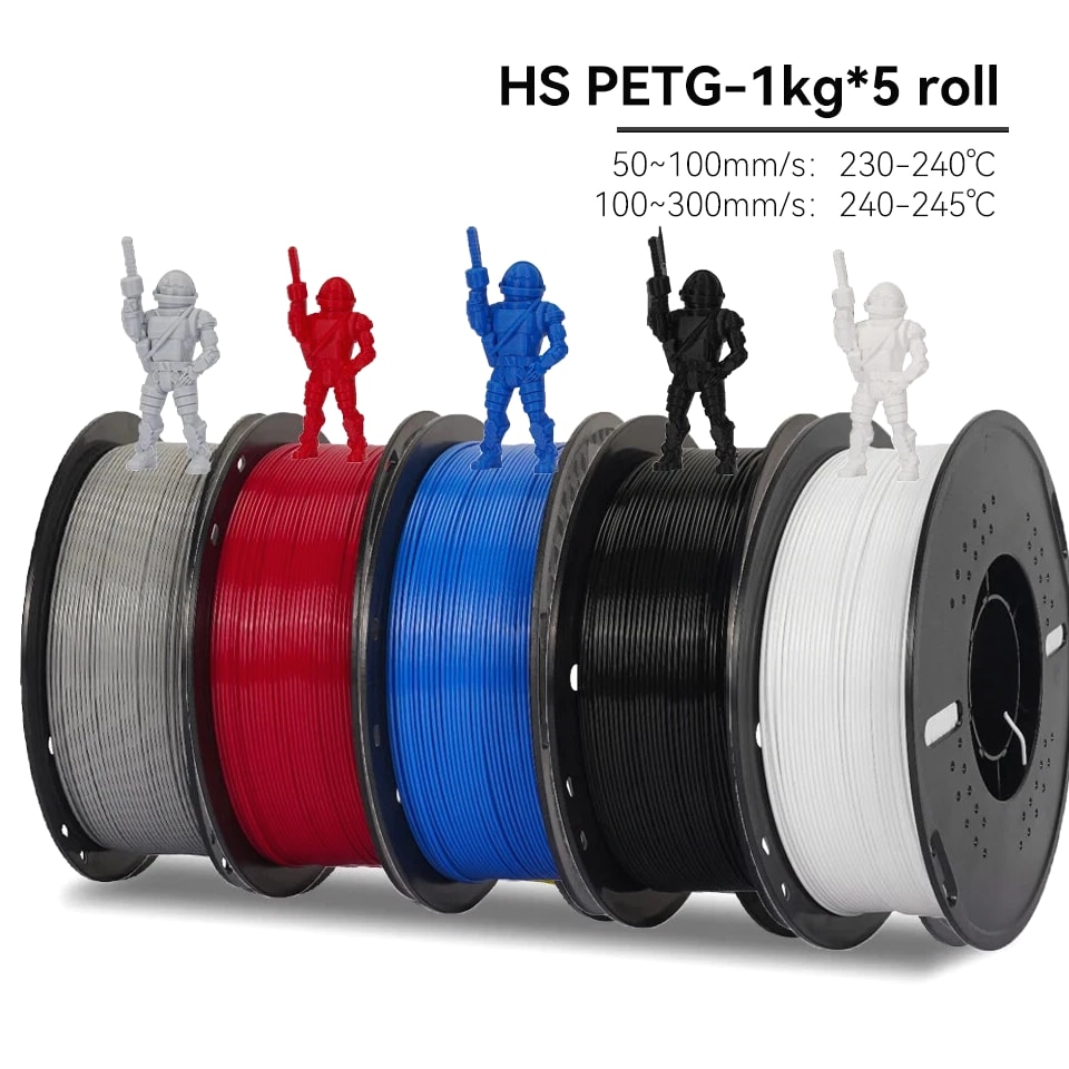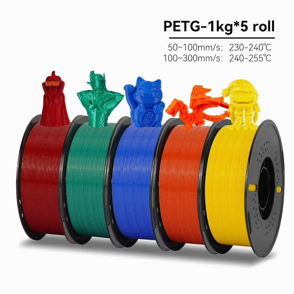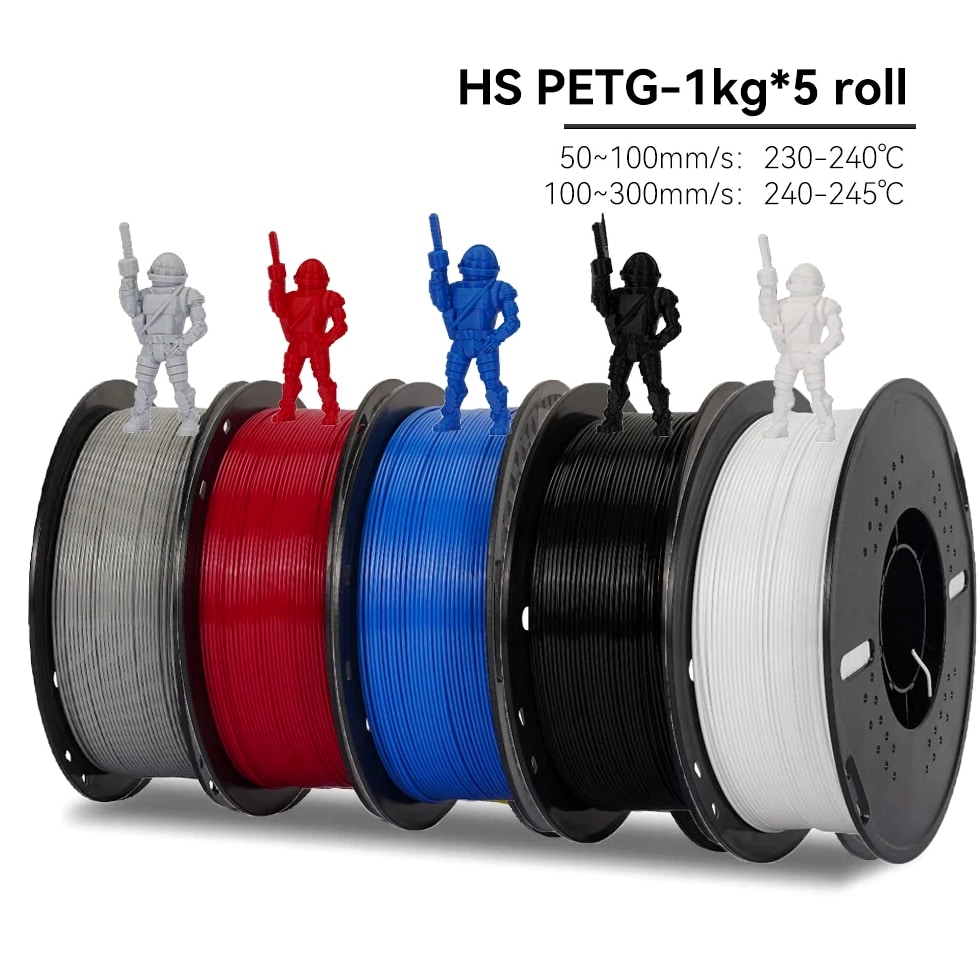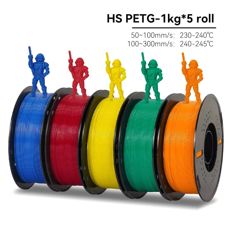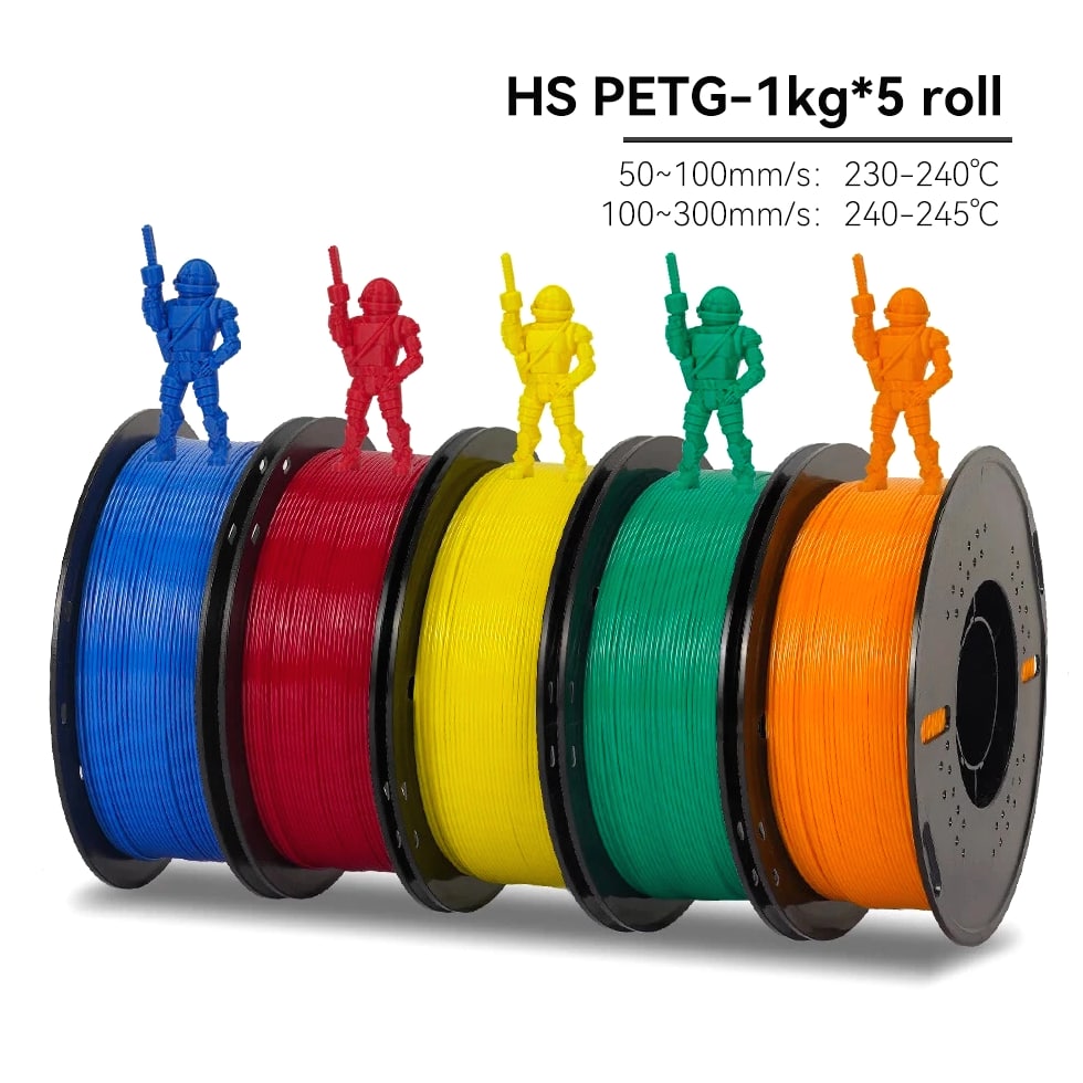 KEEPANG PLA/HS-PLA/PETG/Silk PLA 3D Printer Filament 1.75mm Mix Color 5 Rolls High-Speed PLA Printing Material for Bambu Lab Advantage Faster Printing: Thanks to the high fluidity and fast cooling formula, HS-PETG supports up to 600mm/s print speed. High fluidity provides sufficient melting and extrusion, while rapid cooling provides fast shaping for high-speed printing. Precise Print: High stability ensures small changes in thermal expansion and cold contraction even when printing at high speeds, bringing high precision in dimensions and better results. Uniform Wire Diameter, Stable Extrusion: Based on two-way laser diameter measurement, the filament diameter accuracy is 1.75±0.03mm, which makes it flow out more smoothly. Neat Winding with Smooth Printing: Precise filament diameter control and automatic winding arrangement are combined to ensure smoother printing without tangling. Specification *Product Name: Hyper Series PETG *Color: White, Black, Blue, Red. Grey ,Green, Orange, Yellow, Sliver, Brown(Optional) *Wire Diameter: 1.75±0.03mm *Net Weight: 1Kg/2.2lb *Printing Temperature: 190-230°C Packing List: 5 Roll HS-PETG