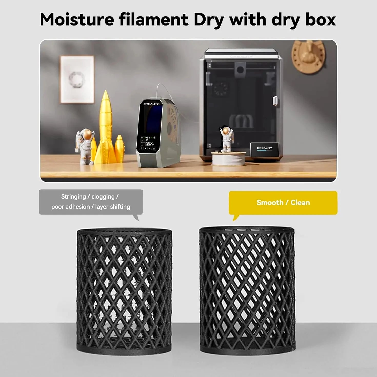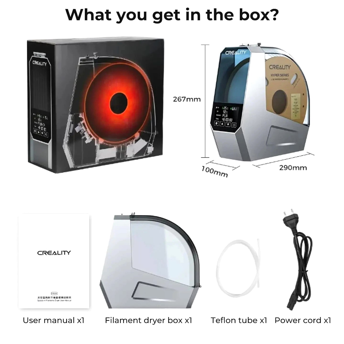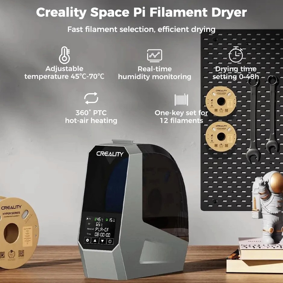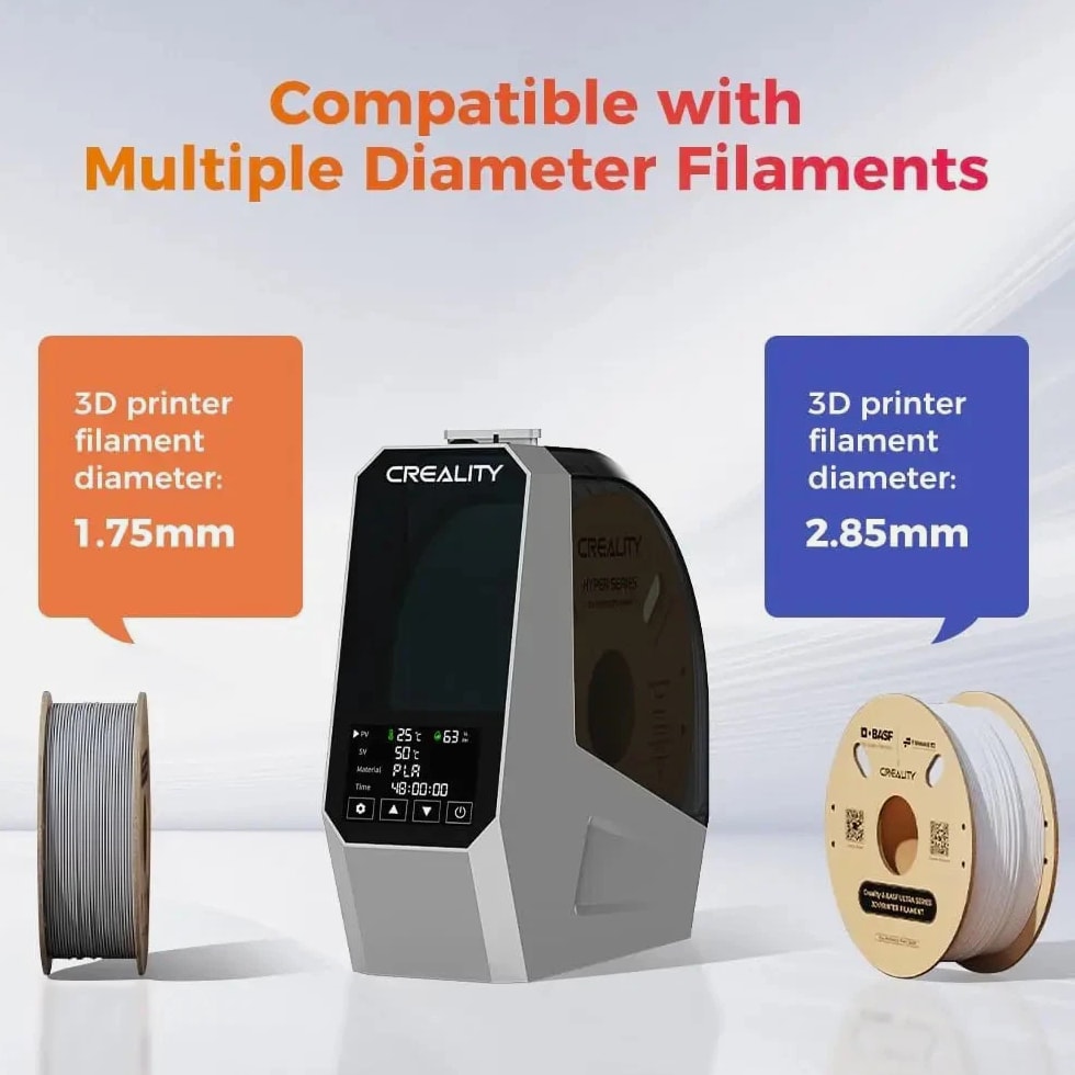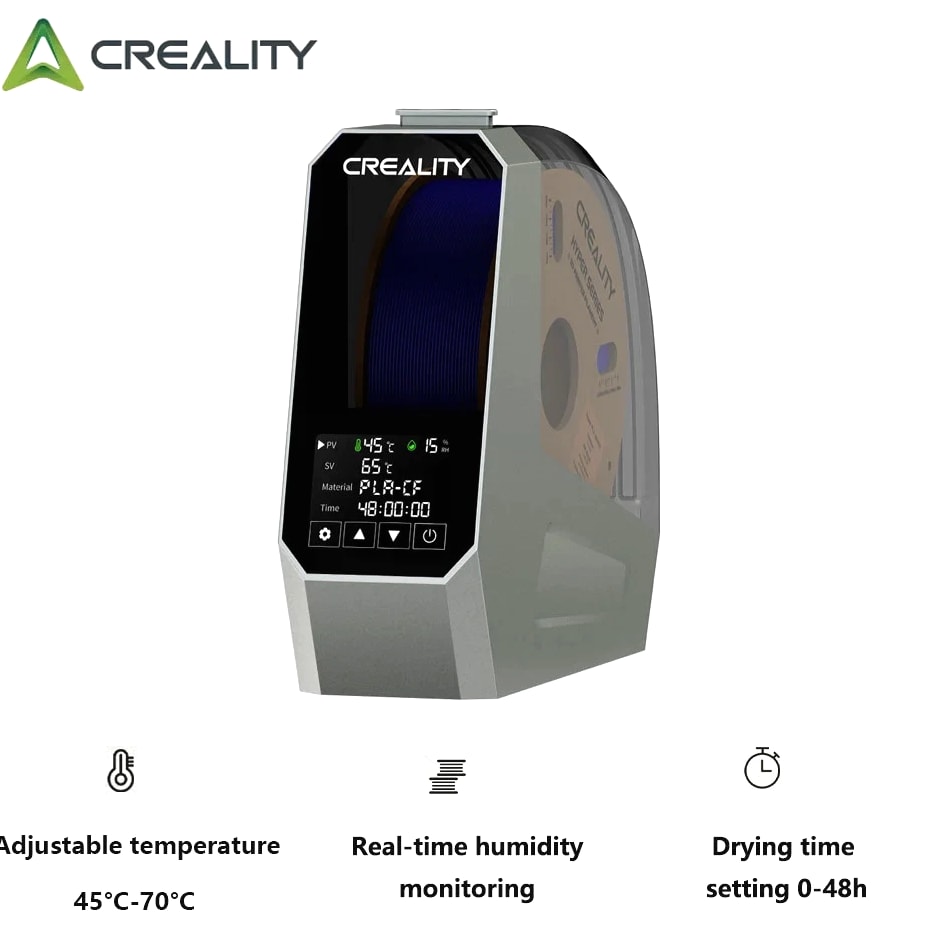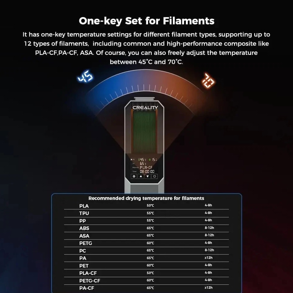 【Upgraded PTC 360° Hot-air Heating】 The filament dryer quickly heats with a built-in fan, circulating hot air 360° for uniform heating, dryer box input voltage: 110V 50/60Hz, effectively drying moisture filaments and improving printing results 【Advanced PTC Heating Technology】 Our filament dryer box employs a unique 110W PTC heater to warm up the space, a feature that sets us apart in the market. Unlike most filament dryers that use a PI heating pad and often result in uneven drying, our model with the PTC heater ensures uniform drying. This PTC heater is not only durable and energy-saving, but also eco-friendly 【Easy Operation LCD Touch Screen】 The Creality Space Pi Filament Dryer comes with a 3.7-inch touch screen for easy operation, making it simple for you to track drying conditions. The touch screen supports switching between ℃ and ℉ temperatures for more convenient settings 【One-key Set for 12 Filaments】 Creality filament dryer has one-key temperature settings for different filament types, supporting up to 12 types of filaments, including common and high-performance composite like PLA-CF, PA-CF, ASA. You can also freely adjust the temperature from 45°C to 70°C 【48 Hours Timer Function】 The 3D printer filament dryer's heating duration can be freely set from 0-48 hours, allowing the filaments to be fully dried for better printing results. Keep your filaments dry and free from moisture for consistent high-quality prints 【Parameter Power-off Memory Function】 Our filament dehydrator can restart and still remember your previous material and temperature settings after a power outage, saving you the trouble of resetting and ensuring fast drying 【Compatible with Multiple Diameter Filaments】 Creality filament dryer box is compatible with most 1.75mm/2.85mm 3D Printer filaments. Not only can it be used with a variety of common filaments, like PLA, PETG, TPU, ABS, but also high-performance composite like PLA-CF, PA-CF, ASA. Pair high-speed printers and high-speed filaments to