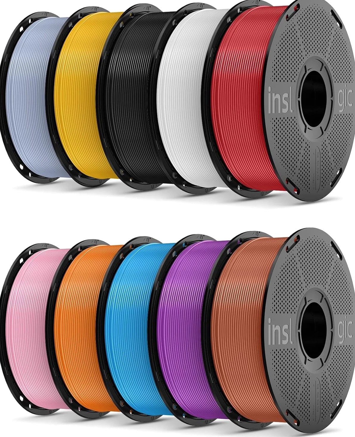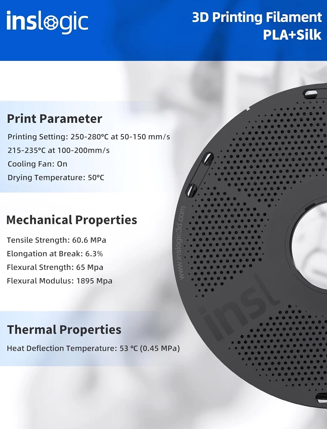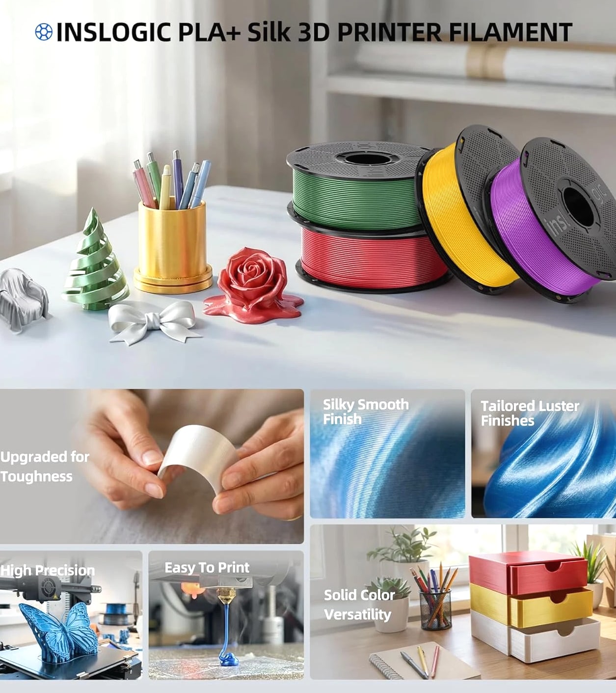 【SILK 3D Printer Filament Bundle】10kg in Total, 10 Spools of 1000g Inslogic 1.75mm SILK filament. Multiple Color Choices, 10 colours: Silver, Gold, Black, White, Red, Pink, Orange, Blue, Purple, and Copper. PLA Silk+ presents a stunning array of vibrant color options to suit all your creative needs. 【Smooth Like Silk】Inslogic Silk PLA gives every 3D print a silky shine and smooth, flawless finish, making your creations look more professional and beautiful. 【Unique Dynamic Color-Shifting Aesthetics】The colors shift dynamically with light and angle, giving each print a unique, vibrant, and fluid appearance. 【Enhanced Layer Adhesion】No need to make any trade-offs between layer adhesion and appearance. Inslogic PLA Silk+ provides enhanced layer adhesion. Prevents warping, cracking, or delamination during printing. 【Maintains Mechanical Strength of PLA】Inslogic multicolor silk filament combines PLA strength for durable, glossy prints with a perfect balance of beauty and function. 【High Precision】Provides a finer texture with intricate details and enhanced depth, creating a more three-dimensional visual effect. 【After-Sales Support】Inslogic offers comprehensive after-sales service and technical support. Contact anytime with any questions.