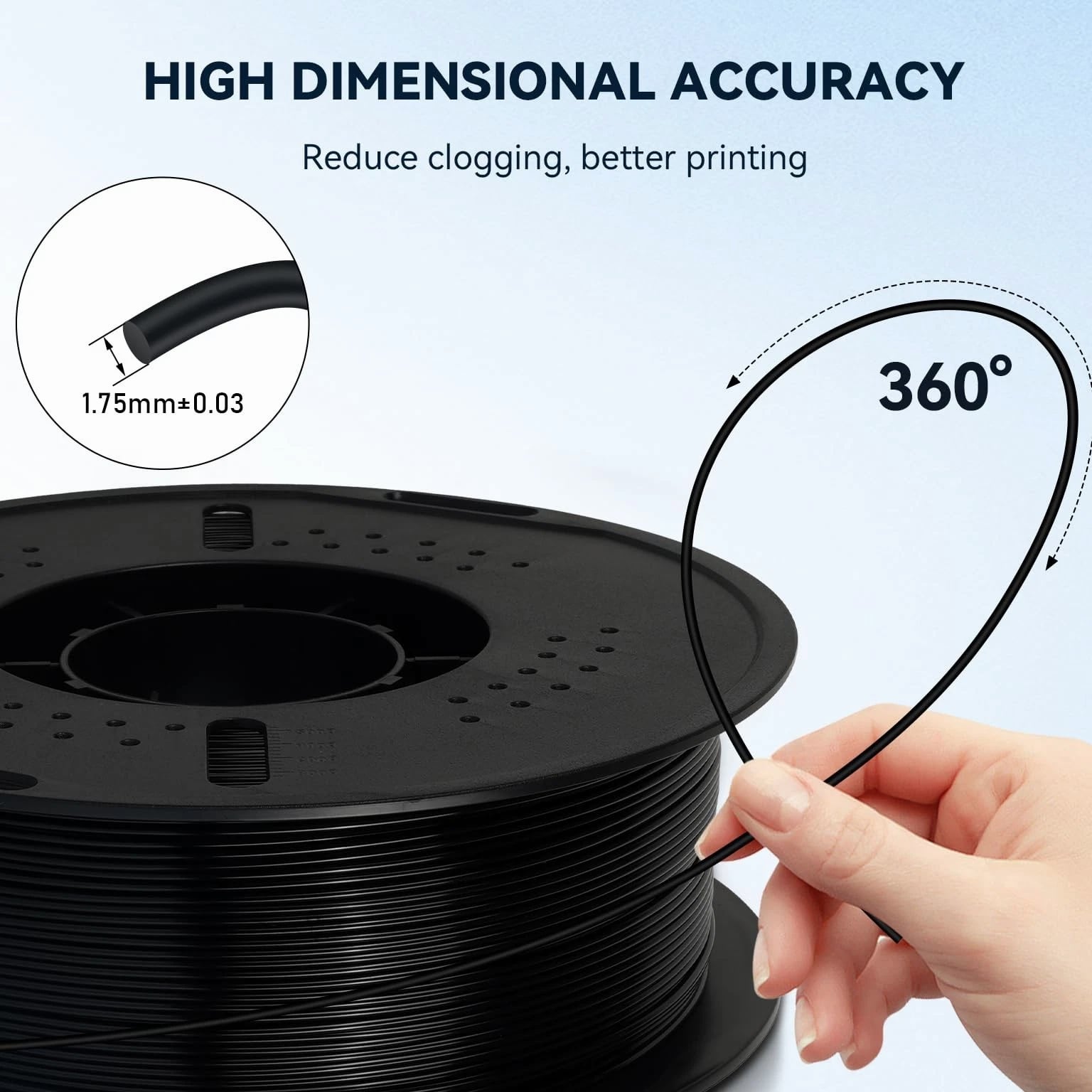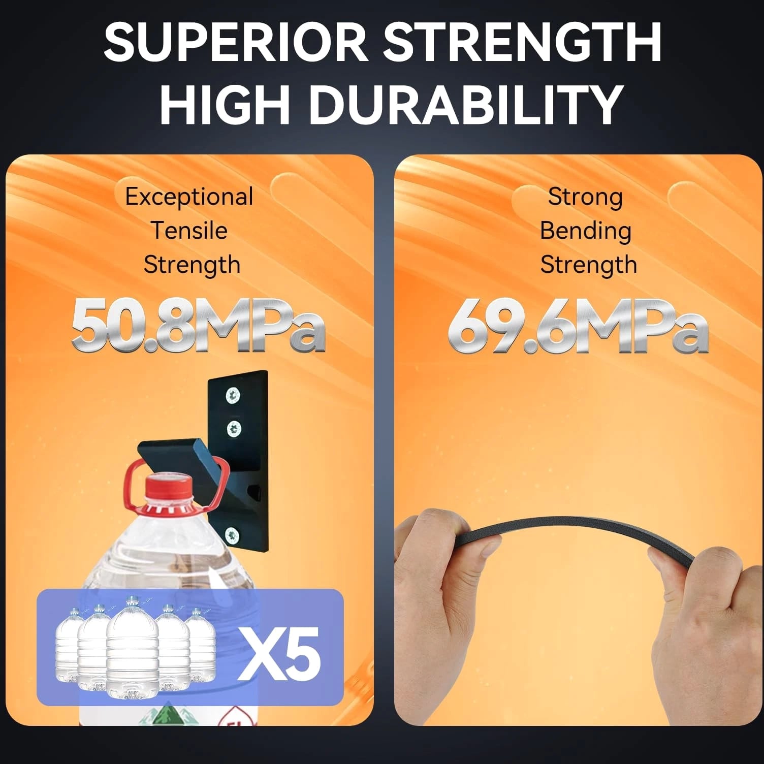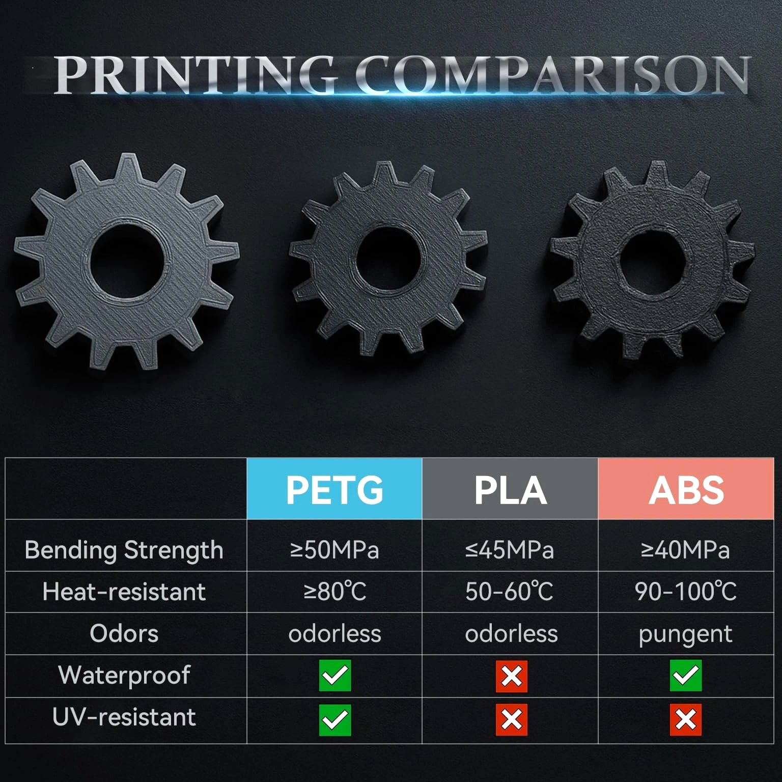 Upgrade your 3D printing projects with premium PETG filament that combines industrial-level strength with simple printability. Designed for amateur makers and professional engineers alike, this filament offers a unique balance of thermal resistance (up to 84 °C) and mechanical strength (69.6 MPa flexural strength)—ideal for demanding applications like mechanical parts, outdoor tools, jigs, or durable enclosures. Each spool is 1kg (2.2 lbs) and precisely wound to avoid tangles and feeding issues. The 1.75mm diameter with ±0.03mm precision supports consistent extrusion, while its low odor and minimal warp properties provide a cleaner, hassle-free printing experience. Whether you choose a single roll or a 10-pack, every set is vacuum-sealed with desiccant to ensure long shelf life and stable performance. Compatible with most FDM/FFF 3D printers. This PETG filament is your go-to solution for producing robust, functional, and heat-resistant parts with excellent layer bonding and a sleek finish. Our PETG 3D printer filament is available in various quantity packs to suit both hobbyists and professionals. Perfect for bulk printing or stocking up for long-term use. Each spool is 1.75mm in diameter, universally compatible with most FDM 3D printers. Excellent Thermal Resistance – Up to 84 °C – Engineered for performance, this PETG filament withstands temperatures up to 84°C (183°F), making it ideal for functional 3D printed parts, outdoor components, and high-heat applications. Print with confidence in warm or demanding environments. Exceptional Strength & Durability – Flexural Strength Up to 69.6 MPa – Built for structural integrity, our 3D printer PETG material offers a flexural strength of up to 69.6MPa, giving your prints outstanding toughness, resilience, and resistance to cracking under pressure—perfect for brackets, tools, and enclosures. High Precision & Consistency – ±0.02mm Dimensional Accuracy – Featuring tangle-free winding and advanced extrusion control, this PETG e