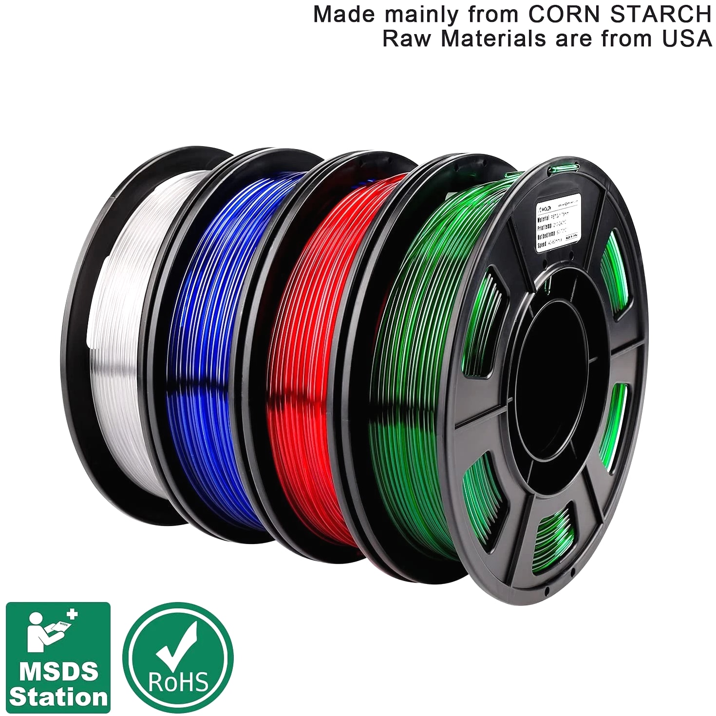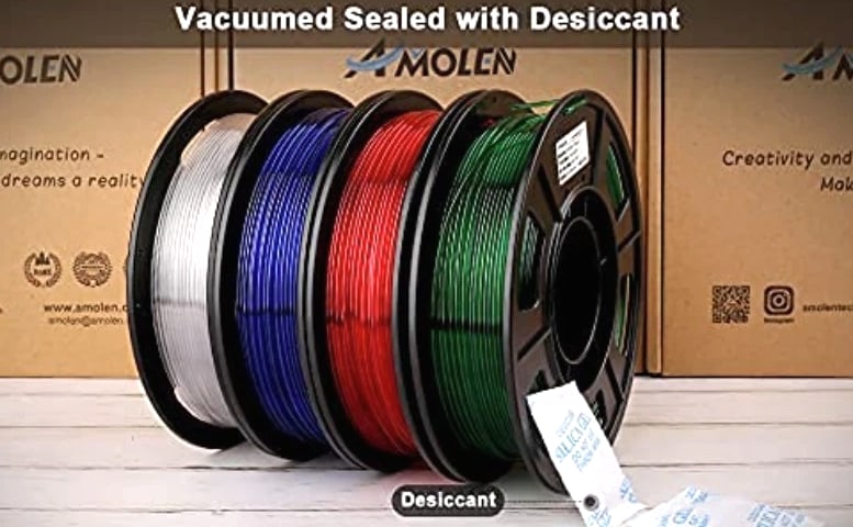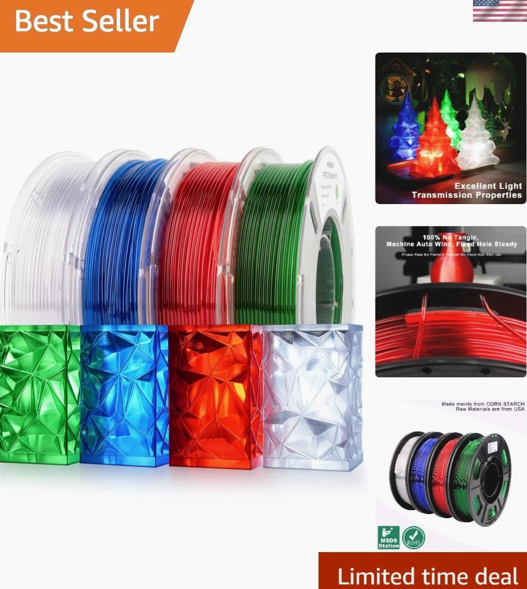 4 Colors PETG Filament for 3D Printing 250g Each, Clear/White, Red, Green, Blue 4 COLORS PETG TRANSPARENT FILAMENT: Package includes 4 PETG filament spools in Clear/White, Red, Green, and Blue, each with a net weight of 250 g. TRANSPARENT PETG MATERIAL: Offers a semi-transparent appearance with excellent light transmission, ideal for vibrant 3D printing projects. MATERIAL TYPE: Crafted from high-quality PETG (Polyethylene Terephthalate Glycol), ensuring durability and an odorless experience. FILAMENT DIAMETER & COMPATIBILITY: Designed with a filament diameter of 1.75 mm and dimensional tolerance of ±0.02 mm, making it compatible with most 3D printers that support PETG filament. Recommended hotend temperature ranges from 230–270 °C. VACUUM PACKAGING: Each PETG filament spool comes vacuum sealed with desiccant included, ensuring top quality and preventing moisture absorption. Why Choose Our PETG Filament? Transform your 3D printing projects with our high-quality 250g PETG filament spools. Featuring vibrant colors and a semi-transparent finish, this filament is perfect for creating stunning visual effects and durable prints. The odorless PETG material ensures a pleasant user experience, while the vacuum packaging guarantees that your filament arrives in pristine condition. Engineered for compatibility with most 3D printers, our 1.75 mm filament with precise dimensional tolerance provides the reliability you need for every print. Whether you're crafting intricate designs or functional prototypes, elevate your 3D printing craftsmanship with our assortment of PETG filament colors. Indulge in the art of creation—order your 4 Colors PETG Filament today and bring your innovative ideas to life!