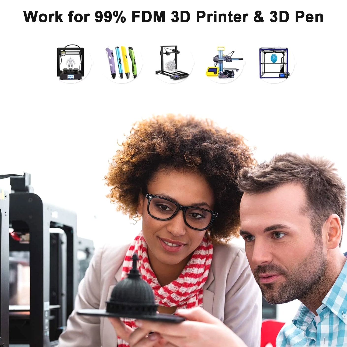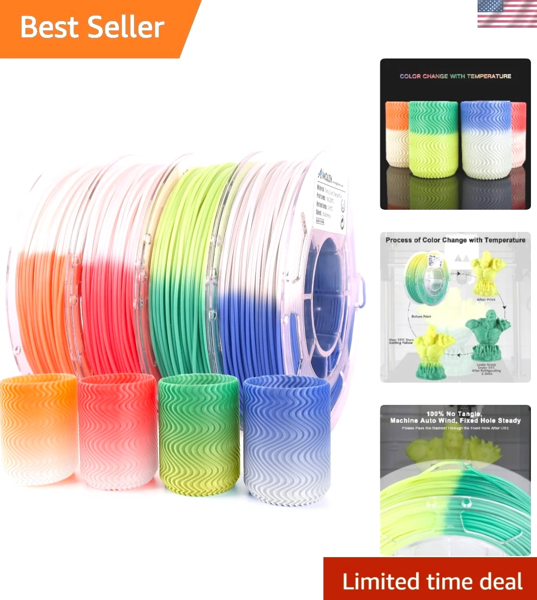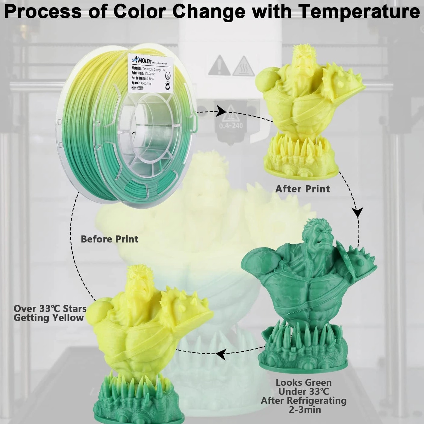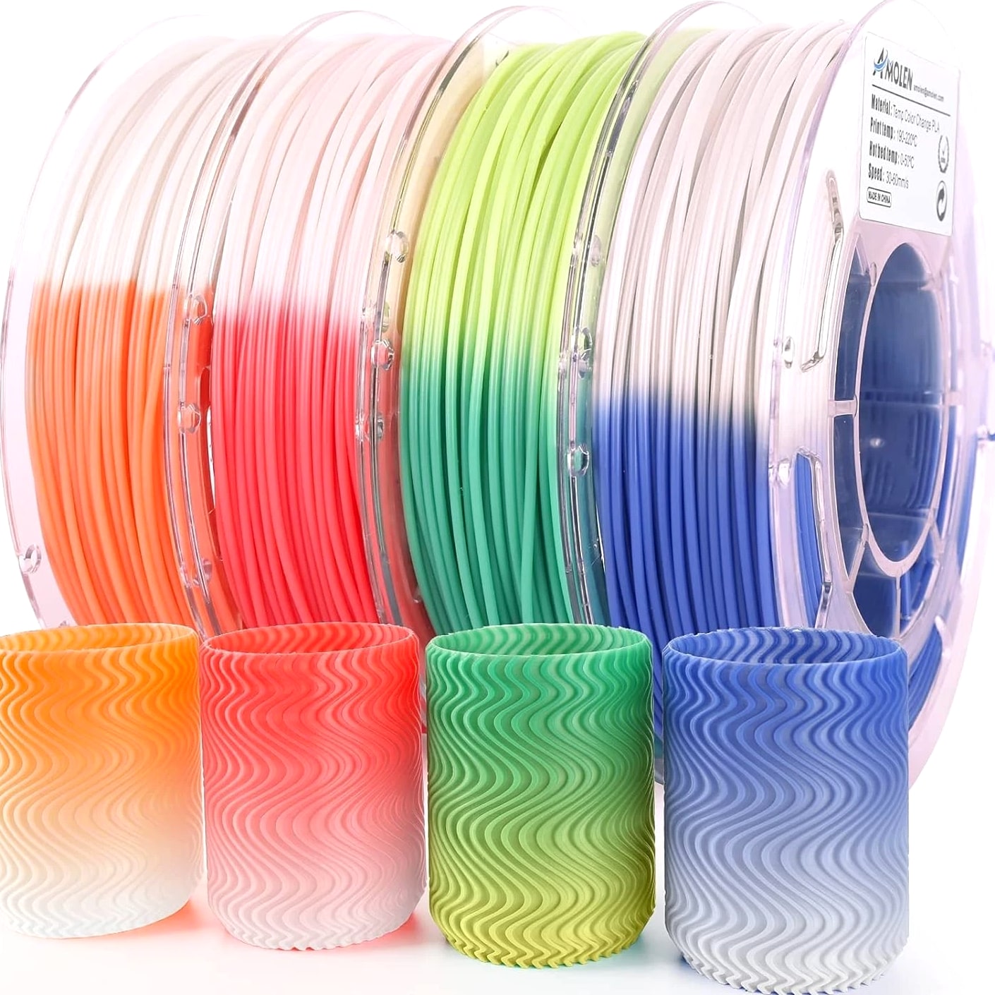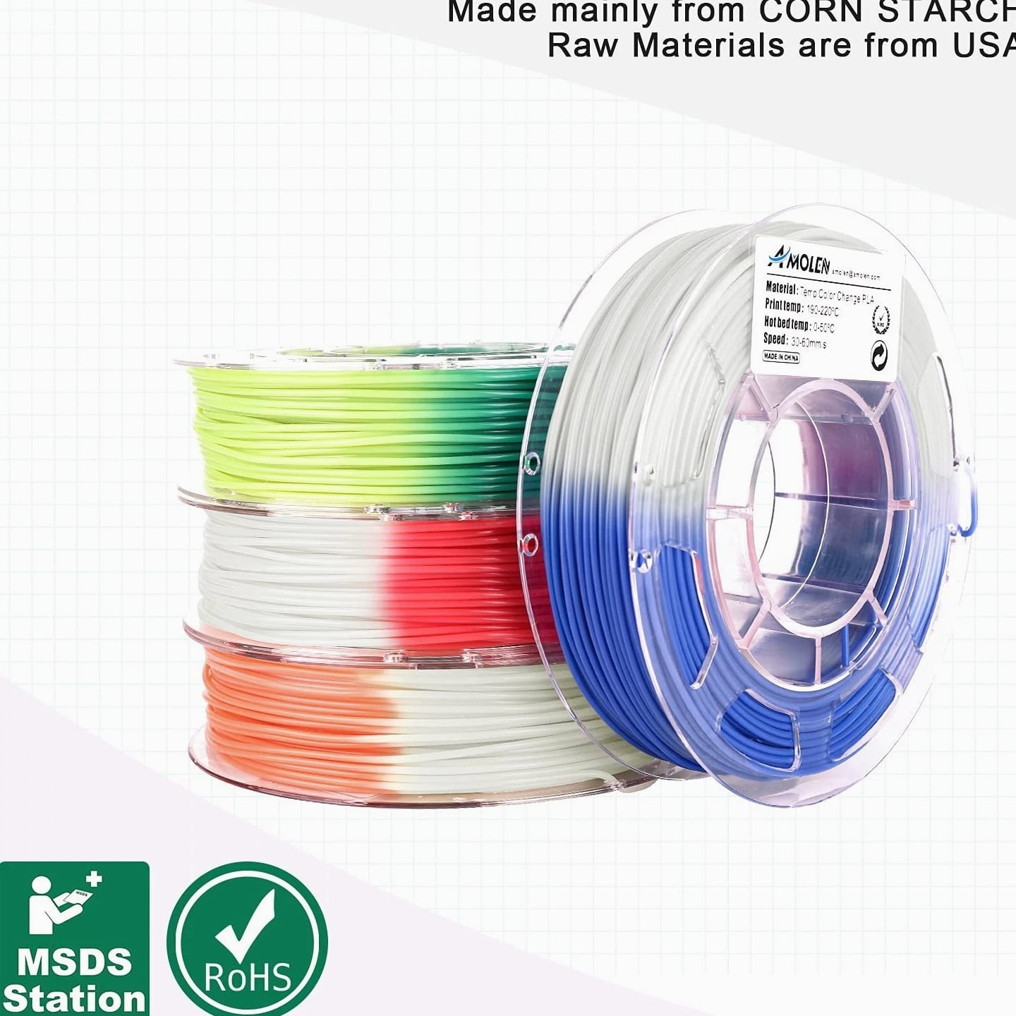 Vibrant Temperature Change PLA Filament for 3D Printers 4 Colors, 200g Spools Product Features: PLA Filament Bundle: Includes four vibrant colors - 200g per spool, featuring unique transitions from green to yellow, blue to white, red to white, and orange to white. Dynamic Color Change: Experience the magic as the PLA filament shifts colors with temperature changes; under 33℃, the colors are vivid and bright, while exceeding this temperature unveils a striking transformation. Quality Material for Smooth Printing: Sourced from premium sources, this 1.75mm color-changing filament ensures excellent performance, enabling fine detailing in 3D prints with no bubbles, jamming, or warping. High Compatibility: This PLA filament is compatible with most FDM 3D printers, including MakerBot, LulzBot, FlashForge, Creality 3D, and more, ensuring versatility in your printing endeavors. Packaging: Each filament spool is vacuum-packed with a desiccant to maintain dryness and dust-free conditions, ensuring optimal performance over time. Reliable Support: With a 100% after-sales service guarantee, we offer professional technical guidance for your 3D printing needs and prompt resolution for defective products, ensuring your satisfaction. Why Choose Our Temperature Change PLA Filament? Elevate your 3D printing projects with our Vibrant Temperature Change PLA Filament—designed for creativity and precision. Infuse fun and excitement into your prints as they change color based on ambient temperature! Whether crafting eye-catching models or functional parts, this filament delivers unmatched consistency and aesthetic appeal. With its robust compatibility and superior quality, this PLA filament is perfectly suited for both novice and expert makers alike. Explore the fascinating world of color transformations and mesmerizing prints today - make it yours!