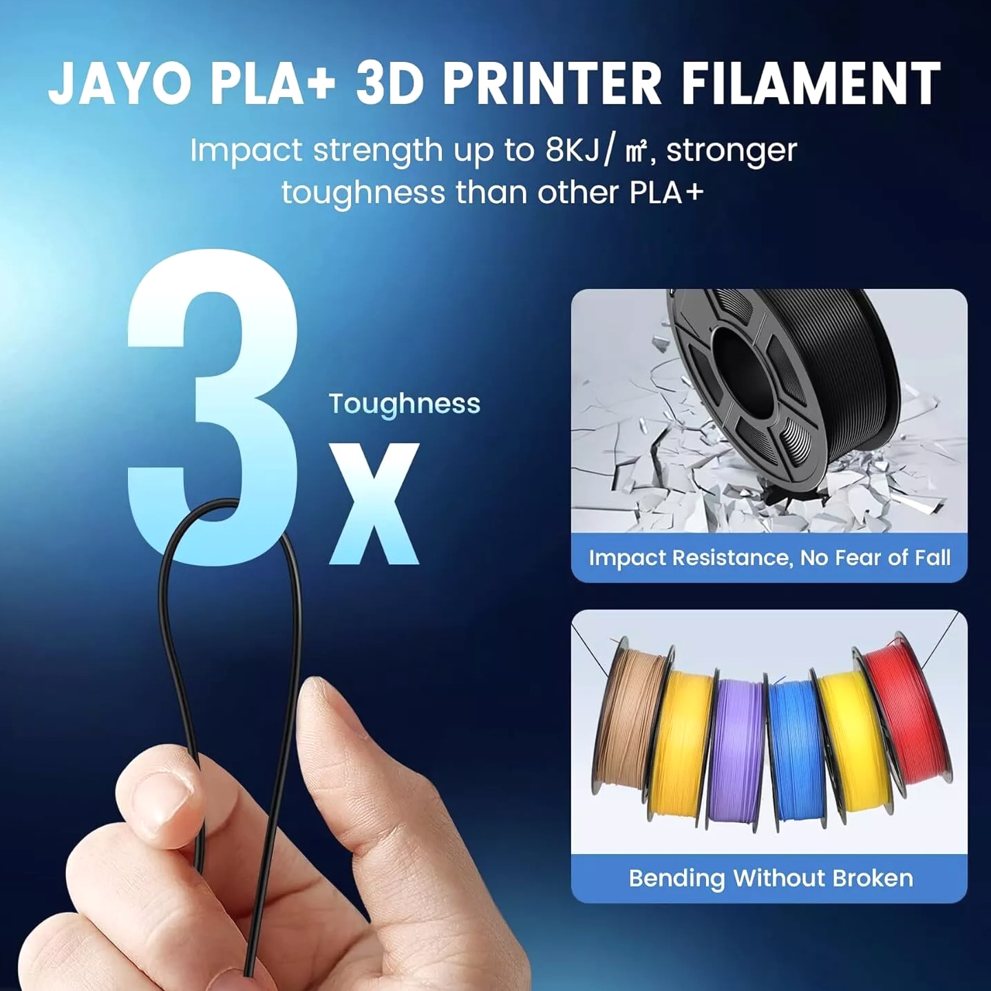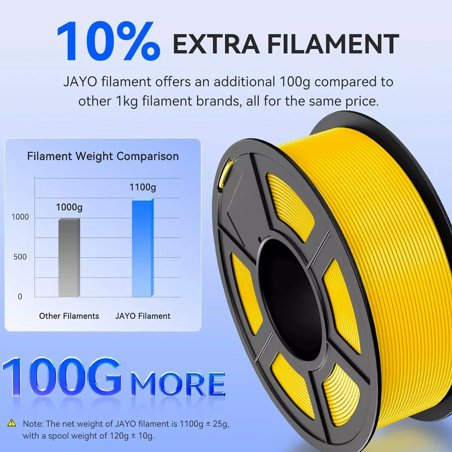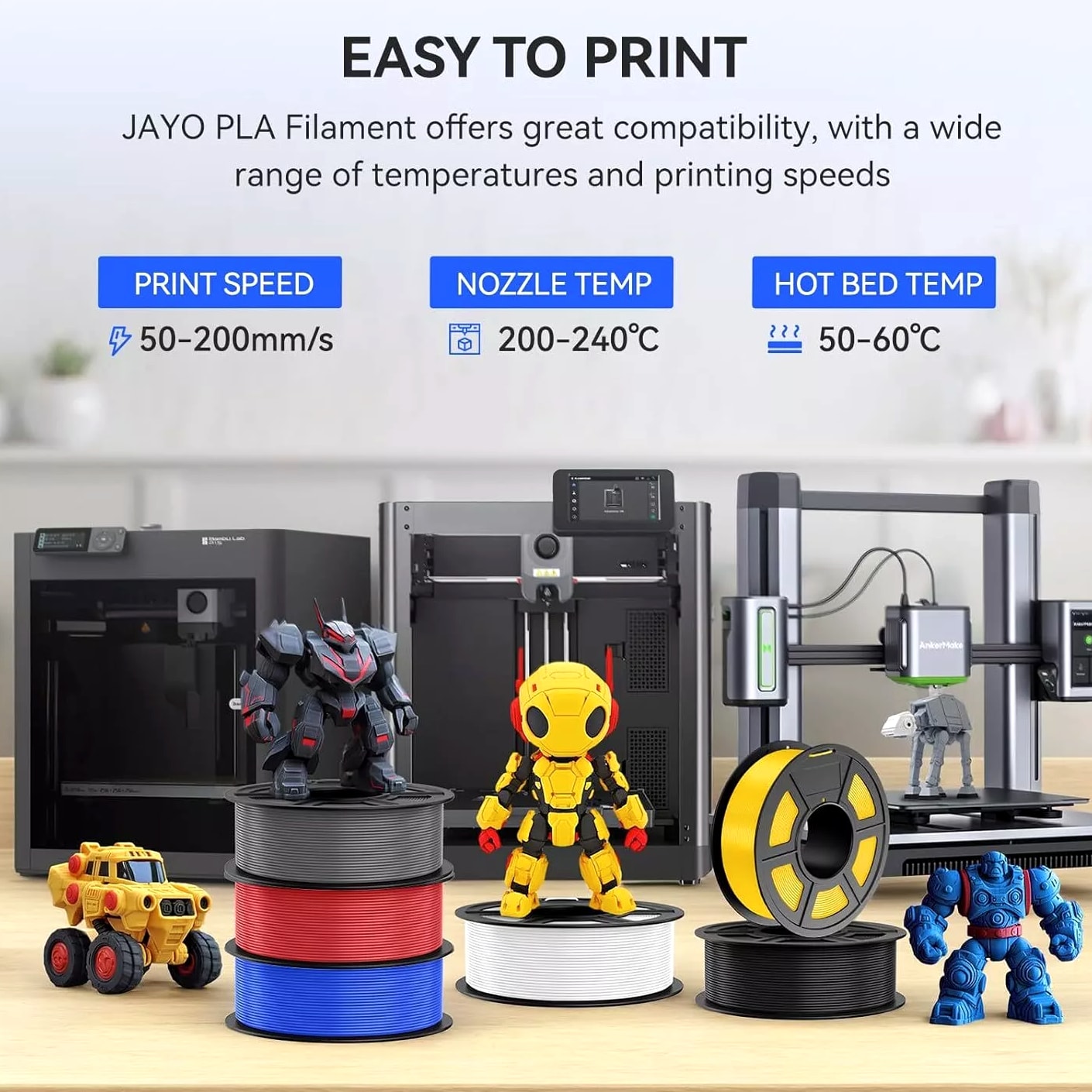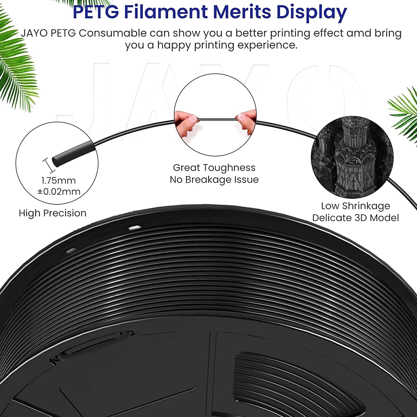JAYO 10KG/20KG 3D Printer Filament 1.75mm Options The Following Filaments are 100% Neatly Wound -- PLA / PLA+ / PETG / SILK / PLA Meta / PLA Matte (ABS / TPU / PLA Marble is not included.) Filament Wire Diameter Tolerance Printing Temperature Print speed Heat Distortion Temperature Print Platform Temperature Net weight 1.75MM ±0.02mm 200-210℃ 50-100mm/s 53℃ 50-60℃ 1.1KG PLA+ ±0.02mm 195-205℃ 50-100mm/s 50-60℃ 1.1KG PLA+2.0 ±0.02mm 195-205℃ 50-100mm/s 50-60℃ 1.1KG PLA Meta ±0.02mm 185-195℃ 50-150mm/s 50-60℃ 1.1KG PLA Matte ±0.02mm 205-215℃ 50-100mm/s 50-60℃ 1.1KG HighSpeed PLA ±0.02mm / 190-210℃, 50-150mm/s 210-230℃,150-300mm/s 230-260℃,300-600mm/s 53℃ 50-60℃ 1.1KG PLA Glow ±0.02mm 195-215℃ 50-100mm/s 53℃ 50-60℃ 1.1KG PLA Carbon Fibre ±0.02mm 205-215℃ 40-60mm/s 53℃ 50-60℃ 1.1KG PLA Marble ±0.03mm 210-220℃ 40-60mm/s 53℃ 50-60℃ 1.1KG WOOD ±0.03mm 195-215℃ 40-60mm/s 53℃ 60-70℃ 1.1KG PETG ±0.02mm 230-240℃ 40-60mm/s 63℃ 60-70℃ 1.1KG PLA+ SILK ±0.02mm 205-215℃ 40-60mm/s 53℃ 50-60℃ 1.1KG TPU(95A) ±0.03mm 195-205℃ Proximal Extrusion:40mm/s Remote Extrusion:20mm/s 52℃ 50-60℃ 0.5KG TPU-SILK(98A) ±0.03mm 210-220℃ Proximal Extrusion:50mm/s Remote Extrusion:30mm/s 131℃ 50-60℃ 1.1KG ABS ±0.03mm 250-260℃ 40-60mm/s 84℃ 80-100℃ Easy ABS ±0.03mm 225-235℃ 40-60mm/s 57.9℃ 60-70℃ JAYO 1.1KG PLA Filament 1.75mm Dimensional Accuracy +/- 0.02mm, Compatible with Most FDM Printers JAYO 1.1KG PLA+ Filament 1.75mm Dimensional Accuracy +/- 0.02mm, Compatible with Most FDM Printers JAYO 1.1KG Matte PETG Filament 1.75mm Dimensional Accuracy +/- 0.02mm, Compatible with Most FDM Printers JAYO 1.1KG PLA+ SILK Filament 1.75mm Dimensional Accuracy +/- 0.02mm, Compatible with Most FDM Printers JAYO 1.1KG PLA Marble Filament 1.75mm Dimensional Accuracy +/- 0.02mm, Compatible with Most FDM Printers Delivery details