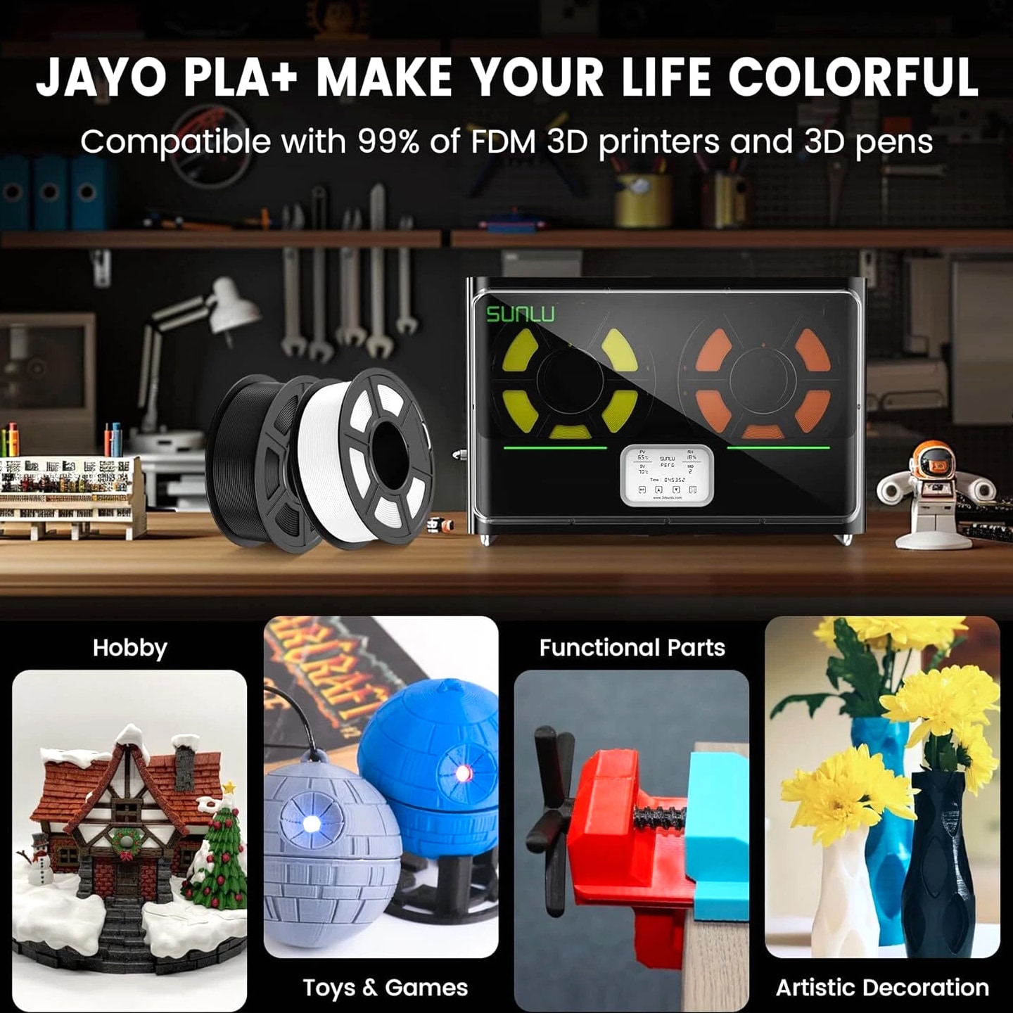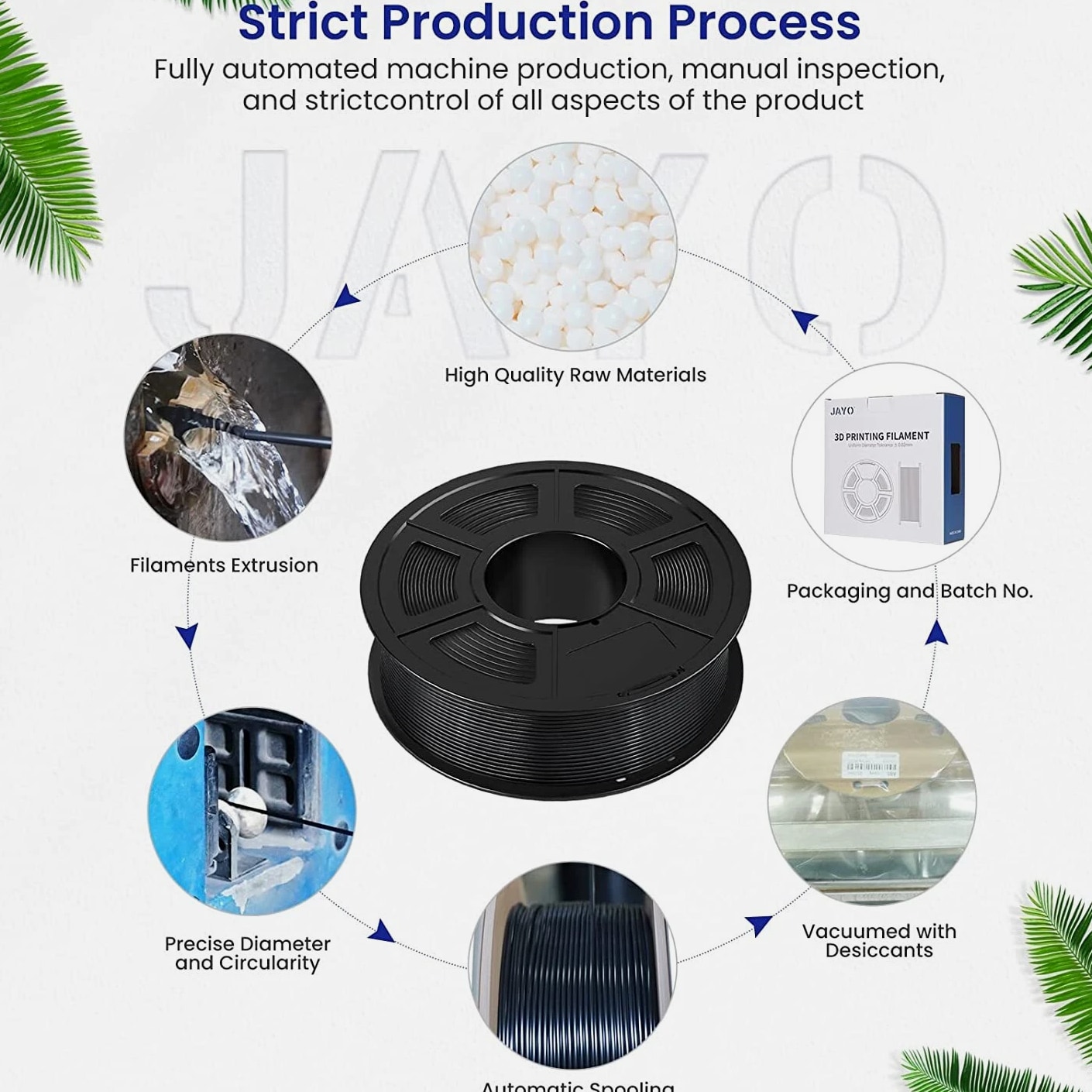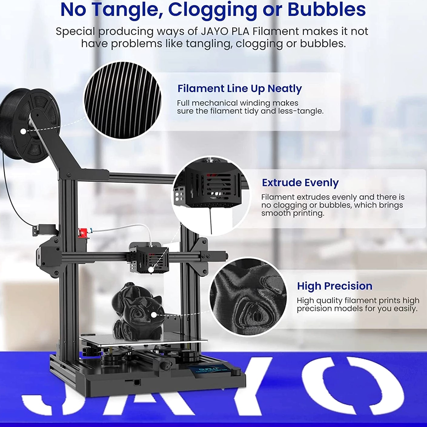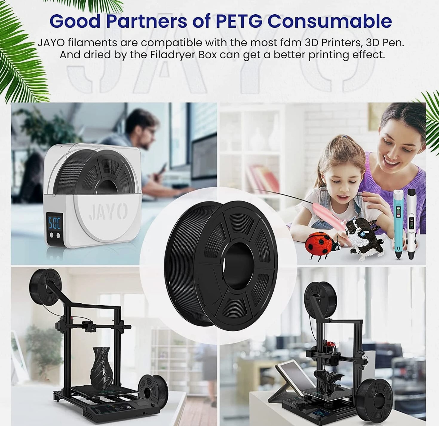 JAYO 10KG/20KG 3D Printer Filament 1.75mm Options The Following Filaments are 100% Neatly Wound -- PLA / PLA+ / PETG / SILK / PLA Meta / PLA Matte (ABS / TPU / PLA Marble is not included.) Filament Wire Diameter Tolerance Printing Temperature Print speed Heat Distortion Temperature Print Platform Temperature Net weight 1.75MM ±0.02mm 200-210℃ 50-100mm/s 53℃ 50-60℃ 1.1KG PLA+ ±0.02mm 195-205℃ 50-100mm/s 50-60℃ 1.1KG PLA+2.0 ±0.02mm 195-205℃ 50-100mm/s 50-60℃ 1.1KG PLA Meta ±0.02mm 185-195℃ 50-150mm/s 50-60℃ 1.1KG PLA Matte ±0.02mm 205-215℃ 50-100mm/s 50-60℃ 1.1KG HighSpeed PLA ±0.02mm / 190-210℃, 50-150mm/s 210-230℃,150-300mm/s 230-260℃,300-600mm/s 53℃ 50-60℃ 1.1KG PLA Glow ±0.02mm 195-215℃ 50-100mm/s 53℃ 50-60℃ 1.1KG PLA Carbon Fibre ±0.02mm 205-215℃ 40-60mm/s 53℃ 50-60℃ 1.1KG PLA Marble ±0.03mm 210-220℃ 40-60mm/s 53℃ 50-60℃ 1.1KG WOOD ±0.03mm 195-215℃ 40-60mm/s 53℃ 60-70℃ 1.1KG PETG ±0.02mm 230-240℃ 40-60mm/s 63℃ 60-70℃ 1.1KG PLA+ SILK ±0.02mm 205-215℃ 40-60mm/s 53℃ 50-60℃ 1.1KG TPU(95A) ±0.03mm 195-205℃ Proximal Extrusion:40mm/s Remote Extrusion:20mm/s 52℃ 50-60℃ 0.5KG TPU-SILK(98A) ±0.03mm 210-220℃ Proximal Extrusion:50mm/s Remote Extrusion:30mm/s 131℃ 50-60℃ 1.1KG ABS ±0.03mm 250-260℃ 40-60mm/s 84℃ 80-100℃ Easy ABS ±0.03mm 225-235℃ 40-60mm/s 57.9℃ 60-70℃ JAYO 1.1KG PLA Filament 1.75mm Dimensional Accuracy +/- 0.02mm, Compatible with Most FDM Printers JAYO 1.1KG PLA+ Filament 1.75mm Dimensional Accuracy +/- 0.02mm, Compatible with Most FDM Printers JAYO 1.1KG Matte PETG Filament 1.75mm Dimensional Accuracy +/- 0.02mm, Compatible with Most FDM Printers JAYO 1.1KG PLA+ SILK Filament 1.75mm Dimensional Accuracy +/- 0.02mm, Compatible with Most FDM Printers JAYO 1.1KG PLA Marble Filament 1.75mm Dimensional Accuracy +/- 0.02mm, Compatible with Most FDM Printers Delivery details