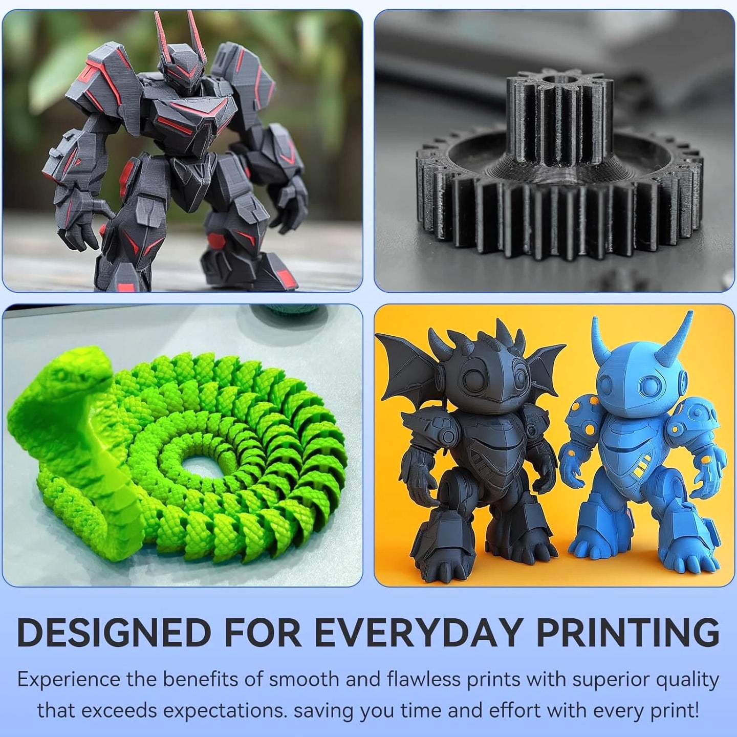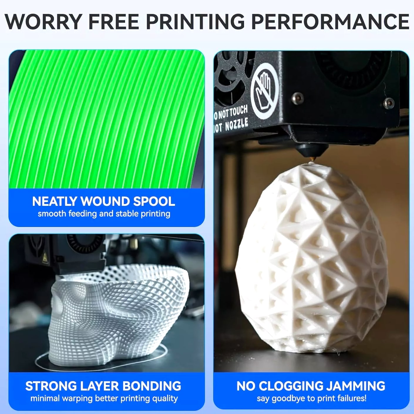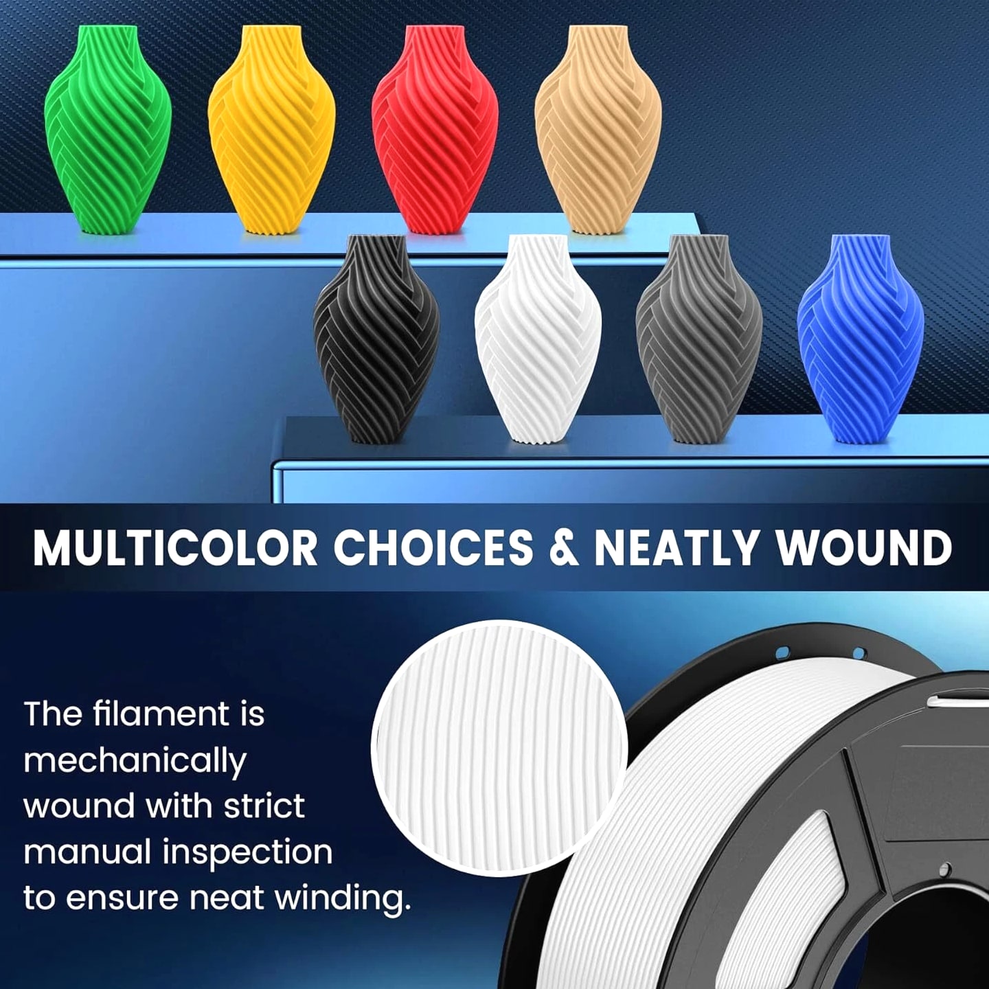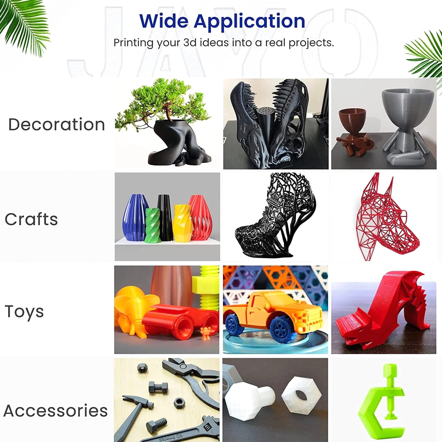 JAYO 10KG/20KG 3D Printer Filament 1.75mm Options The Following Filaments are 100% Neatly Wound -- PLA / PLA+ / PETG / SILK / PLA Meta / PLA Matte (ABS / TPU / PLA Marble is not included.) Filament Wire Diameter Tolerance Printing Temperature Print speed Heat Distortion Temperature Print Platform Temperature Net weight 1.75MM ±0.02mm 200-210℃ 50-100mm/s 53℃ 50-60℃ 1.1KG PLA+ ±0.02mm 195-205℃ 50-100mm/s 50-60℃ 1.1KG PLA+2.0 ±0.02mm 195-205℃ 50-100mm/s 50-60℃ 1.1KG PLA Meta ±0.02mm 185-195℃ 50-150mm/s 50-60℃ 1.1KG PLA Matte ±0.02mm 205-215℃ 50-100mm/s 50-60℃ 1.1KG HighSpeed PLA ±0.02mm / 190-210℃, 50-150mm/s 210-230℃,150-300mm/s 230-260℃,300-600mm/s 53℃ 50-60℃ 1.1KG PLA Glow ±0.02mm 195-215℃ 50-100mm/s 53℃ 50-60℃ 1.1KG PLA Carbon Fibre ±0.02mm 205-215℃ 40-60mm/s 53℃ 50-60℃ 1.1KG PLA Marble ±0.03mm 210-220℃ 40-60mm/s 53℃ 50-60℃ 1.1KG WOOD ±0.03mm 195-215℃ 40-60mm/s 53℃ 60-70℃ 1.1KG PETG ±0.02mm 230-240℃ 40-60mm/s 63℃ 60-70℃ 1.1KG PLA+ SILK ±0.02mm 205-215℃ 40-60mm/s 53℃ 50-60℃ 1.1KG TPU(95A) ±0.03mm 195-205℃ Proximal Extrusion:40mm/s Remote Extrusion:20mm/s 52℃ 50-60℃ 0.5KG TPU-SILK(98A) ±0.03mm 210-220℃ Proximal Extrusion:50mm/s Remote Extrusion:30mm/s 131℃ 50-60℃ 1.1KG ABS ±0.03mm 250-260℃ 40-60mm/s 84℃ 80-100℃ Easy ABS ±0.03mm 225-235℃ 40-60mm/s 57.9℃ 60-70℃ JAYO 1.1KG PLA Filament 1.75mm Dimensional Accuracy +/- 0.02mm, Compatible with Most FDM Printers JAYO 1.1KG PLA+ Filament 1.75mm Dimensional Accuracy +/- 0.02mm, Compatible with Most FDM Printers JAYO 1.1KG Matte PETG Filament 1.75mm Dimensional Accuracy +/- 0.02mm, Compatible with Most FDM Printers JAYO 1.1KG PLA+ SILK Filament 1.75mm Dimensional Accuracy +/- 0.02mm, Compatible with Most FDM Printers JAYO 1.1KG PLA Marble Filament 1.75mm Dimensional Accuracy +/- 0.02mm, Compatible with Most FDM Printers Delivery details