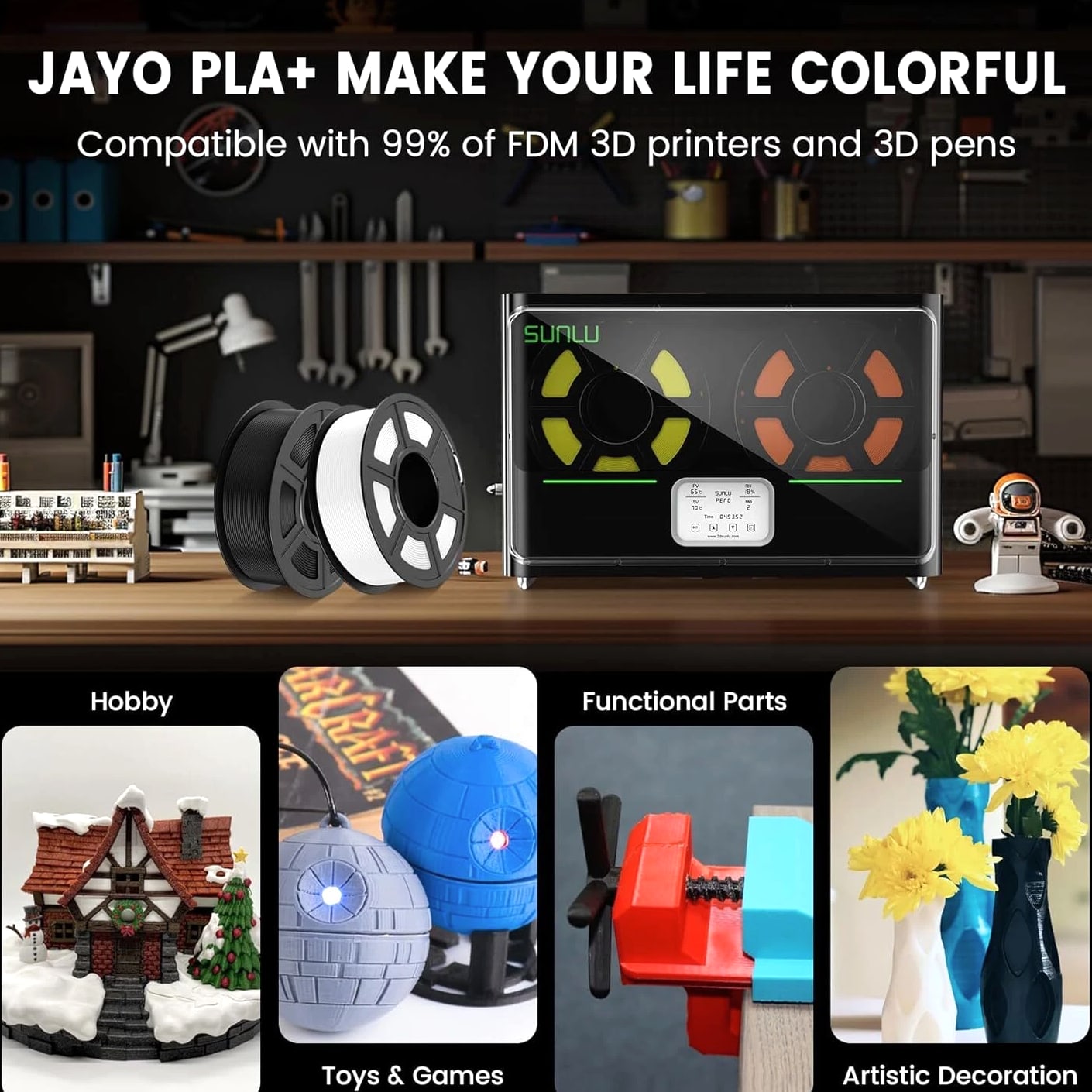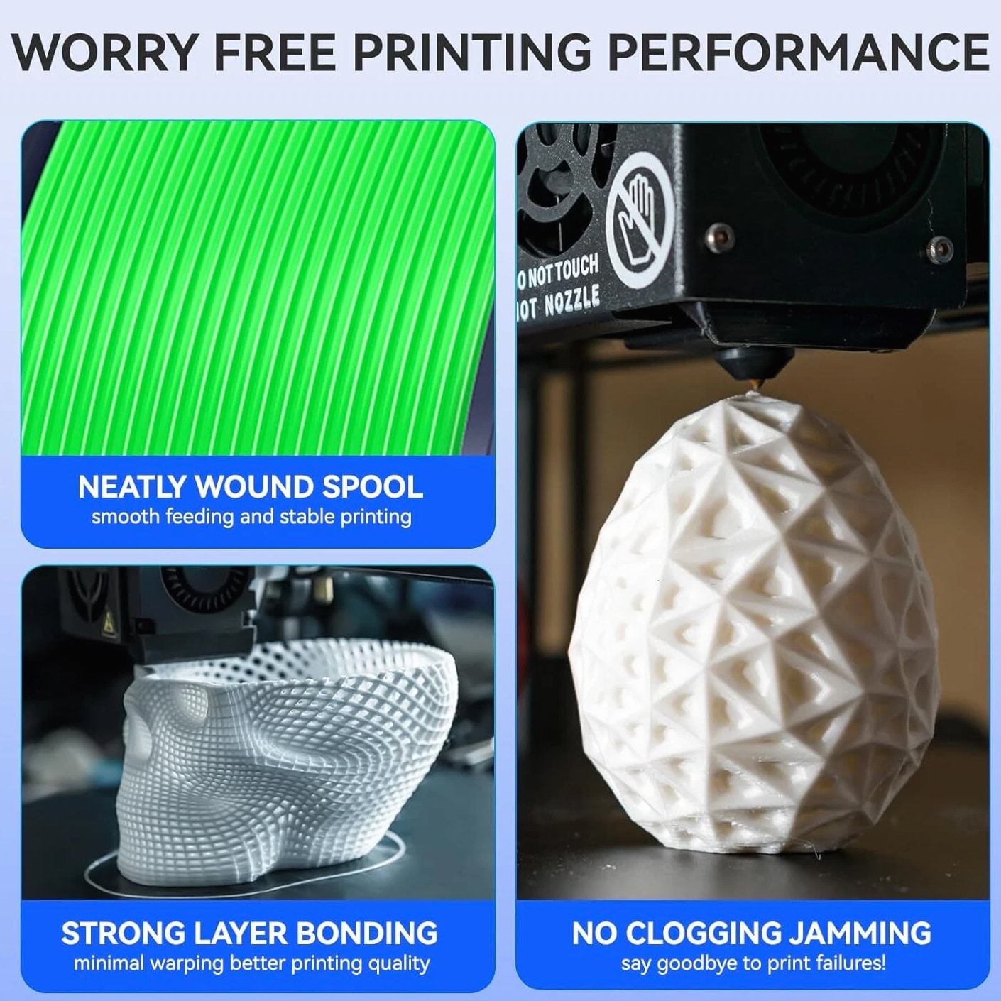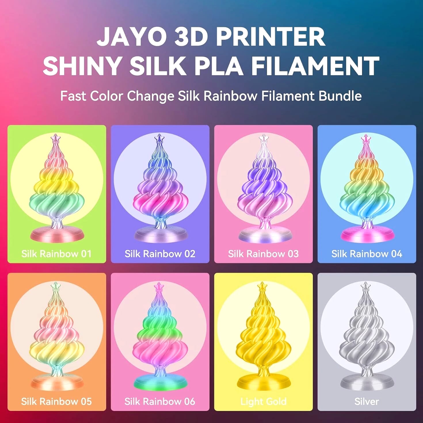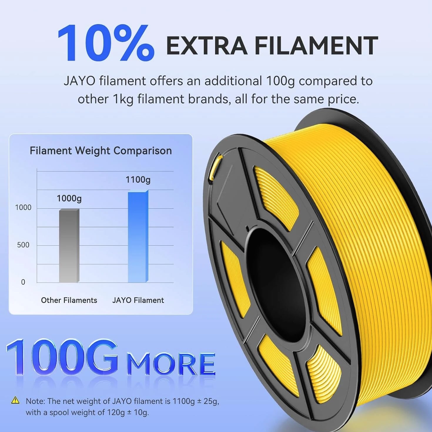 JAYO 3D Printer Filament 5KG/10KG Bundled Options The Following Filament are 100% Neatly Wound -- PLA / PLA+ / PLA Meta / PETG /SILK / PLA Matte (ABS / TPU / PLA Marble is not included.) Filament Wire Diameter Tolerance Printing Temperature Print speed Heat Distortion Temperature Print Platform Temperature Net weight 1.75MM ±0.02mm 200-210℃ 50-100mm/s 53℃ 50-60℃ 1.1KG/Roll PLA+ ±0.02mm 195-205℃ 50-100mm/s 50-60℃ 1.1KG/Roll PLA+2.0 ±0.02mm 195-205℃ 50-100mm/s 50-60℃ 1.1KG/Roll PLA Meta ±0.02mm 185-195℃ 50-150mm/s 50-60℃ 1.1KG/Roll PLA Matte ±0.02mm 205-215℃ 50-100mm/s 50-60℃ 1.1KG/Roll PLA HighSpeed ±0.02mm 190-210℃ 190-210℃, 50-150mm/s 210-230℃,150-300mm/s 230-260℃,300-600mm/s 53℃ 50-60℃ 1.1KG/Roll PLA Glow ±0.02mm 195-215℃ 50-100mm/s 53℃ 50-60℃ 1.1KG/Roll PLA Carbon Fibre ±0.02mm 205-215℃ 40-60mm/s 53℃ 50-60℃ 1.1KG/Roll PLA Marble ±0.03mm 210-220℃ 40-60mm/s 53℃ 50-60℃ 1.1KG/Roll WOOD ±0.03mm 195-215℃ 40-60mm/s 53℃ 60-70℃ 1.1KG/Roll PETG ±0.02mm 230-240℃ 40-60mm/s 63℃ 60-70℃ 1.1KG/Roll Matte PETG High Speed ±0.02mm 230-270℃ 50-600mm/s / 70-80℃ 1.1KG/Roll PLA+ SILK ±0.02mm 205-215℃ 40-60mm/s 53℃ 50-60℃ 1.1KG/Roll TPU(95A) ±0.03mm 195-205℃ Proximal Extrusion:40mm/s Remote Extrusion:20mm/s 52℃ 50-60℃ 0.5KG/Roll TPU SILK(98A) ±0.03mm 210-220℃ Proximal Extrusion:50mm/s Remote Extrusion:30mm/s 131℃ 50-60℃ 1.1KG/Roll ABS ±0.03mm 250-260℃ 40-60mm/s 84℃ 80-100℃ 1KG/Roll Easy ABS ±0.03mm 225-235℃ 40-60mm/s 57.9℃ 60-70℃ 1KG/Roll JAYO Filament Benefits 【More filament, more value】JAYO filament has 100g more filament than other brands on the market, with the same size, one filament roll can print 10% more models. This makes it a cost-effective option for your 3D printing needs. 【Neatly wound filament】JAYO filament is neatly wound with full mechanical winding technology, reducing tangles and preventing possible snags and string breaks. It also minimizes deformation and adheres easily to the heating bed. 【No clogging, no bubbles】JAYO filament diameter tolerance +/- 0.02 ensures consistency