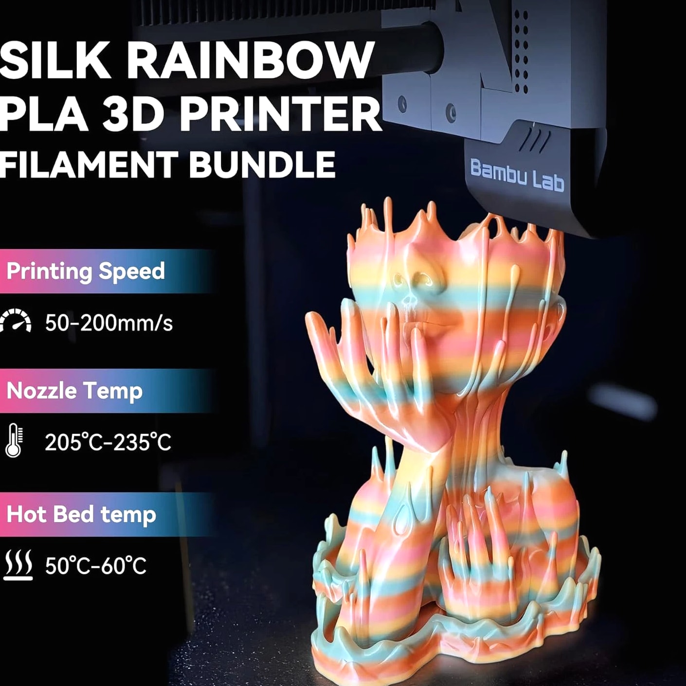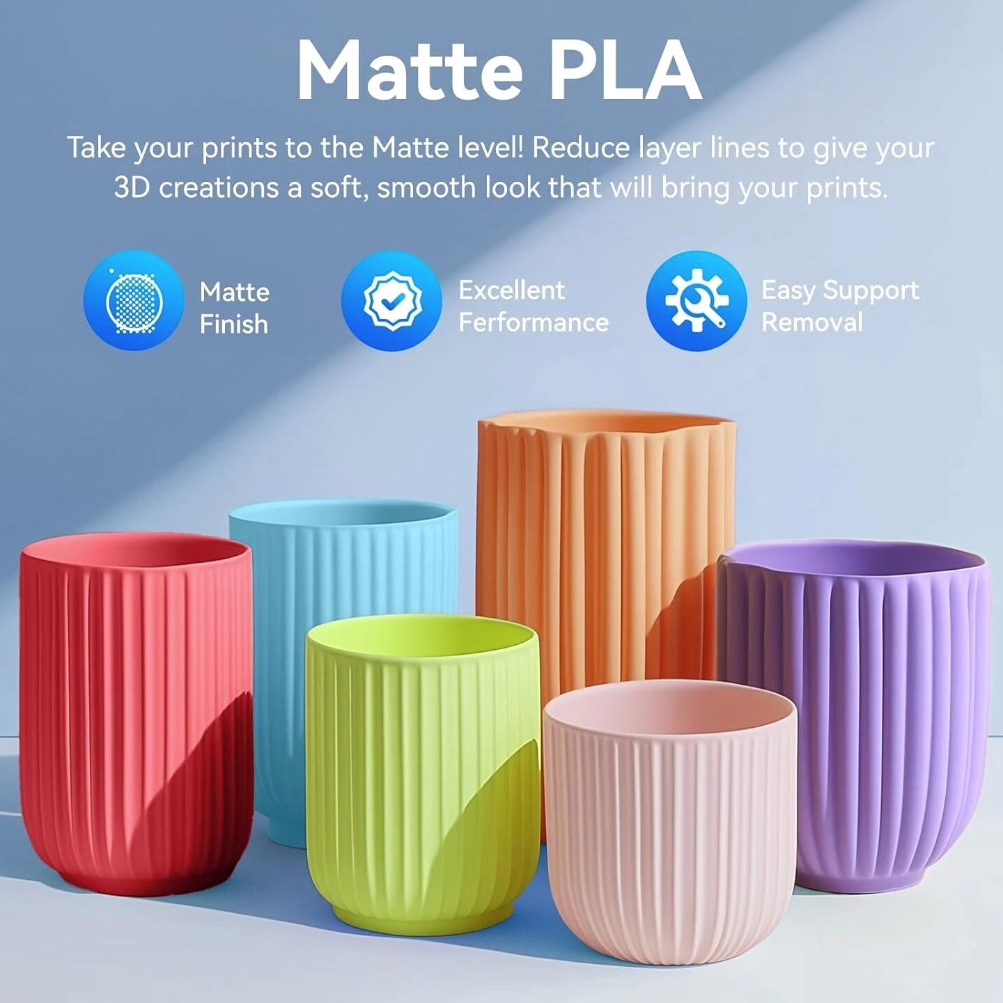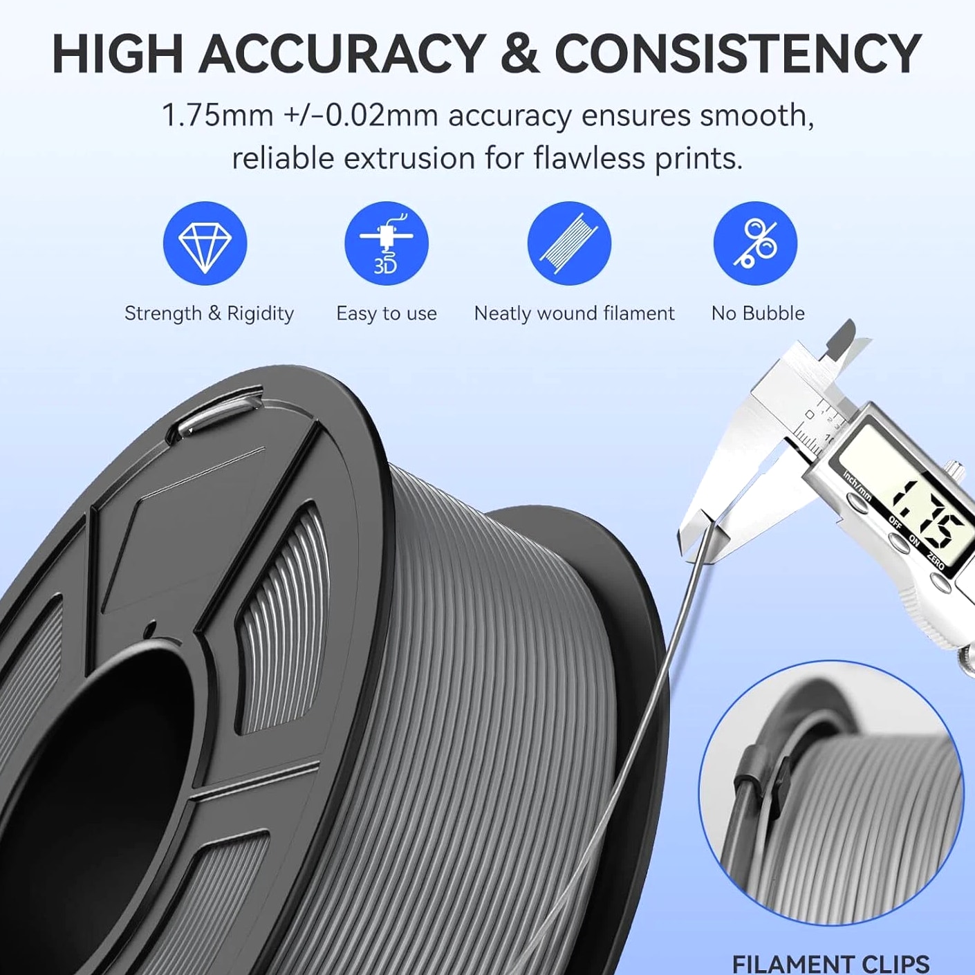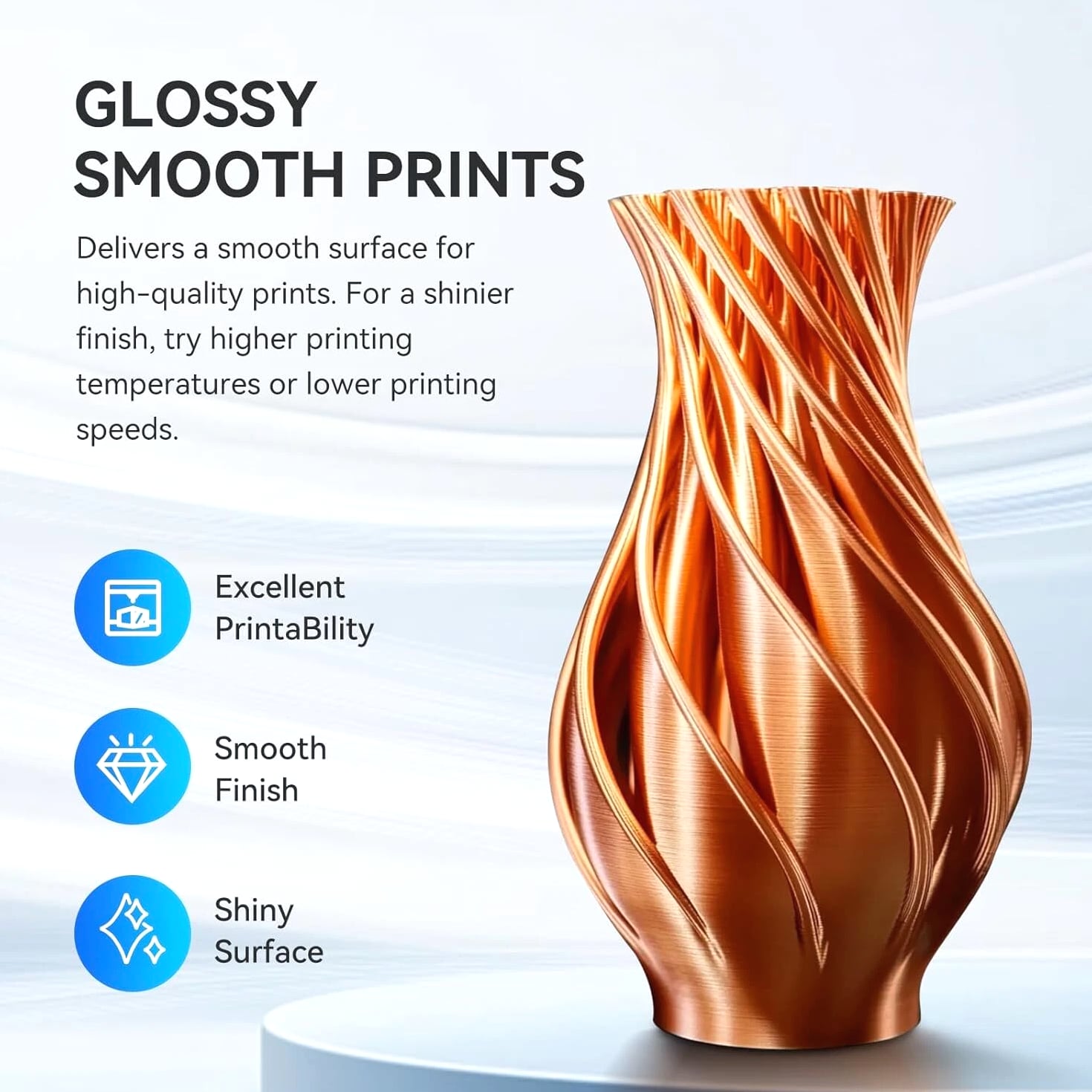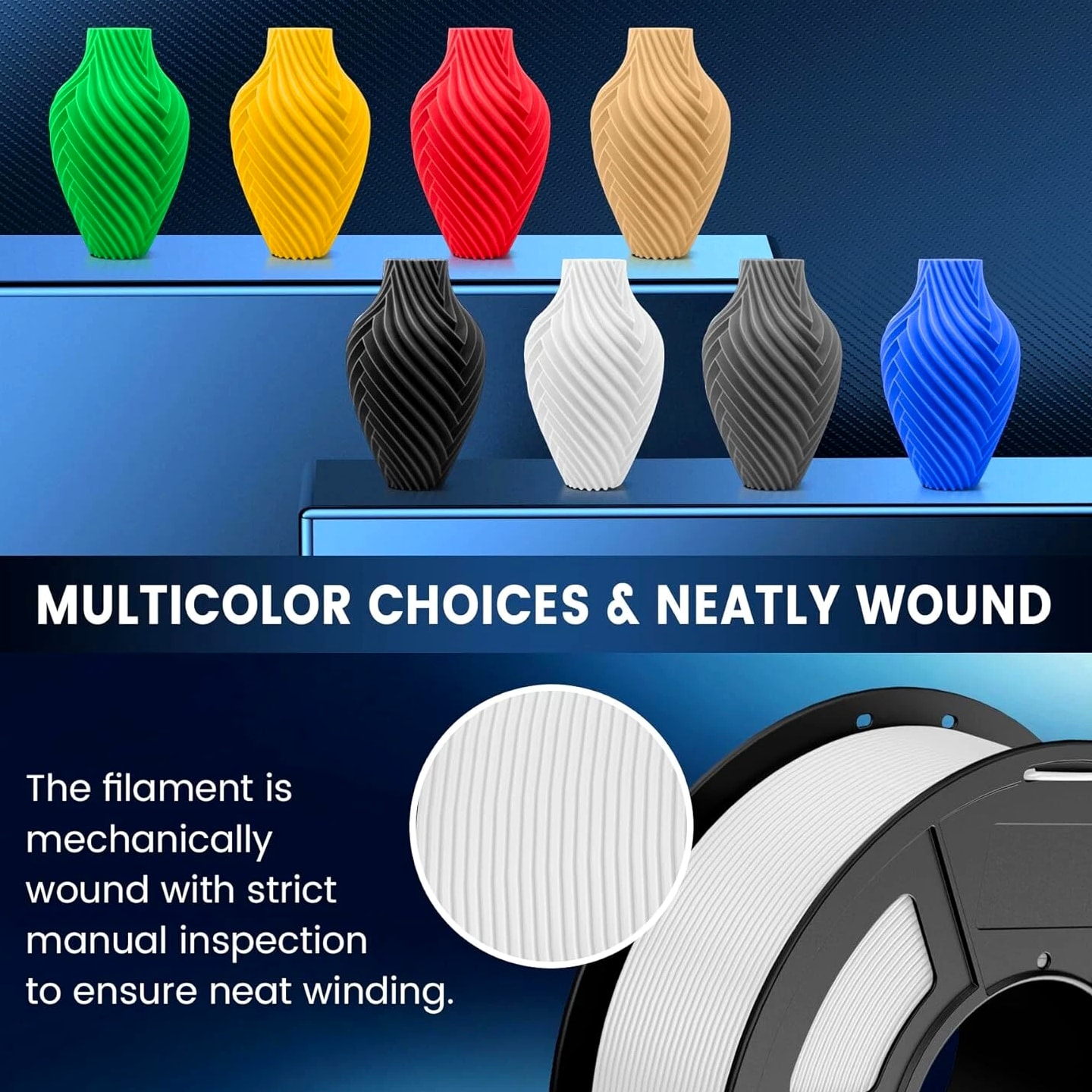 JAYO 3D Printer Filament 5KG/10KG Bundled Options The Following Filament are 100% Neatly Wound -- PLA / PLA+ / PLA Meta / PETG /SILK / PLA Matte (ABS / TPU / PLA Marble is not included.) Filament Wire Diameter Tolerance Printing Temperature Print speed Heat Distortion Temperature Print Platform Temperature Net weight 1.75MM ±0.02mm 200-210℃ 50-100mm/s 53℃ 50-60℃ 1.1KG/Roll PLA+ ±0.02mm 195-205℃ 50-100mm/s 50-60℃ 1.1KG/Roll PLA+2.0 ±0.02mm 195-205℃ 50-100mm/s 50-60℃ 1.1KG/Roll PLA Meta ±0.02mm 185-195℃ 50-150mm/s 50-60℃ 1.1KG/Roll PLA Matte ±0.02mm 205-215℃ 50-100mm/s 50-60℃ 1.1KG/Roll PLA HighSpeed ±0.02mm 190-210℃ 190-210℃, 50-150mm/s 210-230℃,150-300mm/s 230-260℃,300-600mm/s 53℃ 50-60℃ 1.1KG/Roll PLA Glow ±0.02mm 195-215℃ 50-100mm/s 53℃ 50-60℃ 1.1KG/Roll PLA Carbon Fibre ±0.02mm 205-215℃ 40-60mm/s 53℃ 50-60℃ 1.1KG/Roll PLA Marble ±0.03mm 210-220℃ 40-60mm/s 53℃ 50-60℃ 1.1KG/Roll WOOD ±0.03mm 195-215℃ 40-60mm/s 53℃ 60-70℃ 1.1KG/Roll PETG ±0.02mm 230-240℃ 40-60mm/s 63℃ 60-70℃ 1.1KG/Roll Matte PETG High Speed ±0.02mm 230-270℃ 50-600mm/s / 70-80℃ 1.1KG/Roll PLA+ SILK ±0.02mm 205-215℃ 40-60mm/s 53℃ 50-60℃ 1.1KG/Roll TPU(95A) ±0.03mm 195-205℃ Proximal Extrusion:40mm/s Remote Extrusion:20mm/s 52℃ 50-60℃ 0.5KG/Roll TPU SILK(98A) ±0.03mm 210-220℃ Proximal Extrusion:50mm/s Remote Extrusion:30mm/s 131℃ 50-60℃ 1.1KG/Roll ABS ±0.03mm 250-260℃ 40-60mm/s 84℃ 80-100℃ 1KG/Roll Easy ABS ±0.03mm 225-235℃ 40-60mm/s 57.9℃ 60-70℃ 1KG/Roll JAYO Filament Benefits 【More filament, more value】JAYO filament has 100g more filament than other brands on the market, with the same size, one filament roll can print 10% more models. This makes it a cost-effective option for your 3D printing needs. 【Neatly wound filament】JAYO filament is neatly wound with full mechanical winding technology, reducing tangles and preventing possible snags and string breaks. It also minimizes deformation and adheres easily to the heating bed. 【No clogging, no bubbles】JAYO filament diameter tolerance +/- 0.02 ensures consistency