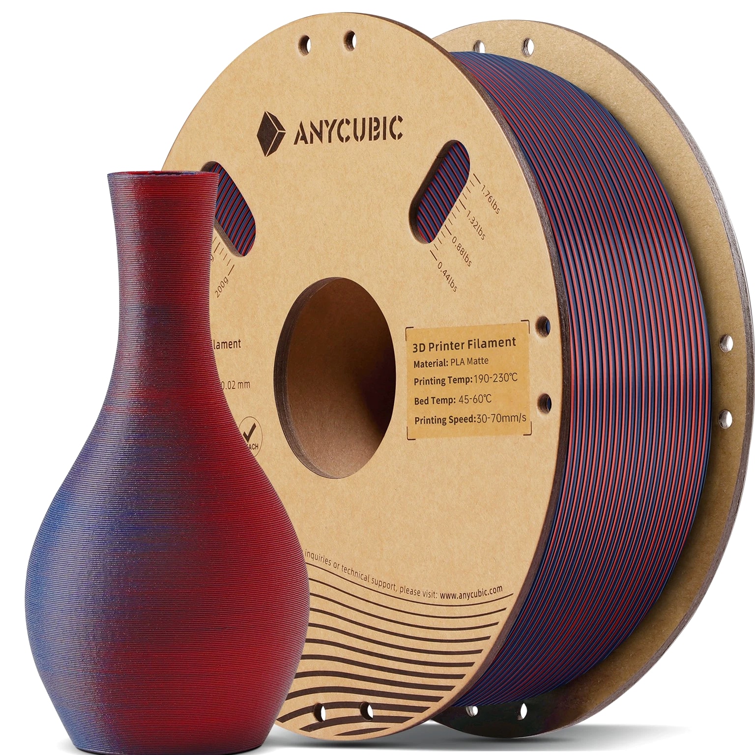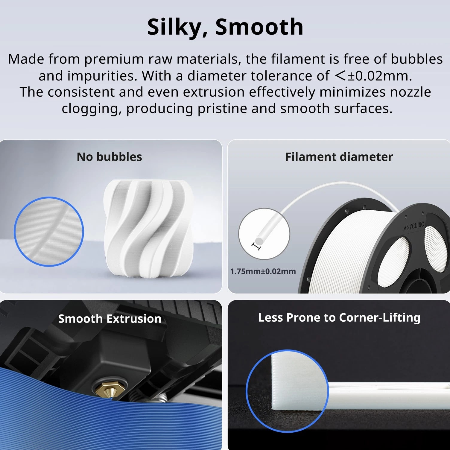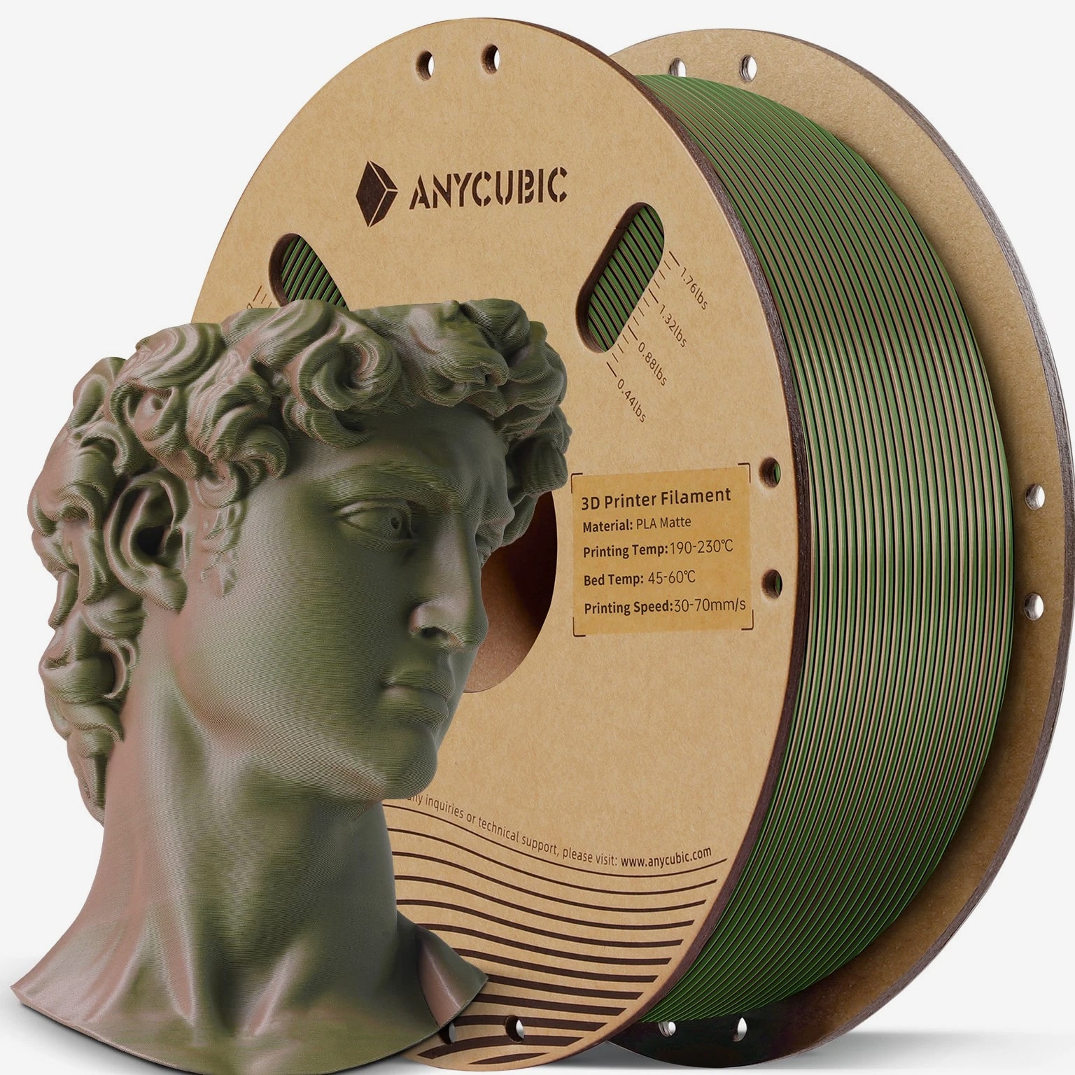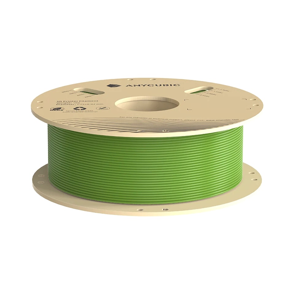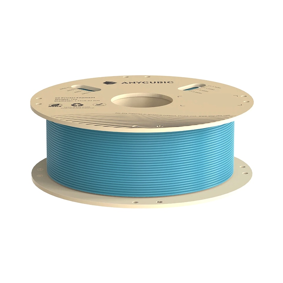 ANYCUBIC Filament Parameters Standard PLA Matte PLA Silk PLA Matte blau Silk PLA High Speed PLA PLA + PLA Glow PETG PLA Wood Material PLA PLA PLA PLA PLA PLA PLA PETG PLA Filament diameter ⌀ 1.75±0.02 ⌀ 1.75±0.03 ⌀ 1.75±0.02 ⌀ 1.75±0.03 ⌀ 1.75±0.02 ⌀ 1.75±0.02 ⌀ 1.75±0.02 ⌀ 1.75±0.02 ⌀ 1.75±0.03 Tensile strength /MPa 61 20.9 60.6 42~50 54 58 50 61.4 48.6 Stretch at break /% 3.1 34.5 6.3 2~4 12 3.6 21.7 5.3 8.1 Bending strength /MPa 83 39.6 65 70~80 74 73 79.8 74.8 58 Density /g/cm3 1.23 1.31 1.23 1.05~1.07 1.26 1.23 1.26 1.3 1.25 Heat deflection /℃ 53 52 53 75 56 53 53 63 53 Melting point /℃ 164 162.6 164 160 165 164 162 128 164 Melting index g/10min 4~10 14~20 7~15 30~40 4~6 4~10 6~12 8~16 8.5 Printing speed mm/s 50~100 30~70 40~60 40~80 50~150 150~300 300~600 50~100 40~60 40~60 40~60 Pressure temperature /℃ 200~210 190~230 205~215 200~230 190~210 210~230 230~260 205~215 195~205 230~240 205~215 Base plate temperature /℃ 50~60 45~60 50~60 60~80 50~60 50~60 50~60 60~70 50~60 Length /m 330 310 330 330 330 330 330 320 330 Anycubic PLA Filament Neatly Wound Experience hassle-free 3D printing with Anycubic PLA Filament. Our meticulous winding method minimizes filament tangles, guaranteeing smooth, frustration-free printing. Say goodbye to interruptions and hello to flawless prints for all creative endeavors. Consistent Filament Diameter With impressive ±0.02mm diameter tolerance and vibrant colors, we deliver premium 3D printing experience. Enjoy unmatched reliability and color consistency throughout your creative journey. Eco-Friendly PLA is made from lactic acid, which is produced via starch fermentation from corn or other plant-based materials; it's a biodegradable and eco-friendly material. Specifications Product Type Net Weight 1kg/roll Diameter 1.75mm Tolerance ±0.02mm Length 340m Density 1.25g±0.05g/cm³ Tensile Strength 55MPa Hotbed Temperature 50-80°C Nozzle Temperature 200-210°C