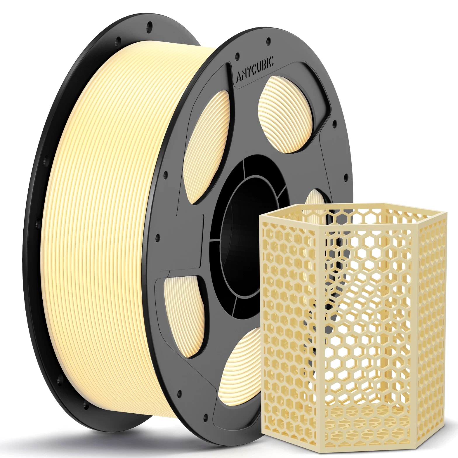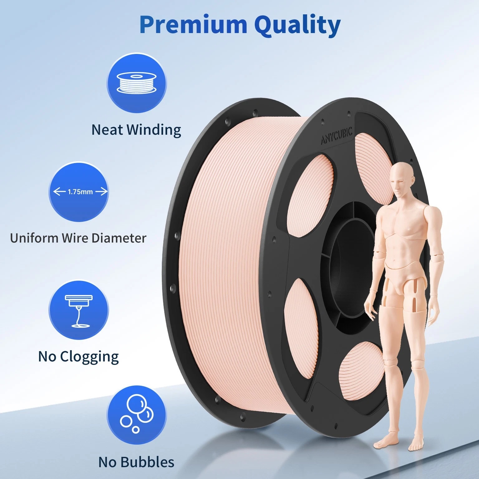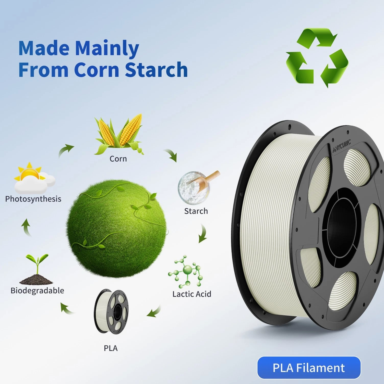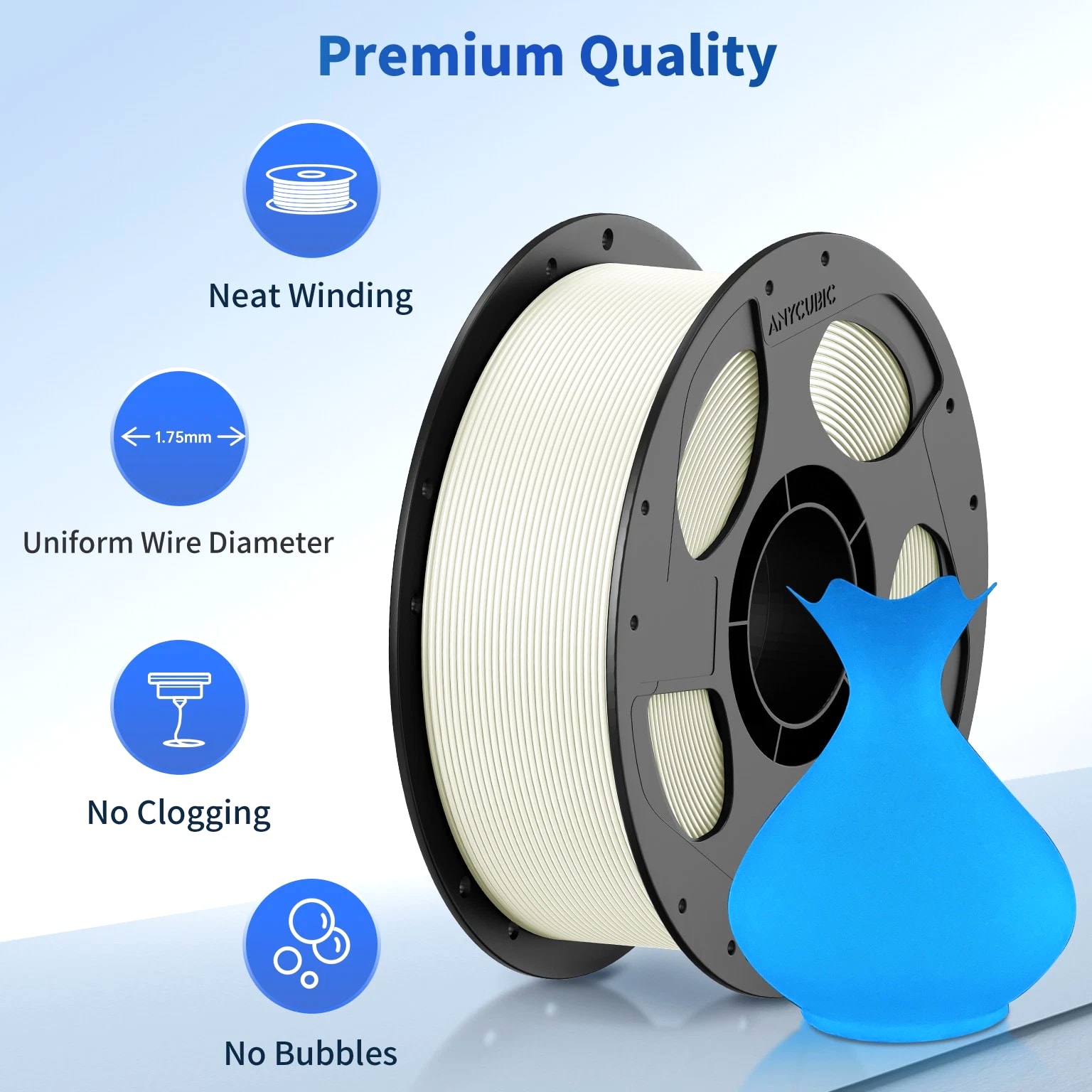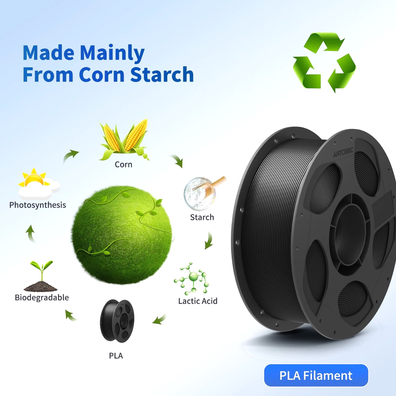ANYCUBIC Filament Parameters Standard PLA Matte PLA Silk PLA Matte blau Silk PLA High Speed PLA PLA + PLA Glow PETG PLA Wood Material PLA PLA PLA PLA PLA PLA PLA PETG PLA Filament diameter ⌀ 1.75±0.02 ⌀ 1.75±0.03 ⌀ 1.75±0.02 ⌀ 1.75±0.03 ⌀ 1.75±0.02 ⌀ 1.75±0.02 ⌀ 1.75±0.02 ⌀ 1.75±0.02 ⌀ 1.75±0.03 Tensile strength /MPa 61 20.9 60.6 42~50 54 58 50 61.4 48.6 Stretch at break /% 3.1 34.5 6.3 2~4 12 3.6 21.7 5.3 8.1 Bending strength /MPa 83 39.6 65 70~80 74 73 79.8 74.8 58 Density /g/cm3 1.23 1.31 1.23 1.05~1.07 1.26 1.23 1.26 1.3 1.25 Heat deflection /℃ 53 52 53 75 56 53 53 63 53 Melting point /℃ 164 162.6 164 160 165 164 162 128 164 Melting index g/10min 4~10 14~20 7~15 30~40 4~6 4~10 6~12 8~16 8.5 Printing speed mm/s 50~100 30~70 40~60 40~80 50~150 150~300 300~600 50~100 40~60 40~60 40~60 Pressure temperature /℃ 200~210 190~230 205~215 200~230 190~210 210~230 230~260 205~215 195~205 230~240 205~215 Base plate temperature /℃ 50~60 45~60 50~60 60~80 50~60 50~60 50~60 60~70 50~60 Length /m 330 310 330 330 330 330 330 320 330 Anycubic PLA Filament Neatly Wound Experience hassle-free 3D printing with Anycubic PLA Filament. Our meticulous winding method minimizes filament tangles, guaranteeing smooth, frustration-free printing. Say goodbye to interruptions and hello to flawless prints for all creative endeavors. Consistent Filament Diameter With impressive ±0.02mm diameter tolerance and vibrant colors, we deliver premium 3D printing experience. Enjoy unmatched reliability and color consistency throughout your creative journey. Eco-Friendly PLA is made from lactic acid, which is produced via starch fermentation from corn or other plant-based materials; it's a biodegradable and eco-friendly material. Specifications Product Type Net Weight 1kg/roll Diameter 1.75mm Tolerance ±0.02mm Length 340m Density 1.25g±0.05g/cm³ Tensile Strength 55MPa Hotbed Temperature 50-80°C Nozzle Temperature 200-210°C