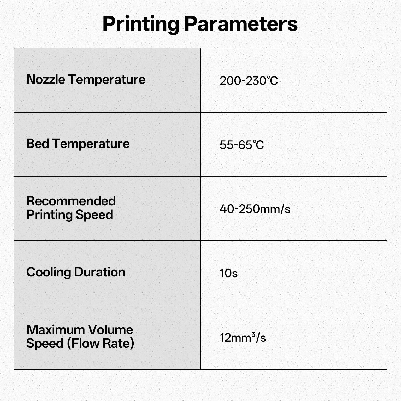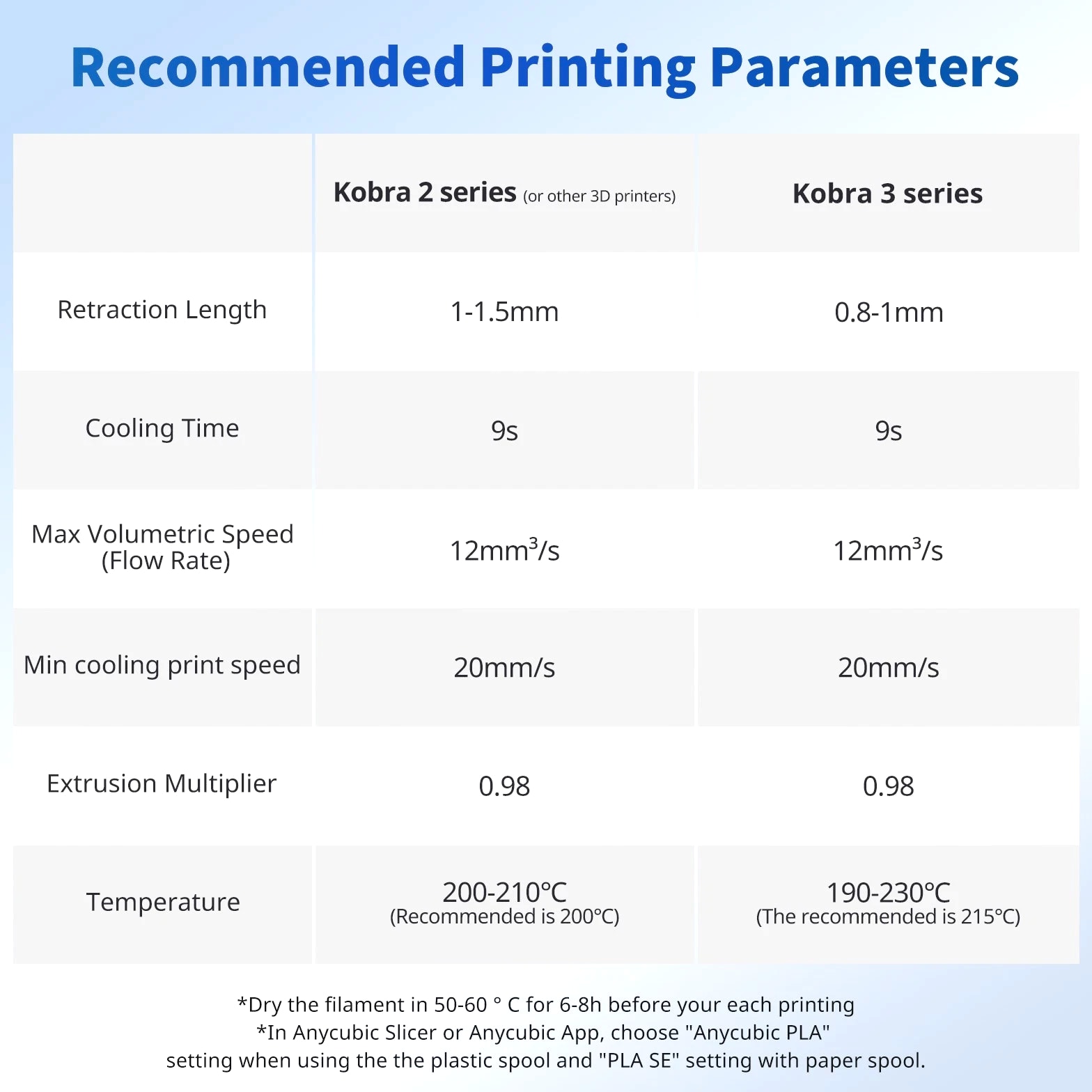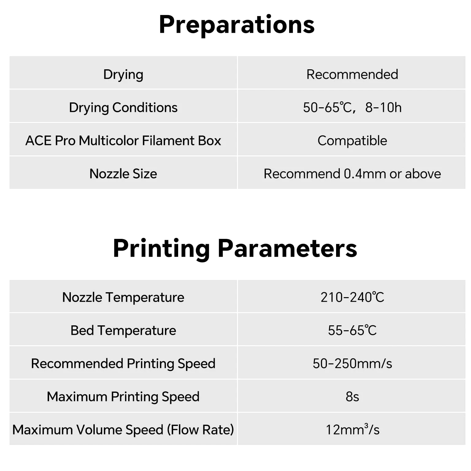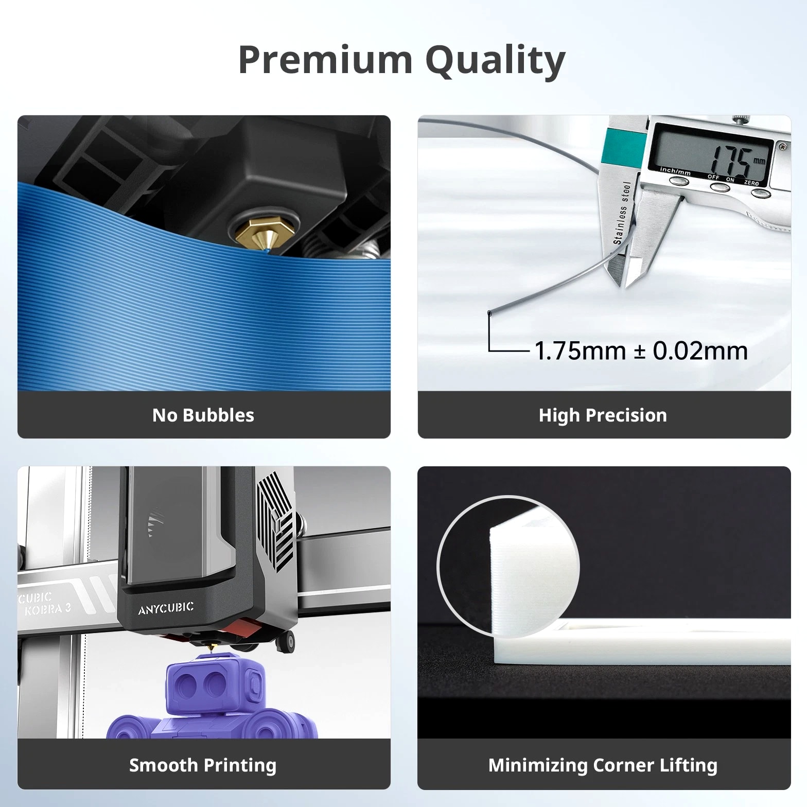 ANYCUBIC Filament Parameters Standard PLA Matte PLA Silk PLA Matte blau Silk PLA High Speed PLA PLA + PLA Glow PETG PLA Wood Material PLA PLA PLA PLA PLA PLA PLA PETG PLA Filament diameter ⌀ 1.75±0.02 ⌀ 1.75±0.03 ⌀ 1.75±0.02 ⌀ 1.75±0.03 ⌀ 1.75±0.02 ⌀ 1.75±0.02 ⌀ 1.75±0.02 ⌀ 1.75±0.02 ⌀ 1.75±0.03 Tensile strength /MPa 61 20.9 60.6 42~50 54 58 50 61.4 48.6 Stretch at break /% 3.1 34.5 6.3 2~4 12 3.6 21.7 5.3 8.1 Bending strength /MPa 83 39.6 65 70~80 74 73 79.8 74.8 58 Density /g/cm3 1.23 1.31 1.23 1.05~1.07 1.26 1.23 1.26 1.3 1.25 Heat deflection /℃ 53 52 53 75 56 53 53 63 53 Melting point /℃ 164 162.6 164 160 165 164 162 128 164 Melting index g/10min 4~10 14~20 7~15 30~40 4~6 4~10 6~12 8~16 8.5 Printing speed mm/s 50~100 30~70 40~60 40~80 50~150 150~300 300~600 50~100 40~60 40~60 40~60 Pressure temperature /℃ 200~210 190~230 205~215 200~230 190~210 210~230 230~260 205~215 195~205 230~240 205~215 Base plate temperature /℃ 50~60 45~60 50~60 60~80 50~60 50~60 50~60 60~70 50~60 Length /m 330 310 330 330 330 330 330 320 330 Anycubic PLA Filament Neatly Wound Experience hassle-free 3D printing with Anycubic PLA Filament. Our meticulous winding method minimizes filament tangles, guaranteeing smooth, frustration-free printing. Say goodbye to interruptions and hello to flawless prints for all creative endeavors. Consistent Filament Diameter With impressive ±0.02mm diameter tolerance and vibrant colors, we deliver premium 3D printing experience. Enjoy unmatched reliability and color consistency throughout your creative journey. Eco-Friendly PLA is made from lactic acid, which is produced via starch fermentation from corn or other plant-based materials; it's a biodegradable and eco-friendly material. Specifications Product Type Net Weight 1kg/roll Diameter 1.75mm Tolerance ±0.02mm Length 340m Density 1.25g±0.05g/cm³ Tensile Strength 55MPa Hotbed Temperature 50-80°C Nozzle Temperature 200-210°C
