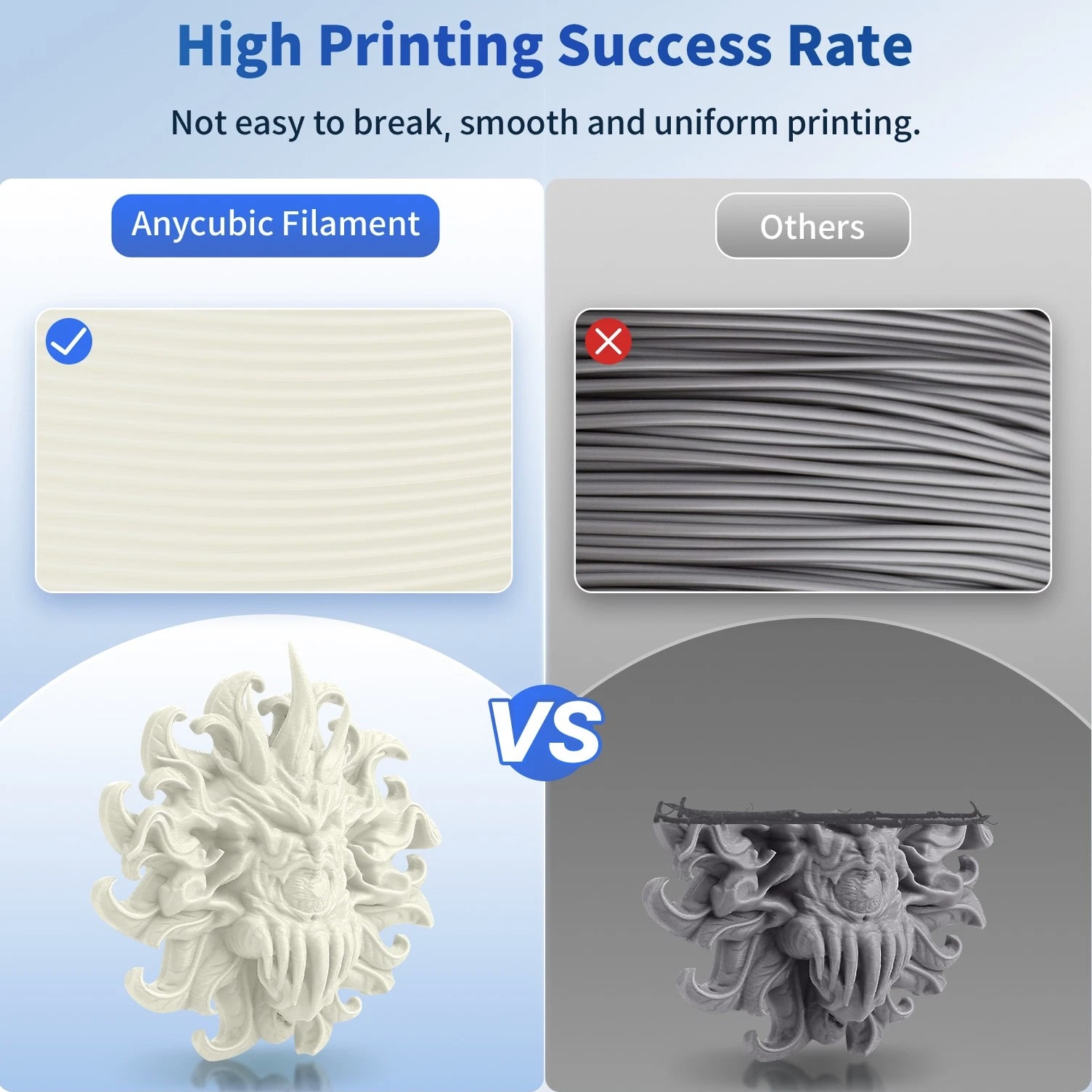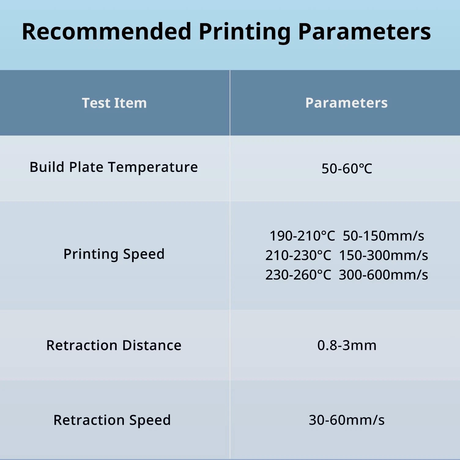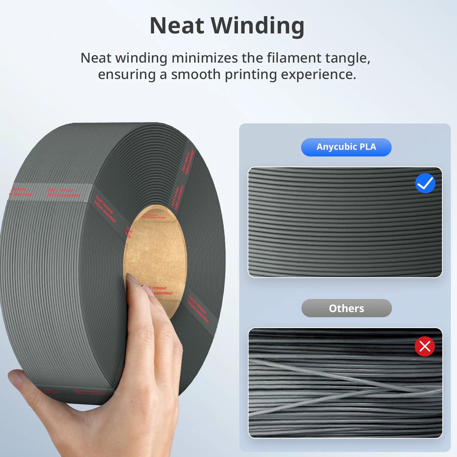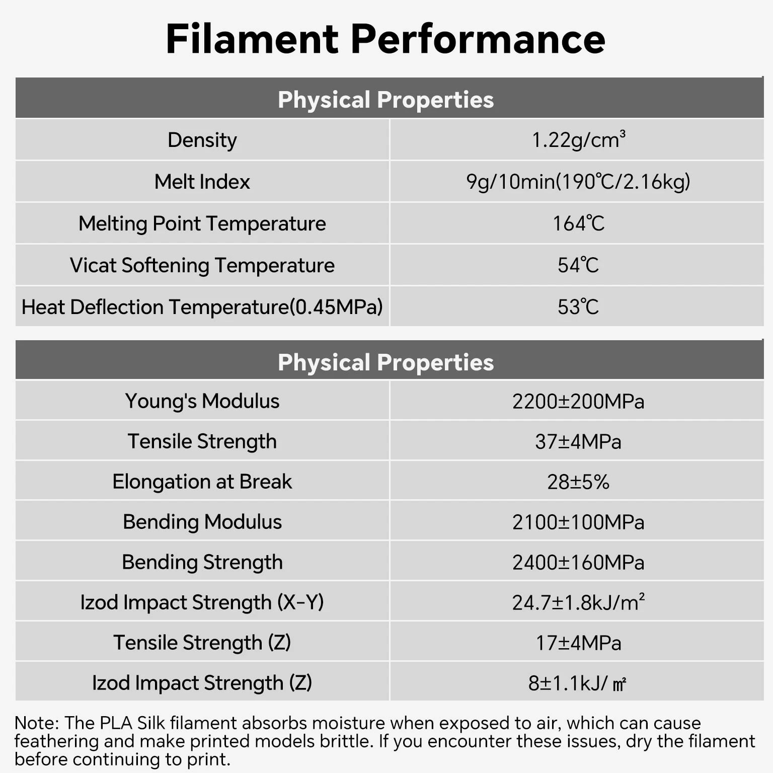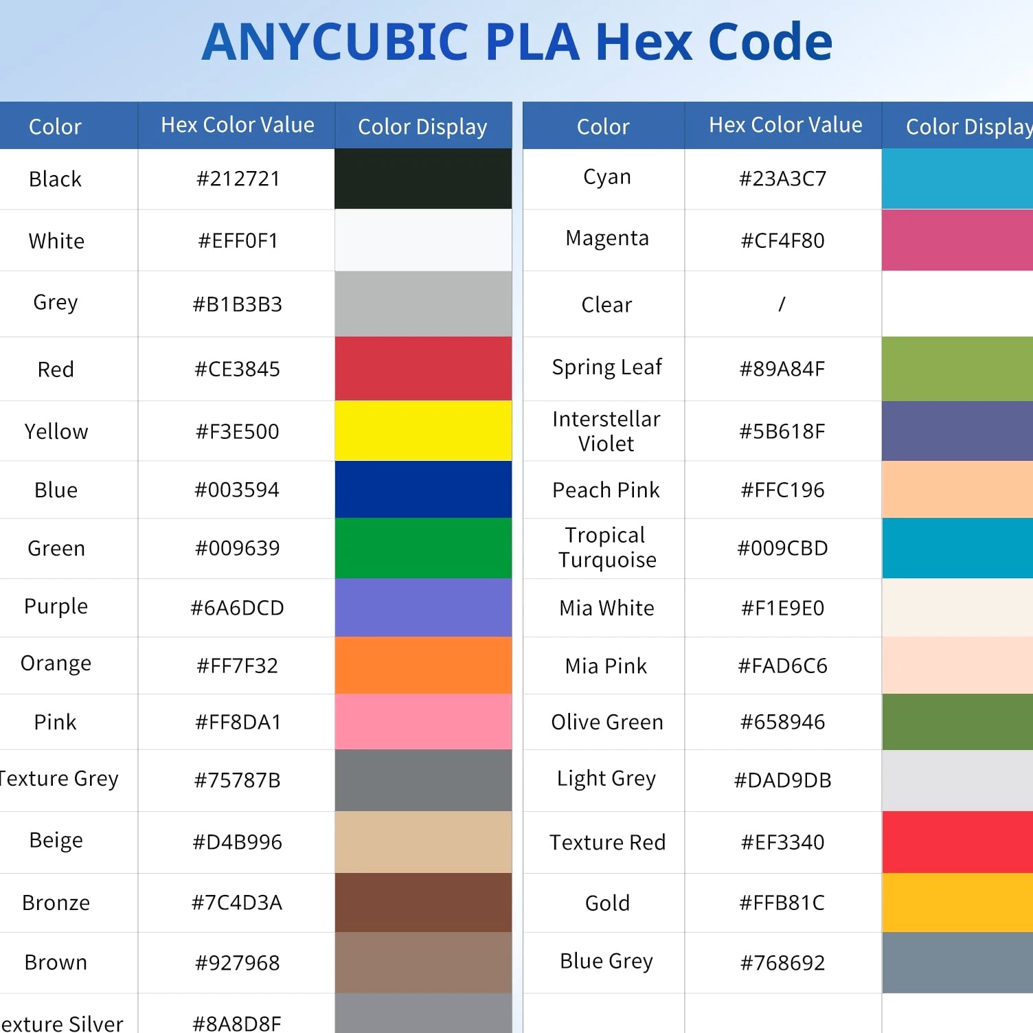 ANYCUBIC Filament Parameters Standard PLA Matte PLA Silk PLA Matte blau Silk PLA High Speed PLA PLA + PLA Glow PETG PLA Wood Material PLA PLA PLA PLA PLA PLA PLA PETG PLA Filament diameter ⌀ 1.75±0.02 ⌀ 1.75±0.03 ⌀ 1.75±0.02 ⌀ 1.75±0.03 ⌀ 1.75±0.02 ⌀ 1.75±0.02 ⌀ 1.75±0.02 ⌀ 1.75±0.02 ⌀ 1.75±0.03 Tensile strength /MPa 61 20.9 60.6 42~50 54 58 50 61.4 48.6 Stretch at break /% 3.1 34.5 6.3 2~4 12 3.6 21.7 5.3 8.1 Bending strength /MPa 83 39.6 65 70~80 74 73 79.8 74.8 58 Density /g/cm3 1.23 1.31 1.23 1.05~1.07 1.26 1.23 1.26 1.3 1.25 Heat deflection /℃ 53 52 53 75 56 53 53 63 53 Melting point /℃ 164 162.6 164 160 165 164 162 128 164 Melting index g/10min 4~10 14~20 7~15 30~40 4~6 4~10 6~12 8~16 8.5 Printing speed mm/s 50~100 30~70 40~60 40~80 50~150 150~300 300~600 50~100 40~60 40~60 40~60 Pressure temperature /℃ 200~210 190~230 205~215 200~230 190~210 210~230 230~260 205~215 195~205 230~240 205~215 Base plate temperature /℃ 50~60 45~60 50~60 60~80 50~60 50~60 50~60 60~70 50~60 Length /m 330 310 330 330 330 330 330 320 330 Anycubic PLA Filament Neatly Wound Experience hassle-free 3D printing with Anycubic PLA Filament. Our meticulous winding method minimizes filament tangles, guaranteeing smooth, frustration-free printing. Say goodbye to interruptions and hello to flawless prints for all creative endeavors. Consistent Filament Diameter With impressive ±0.02mm diameter tolerance and vibrant colors, we deliver premium 3D printing experience. Enjoy unmatched reliability and color consistency throughout your creative journey. Eco-Friendly PLA is made from lactic acid, which is produced via starch fermentation from corn or other plant-based materials; it's a biodegradable and eco-friendly material. Specifications Product Type Net Weight 1kg/roll Diameter 1.75mm Tolerance ±0.02mm Length 340m Density 1.25g±0.05g/cm³ Tensile Strength 55MPa Hotbed Temperature 50-80°C Nozzle Temperature 200-210°C