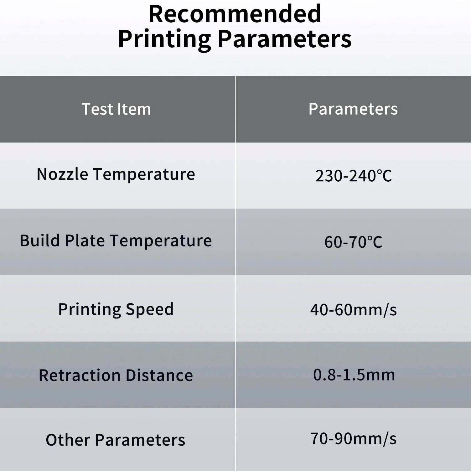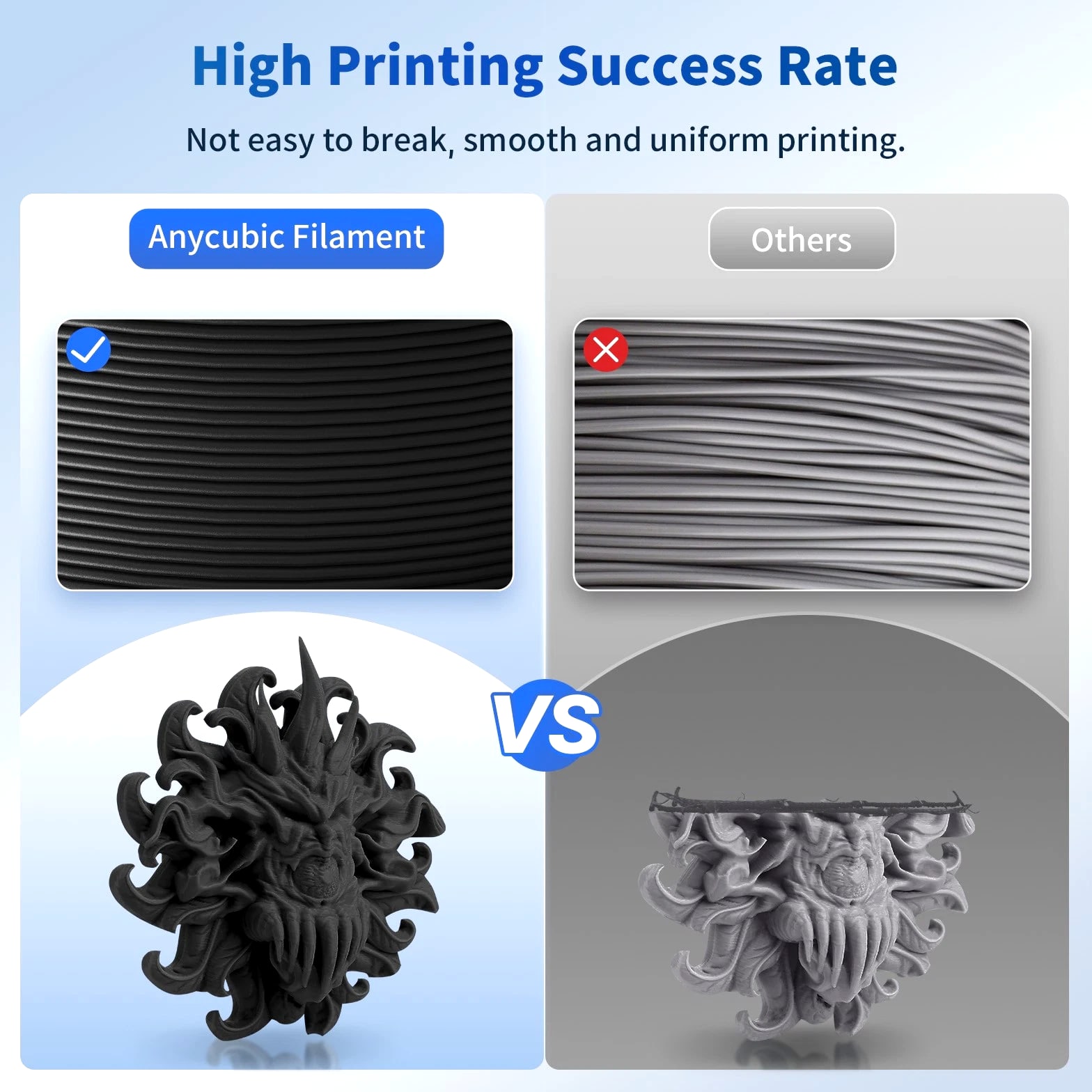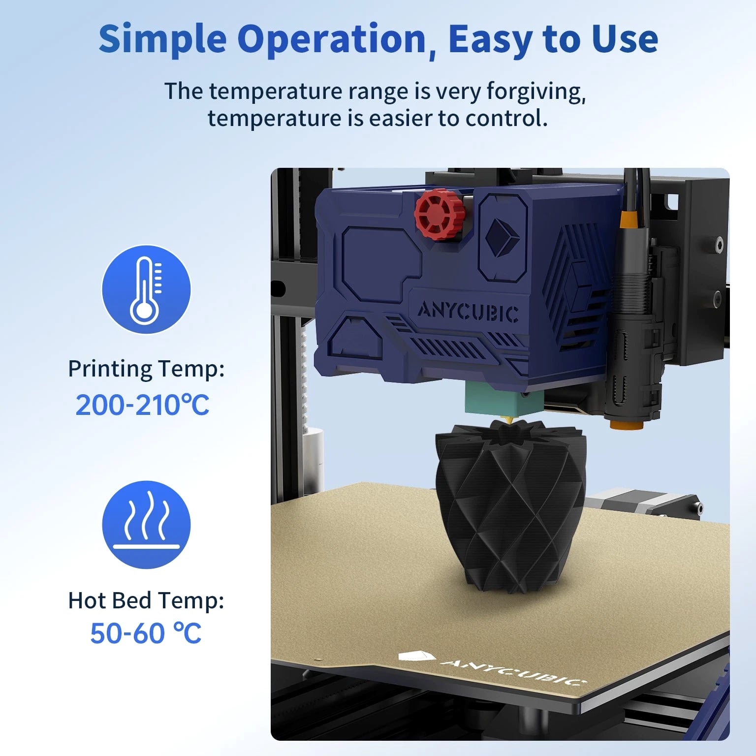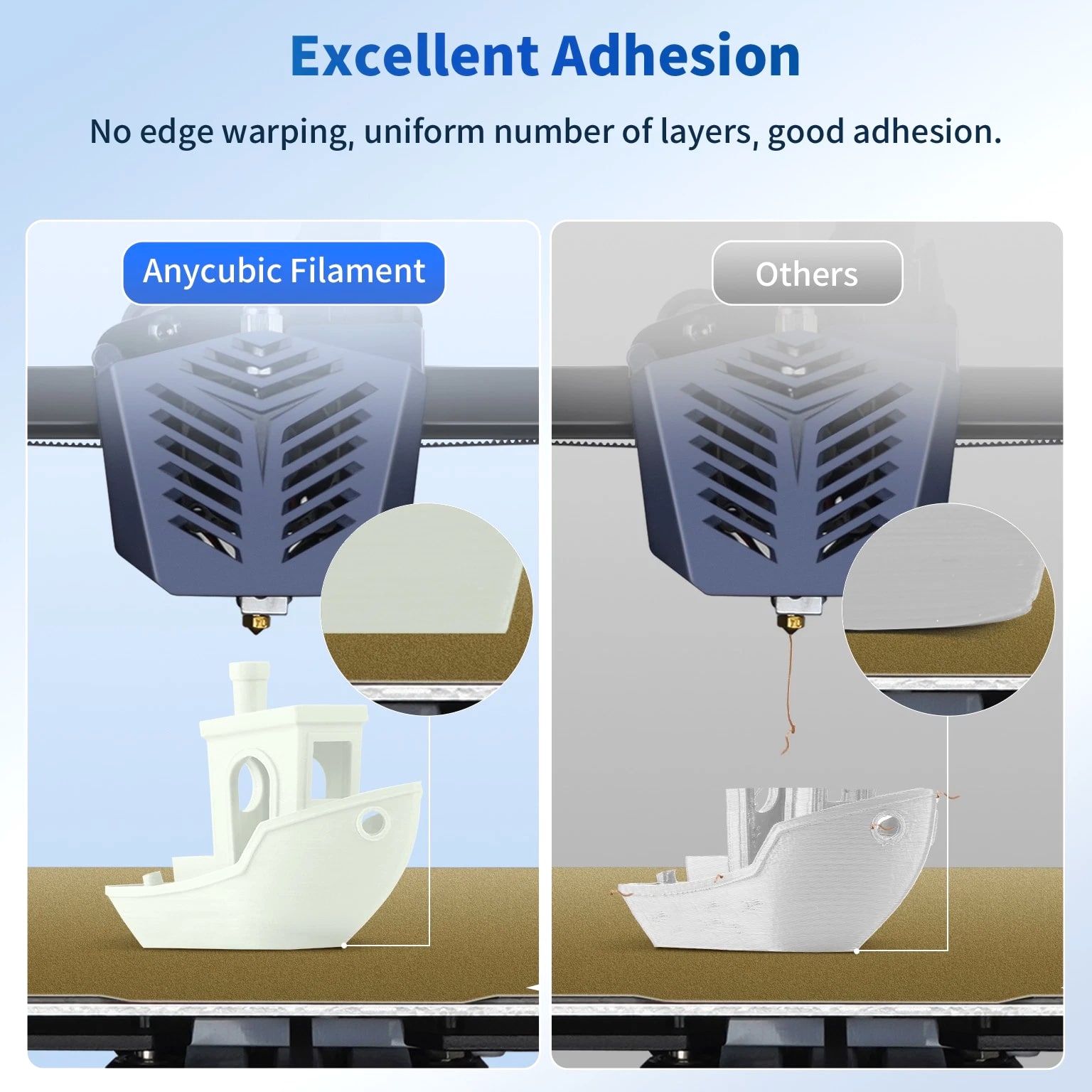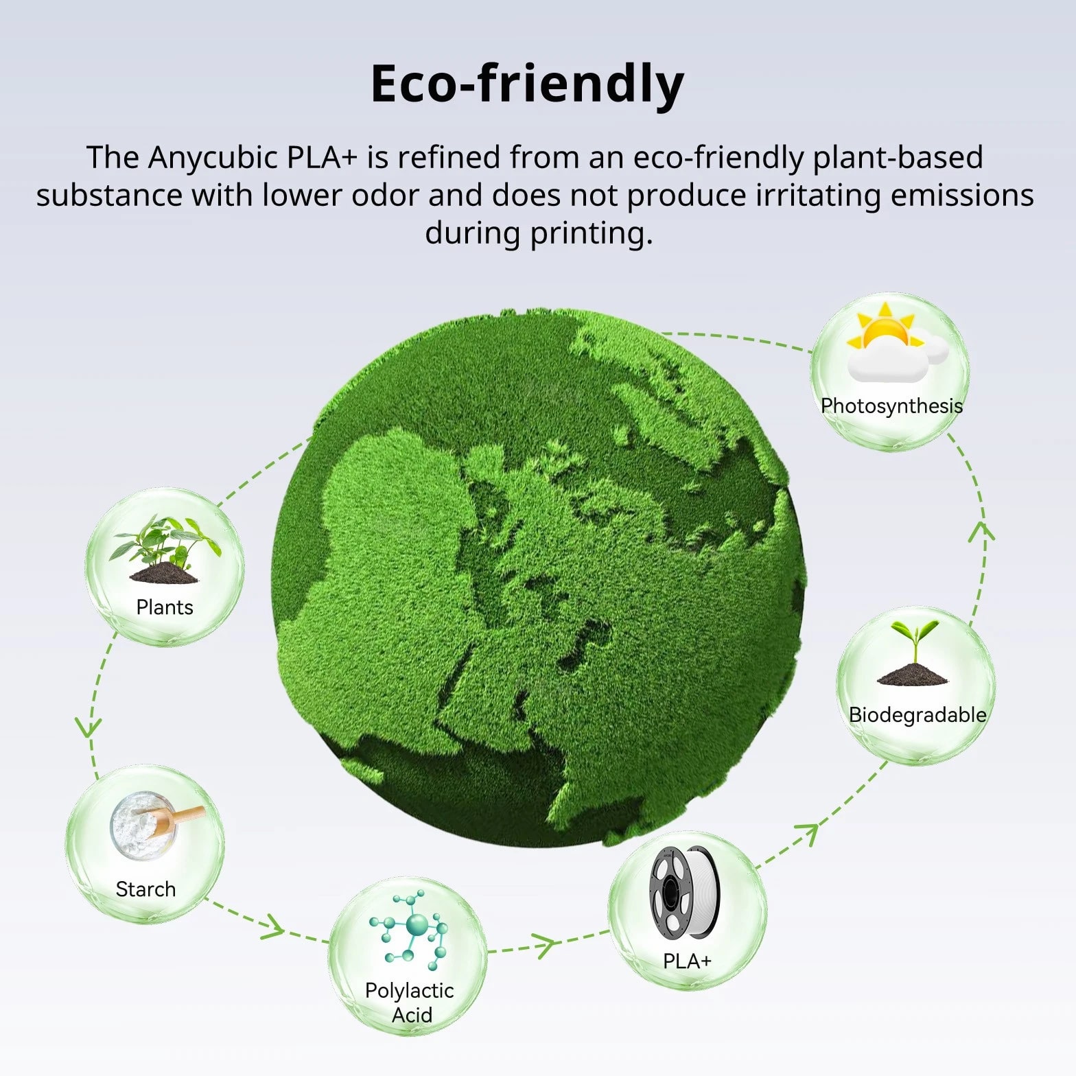ANYCUBIC Filament Parameters Standard PLA Matte PLA Silk PLA Matte blau Silk PLA High Speed PLA PLA + PLA Glow PETG PLA Wood Material PLA PLA PLA PLA PLA PLA PLA PETG PLA Filament diameter ⌀ 1.75±0.02 ⌀ 1.75±0.03 ⌀ 1.75±0.02 ⌀ 1.75±0.03 ⌀ 1.75±0.02 ⌀ 1.75±0.02 ⌀ 1.75±0.02 ⌀ 1.75±0.02 ⌀ 1.75±0.03 Tensile strength /MPa 61 20.9 60.6 42~50 54 58 50 61.4 48.6 Stretch at break /% 3.1 34.5 6.3 2~4 12 3.6 21.7 5.3 8.1 Bending strength /MPa 83 39.6 65 70~80 74 73 79.8 74.8 58 Density /g/cm3 1.23 1.31 1.23 1.05~1.07 1.26 1.23 1.26 1.3 1.25 Heat deflection /℃ 53 52 53 75 56 53 53 63 53 Melting point /℃ 164 162.6 164 160 165 164 162 128 164 Melting index g/10min 4~10 14~20 7~15 30~40 4~6 4~10 6~12 8~16 8.5 Printing speed mm/s 50~100 30~70 40~60 40~80 50~150 150~300 300~600 50~100 40~60 40~60 40~60 Pressure temperature /℃ 200~210 190~230 205~215 200~230 190~210 210~230 230~260 205~215 195~205 230~240 205~215 Base plate temperature /℃ 50~60 45~60 50~60 60~80 50~60 50~60 50~60 60~70 50~60 Length /m 330 310 330 330 330 330 330 320 330 Anycubic PLA Filament Neatly Wound Experience hassle-free 3D printing with Anycubic PLA Filament. Our meticulous winding method minimizes filament tangles, guaranteeing smooth, frustration-free printing. Say goodbye to interruptions and hello to flawless prints for all creative endeavors. Consistent Filament Diameter With impressive ±0.02mm diameter tolerance and vibrant colors, we deliver premium 3D printing experience. Enjoy unmatched reliability and color consistency throughout your creative journey. Eco-Friendly PLA is made from lactic acid, which is produced via starch fermentation from corn or other plant-based materials; it's a biodegradable and eco-friendly material. Specifications Product Type Net Weight 1kg/roll Diameter 1.75mm Tolerance ±0.02mm Length 340m Density 1.25g±0.05g/cm³ Tensile Strength 55MPa Hotbed Temperature 50-80°C Nozzle Temperature 200-210°C