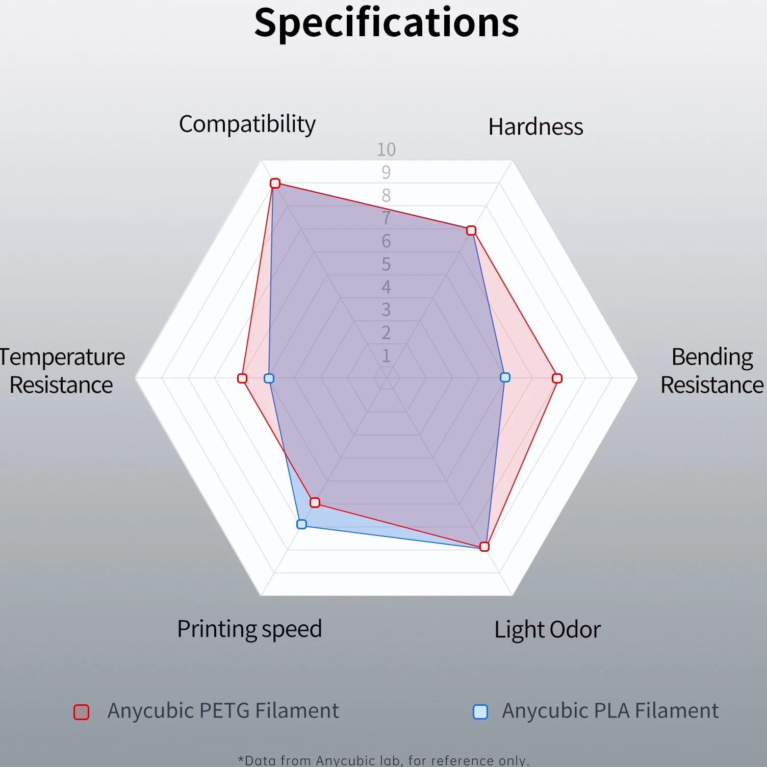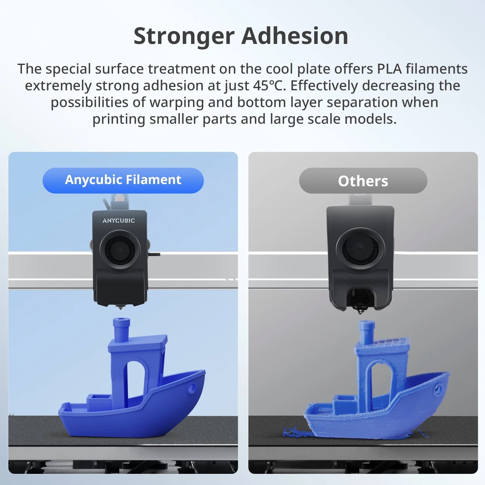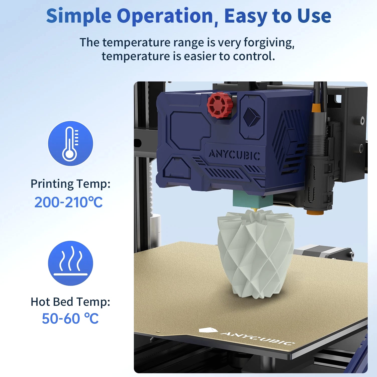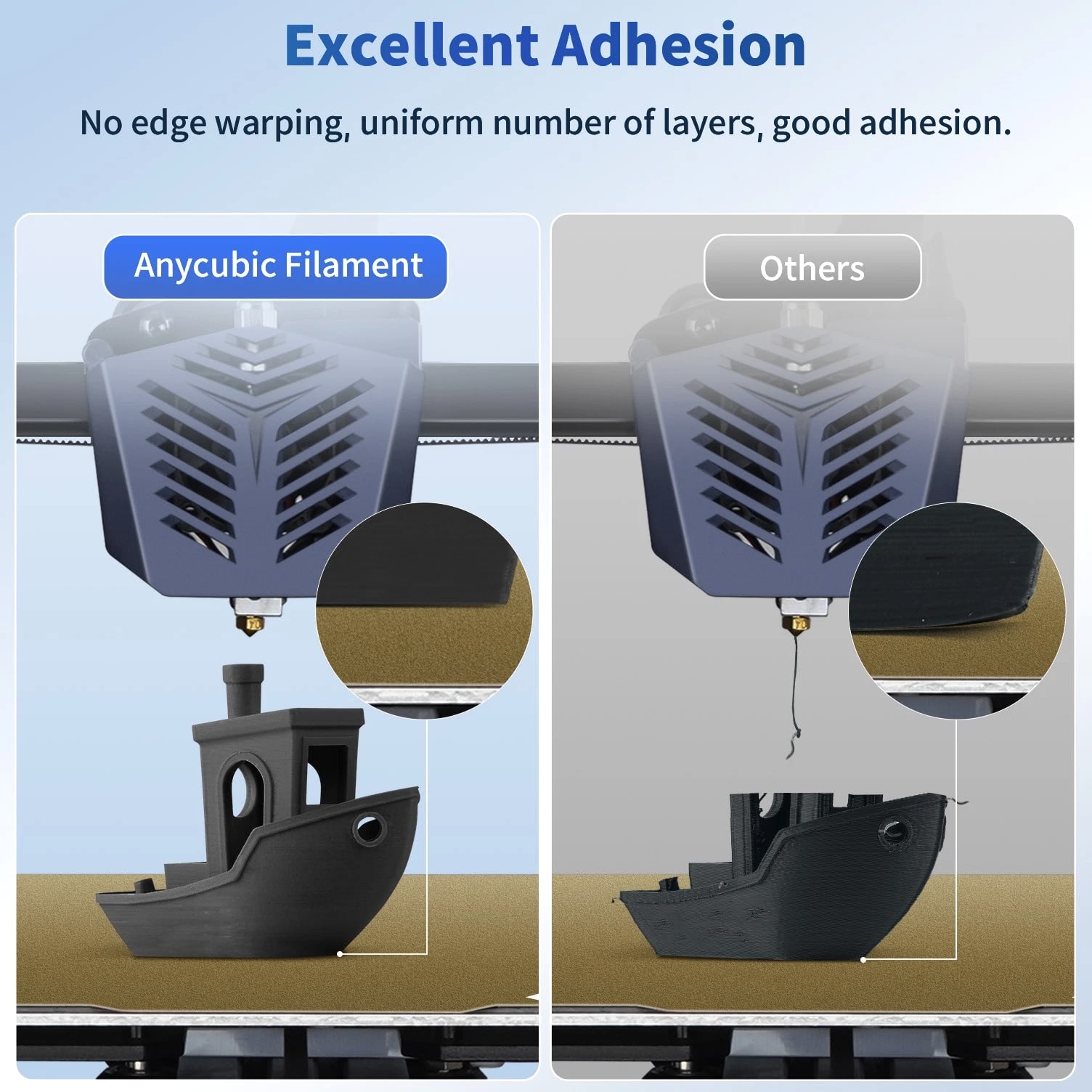 ANYCUBIC Filament Parameters Standard PLA Matte PLA Silk PLA Matte blau Silk PLA High Speed PLA PLA + PLA Glow PETG PLA Wood Material PLA PLA PLA PLA PLA PLA PLA PETG PLA Filament diameter ⌀ 1.75±0.02 ⌀ 1.75±0.03 ⌀ 1.75±0.02 ⌀ 1.75±0.03 ⌀ 1.75±0.02 ⌀ 1.75±0.02 ⌀ 1.75±0.02 ⌀ 1.75±0.02 ⌀ 1.75±0.03 Tensile strength /MPa 61 20.9 60.6 42~50 54 58 50 61.4 48.6 Stretch at break /% 3.1 34.5 6.3 2~4 12 3.6 21.7 5.3 8.1 Bending strength /MPa 83 39.6 65 70~80 74 73 79.8 74.8 58 Density /g/cm3 1.23 1.31 1.23 1.05~1.07 1.26 1.23 1.26 1.3 1.25 Heat deflection /℃ 53 52 53 75 56 53 53 63 53 Melting point /℃ 164 162.6 164 160 165 164 162 128 164 Melting index g/10min 4~10 14~20 7~15 30~40 4~6 4~10 6~12 8~16 8.5 Printing speed mm/s 50~100 30~70 40~60 40~80 50~150 150~300 300~600 50~100 40~60 40~60 40~60 Pressure temperature /℃ 200~210 190~230 205~215 200~230 190~210 210~230 230~260 205~215 195~205 230~240 205~215 Base plate temperature /℃ 50~60 45~60 50~60 60~80 50~60 50~60 50~60 60~70 50~60 Length /m 330 310 330 330 330 330 330 320 330 Anycubic PLA Filament Neatly Wound Experience hassle-free 3D printing with Anycubic PLA Filament. Our meticulous winding method minimizes filament tangles, guaranteeing smooth, frustration-free printing. Say goodbye to interruptions and hello to flawless prints for all creative endeavors. Consistent Filament Diameter With impressive ±0.02mm diameter tolerance and vibrant colors, we deliver premium 3D printing experience. Enjoy unmatched reliability and color consistency throughout your creative journey. Eco-Friendly PLA is made from lactic acid, which is produced via starch fermentation from corn or other plant-based materials; it's a biodegradable and eco-friendly material. Specifications Product Type Net Weight 1kg/roll Diameter 1.75mm Tolerance ±0.02mm Length 340m Density 1.25g±0.05g/cm³ Tensile Strength 55MPa Hotbed Temperature 50-80°C Nozzle Temperature 200-210°C