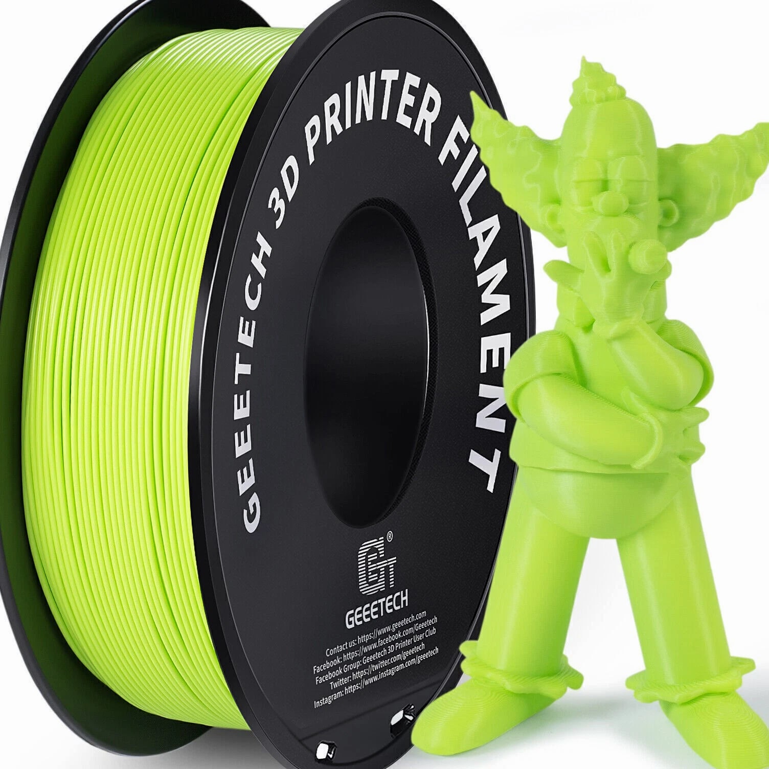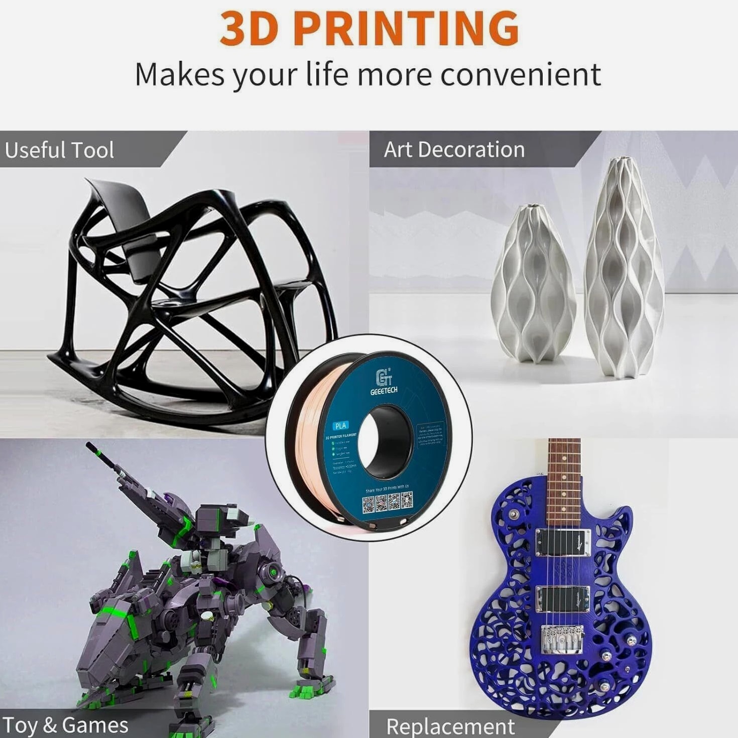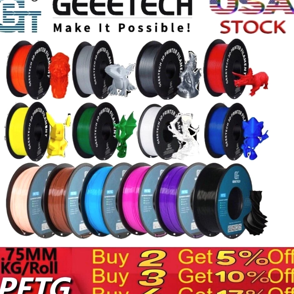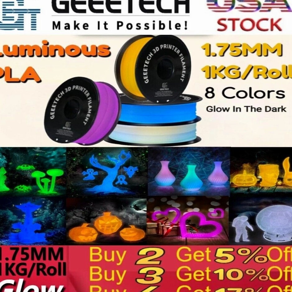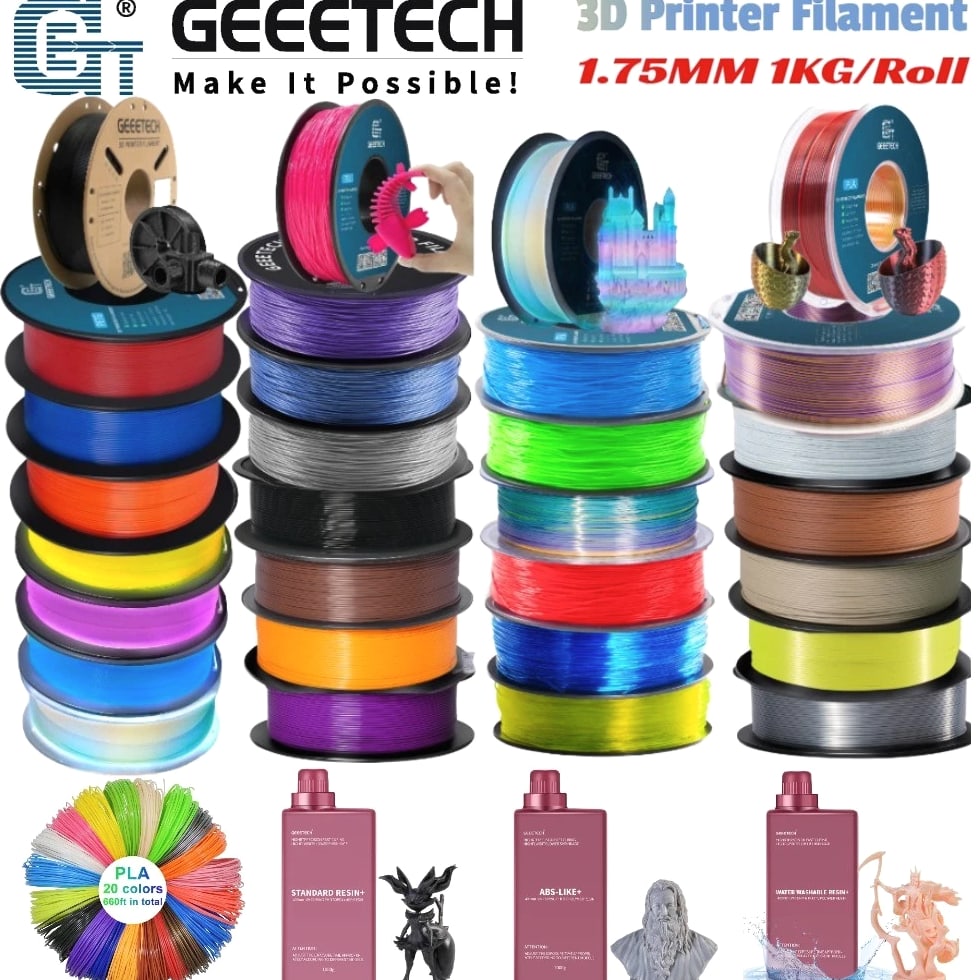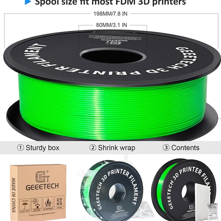 HOT SALE! GEEETECH 3D Printer Filament PLA/ABS+/PETG/TPU/Resin 1.75MM 1KG/Roll; Multiple Colors About this item Specification: Net weight: 1 kg Color: Available in Your Choice Material: PLA/ABS/PETG/TPU Filament diameter: 1.75 mm ( +/- 0.03 mm) Regular PLA 【Dimensional Accuracy & Consistency】- GEETECH PLA maintains strict tolerances. Diameter 1.75mm, dimensional accuracy +/- 0.03mm without exaggeration. It harmonizes perfectly with all standard 1.75mm FDM 3D printers. 【1kg (2.2lbs) Spool】Pack of 1 1kg/(2.2lbs) . Spool size: Φ200mm/7.9" flange, Φ56mm/2.2" hub hole, 64mm/2.5" width. Reel is compatible with most modern printers, Comgrow, Geeetech, Longer, LABISTS, ANYCUBIC, etc. 【Easy-to-Use, Clog-Free, Bubble-Free】- Recommended extrusion nozzle temperature 185°C - 215°C, hot bed 25°C - 60°C. Works perfectly with all standard 1.75mm FDM 3D printers. 【Vacuum Packing】- Vacuum sealed with desiccant to maintain minimal moisture content. Please keep dry and dust-free after opening the sealed package to prevent brittleness or nozzle jamming. Note: an additional sealed bag is included for filament storage. Silk PLA 【Silky Shiny Color】The distinctive color of PLA Silk Filament delivers arts & crafts and 3D Projects with a Smooth Shiny Silver Surface providing eye-catching, glossy prints. It's ideal for printing decorations or gifts for various festivals and cosplay events. 【High Quality】This filament is Anti-warping, precise, bubble-free, jam-resistant and has no drawing. Recommended printing temp 200-230°C (392-446°F), bed temp 40-60°C (104-140℉). 【High Compatibility】This filament is universally designed and compatible with 3D Printers using 1.75mm diameter filament, with a dimensional accuracy of +/- 0.03mm. 【Vacuum sealed packaging】 This filament is packed in a sealed vacuum bag with a desiccant bag to maintain dryness and preserve high performance long-term. Luminous PLA Filament: 【An Impressive Luminous PLA Filament】If you like your prints to be shiny and bright, Geeetech features