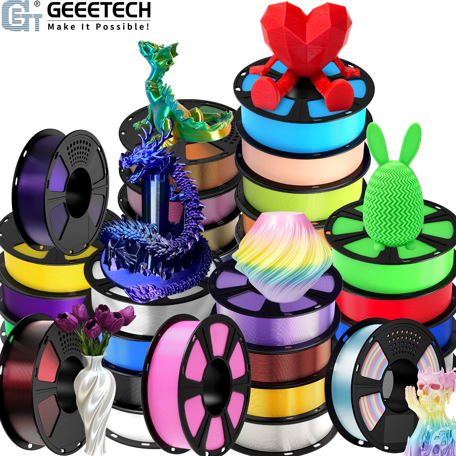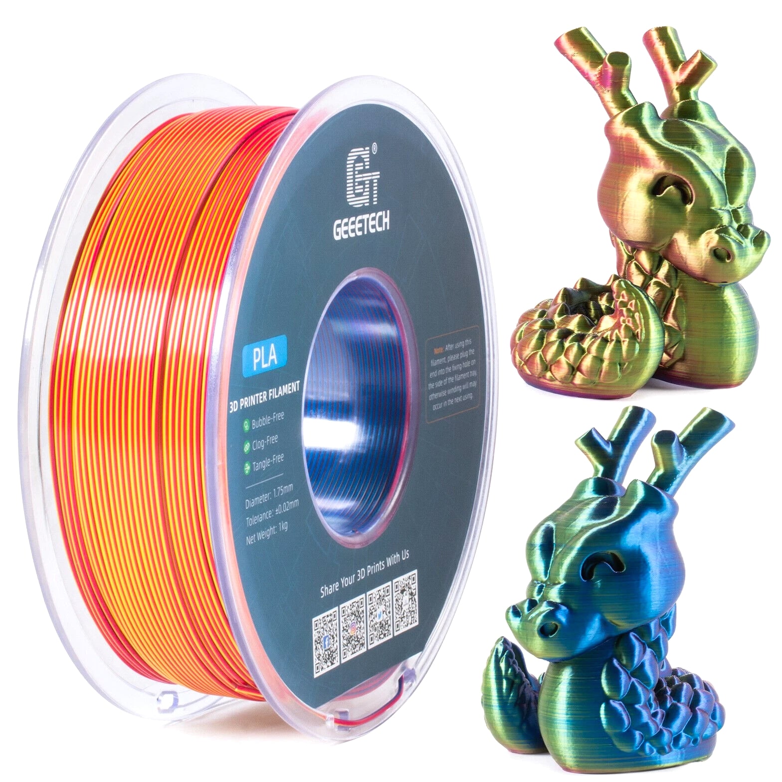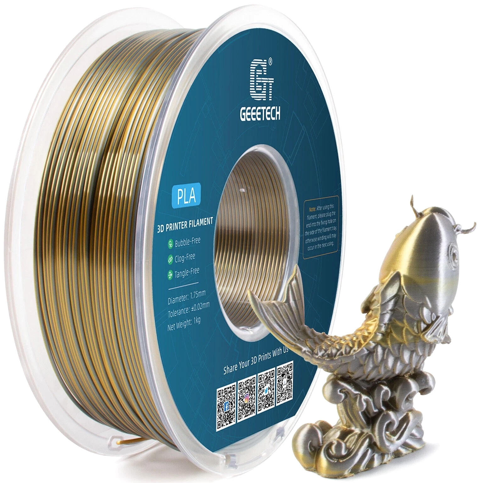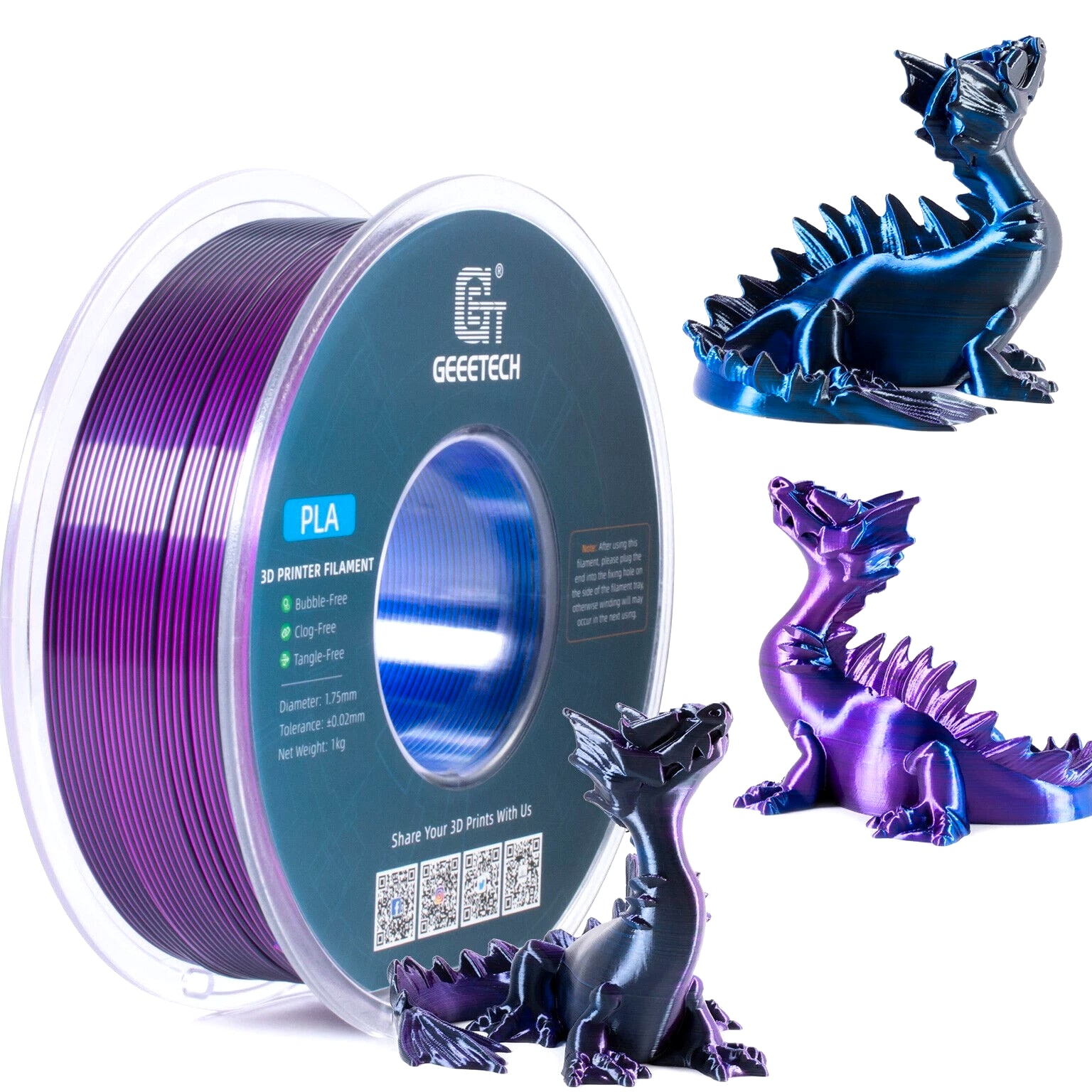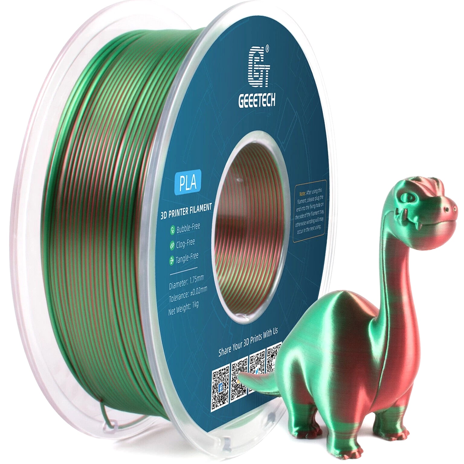 HOT SALE! GEEETECH 3D Printer Filament PLA/ABS+/PETG/TPU/Resin 1.75MM 1KG/Roll Multiple Colors About this item Specification: Net weight: 1 kg Color: Available in Your Choice Material: PLA/ABS/PETG/TPU Filament diameter: 1.75 mm ( +/- 0.03 mm) Regular PLA 【Dimensional Accuracy & Consistency】- GEETECH PLA maintains strict tolerances. Diameter 1.75mm, dimensional accuracy +/- 0.03mm without exaggeration. It harmonizes perfectly with all standard 1.75mm FDM 3D printers. 【1kg (2.2lbs) Spool】Pack of 1 1kg/(2.2lbs) . Spool size: Φ200mm/7.9" flange, Φ56mm/2.2" hub hole, 64mm/2.5" width. Reel is compatible with most modern printers, Comgrow, Geeetech, Longer, LABISTS, ANYCUBIC, etc. 【Easy-to-Use, Clog-Free, Bubble-Free】- Recommended extrusion nozzle temperature 185°C - 215°C, hot bed 25°C - 60°C. Works perfectly with all standard 1.75mm FDM 3D printers. 【Vacuum Packing】- Vacuum sealed with desiccant to maintain minimal moisture content. Please keep dry and dust-free after opening the sealed package to prevent brittleness or nozzle jamming. Note: an additional sealed bag is included for filament storage. Silk PLA 【Silky Shiny Color】The distinctive color of PLA Silk Filament delivers arts & crafts and 3D Projects with a Smooth Shiny Silver Surface providing eye-catching, glossy prints. It's ideal for printing decorations or gifts for various festivals and cosplay events. 【High Quality】This filament is Anti-warping, precise, bubble-free, jam-resistant, and has no stringing. Recommended printing temp 200-230°C (392-446°F), bed temp 40-60°C (104-140℉). 【High Compatibility】This filament is universally designed and compatible with 3D Printers using 1.75mm diameter filament, with a dimensional accuracy of +/- 0.03mm. 【Vacuum sealed packaging】 This filament is packed in a sealed vacuum bag with a desiccant bag to maintain dryness and preserve high performance long-term. Luminous PLA Filament: 【An Impressive Luminous PLA Filament】If you like your prints to be shiny and bright, Geeetech