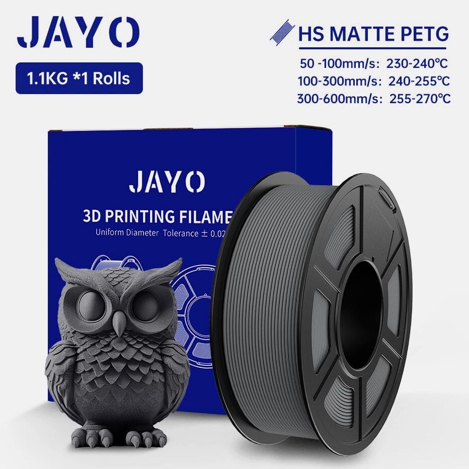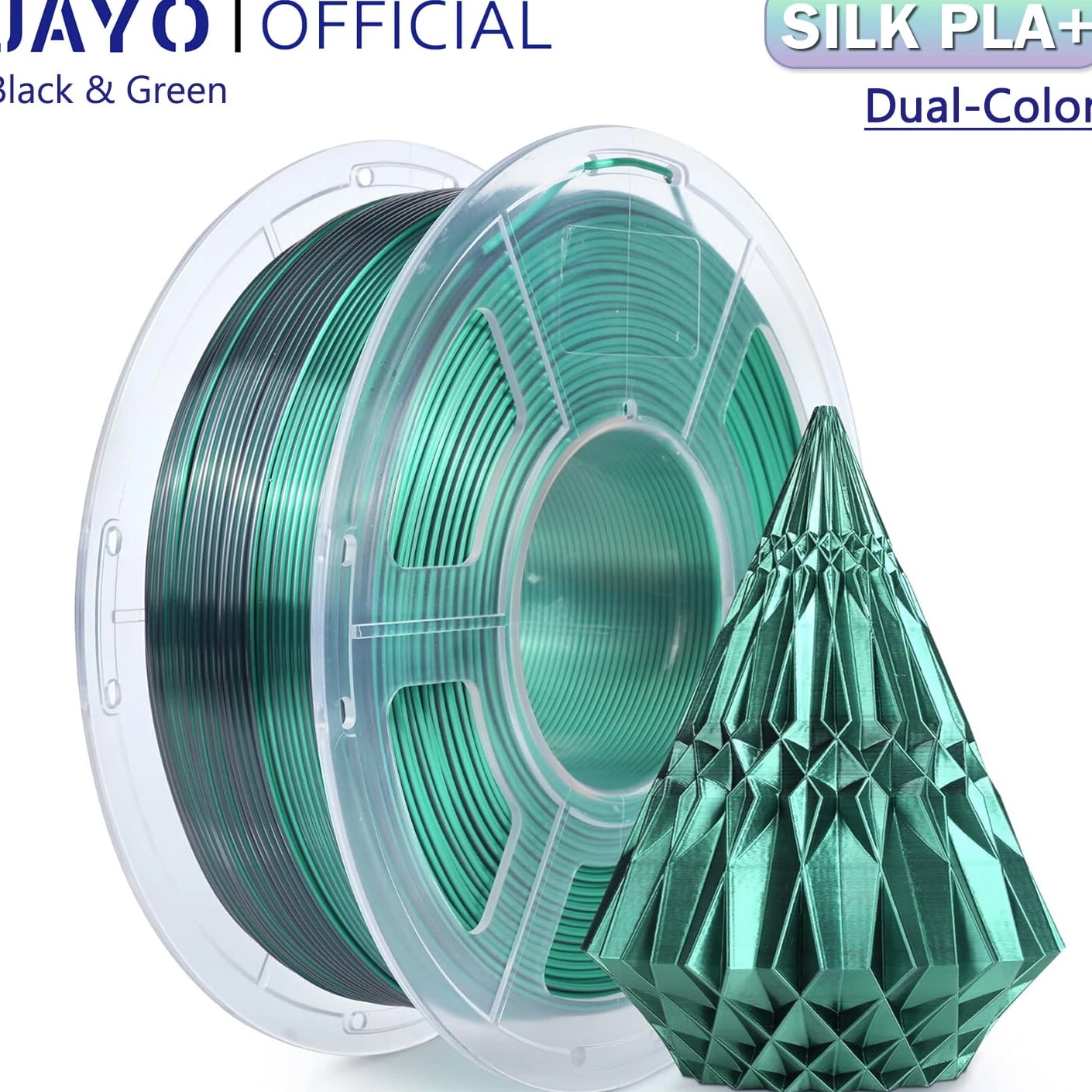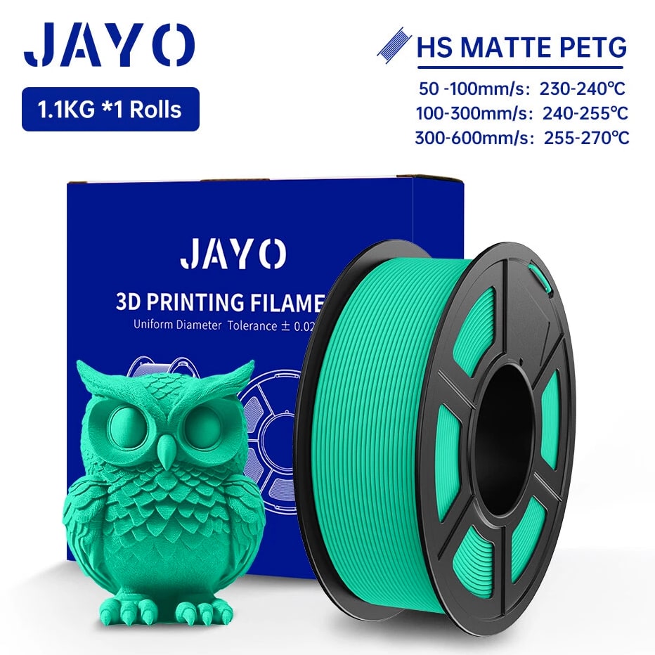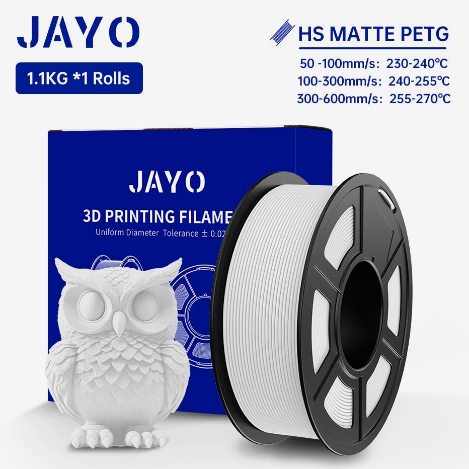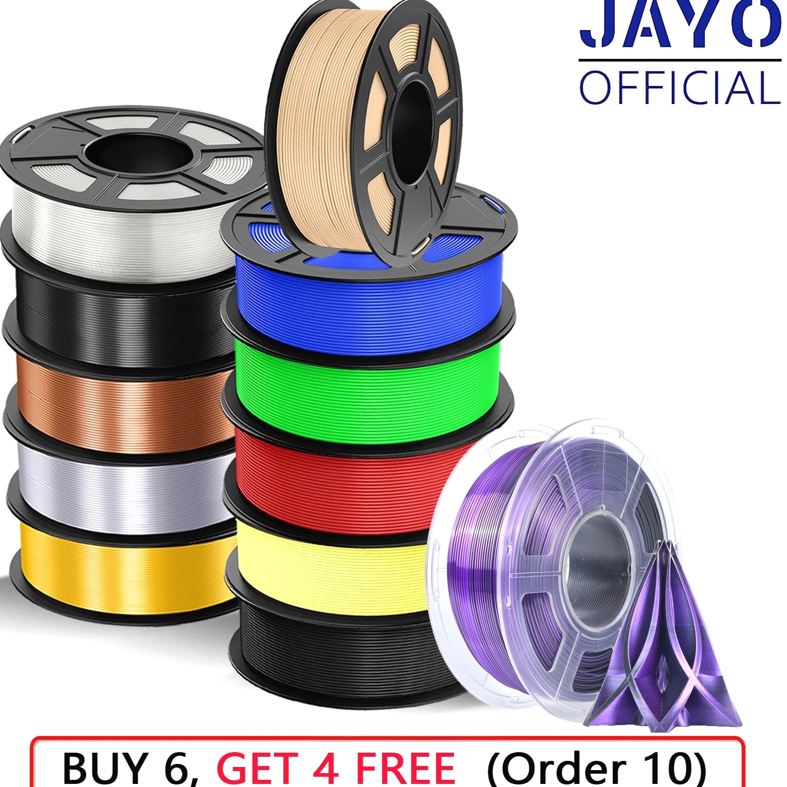 🎁 Discount Description This "Buy 6 get 4 free" campaign requires you to add 10 items to the shopping cart and then pay together. The system will automatically calculate the discount, you only need to pay for 6 pieces. 🎁 e.g Order 10, you will get 10, only pay for 6. Order 20, you will get 20, only pay for 12. JAYO Neatly Wound Filament We have improved the production process of our filaments. The following filaments are now 100% neatly wound - PLA / PLA+ / PLA Meta / SILK PLA+ / PETG.(ABS / TPU / PLA Marble / PLA Twinkling are not included.) Filament PLA PLA+ PLA+2.0 PETG ABS PLA Meta PLA Matte Silk PLA+ PLA High-Speed Filament Diameter 1,75mm 1,75mm 1.75mm 1,75mm 1,75mm 1,75mm 1,75mm 1,75mm 1,75mm Tolerance ±0,02mm ±0,02mm ±0.02mm ±0,02mm ±0,03mm ±0,02mm ±0,03mm ±0,02mm ±0,02mm Printing Temperature 200-210℃ 205-215℃ 205-215°C 220-230℃ 250-260℃ 185-195℃ 205-215℃ 205-215℃ 190-210℃ Platform Temperature 50-60℃ 50-60℃ 50-60°C 60-70℃ 80-100℃ 50-60℃ 50-60℃ 50-60℃ 50-60℃ Printing Speed 50-100MM/s 50-100MM/s 50-300MM/s 40-60MM/s 40-60MM/s 50-150MM/s 50-100MM/s 40-60MM/s 190-210℃, 50-150mm/s 210-230℃, 150-300mm/s 230-260℃, 300-600mm/s Heat Deflection Temperature 53℃ 53℃ 53℃ 63℃ 84℃ 53℃ 53℃ 53℃ 53℃ Elongation at Break 3.1% 3.6% 3.8% 5.3% 7.8% 17% 9.6% 6.3% 3.6% Net Weight 1,1 KG 1,1 KG 1.1 KG 1,1 KG 0,65 KG 1 KG 1,1 KG 1,1 KG 1,1 KG 1,1 KG Filament PLA carbon fibre PLA Marmor PLA Luminous (Glow in the Dark) AntiString PLA ASA Easy ABS TPU (95A) TPU SILK (98A) Classic Filament Diameter 1,75mm 1,75mm 1,75mm 1,75mm 1,75mm 1,75mm 1,75mm 1,75mm 1,75mm Tolerance ±0,02mm ±0,03mm ±0,02mm ±0,03mm ±0,02mm ±0,03mm ±0,03mm ±0,03mm ±0,02mm Printing Temperature 215-225℃ 210-220℃ 200-210℃ 205-215℃ 255-275℃ 225-235℃ 195-205℃ 210-220℃ 230-260℃ Platform Temperature 50-60℃ 50-60℃ 50-60℃ 50-60℃ 50-60℃ 60-70℃ 50-60℃ 50-60℃ 50-60℃ Printing Speed 40-60MM/s 40-60MM/s 40-60mm/s 40-60mm/s 40-60mm/s 40-60MM/s Extrusion with direct drive: 40MM/s Bowden extrusion: 20MM/s Extrusion with direct drive: 50MM/s B
