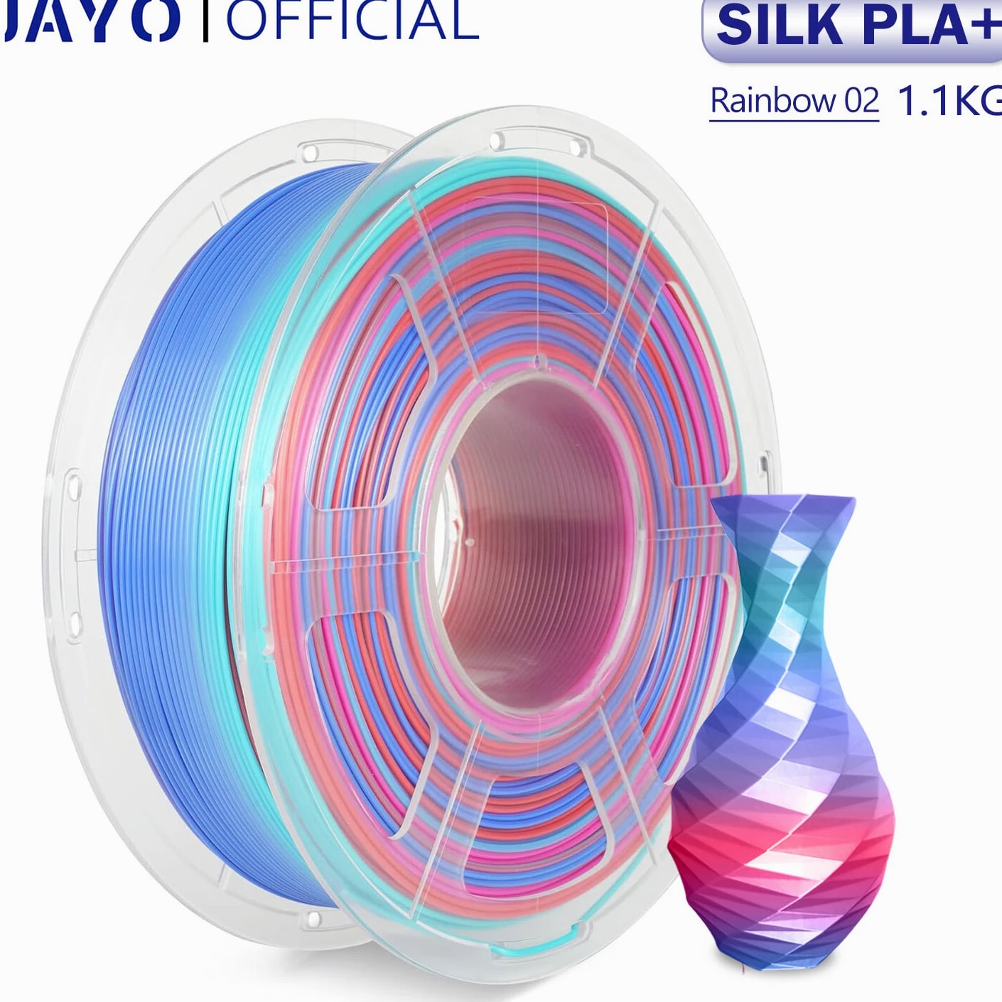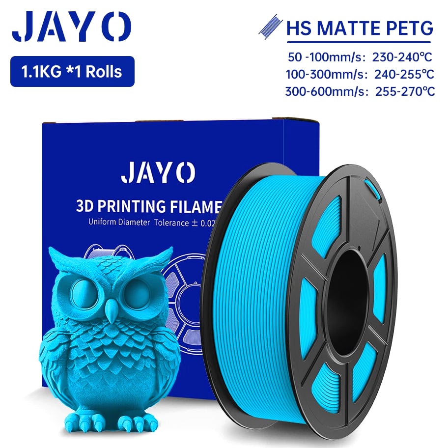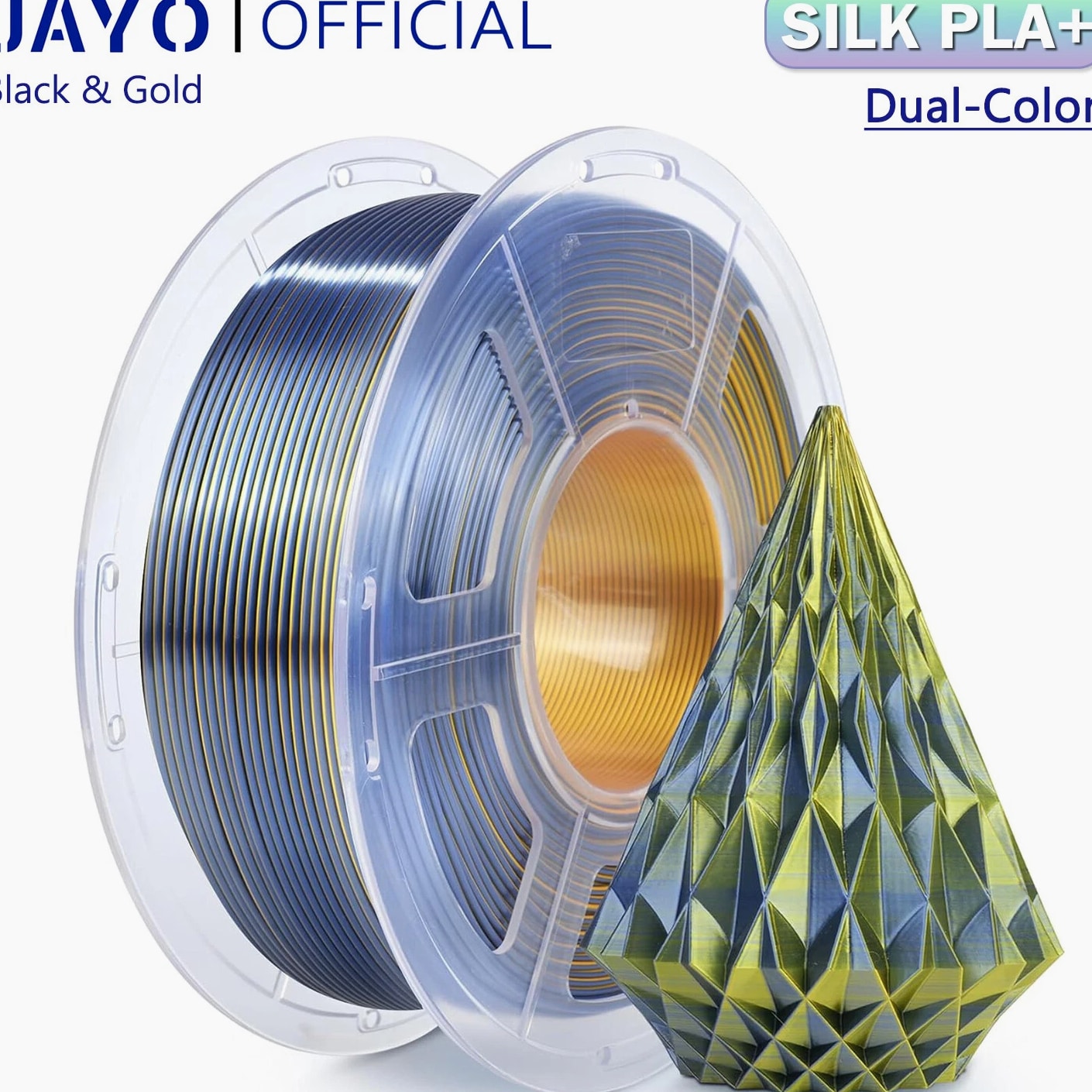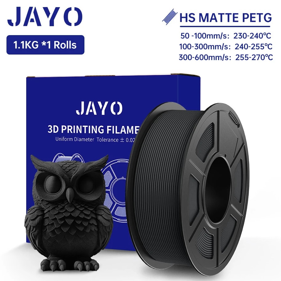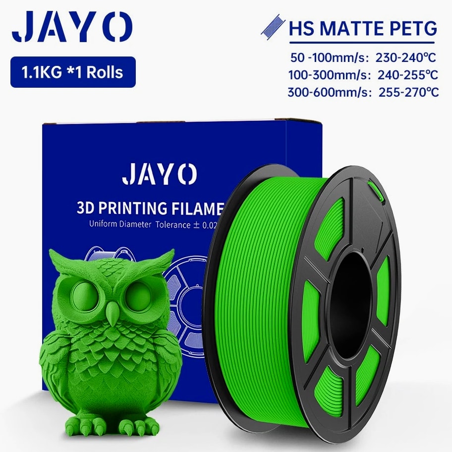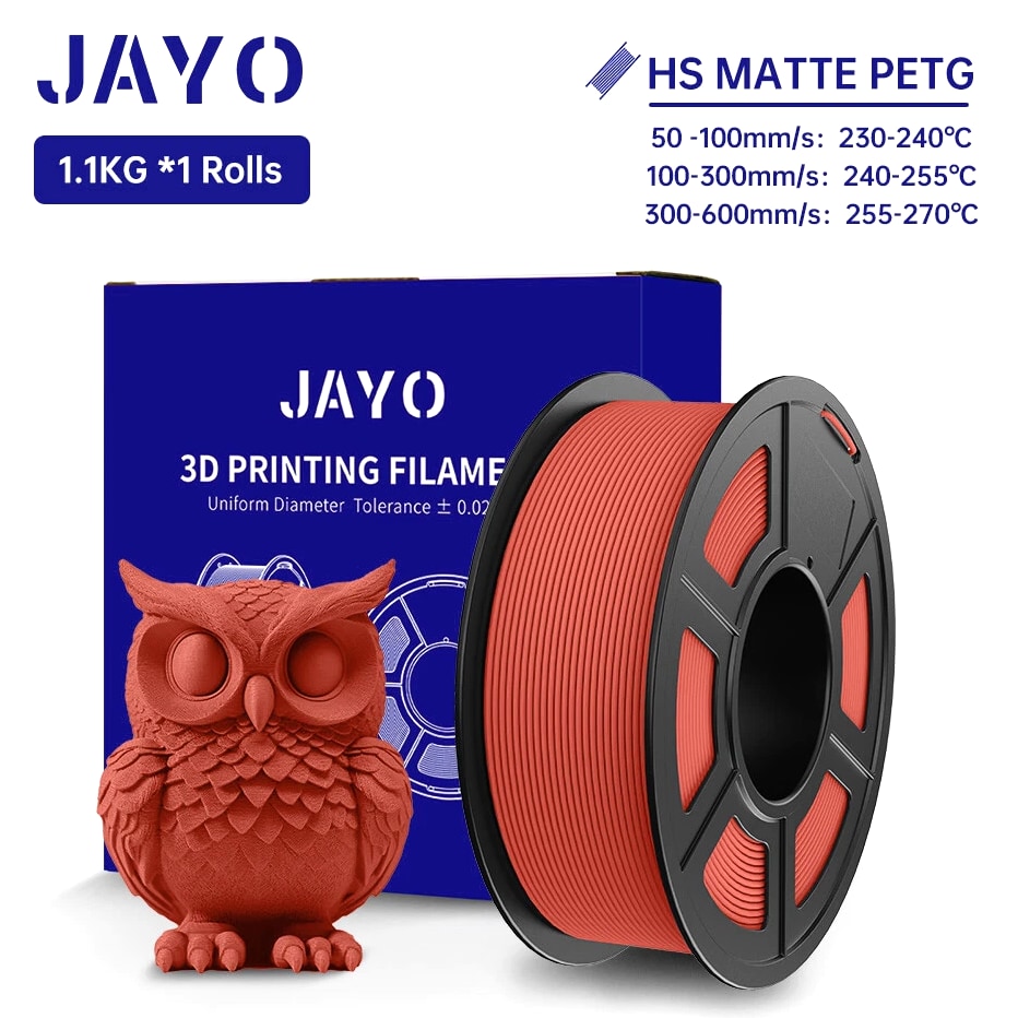🎁 Discount Description This "Buy 6 get 4 free" campaign requires you to add 10 items to the shopping cart and then pay together. The system will automatically calculate the discount, you only need to pay for 6 pieces. 🎁 e.g Order 10, you will get 10, only pay for 6. Order 20, you will get 20, only pay for 12. JAYO Neatly Wound Filament We have improved the production process of our filaments. The following filaments are now 100% neatly wound - PLA / PLA+ / PLA Meta / SILK PLA+ / PETG.(ABS / TPU / PLA Marble / PLA Twinkling are not included.) Filament PLA PLA+ PLA+2.0 PETG ABS PLA Meta PLA Matte Silk PLA+ PLA High-Speed Filament Diameter 1,75mm 1,75mm 1.75mm 1,75mm 1,75mm 1,75mm 1,75mm 1,75mm 1,75mm Tolerance ±0,02mm ±0,02mm ±0.02mm ±0,02mm ±0,03mm ±0,02mm ±0,03mm ±0,02mm ±0,02mm Printing Temperature 200-210℃ 205-215℃ 205-215°C 220-230℃ 250-260℃ 185-195℃ 205-215℃ 205-215℃ 190-210℃ Platform Temperature 50-60℃ 50-60℃ 50-60°C 60-70℃ 80-100℃ 50-60℃ 50-60℃ 50-60℃ 50-60℃ Printing Speed 50-100MM/s 50-100MM/s 50-300MM/s 40-60MM/s 40-60MM/s 50-150MM/s 50-100MM/s 40-60MM/s 190-210℃, 50-150mm/s 210-230℃, 150-300mm/s 230-260℃, 300-600mm/s Heat Deflection Temperature 53℃ 53℃ 53℃ 63℃ 84℃ 53℃ 53℃ 53℃ 53℃ Elongation at Break 3.1% 3.6% 3.8% 5.3% 7.8% 17% 9.6% 6.3% 3.6% Net Weight 1,1 KG 1,1 KG 1.1 KG 1,1 KG 0,65 KG 1 KG 1,1 KG 1,1 KG 1,1 KG 1,1 KG Filament PLA carbon fibre PLA Marmor PLA Luminous (Glow in the Dark) AntiString PLA ASA Easy ABS TPU (95A) TPU SILK (98A) Classic Filament Diameter 1,75mm 1,75mm 1,75mm 1,75mm 1,75mm 1,75mm 1,75mm 1,75mm 1,75mm Tolerance ±0,02mm ±0,03mm ±0,02mm ±0,03mm ±0,02mm ±0,03mm ±0,03mm ±0,03mm ±0,02mm Printing Temperature 215-225℃ 210-220℃ 200-210℃ 205-215℃ 255-275℃ 225-235℃ 195-205℃ 210-220℃ 230-260℃ Platform Temperature 50-60℃ 50-60℃ 50-60℃ 50-60℃ 50-60℃ 60-70℃ 50-60℃ 50-60℃ 50-60℃ Printing Speed 40-60MM/s 40-60MM/s 40-60mm/s 40-60mm/s 40-60mm/s 40-60MM/s Extrusion with direct drive: 40MM/s Bowden extrusion: 20MM/s Extrusion with direct drive: 50MM/s B