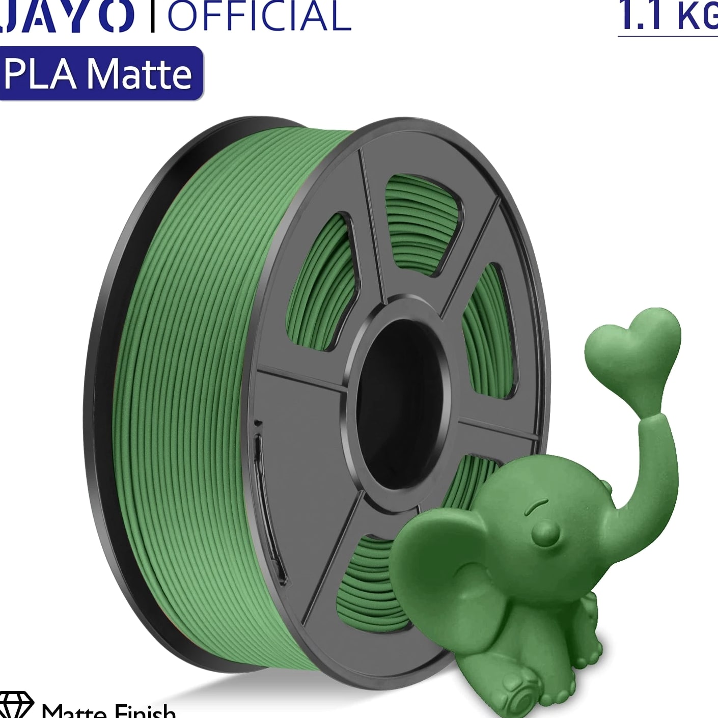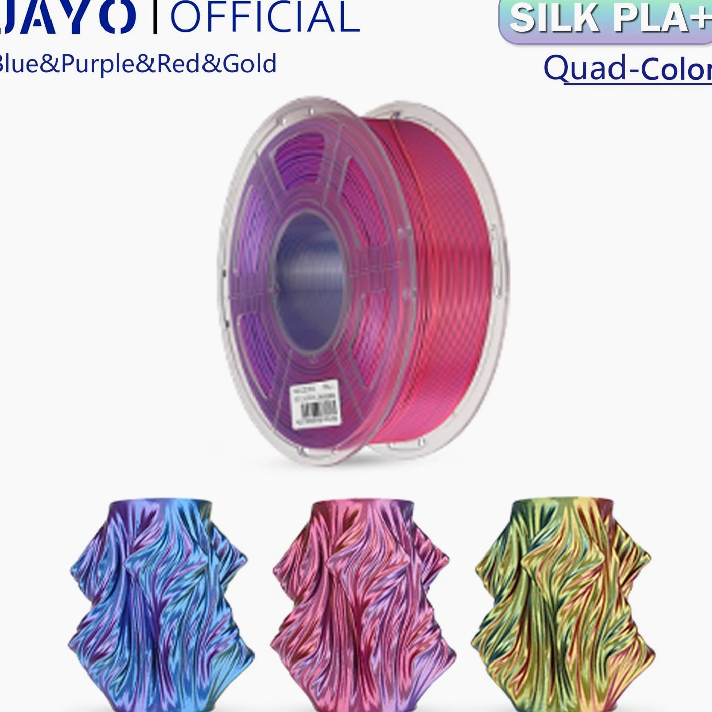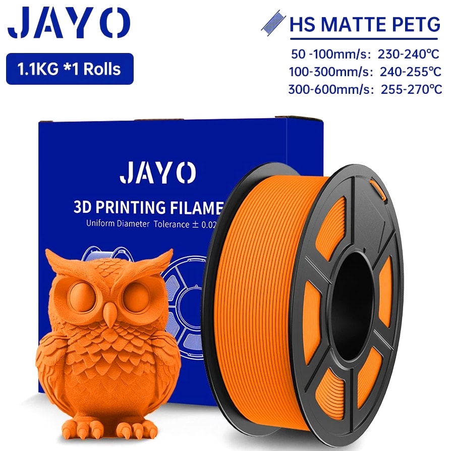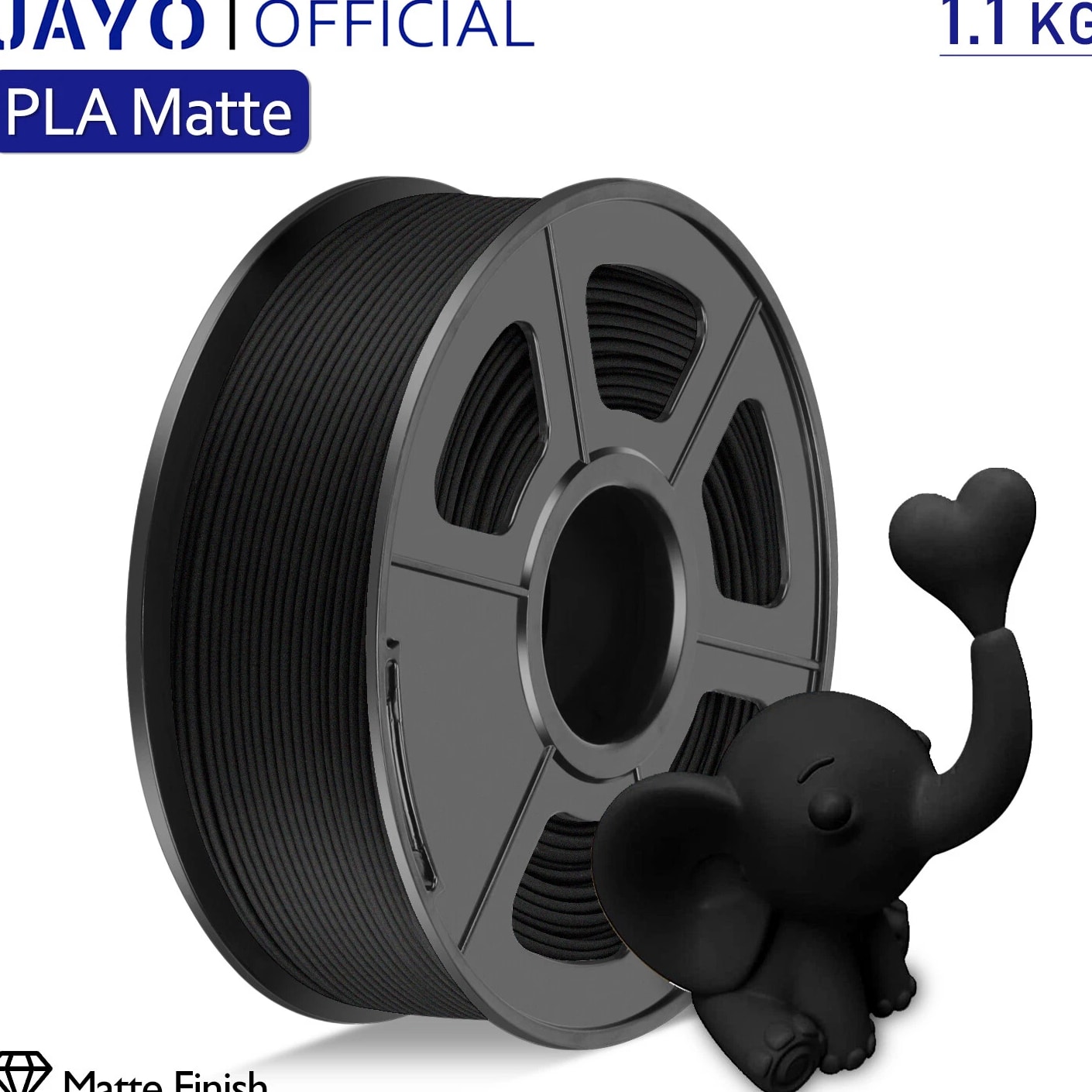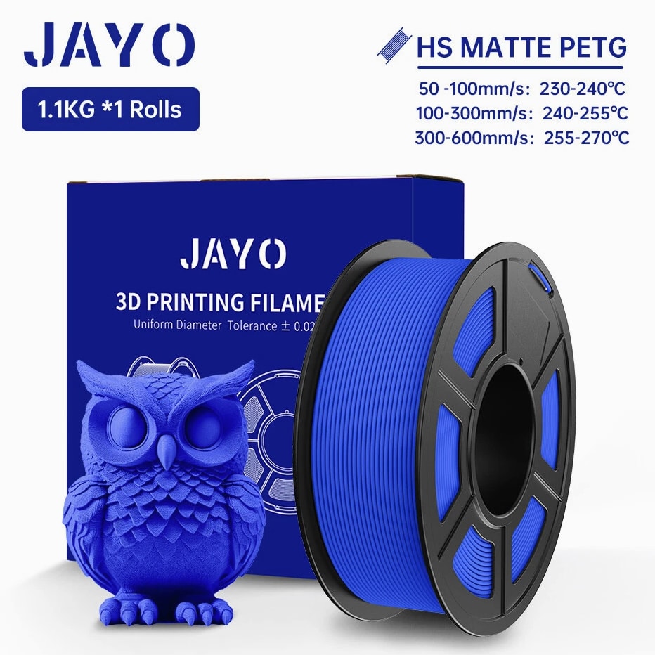 🎁 Discount Description This "Buy 6 get 4 free" campaign requires you to add 10 items to the shopping cart and then pay together. The system will automatically calculate the discount, you only need to pay for 6 pieces. 🎁 e.g Order 10, you will get 10, only pay for 6. Order 20, you will get 20, only pay for 12. JAYO Neatly Wound Filament We have improved the production process of our filaments. The following filaments are now 100% neatly wound - PLA / PLA+ / PLA Meta / SILK PLA+ / PETG.(ABS / TPU / PLA Marble / PLA Twinkling are not included.) Filament PLA PLA+ PLA+2.0 PETG ABS PLA Meta PLA Matte Silk PLA+ PLA High-Speed Filament Diameter 1,75mm 1,75mm 1.75mm 1,75mm 1,75mm 1,75mm 1,75mm 1,75mm 1,75mm Tolerance ±0,02mm ±0,02mm ±0.02mm ±0,02mm ±0,03mm ±0,02mm ±0,03mm ±0,02mm ±0,02mm Printing Temperature 200-210℃ 205-215℃ 205-215°C 220-230℃ 250-260℃ 185-195℃ 205-215℃ 205-215℃ 190-210℃ Platform Temperature 50-60℃ 50-60℃ 50-60°C 60-70℃ 80-100℃ 50-60℃ 50-60℃ 50-60℃ 50-60℃ Printing Speed 50-100MM/s 50-100MM/s 50-300MM/s 40-60MM/s 40-60MM/s 50-150MM/s 50-100MM/s 40-60MM/s 190-210℃, 50-150mm/s 210-230℃, 150-300mm/s 230-260℃, 300-600mm/s Heat Deflection Temperature 53℃ 53℃ 53℃ 63℃ 84℃ 53℃ 53℃ 53℃ 53℃ Elongation at Break 3.1% 3.6% 3.8% 5.3% 7.8% 17% 9.6% 6.3% 3.6% Net Weight 1,1 KG 1,1 KG 1.1 KG 1,1 KG 0,65 KG 1 KG 1,1 KG 1,1 KG 1,1 KG 1,1 KG Filament PLA carbon fibre PLA Marmor PLA Luminous (Glow in the Dark) AntiString PLA ASA Easy ABS TPU (95A) TPU SILK (98A) Classic Filament Diameter 1,75mm 1,75mm 1,75mm 1,75mm 1,75mm 1,75mm 1,75mm 1,75mm 1,75mm Tolerance ±0,02mm ±0,03mm ±0,02mm ±0,03mm ±0,02mm ±0,03mm ±0,03mm ±0,03mm ±0,02mm Printing Temperature 215-225℃ 210-220℃ 200-210℃ 205-215℃ 255-275℃ 225-235℃ 195-205℃ 210-220℃ 230-260℃ Platform Temperature 50-60℃ 50-60℃ 50-60℃ 50-60℃ 50-60℃ 60-70℃ 50-60℃ 50-60℃ 50-60℃ Printing Speed 40-60MM/s 40-60MM/s 40-60mm/s 40-60mm/s 40-60mm/s 40-60MM/s Extrusion with direct drive: 40MM/s Bowden extrusion: 20MM/s Extrusion with direct drive: 50MM/s B