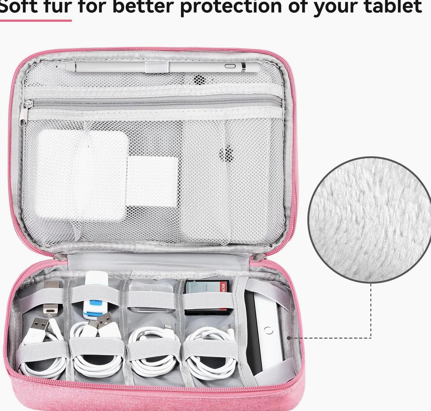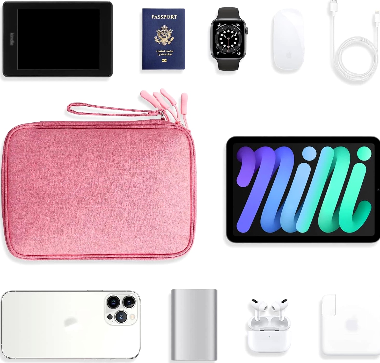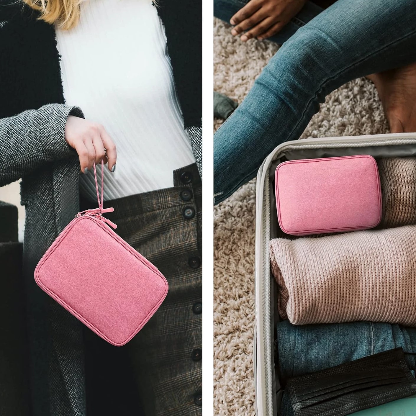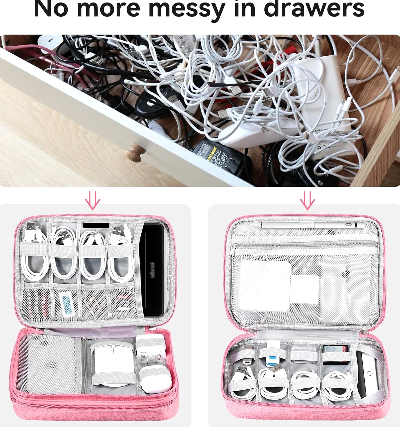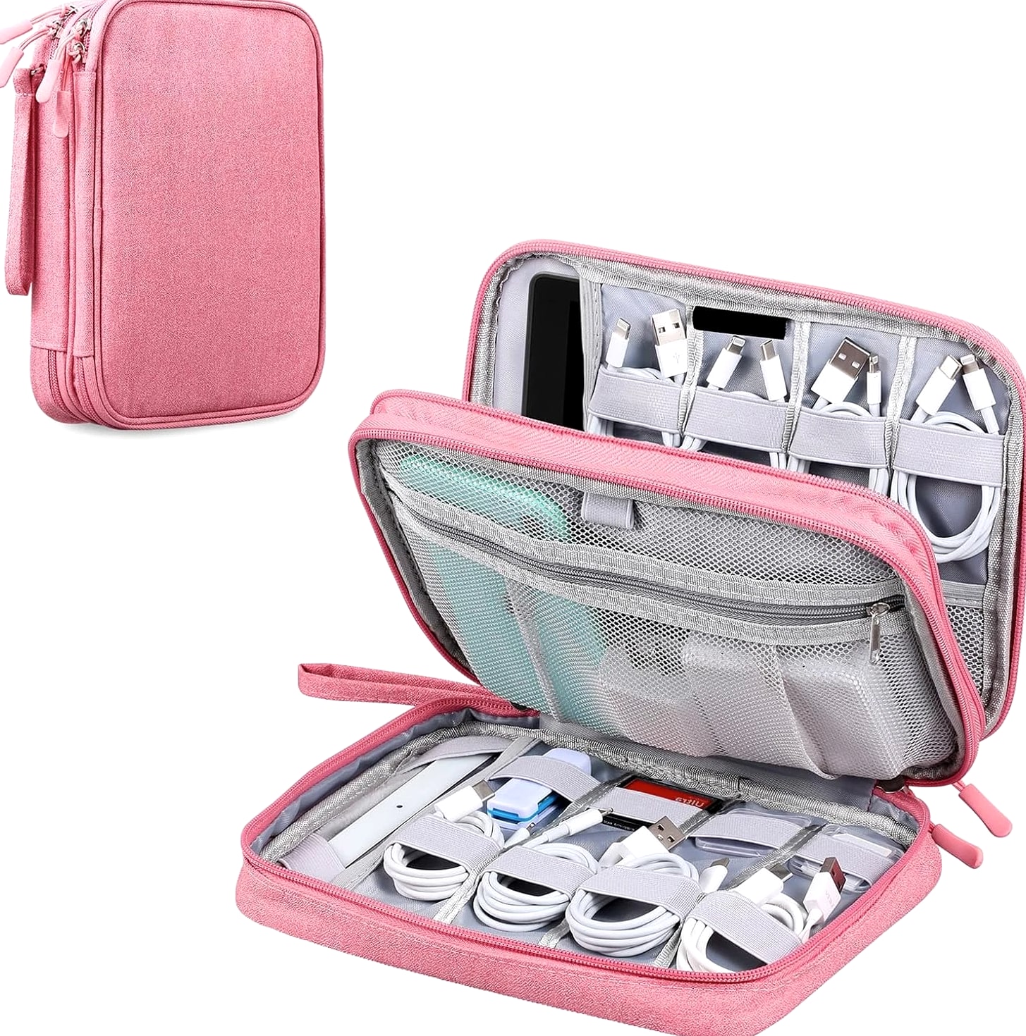 Ideal for Travel & Daily Use A cable organizer bag is designed for business travelers, office workers, students, and anyone who needs a compact yet large-capacity pouch to keep electronic accessories neatly stored and easy to access. Dual Compartments for Smart Storage Features 2 main compartments with mesh pockets to separate and organize tech essentials. Perfectly holds power banks, chargers, cables, earphones, adapters, SD cards, and small digital devices in one place. Lightweight & Portable Design Compact and lightweight carrying case with dimensions: 9.8 x 7.3 x 2.36 in, only 240g (0.53 lbs). Easy to carry in backpacks, luggage, or briefcases for daily commutes and travel. Water-Resistant & Durable Material Made of high-quality jacquard fabric that is splash-proof and wear-resistant, effectively protecting your electronics from accidental spills, dust, and scratches. All-in-One Storage Solution Keeps all cords, adapters, chargers, and small gadgets organized, eliminating messy tangles and saving time when searching for accessories. Great for home, office, travel, and business trips. Large Travel Electronic Organizer – Cable & Accessory Storage Bag Keep your digital life neat and organized with this Electronic Travel Organizer. Whether you're on a business trip, vacation, or working at the office, this storage pouch keeps all your essential tech accessories in one convenient place, so you no longer have to dig through bags to find tangled cords or small adapters. This large-capacity organizer provides ample space for iPad mini, passports, IDs, certificates, power banks, external hard drives, SD cards, charging cables, earphones, adapters, and other small electronics. It's a practical and versatile storage solution for daily use and travel. Product Details Exterior Material: Water-repellent jacquard fabric, splash-proof and durable Interior Material: 210D nylon lining with sturdy mesh pockets Dimensions: 9.8 x 7.3 x 2.36 inches Weight: 0.53 lbs (24