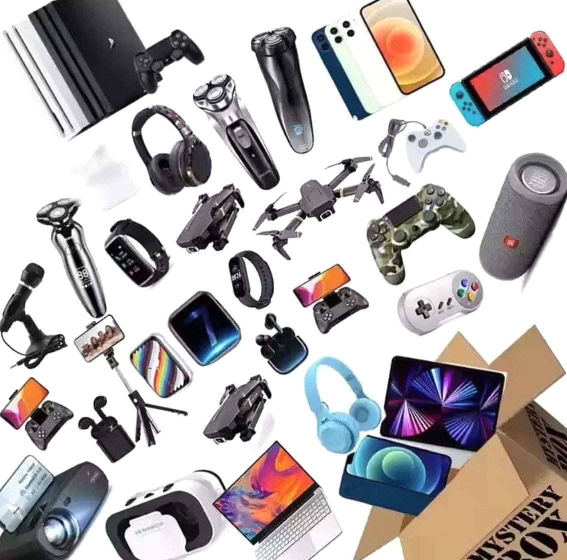 Experience the thrill of the unknown with this Electronics Mystery Box! Each box includes 1–5 random electronic products or accessories, such as mini cameras, action cameras, kids' cameras, selfie sticks, smart watches, smart bracelets, earphones, speakers, or TWS earbuds. Every box is packed randomly – you might receive everyday gadgets, fun tech toys or higher-value surprises. It's perfect for people who love unboxing, tech lovers, gift buyers, or anyone who wants a fun surprise at a great price. Please note: Contents are random. Items shown in pictures are examples only – you may receive different items. No returns or refunds based on personal preference of items.