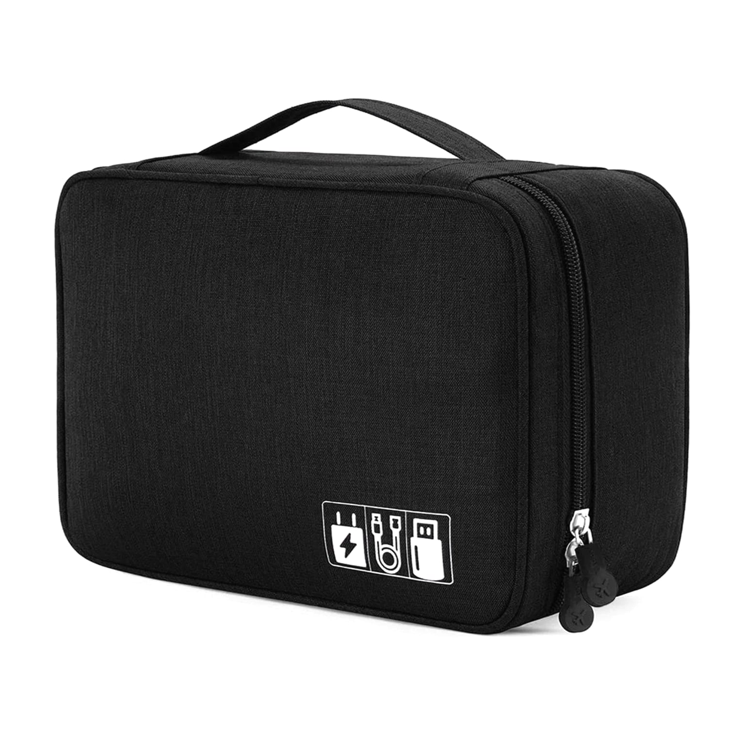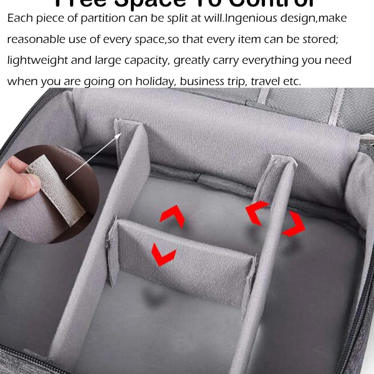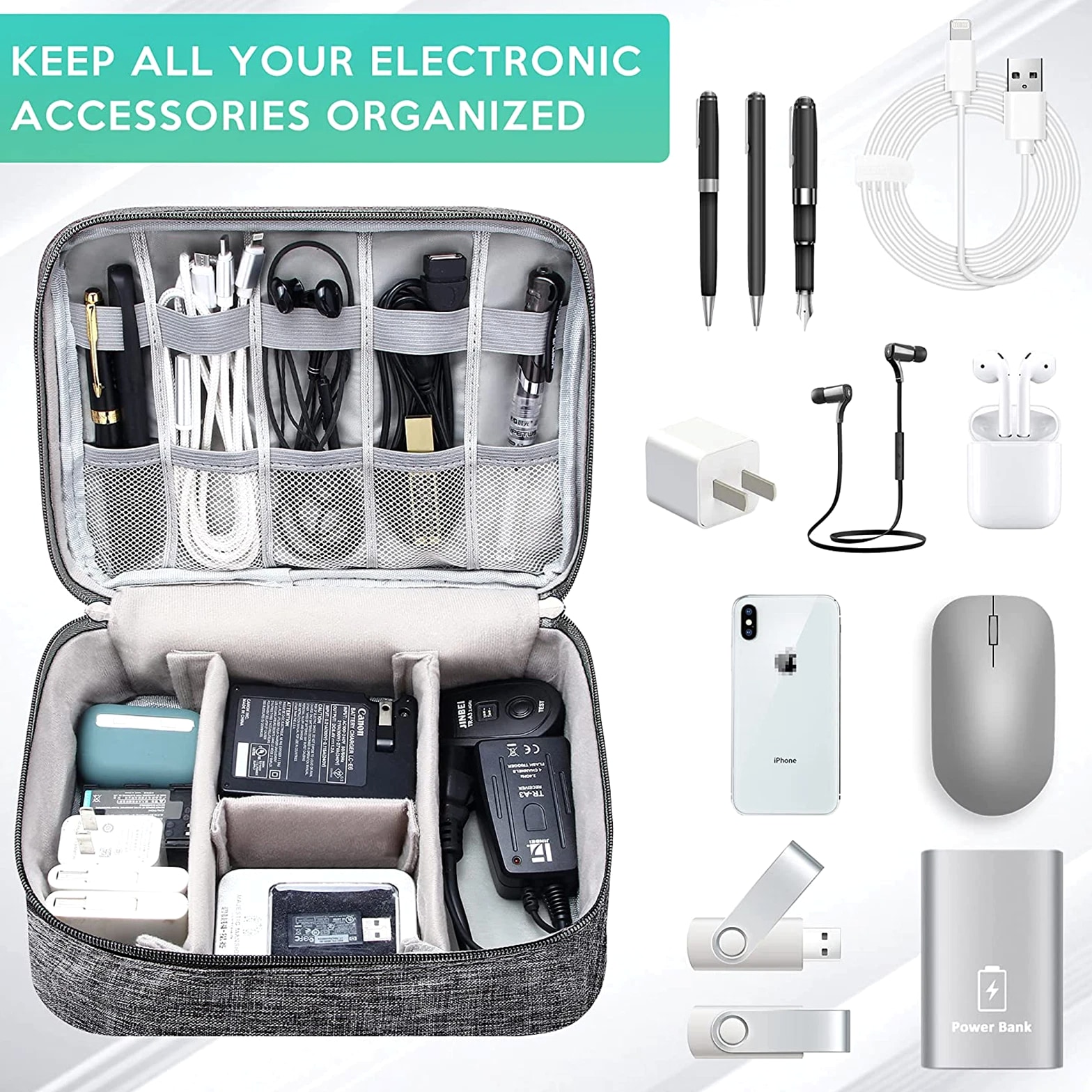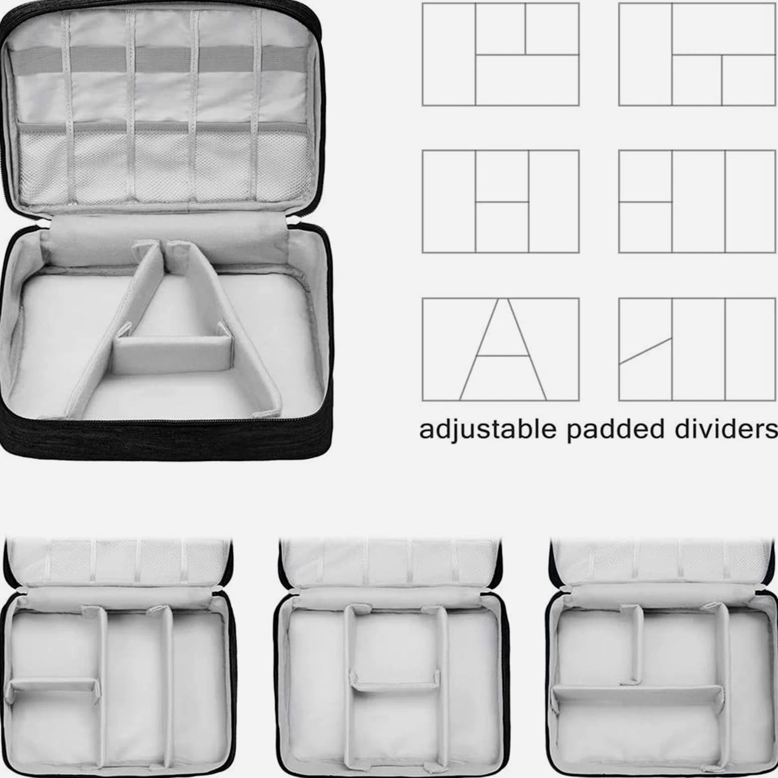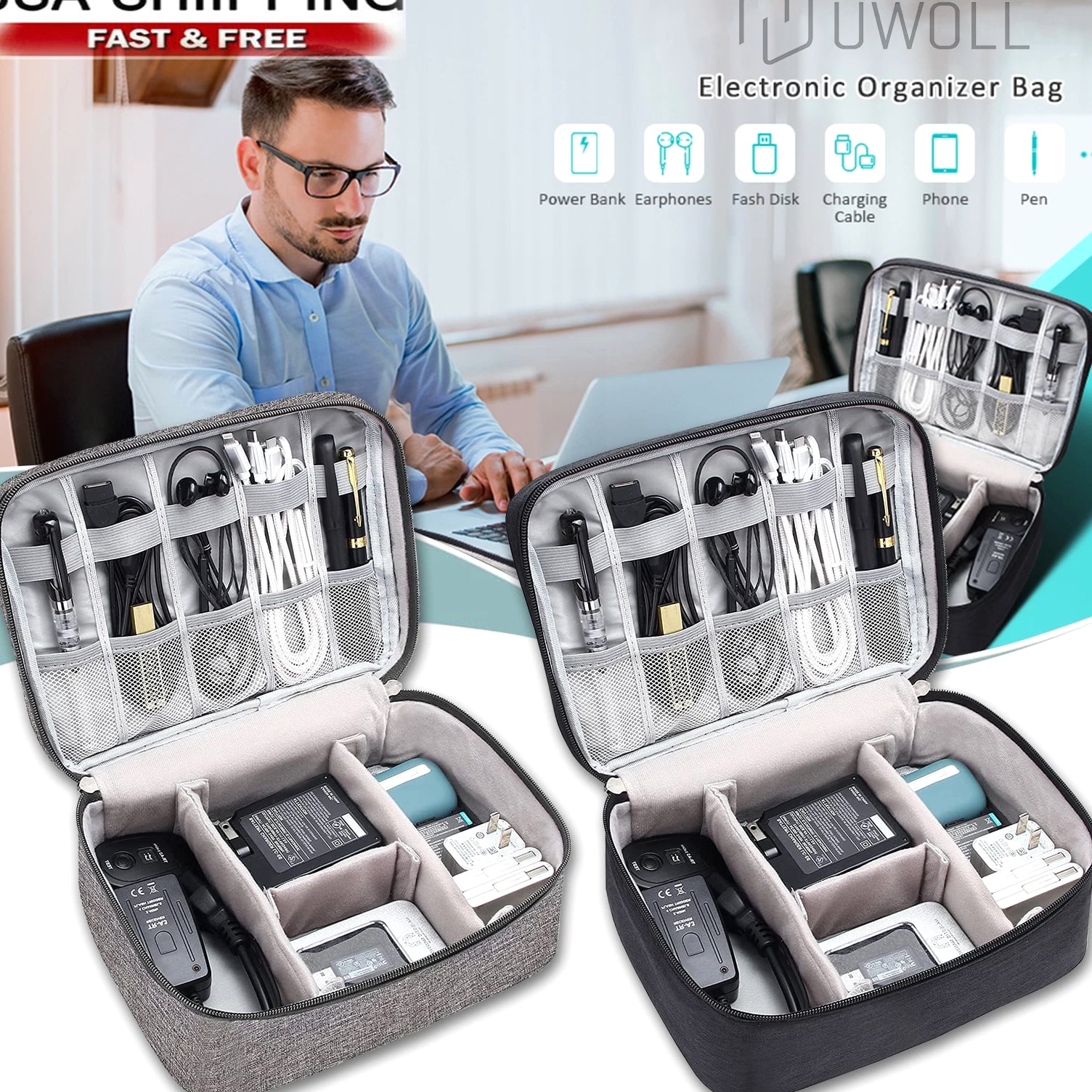 UWOLL Electronics Organizer Travel Cable Organizer Bag Portable Tech Bag Organizer for Men Women UWOLL travel cord organizer bag can keep your items like cables, cords, neatly stored in one place and easy access, no mess, no lose, no damage. UWOLL electronic cord organizer travel case is suitable for traveling, business trips and everyday carry or just used for home and office to make your important accessories organized and well protected. UWOLL travel cable organizer makes an excellent business company gift for business partner, boss, employees, office worker. Also a nice charger bag for men, women. Large Capacity Electronic Organizer Travel Case for Men Women KEEP ALL ACCESSORIES WELL ORGANIZED IN ONE BAG TIDY AND NEAT. 5 mesh pockets with elastic loops to hold pens, cables, etc. 3 adjustable padded compartments dividers can be adjusted as you wish to hold varieties of electronic devices. Various Advantages Of The Electronics Travel Cable Organizer Bag Sturdy & Widened Handle This travel cable organizer is designed with a widened handle, you can take it with you no matter you are at office, travelling or going on a business trip. Double-way Zippers Double-way zippers are more convenient for you to fetch electronic accessories than single zipper. Quality Anti-slip zippers are more smooth and durable than normal zippers. Waterproof Cation Fabric This accessory case is made of cation fabric, which is waterproof and durable, protecting your electronics against scratches, dust, impacts and accidental dropping. Exquisite Mesh Pockets This travel cord bag including five premium mesh pockets with neat stitching and compact layout. You can store your cords, earphones, pens, usb, sd cards in order. Visual mesh design for quick access and management. Premium Elastic Loops This large electronic accessory case is also designed with 5 elastic loops to match the 5 mesh pockets, which can keep your cords, earphones, pens fixed better. Soft & Thicken Lining This big electronic bag i