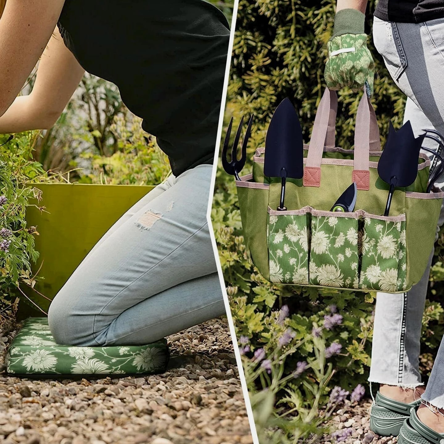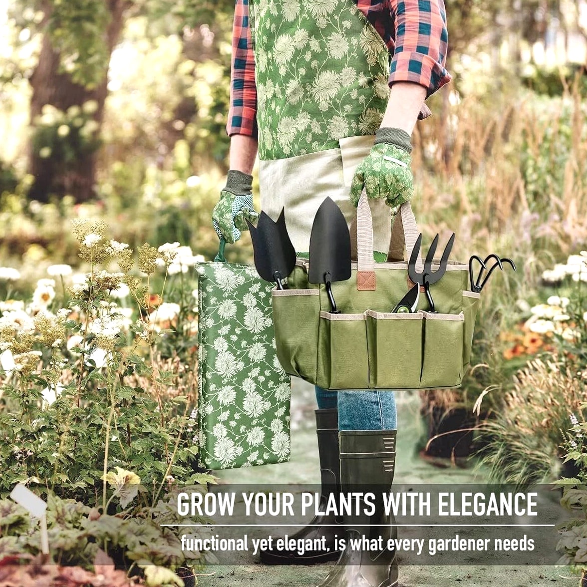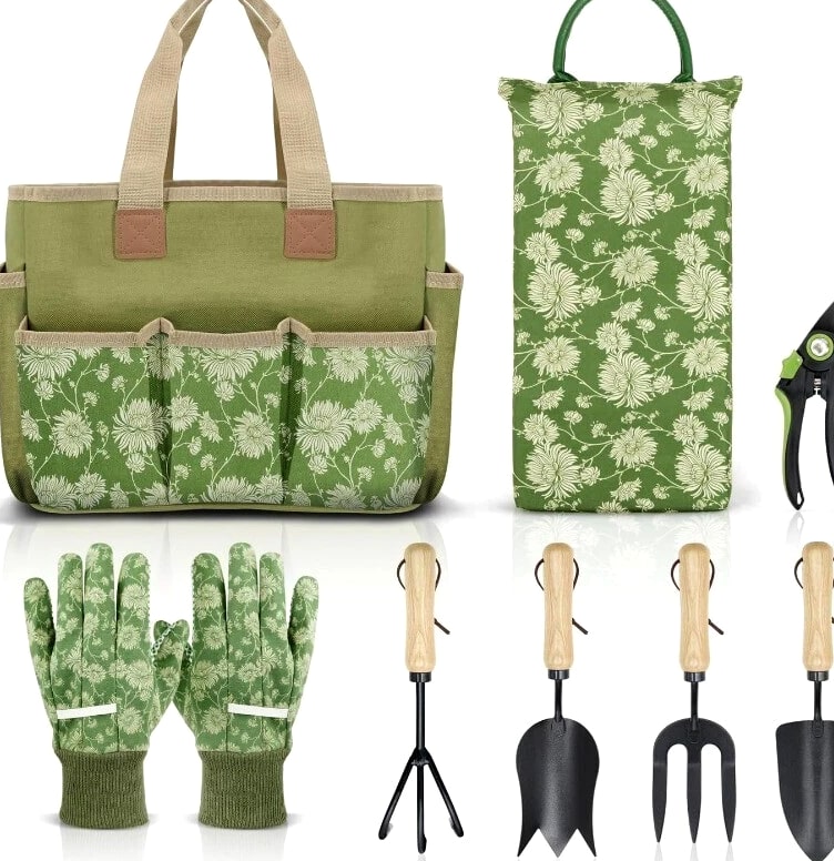 About this item 【READY FOR GIFT GIVING】 - Grow your plants with elegance. Functional yet elegant, this garden tools set is what every gardener needs. Includes storage tote bag, kneeling pad, garden gloves and 5 hand garden tools - pruning shear, trowel, tulip trowel, hand fork, cultivator. An excellent gardening gift for yourself and your favorite gardening enthusiast. 【WOODEN HANDLE】 - The gardening tools feature sturdy construction and thick steel components which promise longevity. The carefully contoured handle made of smooth wood, fits easily in your hand and will reduce the pain of yard work on your hands. Colors are closer to nature. 【ADD VINTAGE TOUCH TO YOUR GARDEN】 - Together with matching garden gloves, floral design with vintage style of k