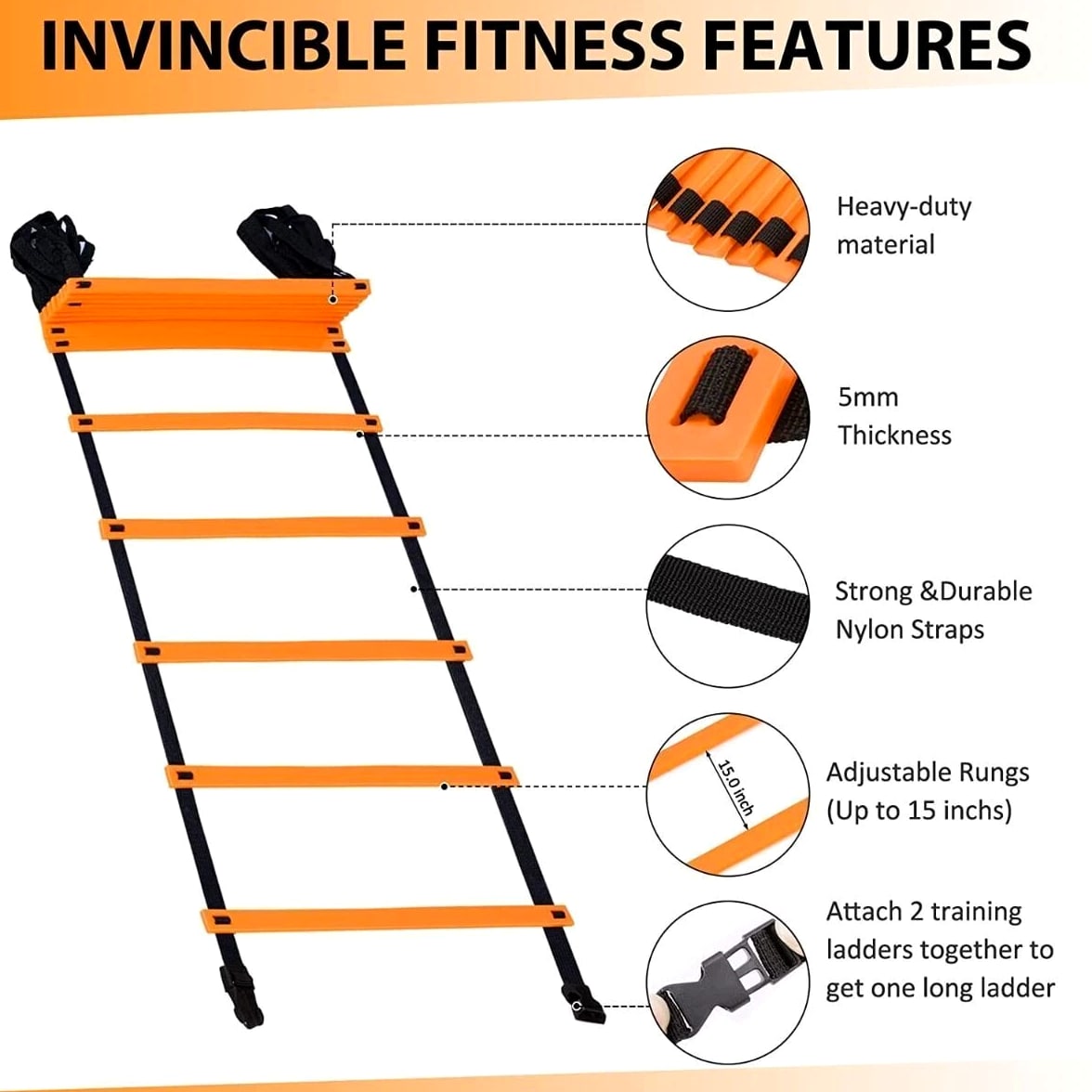 Description: SPEED AGILITY TRAINING KIT- The kit includes 315 inch adjustable agility ladder and a carry bag. Perfect for those who seek agile footwork, boosted endurance, good leg muscles and keeping fit. TANGLE-FREE AGILITY LADDER - Constructed with TPE material, the agility ladder spacing is adjustable, change space between rungs to level up or down difficulty as you need, providing you with customized exercises for footwork training with tangle-free strap. The ladder measures 315 inches total length. FLEXIBLE & DURABLE AGILITY CONES- Premium quality cones are durable yet very soft and flexible. The cones are made of bounce back PVC material, which makes them extremely durable and can withstand being kicked, run over and stepped on during intensive training. DEVELOP SPORTS TRAINING SKILLS - Add fun and variety to your workout with a progressive exercise plan using our foot ladder and agility disc cones. This can help you lose weight while improving your coordination and heart health. APPLICABLE OCCASIONS- This agility ladder training equipment set is very helpful for sport training, soccer, basketball exercises, hockey, lacrosse, tennis, badminton, rugby to increase acceleration, leg strength and speed, basic skills, balance, rhythm and body control. Feature: Type: Soccer Ladders Color: Orange+Black Material: Heavy Duty Plastic Size: 26Feet/315inch Package Include: 1 X Agility Ladder 1 X Storage Bag