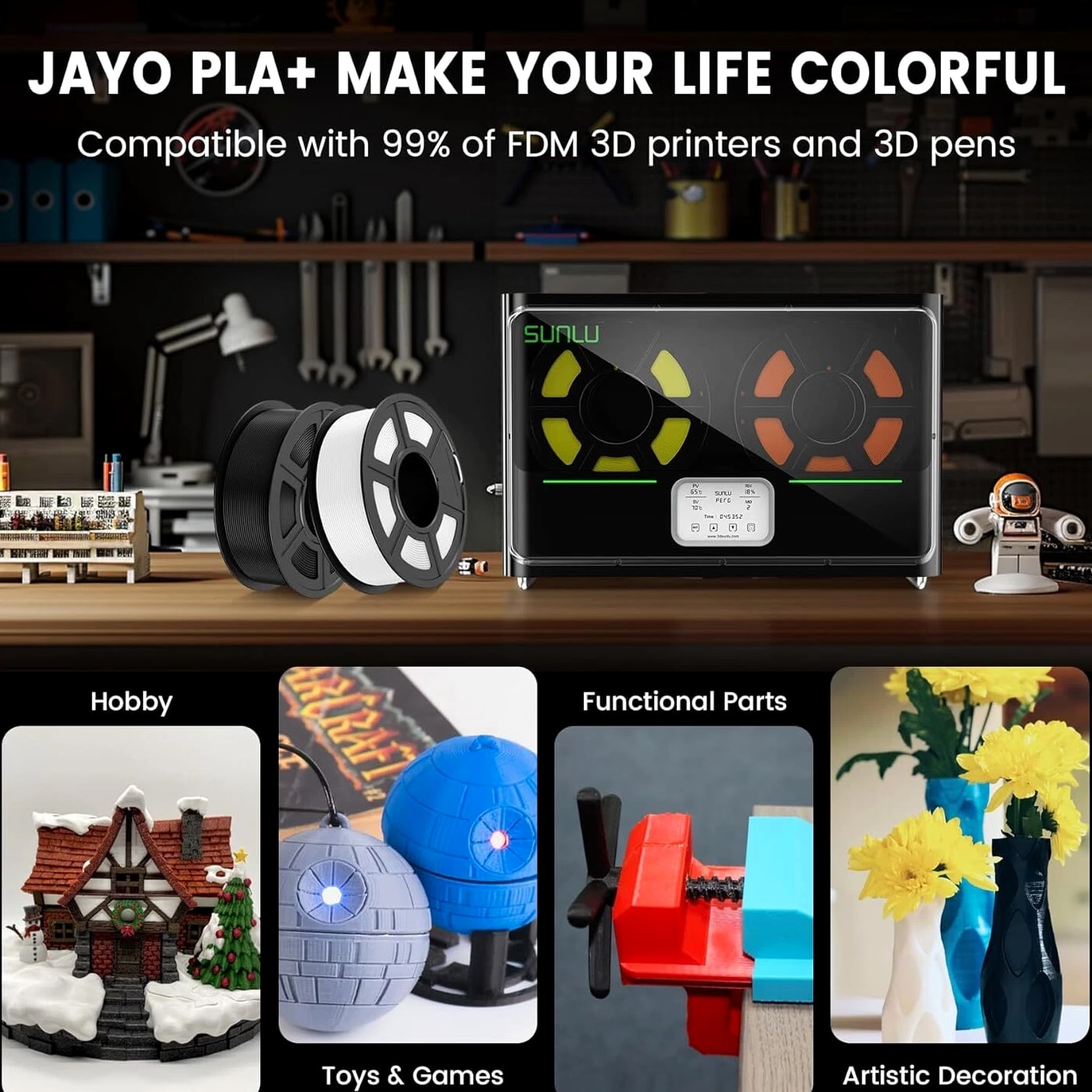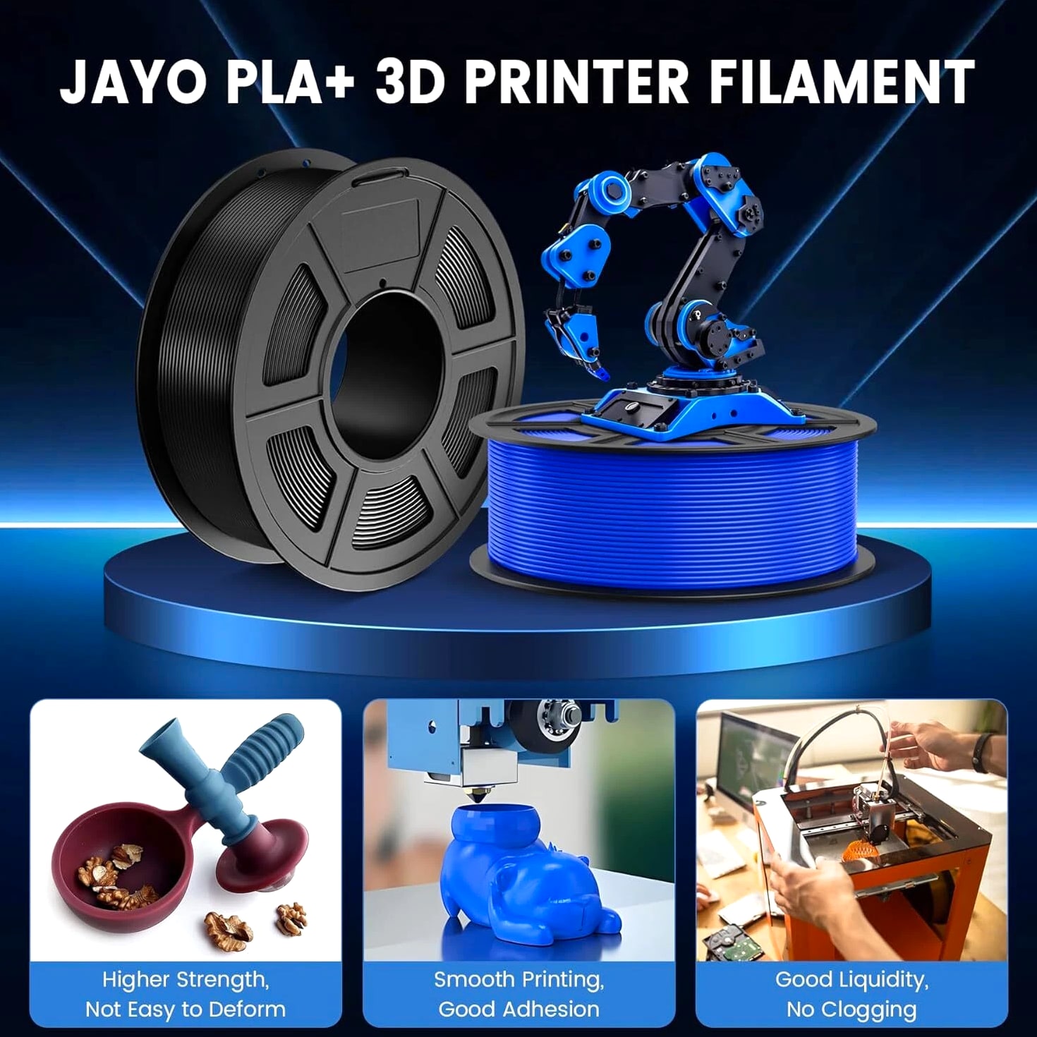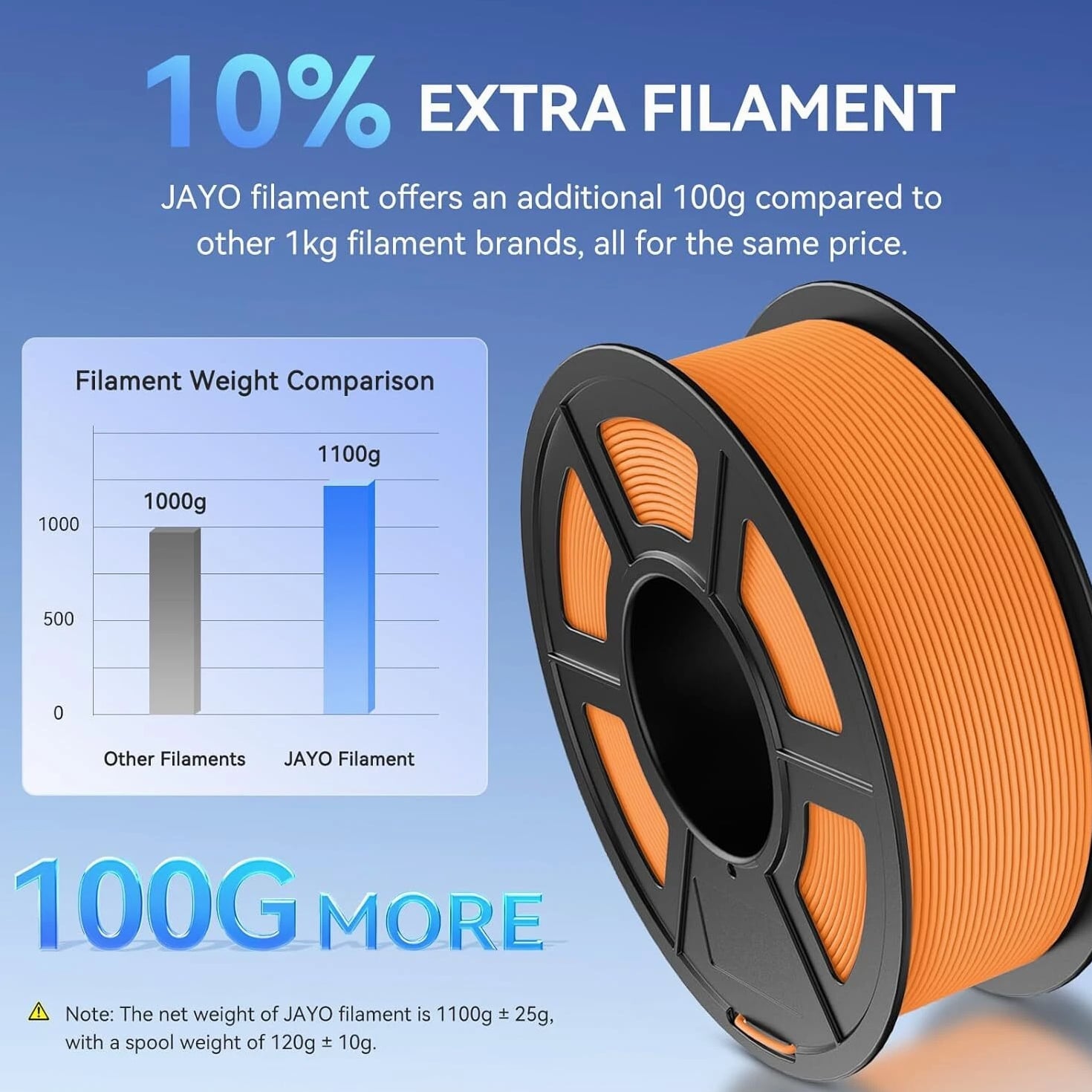 JAYO 1.1KG 1.75mm 3D Printer Filament π Tips: This "Buy 10, Pay 6" promotion requires you to add 10 items to your cart and pay for them together. Will automatically calculate the discount, so you'll only be charged for 6 items. For example: If you want to buy 10 items, add 10 to your cart and you'll only be charged for 6. If you want to buy 20 items, add 20 to your cart and you'll only be charged for 12. The Following Filaments are 100% Neatly Wound -- PLA / PLA+ / PETG / SILK / PLA Meta / PLA Matte (ABS / TPU / PLA Marble is not included.) Filament Wire Diameter Tolerance Printing Temperature Print speed Heat Distortion Temperature Print Platform Temperature Net weight 1.75MM Β±0.02mm 200-210β 50-100mm/s 53β 50-60β 1.1KG PLA+ Β±0.02mm 195-205β 50-100mm/s 50-60β 1.1KG PLA+2.0 Β±0.02mm 195-205β 50-100mm/s 50-60β 1.1KG PLA Meta Β±0.02mm 185-195β 50-150mm/s 50-60β 1.1KG PLA Matte Β±0.02mm 205-215β 50-100mm/s 50-60β 1.1KG HighSpeed PLA Β±0.02mm / 190-210β, 50-150mm/s 210-230β,150-300mm/s 230-260β,300-600mm/s 53β 50-60β 1.1KG PLA Glow Β±0.02mm 195-215β 50-100mm/s 53β 50-60β 1.1KG PLA Carbon Fibre Β±0.02mm 205-215β 40-60mm/s 53β 50-60β 1.1KG PLA Marble Β±0.03mm 210-220β 40-60mm/s 53β 50-60β 1.1KG WOOD Β±0.03mm 195-215β 40-60mm/s 53β 60-70β 1.1KG PETG Β±0.02mm 230-240β 40-60mm/s 63β 60-70β 1.1KG PLA+ SILK Β±0.02mm 205-215β 40-60mm/s 53β 50-60β 1.1KG TPUοΌ95A) Β±0.03mm 195-205β Proximal Extrusion:40mm/s Remote Extrusion:20mm/s 52β 50-60β 0.5KG TPU-SILKοΌ98AοΌ Β±0.03mm 210-220β Proximal Extrusion:50mm/s Remote Extrusion:30mm/s 131β 50-60β 1.1KG ABS Β±0.03mm 250-260β 40-60mm/s 84β 80-100β Easy ABS Β±0.03mm 225-235β 40-60mm/s 57.9β 60-70β JAYO 1.1KG PLA Filament 1.75mm Dimensional Accuracy +/- 0.02mm, Compatible with Most FDM Printers JAYO 1.1KG PLA+ Filament 1.75mm Dimensional Accuracy +/- 0.02mm, Compatible with Most FDM Printers JAYO 1.1KG Matte PETG Filament 1.75mm