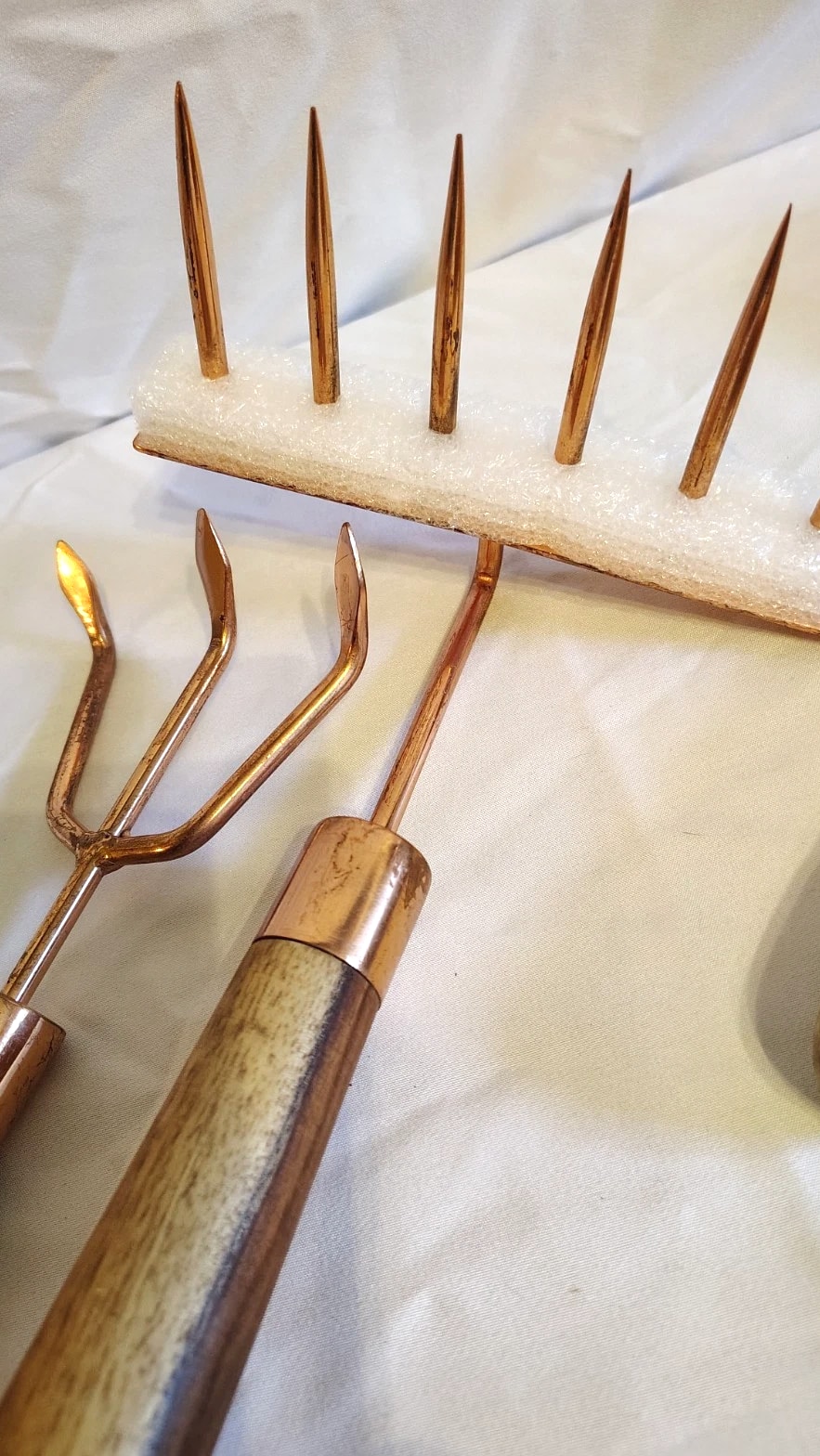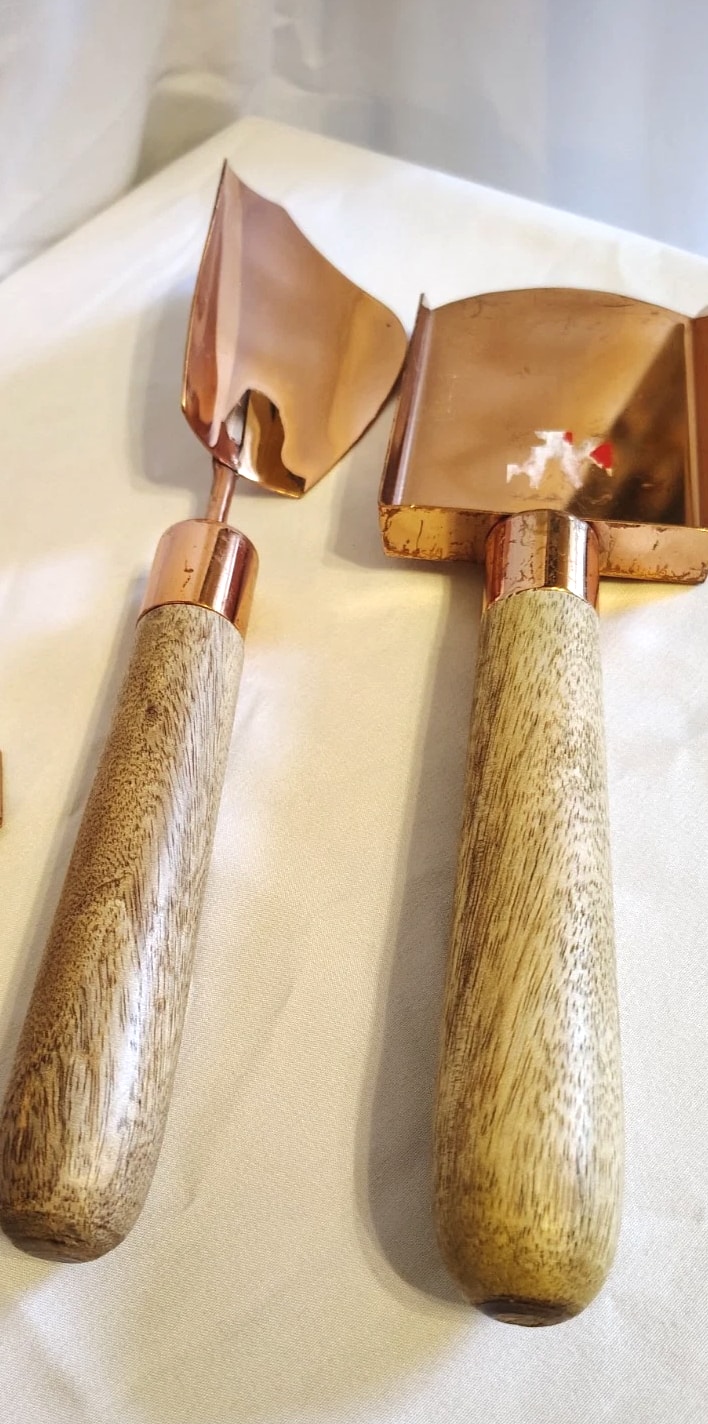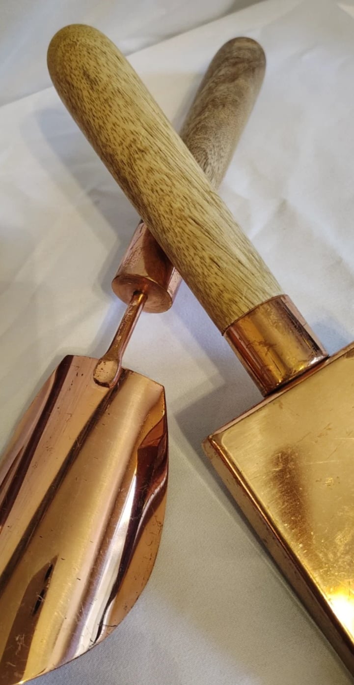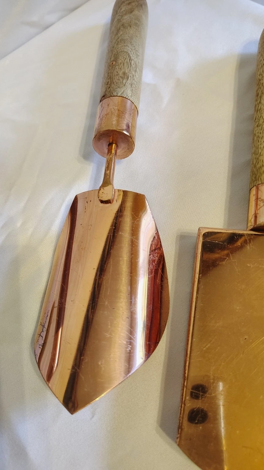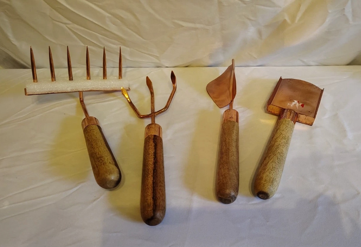 For sale from our home to yours, this lovely... Copper & Wood Garden Hand Tool Set with distressed finish design We purchased this lovely garden tool set from an AT HOME store in Spring of 2019 but ended up never using them (perhaps because they are too pretty!). They are very sturdy, with good feel & weight, and are fully functional, not decorative (although that could be a nice use for them too). The handles are solid wood with copper-plated metal tool heads. The garden set includes four (4) tools: - Cultivator - Fork - Shovel - Trowel The tools are up to 12 inches in length; the longest tool, the trowel, is 12 inches (see pic with measurement); the others are slightly shorter & vary in length.