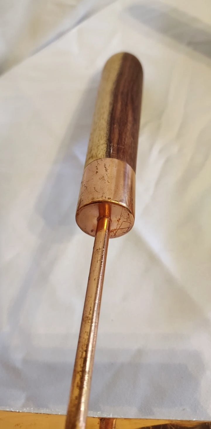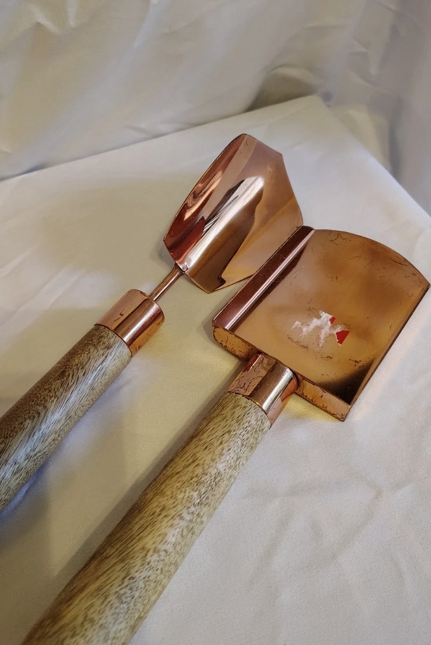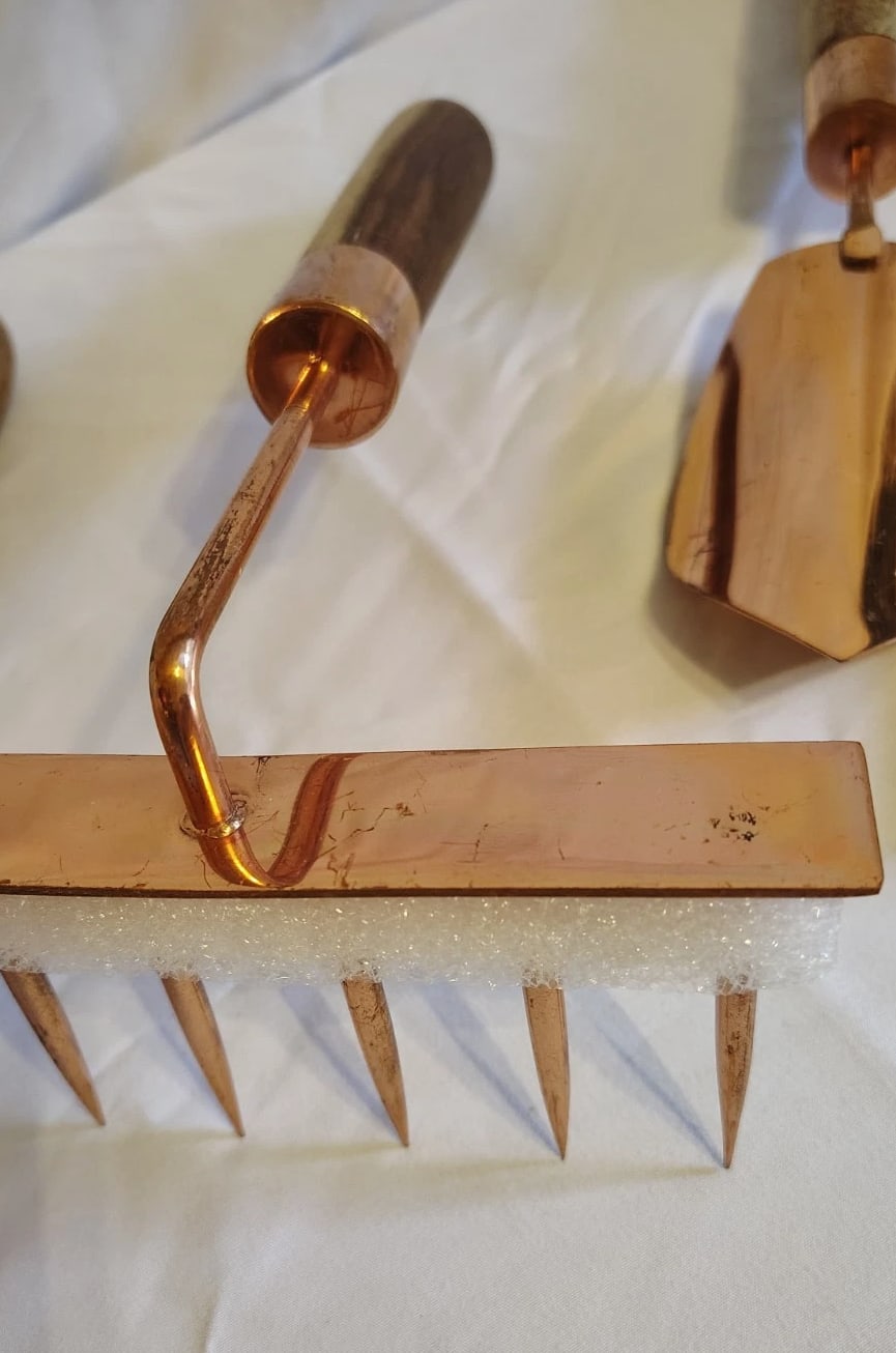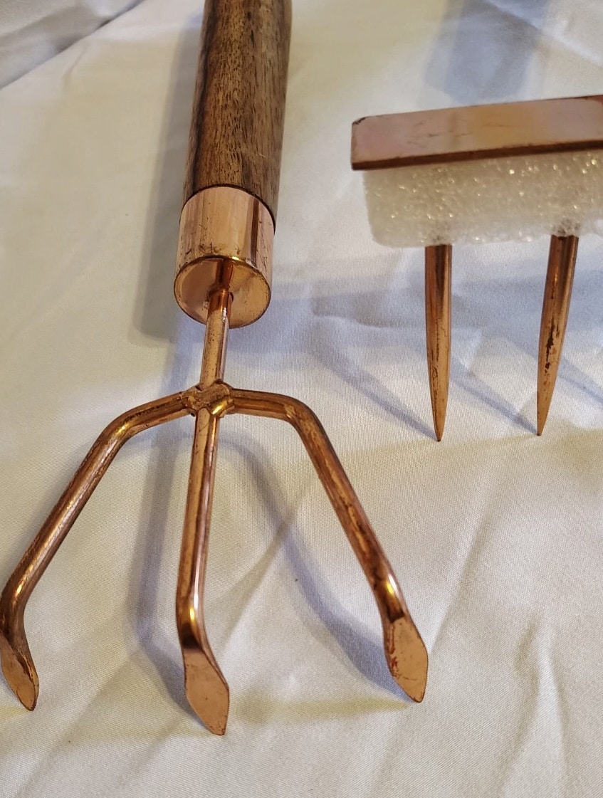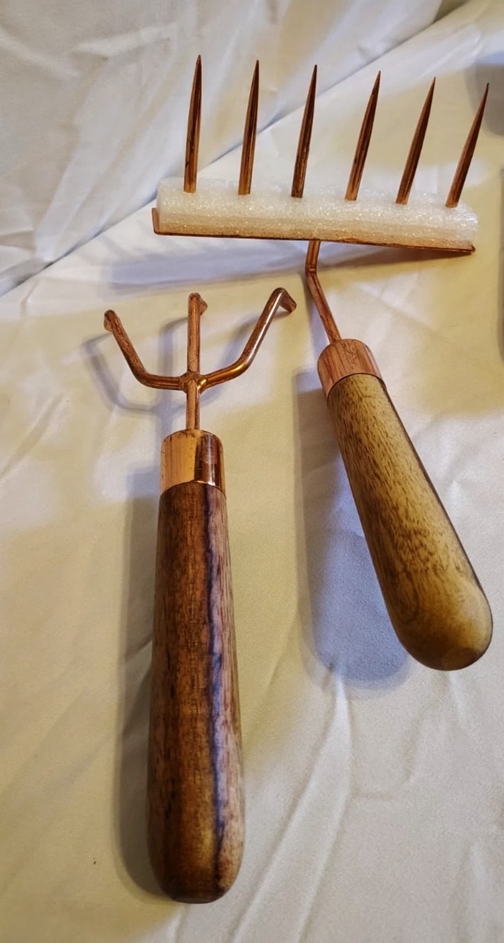 For sale from our home to yours, this lovely... Copper & Wood Garden Hand Tool Set with distressed finish design We purchased this lovely garden tool set from an AT HOME store in Spring of 2019 but ended up never using them (perhaps because they are too pretty!). They are very sturdy, with good feel & weight, and are fully functional, not decorative (although that could be a nice use for them too). The handles are solid wood with copper-plated metal tool heads. The garden set includes four (4) tools: - Cultivator - Fork - Shovel - Trowel The tools are up to 12 inches in length; the longest tool, the trowel, is 12 inches (see pic with measurement); the others are slightly shorter & vary in length.
