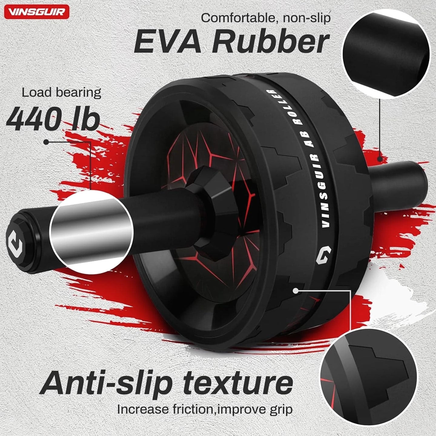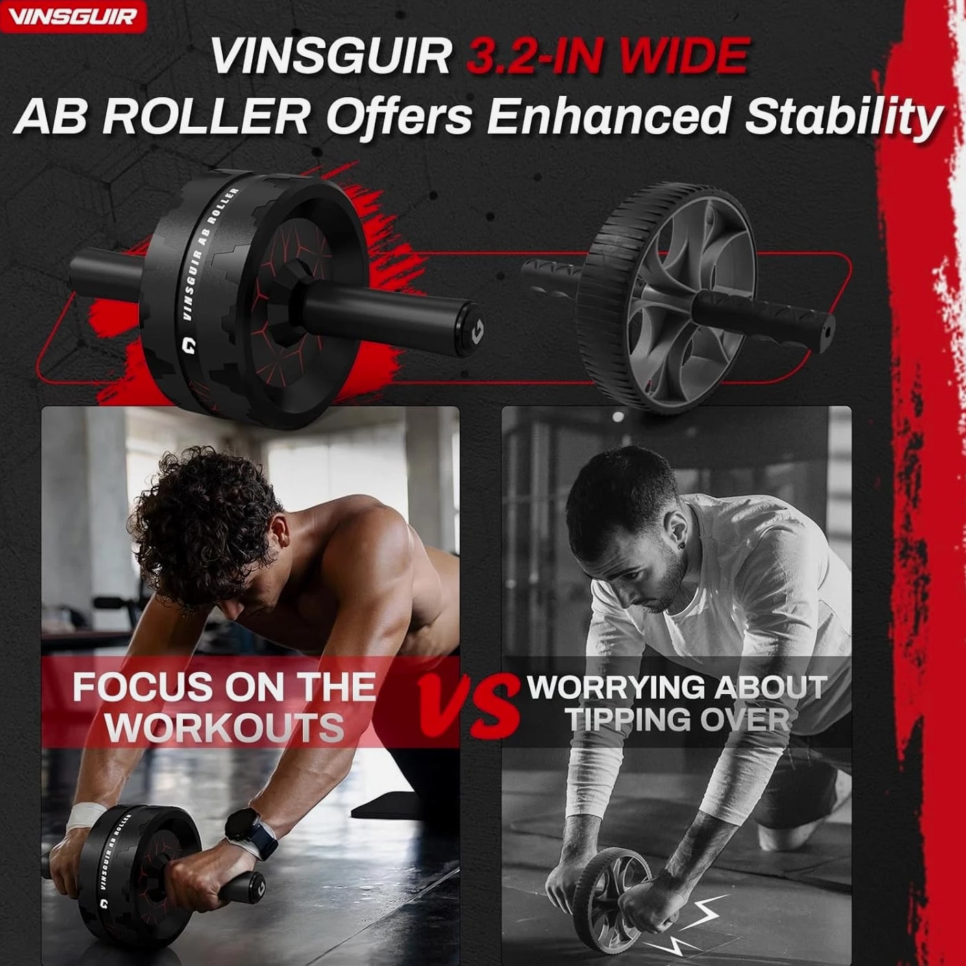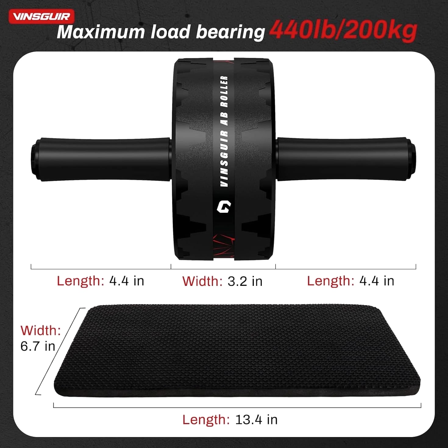 【More Accessible & Hassle Free】The 3.2 inch dual-wheel ab roller offers extra support and stability compared to the common single ab wheel. Equipped with a knee pad, this ab roller wheel delivers a comfortable workout experience and caring protection. Just embrace the freedom of more thrilling and challenging routines without the hassle of using resistance bands! 【Grow Six Packs Faster & Safer】The Vinsguir abs wheel targets your abdominals, hip flexors and back muscles. With dedicated practice, this exercise wheel will speed up your core & low back strengthening while lessoning your risk of muscle injury. 【Efficient Exercise Equipment】Unlike big gym machines, or heavy weight benches, dumbbells and the like, the Vinsguir ab wheel roller is a portable size -- compact design that enables you to take it anywhere to exercise, be it your home, office, gym, or outdoors. 【Amazingly Durable & Stable】The high-strength stainless steel shaft of the ab roller for abs workout can hold a maximum weight of 440 pounds for your safety. The 3.2 inch ultra-wide abs roller ensures balance and stability as it does not deviate sideways. EVA rubber cotton handles provide nonslip and comfortable grip. 【Top Gift Choice for Fitness Enthusiasts】This workout roller goes beyond working your abs and burning your fat. As a versatile roller wheel, it is of no contest when it comes to selecting an ideal gift for your family and friends; not to mention the satisfaction guaranteed after-sales services. Wish you a joyful shopping experience! 30-Day No Hassle Returns, 12-Month Warranty & Lifetime Customer Service. 【More Accessible & Hassle Free】The 3.2 inch dual-wheel ab roller offers extra support and stability compared to the common single ab wheel. Equipped with a knee pad, this ab roller wheel delivers a comfortable workout experience and caring protection. Just embrace the freedom of more thrilling and challenging routines without the hassle of using resistance bands! 【Grow Six Packs Faster & Safer