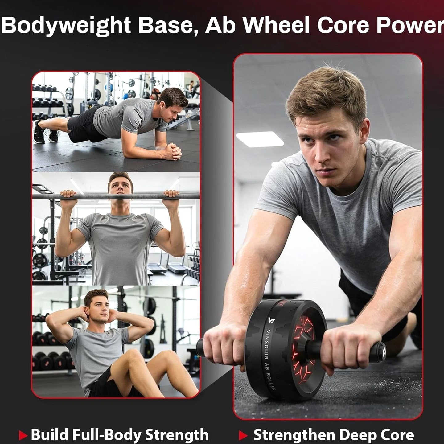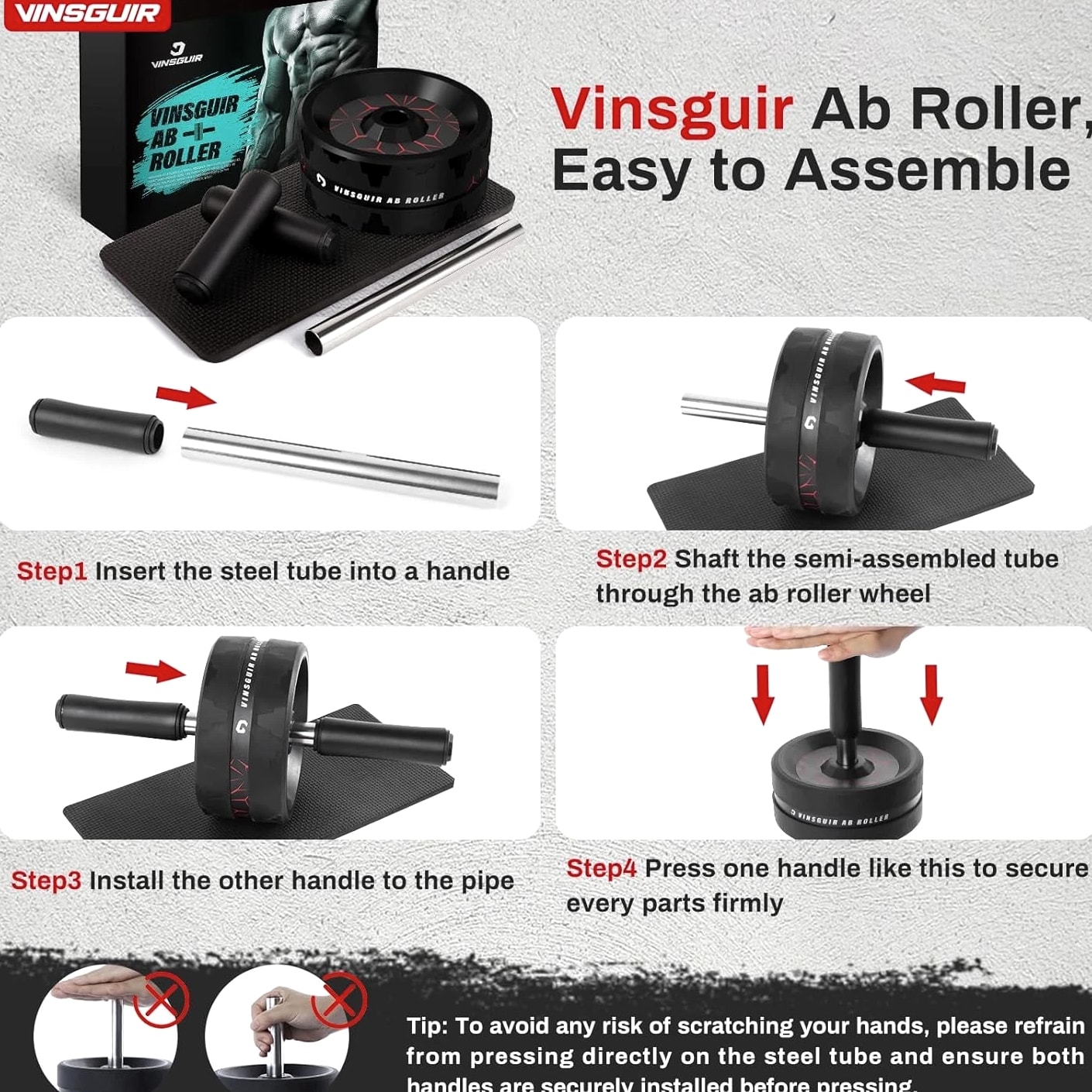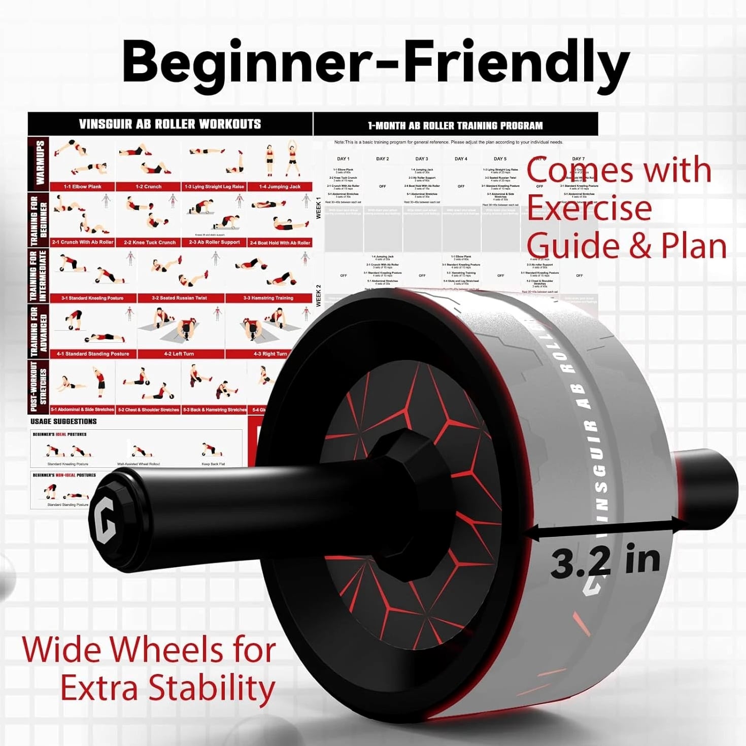 【More Accessible & Hassle Free】The 3.2 inch dual-wheel ab roller offers extra support and stability compared to the common single ab wheel. Equipped with a knee pad, this ab roller wheel delivers a comfortable workout experience and caring protection. Just embrace the freedom of more thrilling and challenging routines without the hassle of using resistance bands! 【Grow Six Packs Faster & Safer】The Vinsguir abs wheel targets your abdominals, hip flexors and back muscles. With dedicated practice, this exercise wheel will speed up your core & low back strengthening while lessoning your risk of muscle injury. 【Efficient Exercise Equipment】Unlike big gym machines, or heavy weight benches, dumbbells and the like, the Vinsguir ab wheel roller is a portable size -- compact design that enables you to take it anywhere to exercise, be it your home, office, gym, or outdoors. 【Amazingly Durable & Stable】The high-strength stainless steel shaft of the ab roller for abs workout can hold a maximum weight of 440 pounds for your safety. The 3.2 inch ultra-wide abs roller ensures balance and stability as it does not deviate sideways. EVA rubber cotton handles provide nonslip and comfortable grip. 【Top Gift Choice for Fitness Enthusiasts】This workout roller goes beyond working your abs and burning your fat. As a versatile roller wheel, it is of no contest when it comes to selecting an ideal gift for your family and friends; not to mention the satisfaction guaranteed after-sales services. Wish you a joyful shopping experience! 30-Day No Hassle Returns, 12-Month Warranty & Lifetime Customer Service. 【More Accessible & Hassle Free】The 3.2 inch dual-wheel ab roller offers extra support and stability compared to the common single ab wheel. Equipped with a knee pad, this ab roller wheel delivers a comfortable workout experience and caring protection. Just embrace the freedom of more thrilling and challenging routines without the hassle of using resistance bands! 【Grow Six Packs Faster & Safer