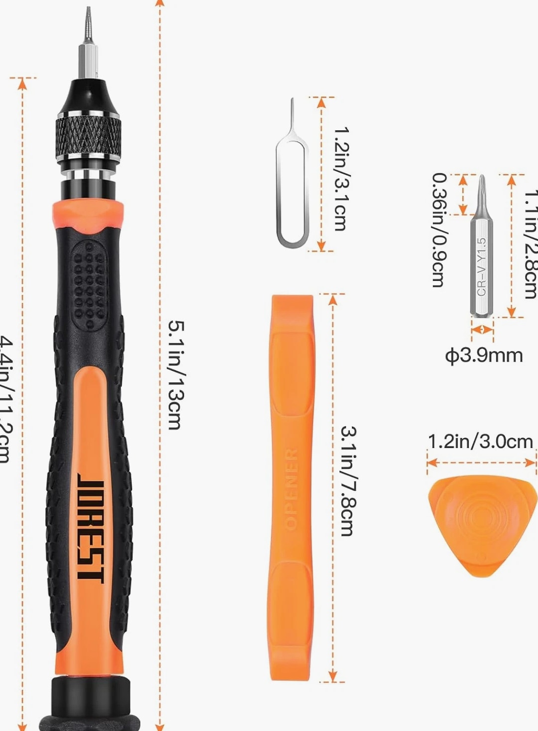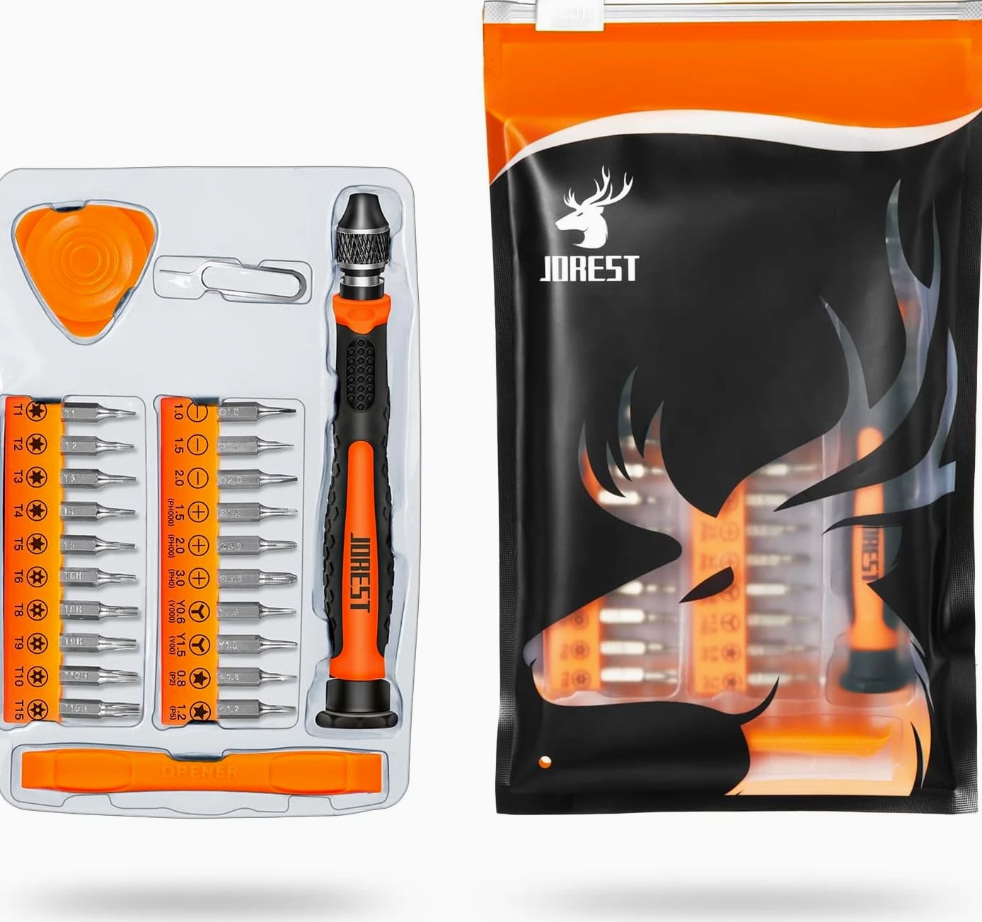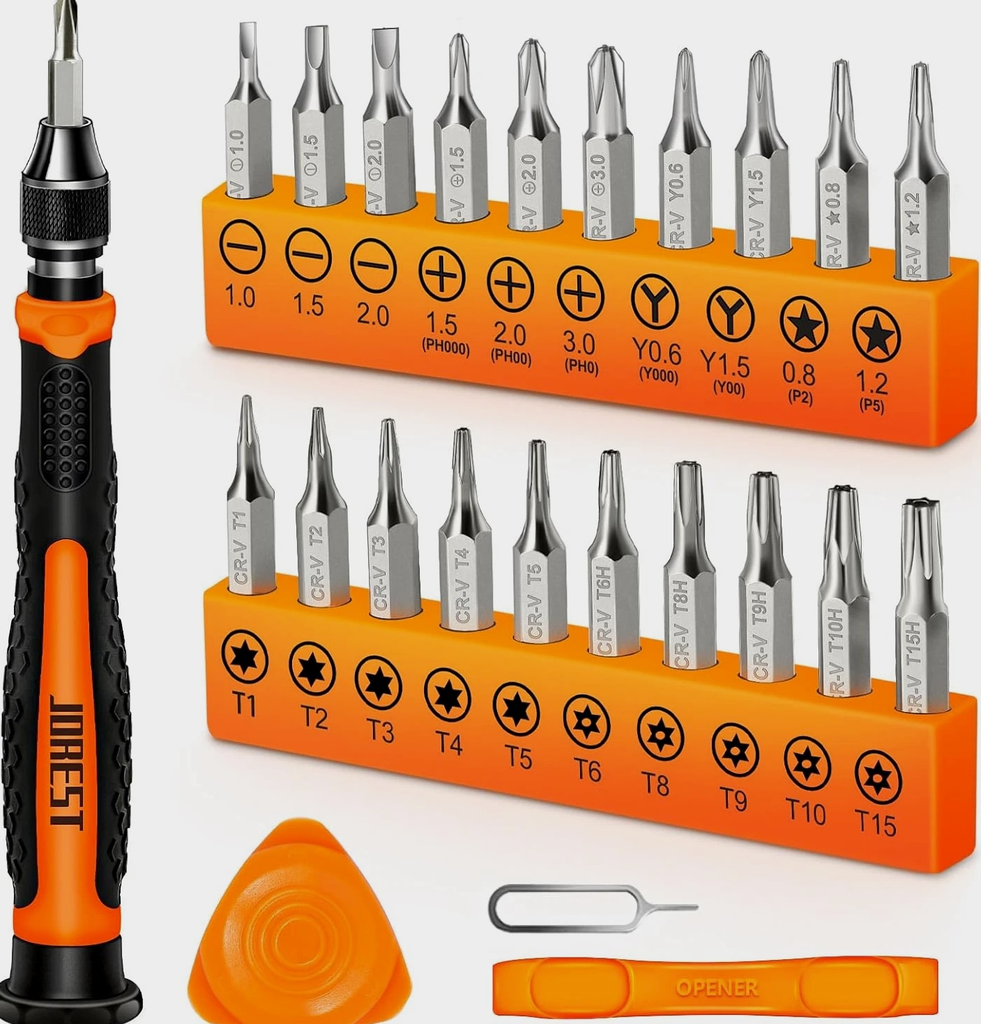 24-Pcs Precision Screwdriver Set – Mini Repair Toolkit for Electronics & Gadgets Description Item model number AJJOJM0301ORDJPR1S Part Number AJJOJM0301ORDDER1S Style 24 in 1 Number of Items 24 Color Colorful Material Chrome Vanadium Steel Aci Batteries Required? No Item Weight 3.52 ounces Head Style Torx Head Size T5, T6, T8, T9, Y00, P5 Model Name Precision Screwdriver Recommended Uses For Product Electrical Appliances, Electronic item, Furniture assembly, Glasses, Home Improvement, Watch Batteries Included? No Special Features Ergonomic, Magnetic Tip, Non-Slip Grip, Rotating Cap Special Feature Ergonomic, Magnetic Tip, Non-Slip Grip, Rotating Cap Package Dimensions 8.94 x 4.72 x 0.63 inches 🛠 24-Piece Precision Screwdriver Set – Mini Repair Toolkit for Electronics & Gadgets This 24-piece precision screwdriver set is the ideal toolkit for DIY enthusiasts, tech lovers, and professional repair technicians. Compact, versatile, and durable, it's designed to handle delicate electronics, smartphones, tablets, gaming consoles, and more. 🌟 Key Features & Benefits 🔧 Comprehensive 24-Piece Set Includes 20 CR-V screwdriver bits: Phillips (PH000, PH00, PH0), flathead, Torx (T1–T5), Torx security (TR6–TR15), Triwing (Y000, Y00), and Pentalobe (P2, P5). Comes with a screwdriver handle, double-ended spudger, triangular spudger, and SIM card thimble. 📱 Wide Device Compatibility Ideal for iPhone 7–13 screen and battery replacements, PS3/PS4/PS5, Xbox 360/Series S/X, Nintendo Switch/Joy-Con/Wii, MacBook Air/Pro, Ring Doorbells, folding knives, computers, watches, glasses, and more. Perfect for precise repairs without causing damage. ⚙️ Slip-Resistant Rotatable Handle Ergonomic TPR + PP handle with non-slip grip. Rotatable top allows smooth screw removal, and the magnetic head holds bits securely for fast, accurate work. 💪 Durable CR-V Steel Bits All bits made from chrome vanadium steel, resistant to rust and wear. Designed for mini screws (2.8cm length, 3.9mm diameter). Not for larg