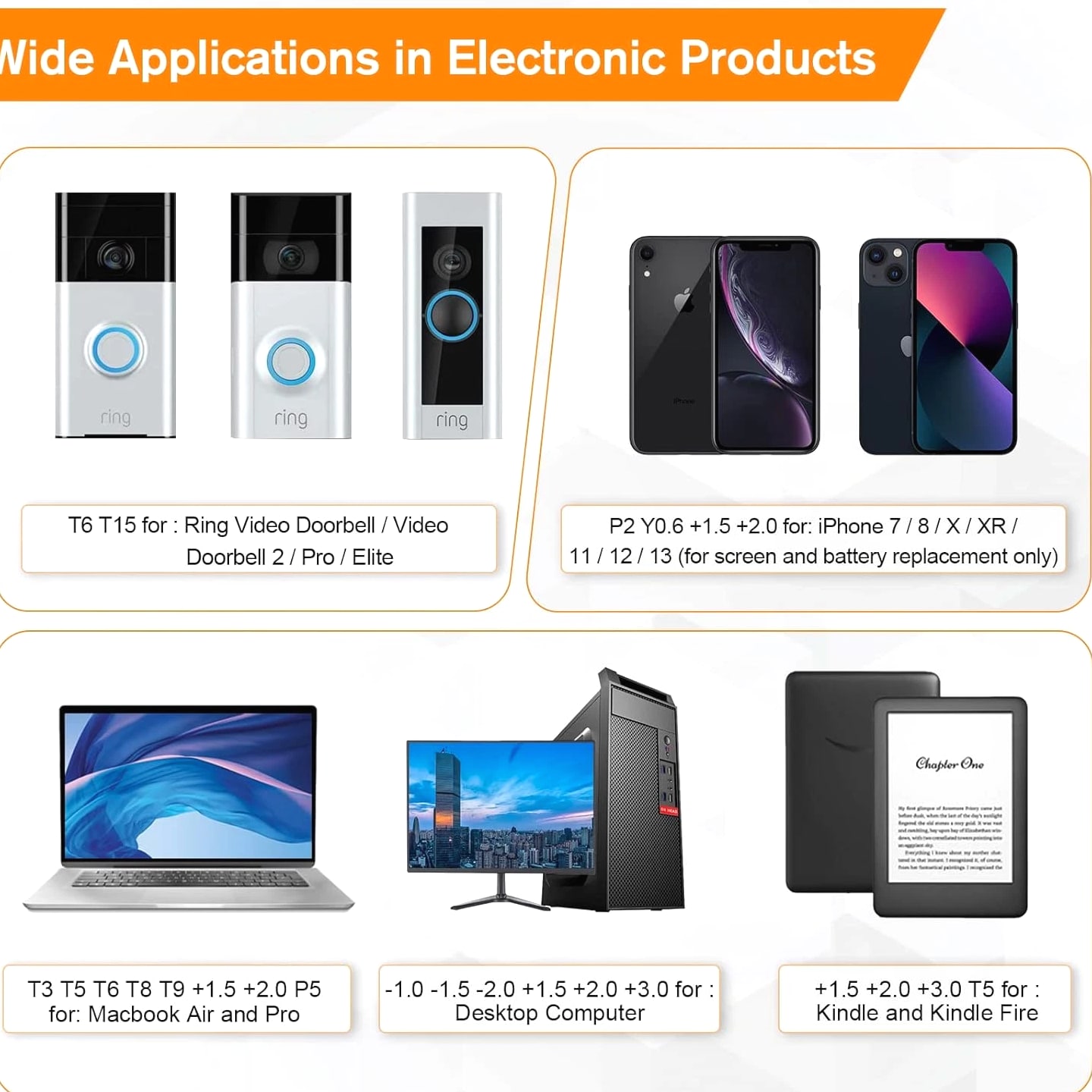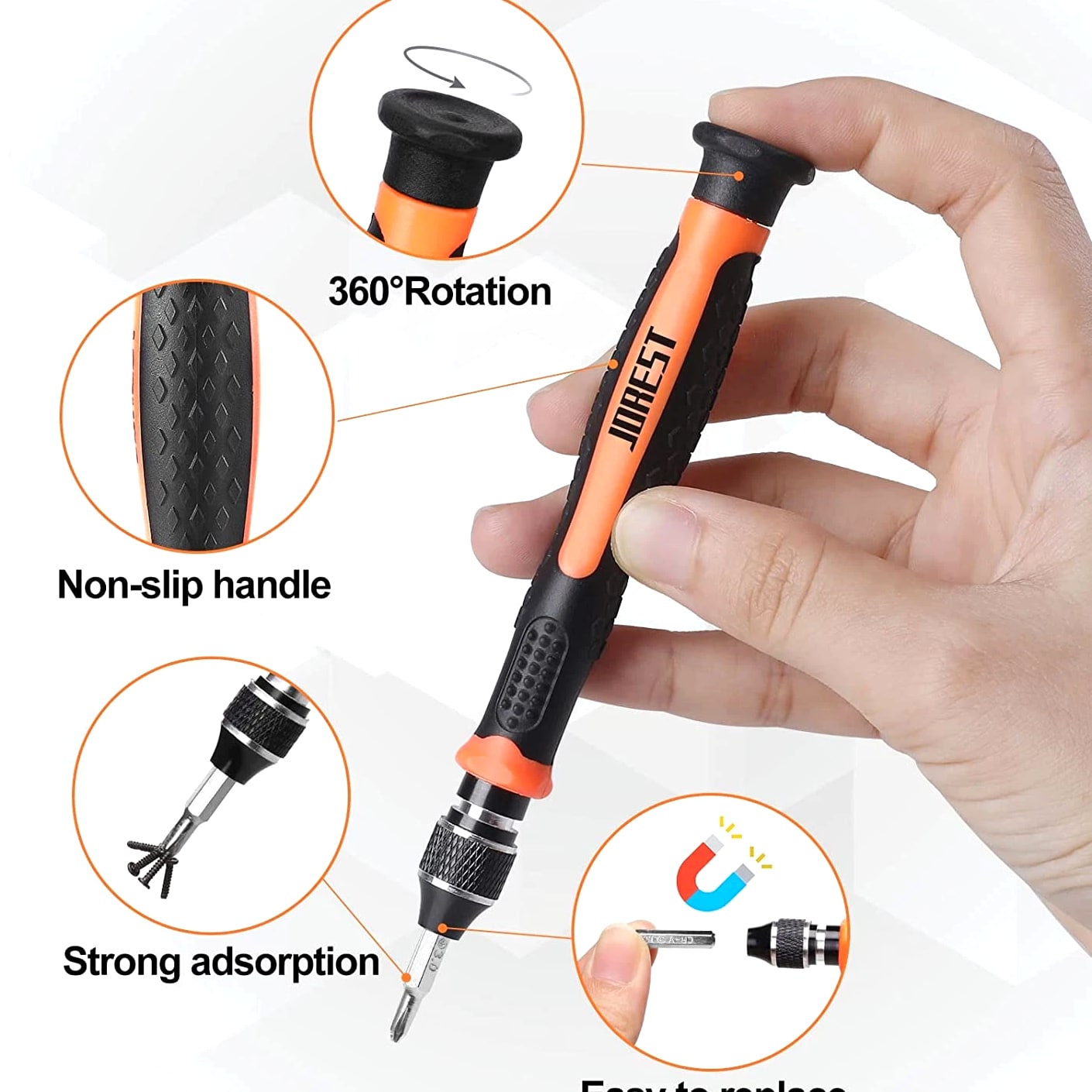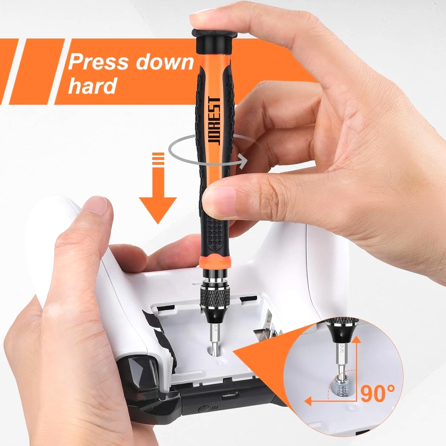 24-Pcs Precision Screwdriver Set – Mini Repair Toolkit for Electronics & Gadgets Description Item model number AJJOJM0301ORDJPR1S Part Number AJJOJM0301ORDDER1S Style 24 in 1 Number of Items 24 Color Colorful Material Chrome Vanadium Steel Aci Batteries Required? No Item Weight 3.52 ounces Head Style Torx Head Size T5, T6, T8, T9, Y00, P5 Model Name Precision Screwdriver Recommended Uses For Product Electrical Appliances, Electronic item, Furniture assembly, Glasses, Home Improvement, Watch Batteries Included? No Special Features Ergonomic, Magnetic Tip, Non-Slip Grip, Rotating Cap Special Feature Ergonomic, Magnetic Tip, Non-Slip Grip, Rotating Cap Package Dimensions 8.94 x 4.72 x 0.63 inches 🛠 24-Piece Precision Screwdriver Set – Mini Repair Toolkit for Electronics & Gadgets This 24-piece precision screwdriver set is the ideal toolkit for DIY enthusiasts, tech lovers, and professional repair technicians. Compact, versatile, and durable, it's designed to handle delicate electronics, smartphones, tablets, gaming consoles, and more. 🌟 Key Features & Benefits 🔧 Comprehensive 24-Piece Set Includes 20 CR-V screwdriver bits: Phillips (PH000, PH00, PH0), flathead, Torx (T1–T5), Torx security (TR6–TR15), Triwing (Y000, Y00), and Pentalobe (P2, P5). Comes with a screwdriver handle, double-ended spudger, triangular spudger, and SIM card thimble. 📱 Wide Device Compatibility Ideal for iPhone 7–13 screen and battery replacements, PS3/PS4/PS5, Xbox 360/Series S/X, Nintendo Switch/Joy-Con/Wii, MacBook Air/Pro, Ring Doorbells, folding knives, computers, watches, glasses, and more. Perfect for precise repairs without causing damage. ⚙️ Slip-Resistant Rotatable Handle Ergonomic TPR + PP handle with non-slip grip. Rotatable top allows smooth screw removal, and the magnetic head holds bits securely for fast, accurate work. 💪 Durable CR-V Steel Bits All bits made from chrome vanadium steel, resistant to rust and wear. Designed for mini screws (2.8cm length, 3.9mm diameter). Not for larg