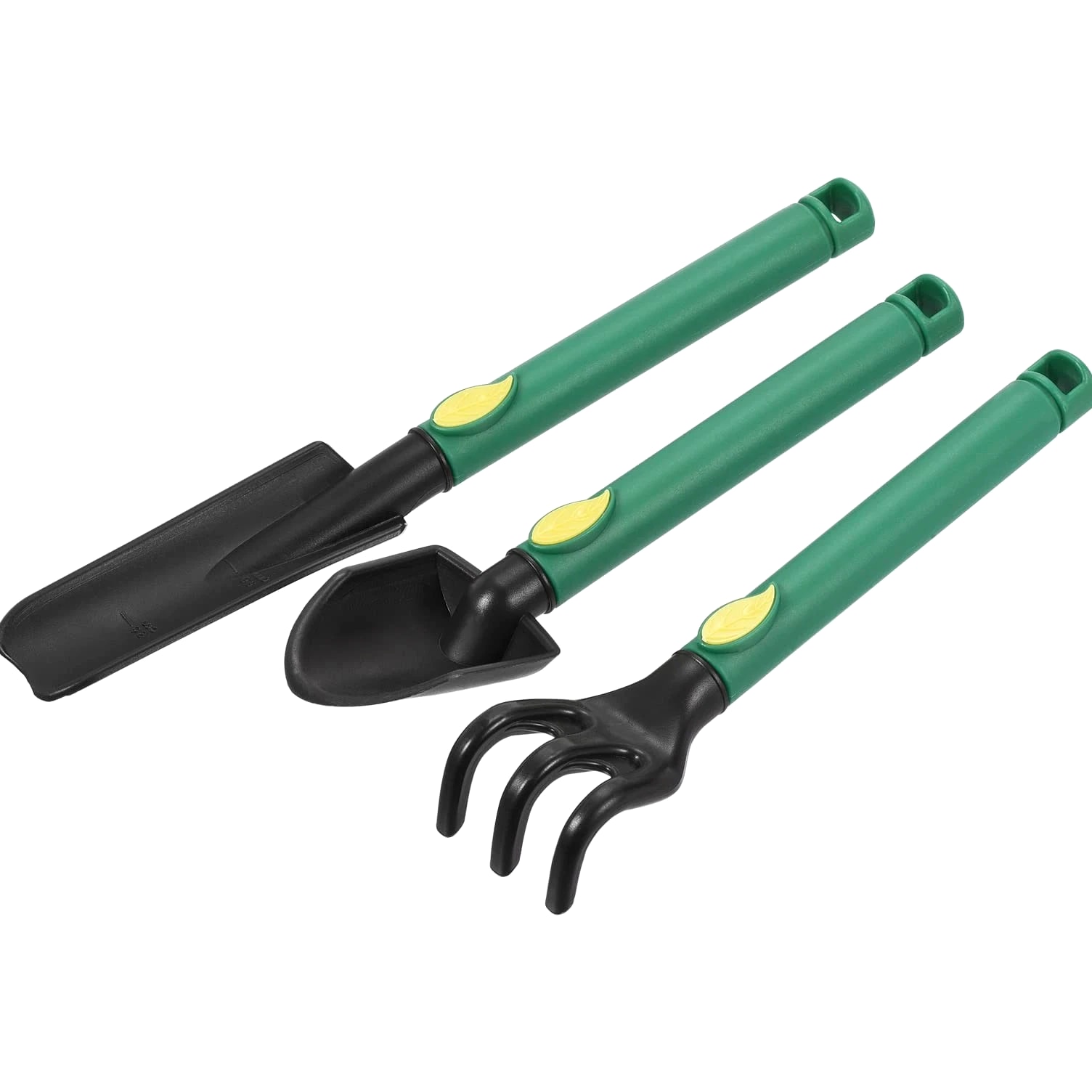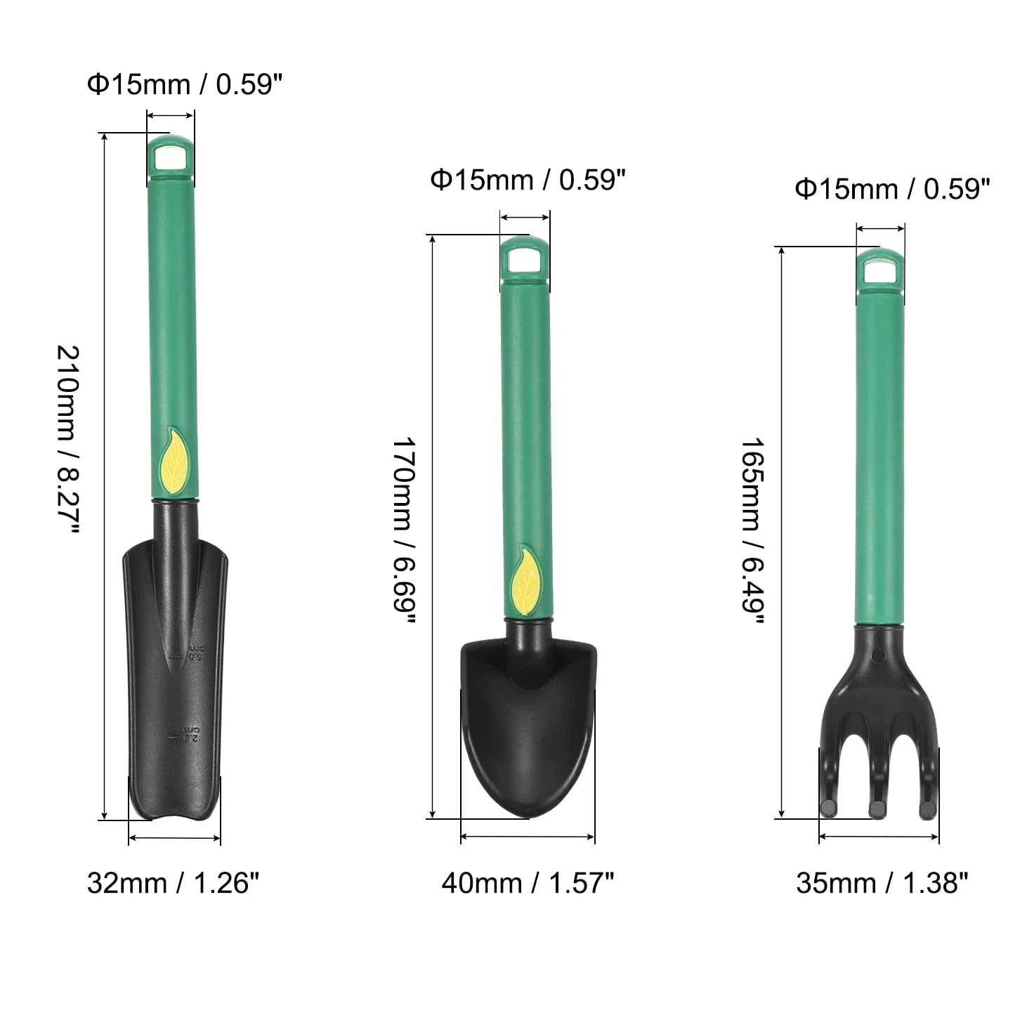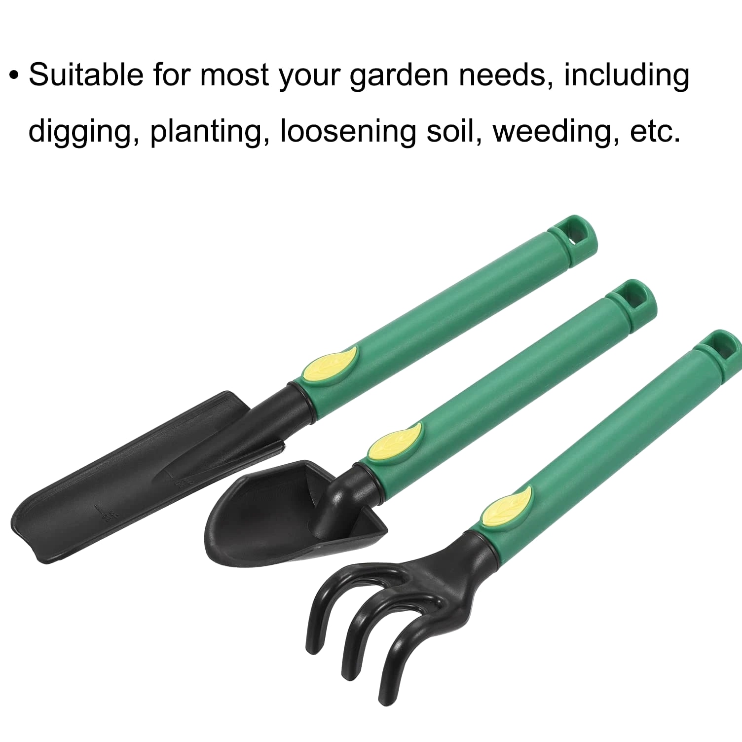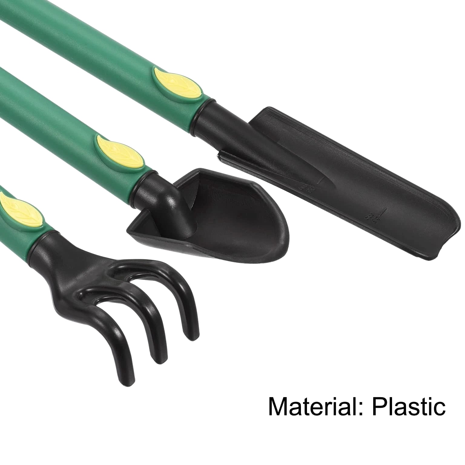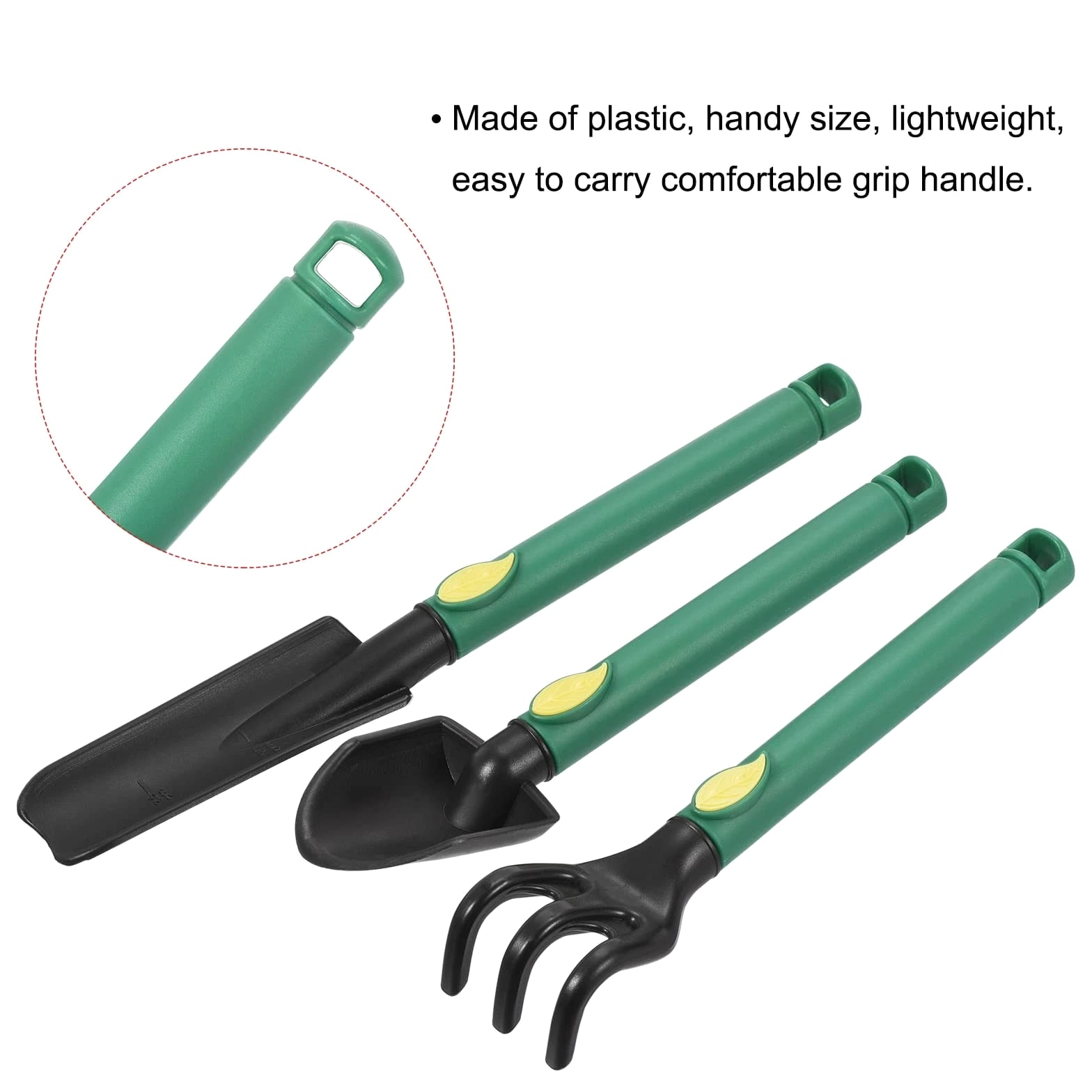 Discover Top Quality Products! We assure your satisfaction. Mini Garden Tools Set Plastic Gardening Hand Tools Trowel Rake Spade Kit Home Garden Supplies for Flowers, Succulent Transplanting - 3 Pcs Product Information What is this? This lawn and garden hand tools kit are particularly functional. They are in a very suitable and handy size, easy to carry. It's a must-have for anyone with a garden. Digging and weeding will be easy and of great fun. Use this gardener's set to plant or transplant small plants and flowers such as succulents. What will I get? Material: Plastic Color: Black, Green Shank Diameter: 15mm / 0.59inch Trowel Width: 32mm / 1.26inch Spade Width: 40mm / 1.57inch Rake Width: 35mm / 1.38inch Trowel Length: 210mm / 8.27inch Spade Length: 170mm / 6.69inch Rake Length: 165mm / 6.49inch Package Content: 3x Mini Garden Tools (Garden Hand Trowel, Rake, Spade) Are there any advantages of the product? The gardening tools are made of quality plastic, handy size, lightweight, easy to carry with comfortable grip handle, providing you with pleasure using experience. The garden tools set includes 3 pieces of strong plastic hand tools. Suitable for all your garden needs, including digging, planting, loosening soil, weeding, etc. The garden tools are just the right size for succulents. How to use it? The garden tools set is suitable for all your garden needs, including digging, planting, loosening soil, weeding, etc. What should I notice? Please keep the garden tool away from children. The manually measured dimensions might have an error of 1-2%. Product Highlights This lawn and garden hand tools kit are particularly functional. It's a must-have for anyone with a garden. Digging and weeding will be easy and of great fun. Use this gardener's set to plant or transplant small plants and flowers such as succulents. Shank Diameter: 15mm / 0.59inch, Trowel Width: 32mm / 1.26inch, Spade Width: 40mm / 1.57inch, Rake Width: 35mm / 1.38inch