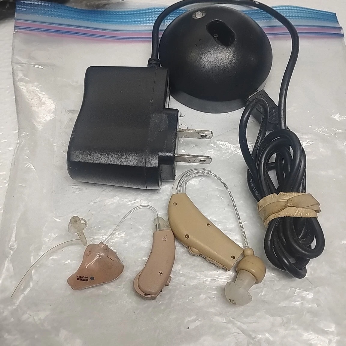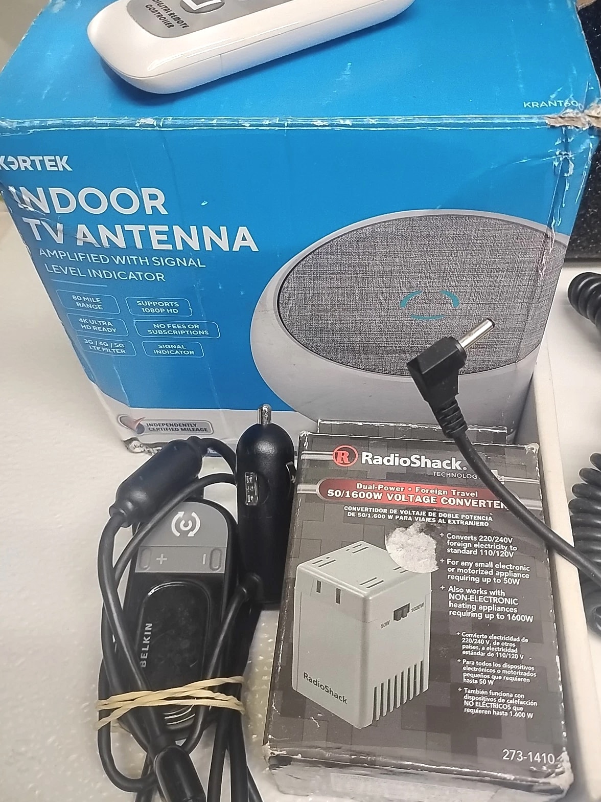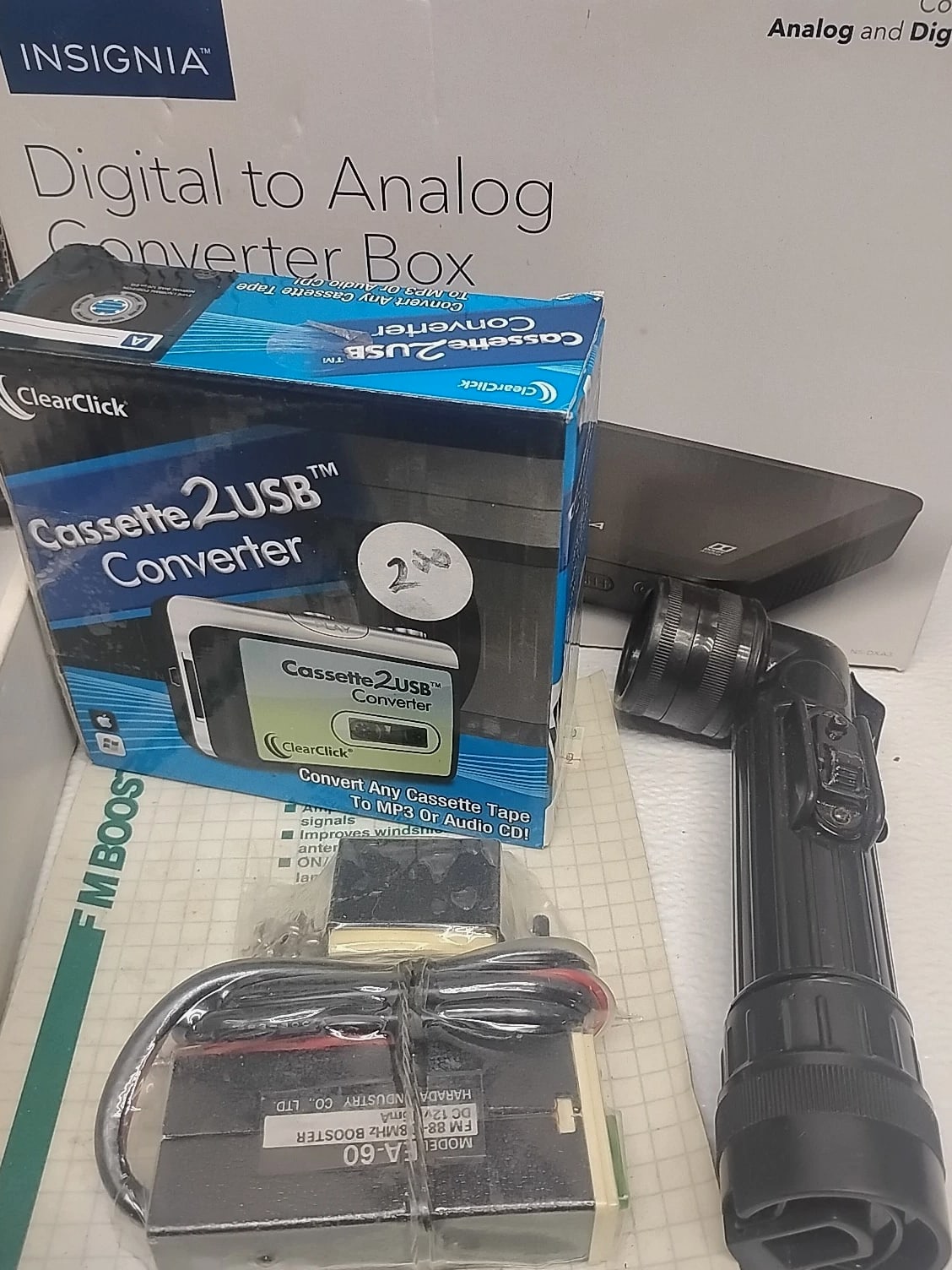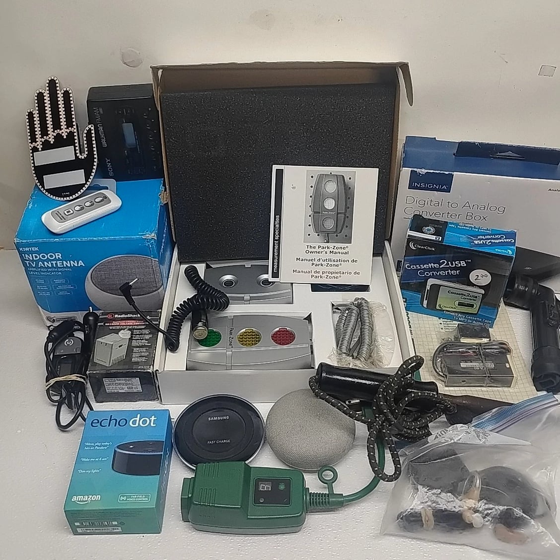 This product is a mixed collection of electronics items including a variety of antennas, gadgets, converters, and a flashlight. The assortment includes items compatible with different brands such as Microsoft and Insignia. Among the items are an army flashlight, voltage converter, Sony walkman, and various converters for cassette to USB and digital to analog. The lot also includes a Samsung wireless fast charger, hearing aids, an echo dot, and an amplified antenna. A couple of items look as if they may be brand new but nothing has been tested and the lot is being sold as for parts/repair only. This collection offers a diverse range of electronic devices and components for various uses.